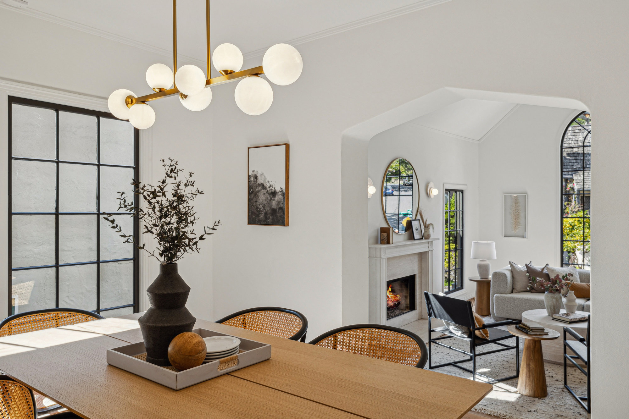 The dining room view into the living room and wood-burning fireplace at the Crocker Highlands Fairy Tale Tudor.