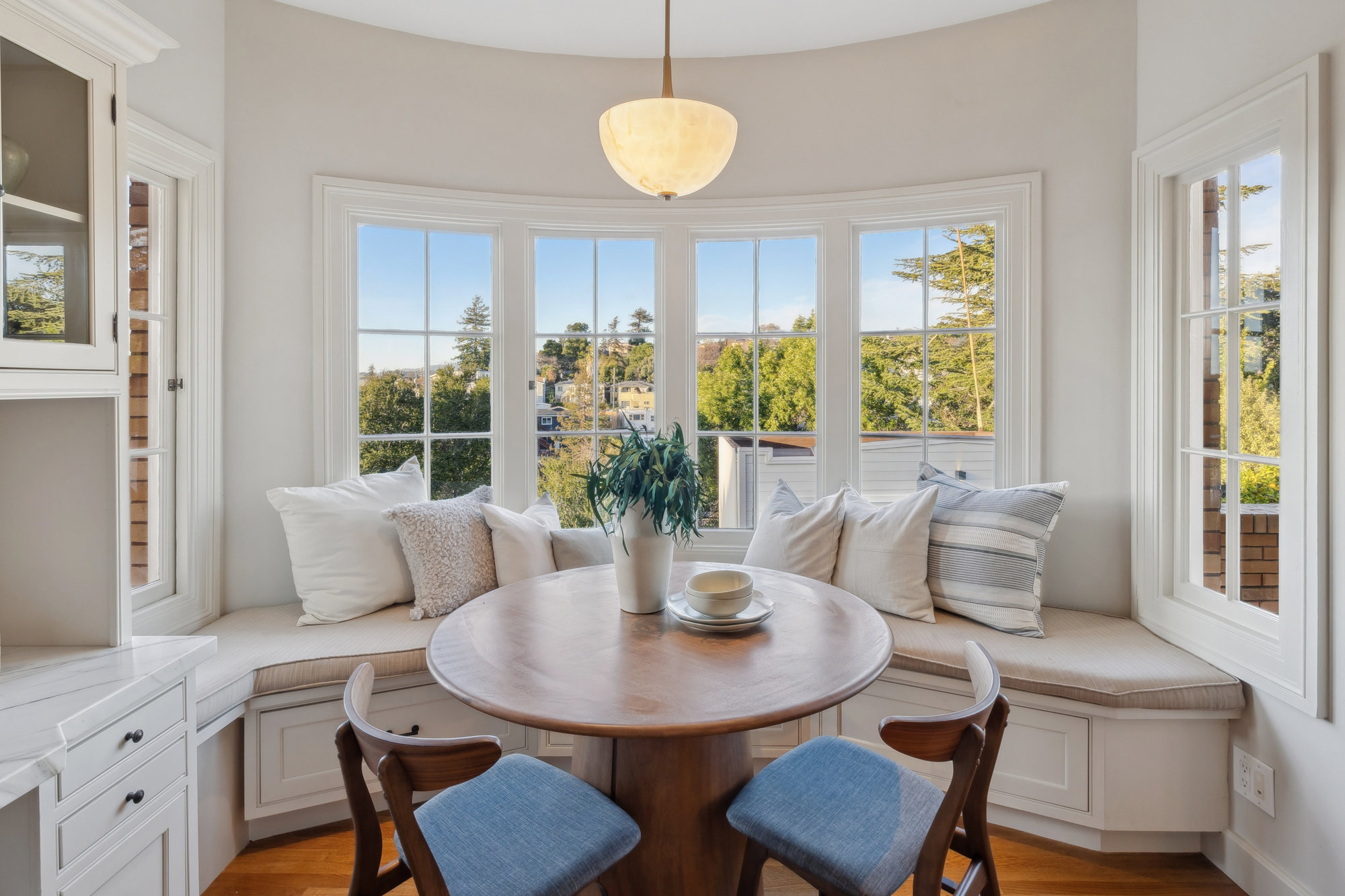 The kitchen features an eat-in area overlooking the home’s gardens.