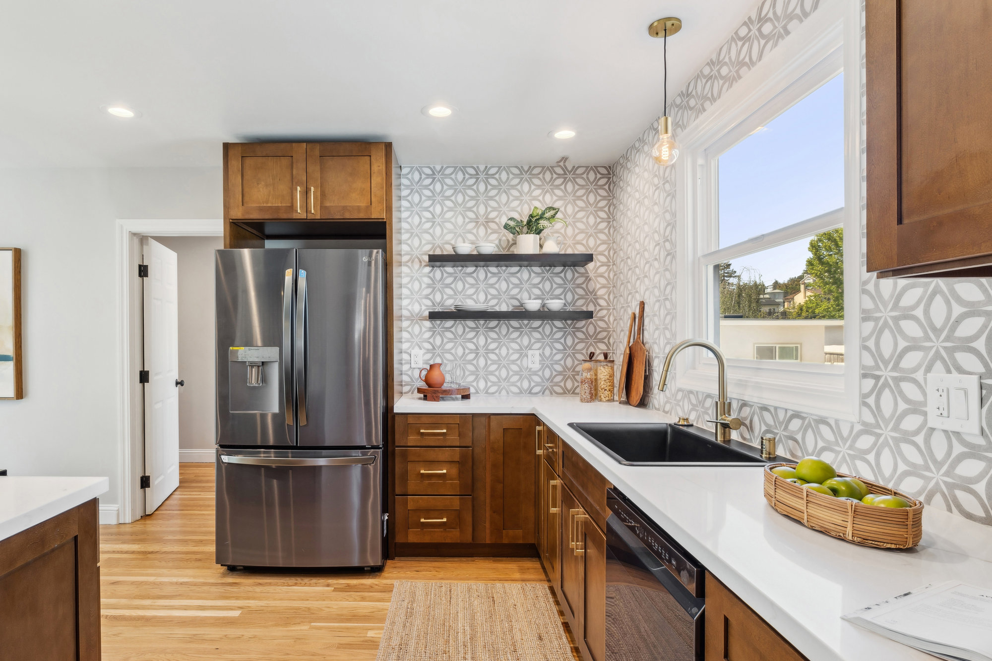 This modern-meets-vintage home features a brand-new chef’s kitchen with counter-to-ceiling designer tile backsplash, quartz countertops, black stainless appliances, abundant cabinetry, and a hall laundry closet. The large, light-filled living and dining area is ideal for gatherings, and the main-level bedroom is paired with an adjacent, design-forward full bath showcasing a frameless glass shower, matte gold fixtures, and Dwell-inspired elements—perfect as a secondary primary suite or flex space. Upstairs has it all! Two bedrooms, a newly remodeled hall bathroom, and a luxe en-suite primary bedroom wing complete with a private deck, San Francisco views, a cozy sitting area, and a spacious walk-in closet. The level rear yard and patios—framed by modern horizontal fencing—are guaranteed to delight and are perfect for indelible summer soirées. Lastly, the large semi-finished basement offers the potential for further opportunities. The one you’ve been waiting for has arrived!