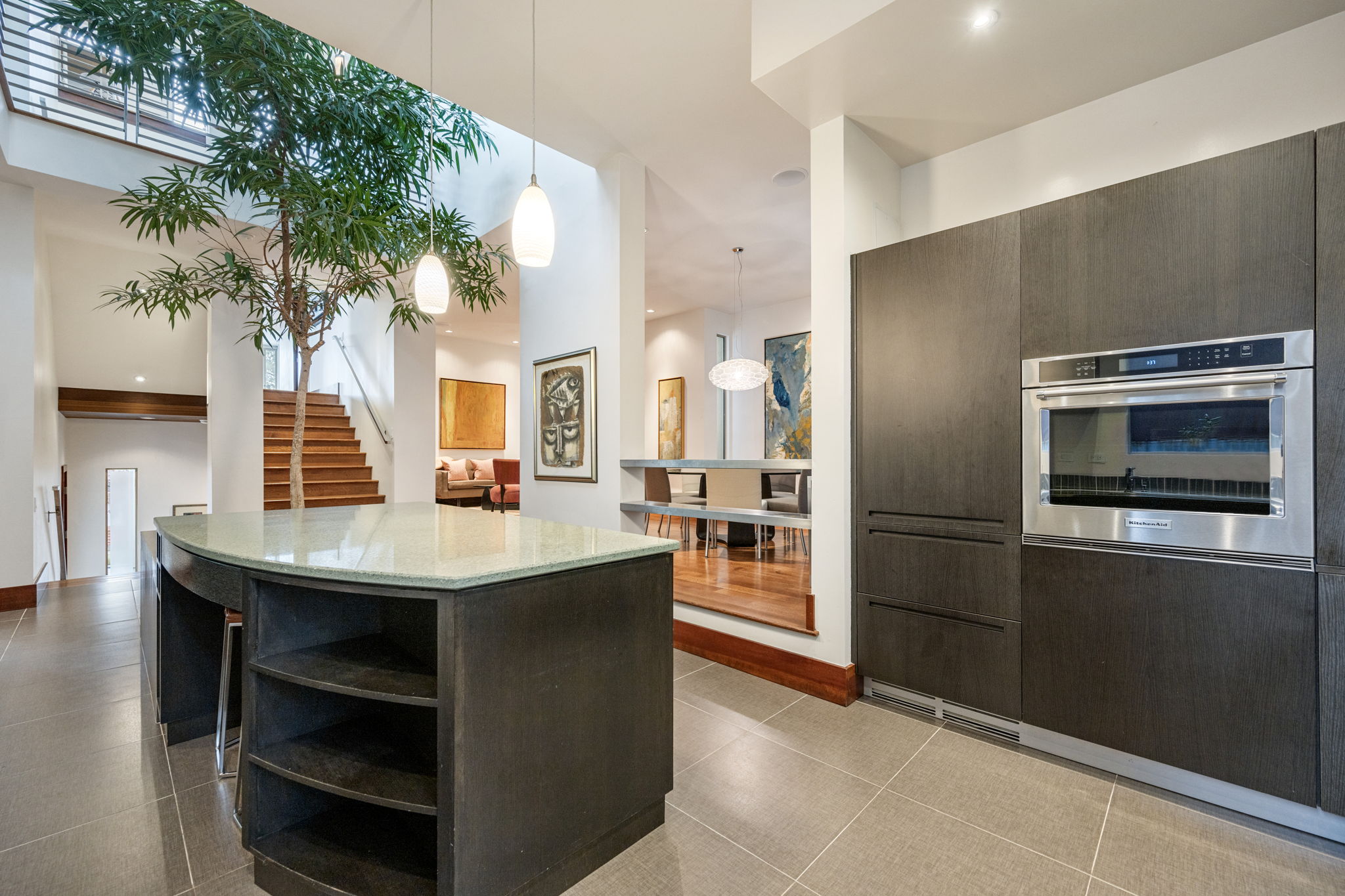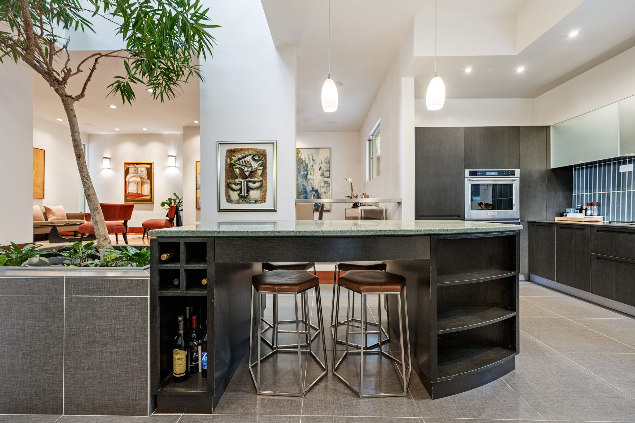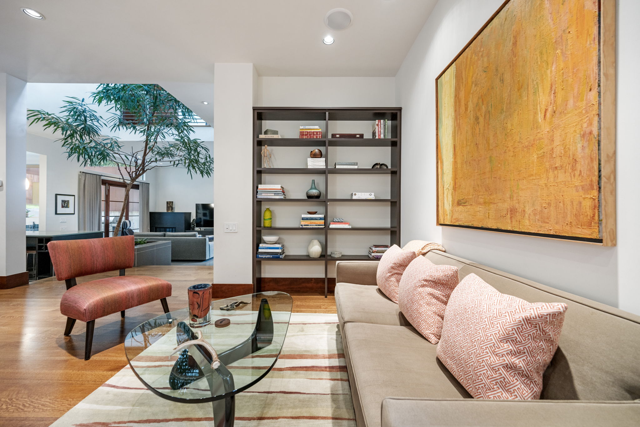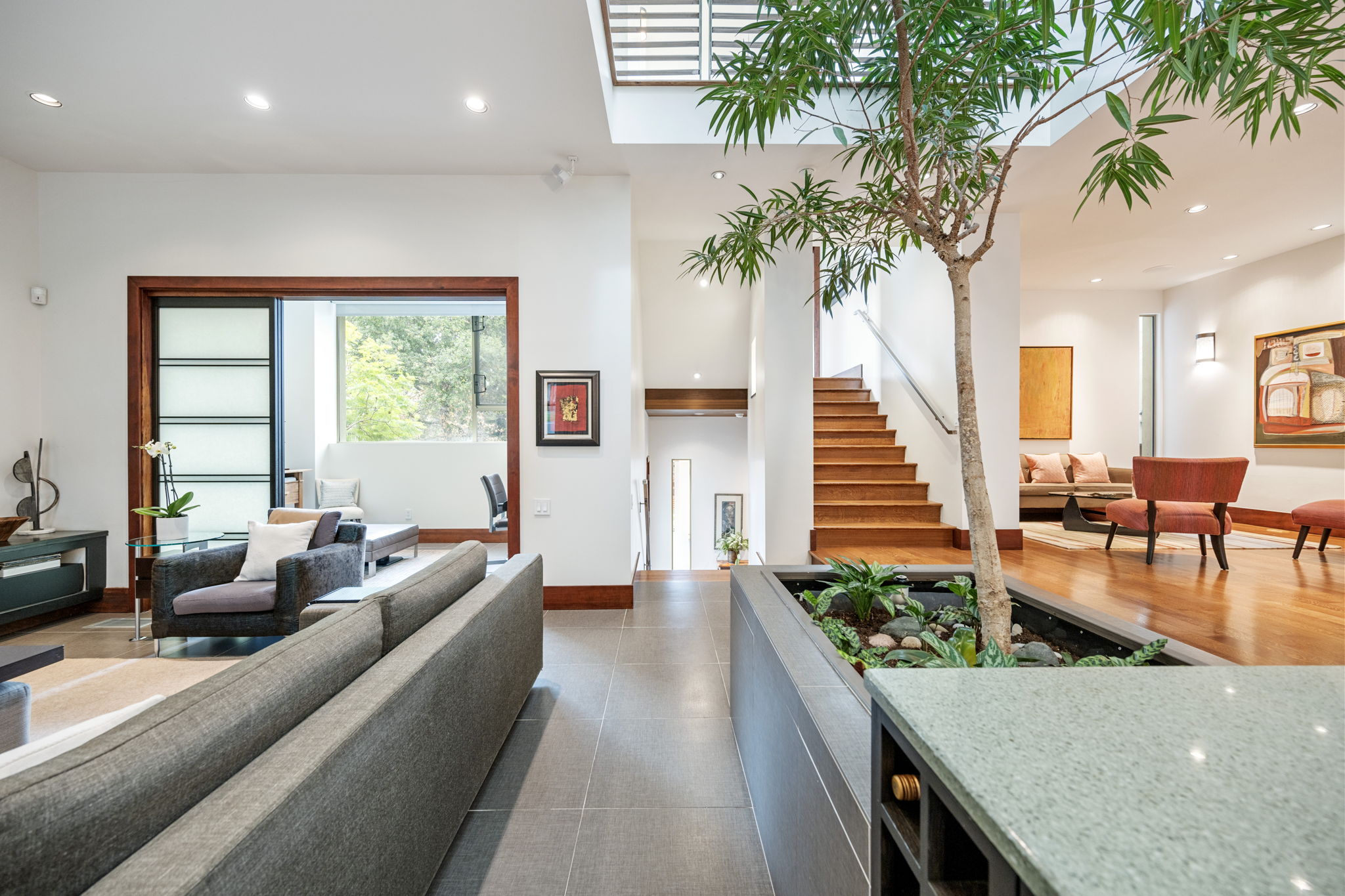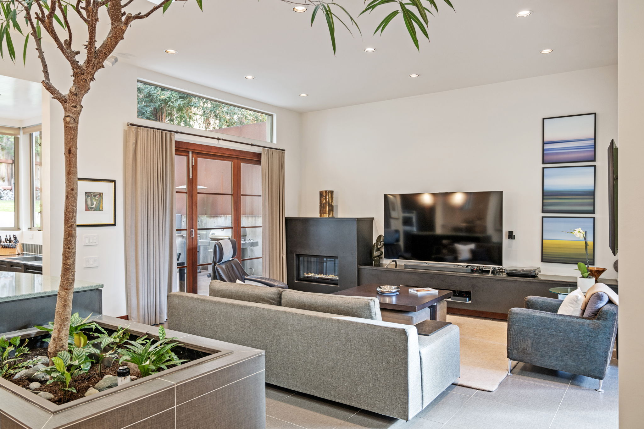 The living space includes soaring ceilings, a stunning indoor ficus tree, custom Boffi kitchen system with stainless steel counters, integrated sink, stainless appliances, Sub-Zero refrigerator, and an under-counter wine fridge. Adjacent split-level living room with modern gas fireplace, elevated ceilings, and doors leading to the private rear patio and gardens. Open dining area, adjacent den area, and separate bonus room-office.