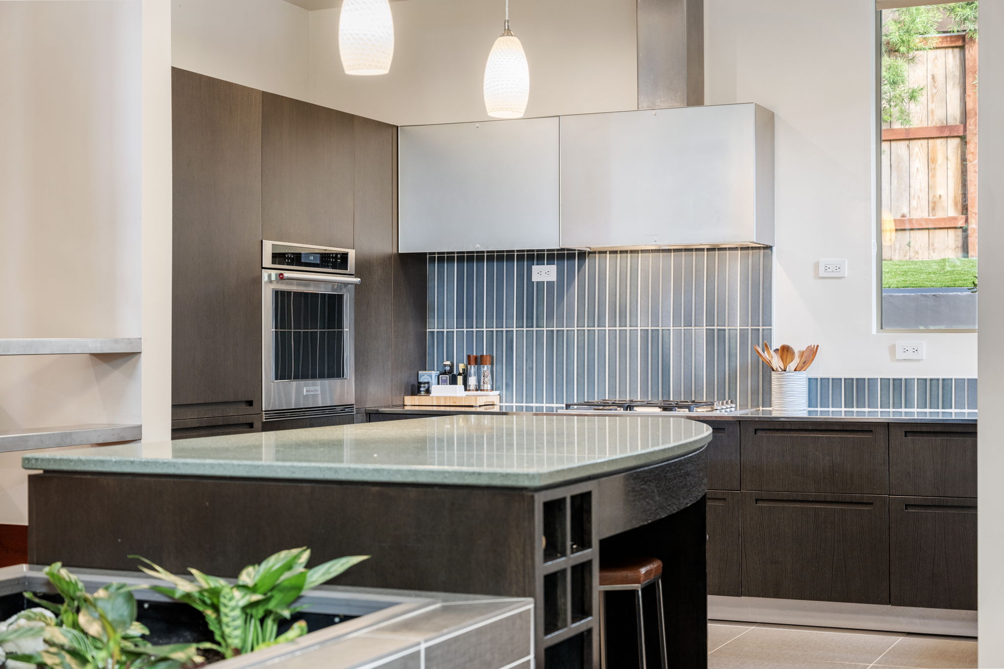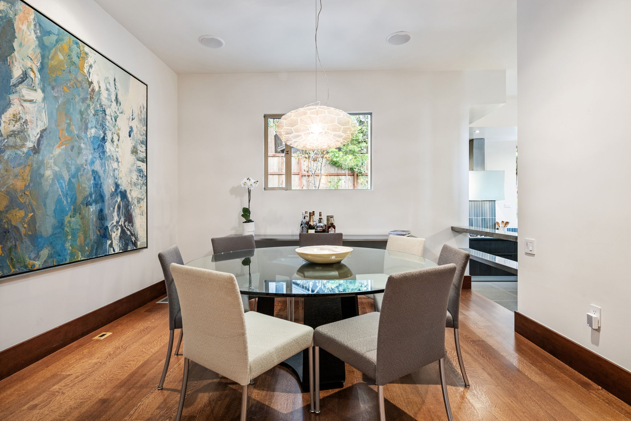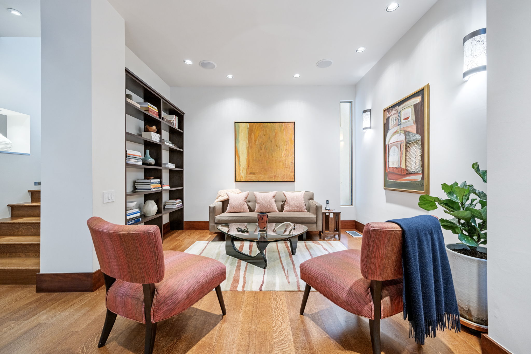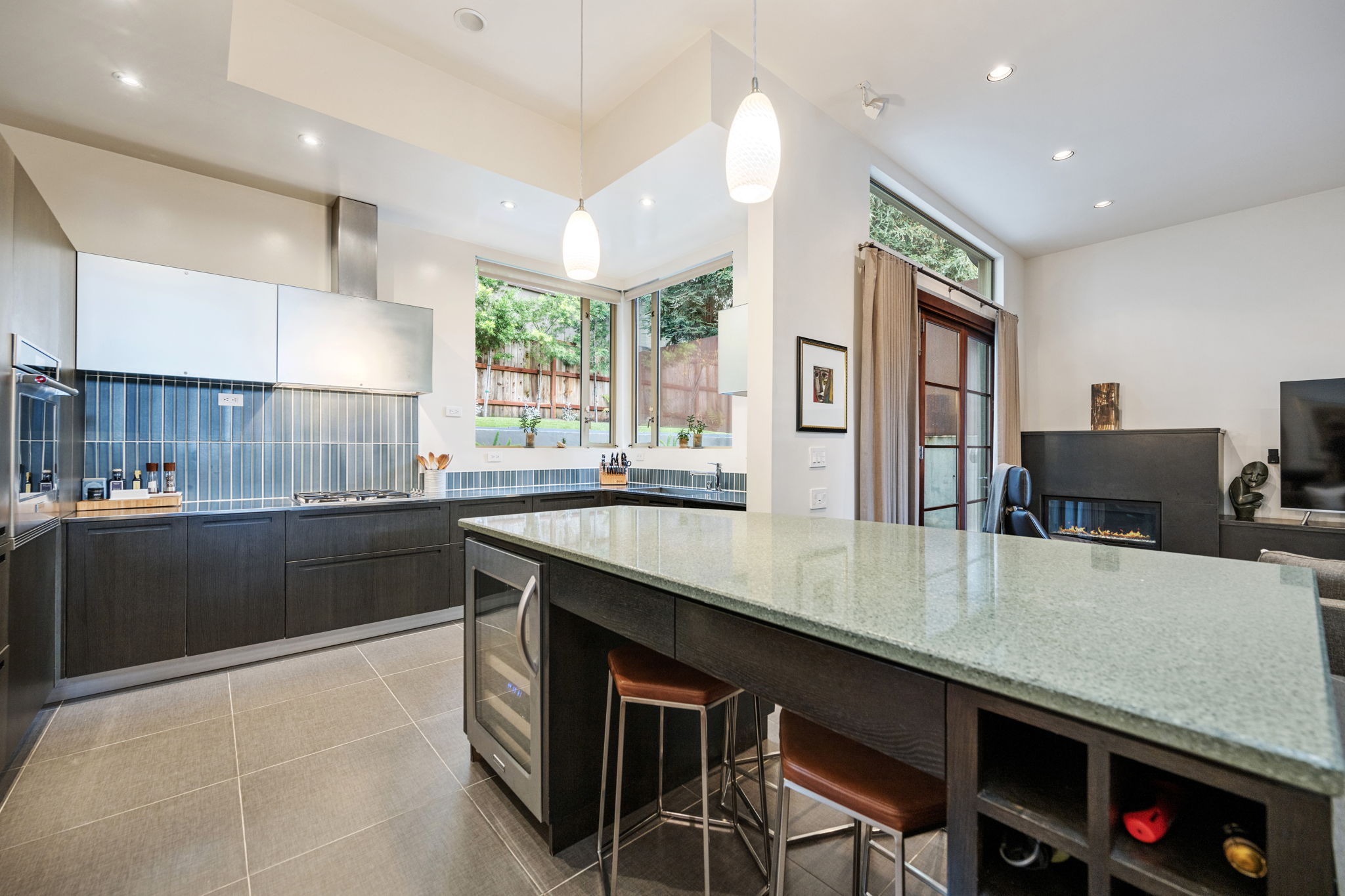 The living space includes soaring ceilings, a stunning indoor ficus tree, custom Boffi kitchen system with stainless steel counters, integrated sink, stainless appliances, Sub-Zero refrigerator, and an under-counter wine fridge. Adjacent split-level living room with modern gas fireplace, elevated ceilings, and doors leading to the private rear patio and gardens. Open dining area, adjacent den area, and separate bonus room-office.