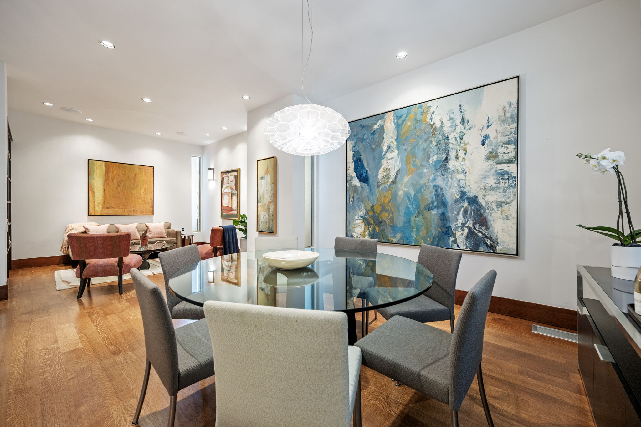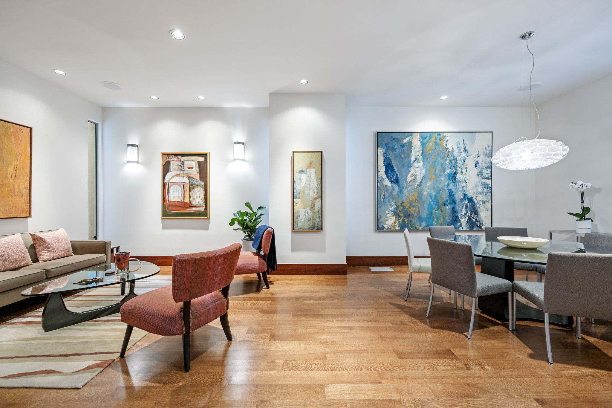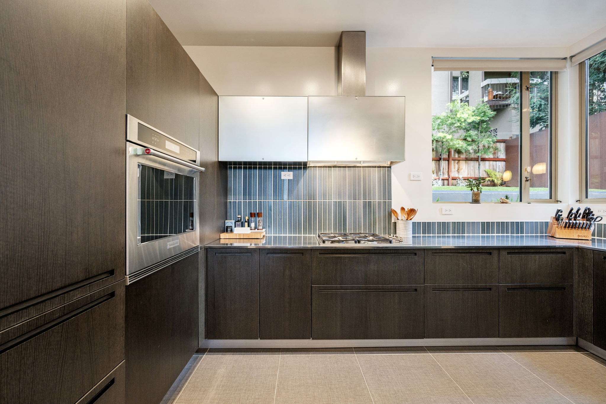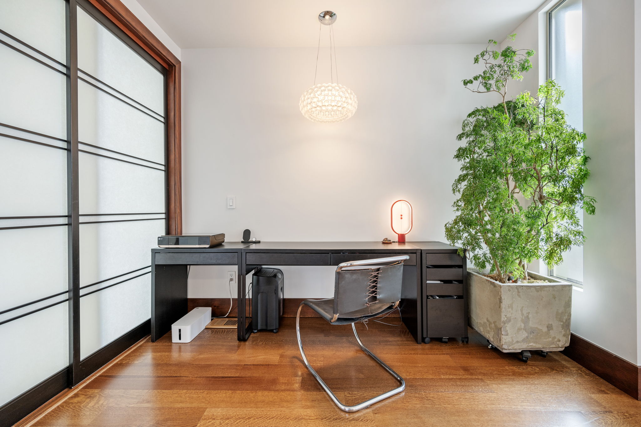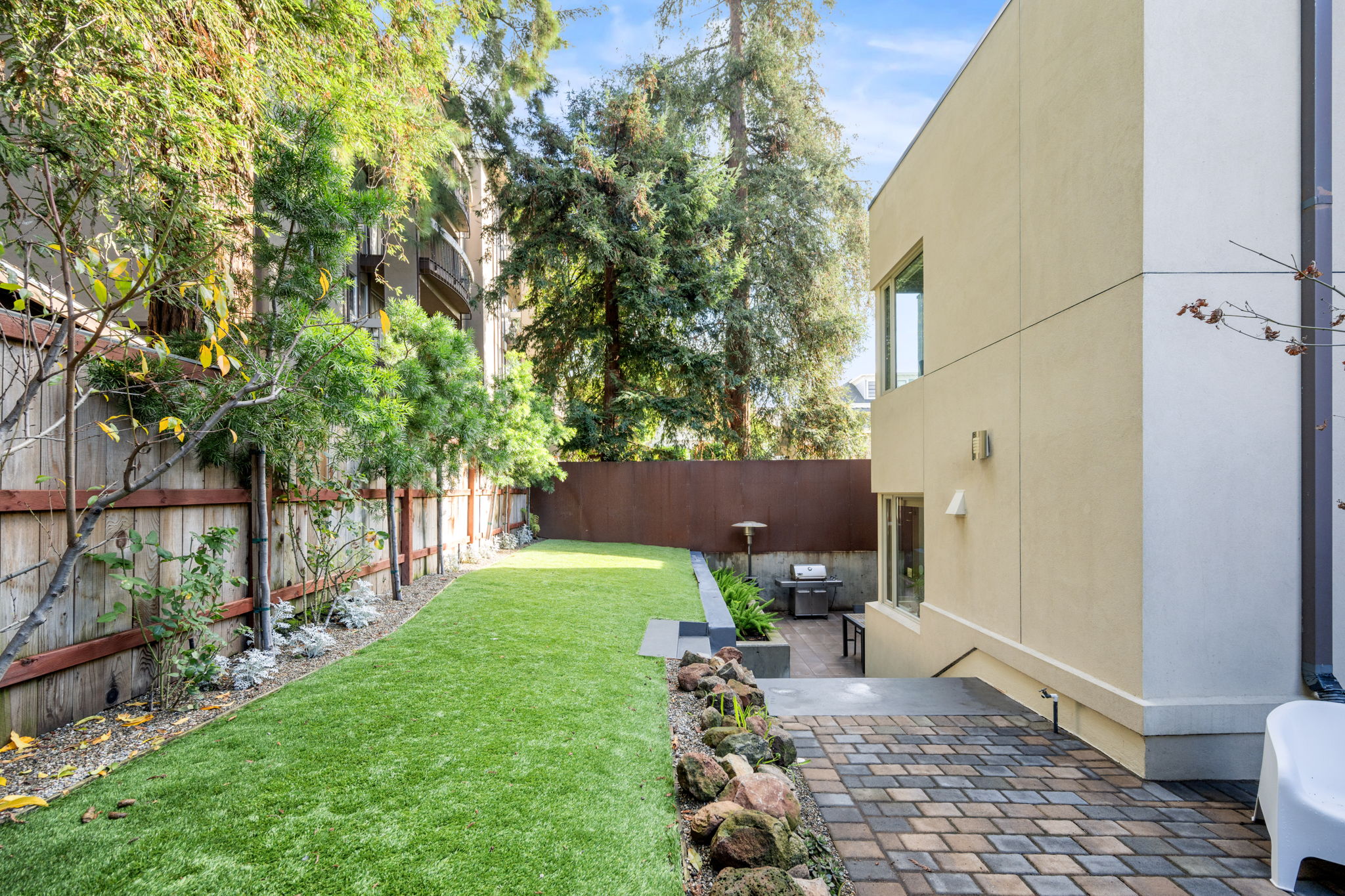 The living space includes soaring ceilings, a stunning indoor ficus tree, custom Boffi kitchen system with stainless steel counters, integrated sink, stainless appliances, Sub-Zero refrigerator, and an under-counter wine fridge. Adjacent split-level living room with modern gas fireplace, elevated ceilings, and doors leading to the private rear patio and gardens. Open dining area, adjacent den area, and separate bonus room-office.