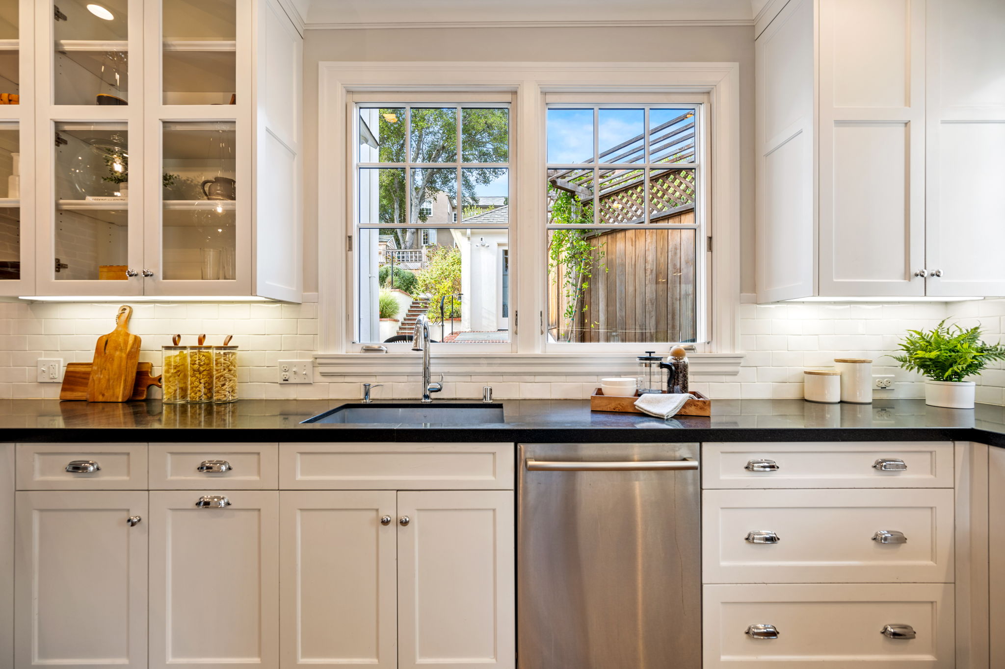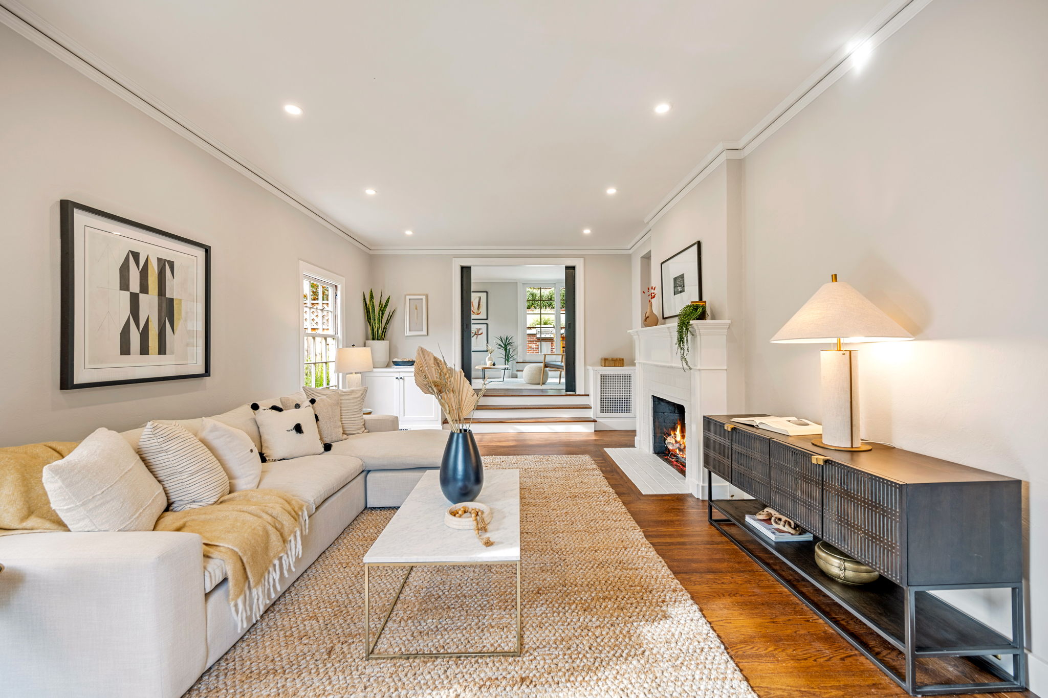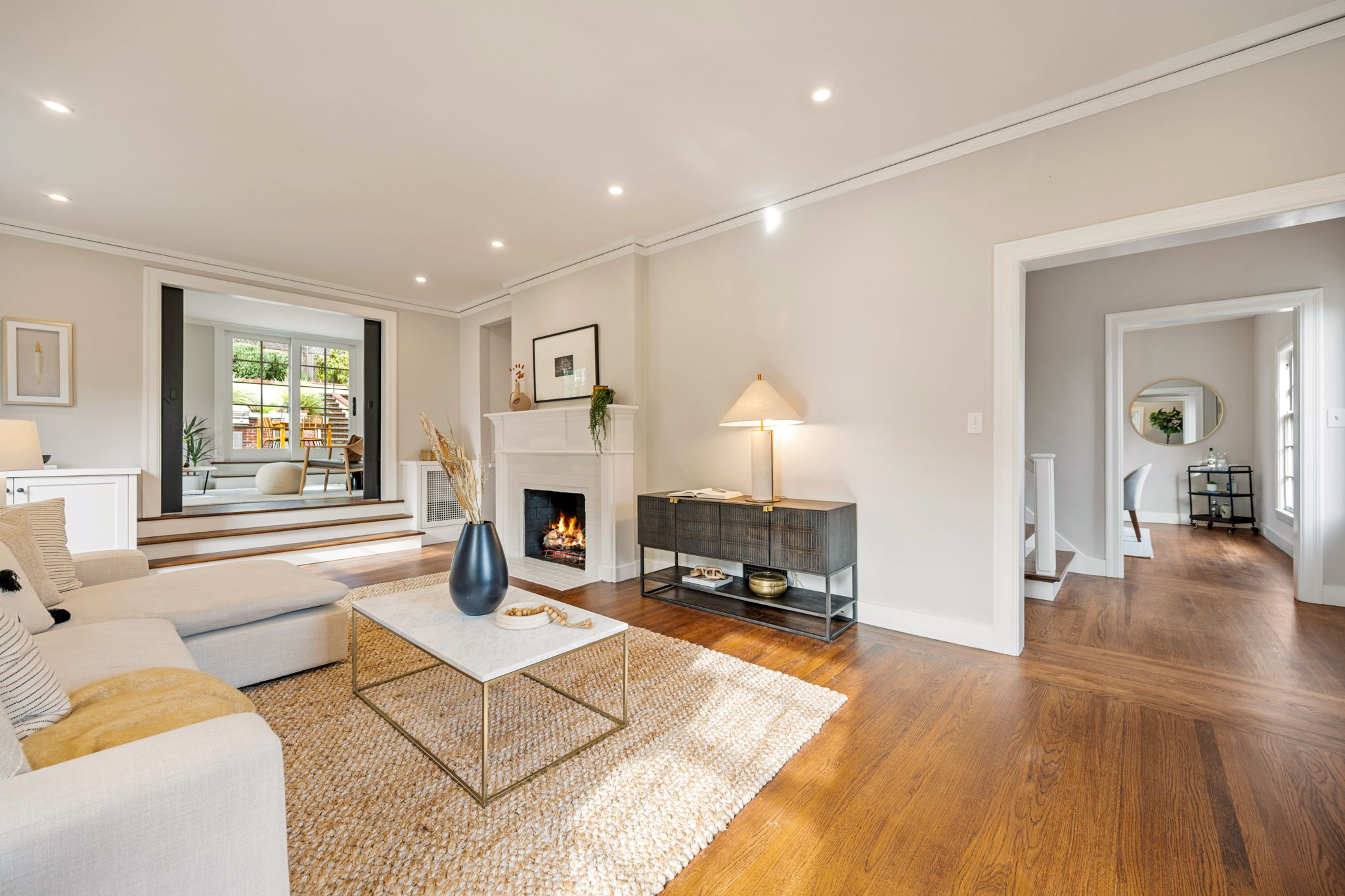 Crocker Highlands Traditional with magnificent gardens, refined aesthetics and artisan finishes. Offering abundant natural light, this lovely home with an ideal floor plan exudes quality finishes paired with vintage elements and custom updates. The large dining room opens to a Jack Backus designed chefโs kitchen with a 6-burner Wolf Range, soapstone countertops, wine cooler, artisan subway tile backsplash, breakfast bar, stainless appliances, and adjacent powder room. The spacious living room with fireplace leads to a split-level lounge area opening onto an entertainerโs patio and gardens, designed by landscape architect Sofia Luis. The patio features a built-in barbecue with a prep station, refrigerator, and custom gas fire pit, complimented by level grass gardens and framed by native northern California flora, perfect for play.
