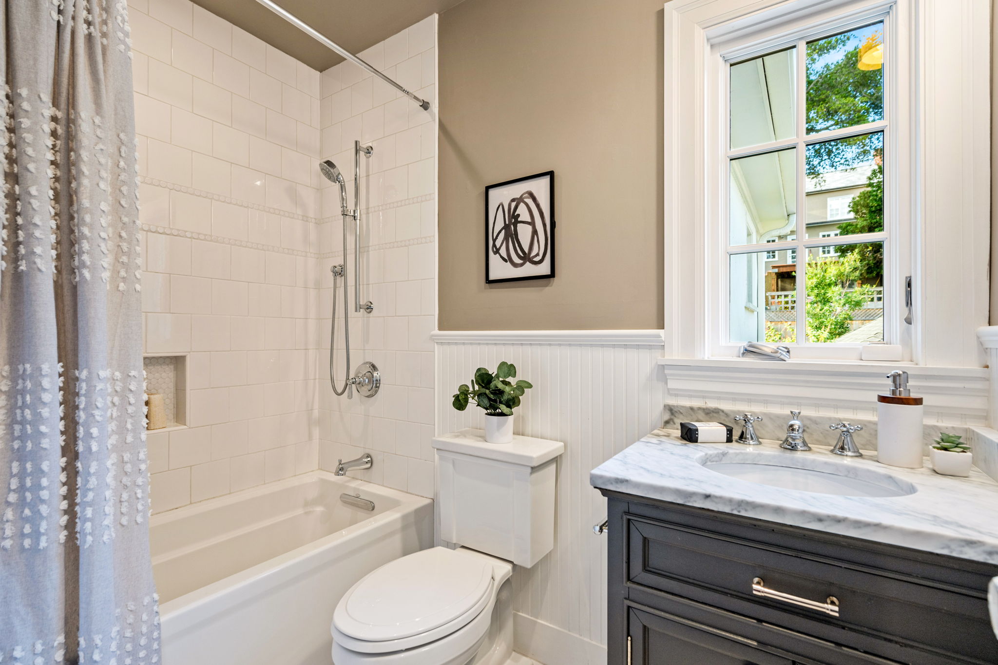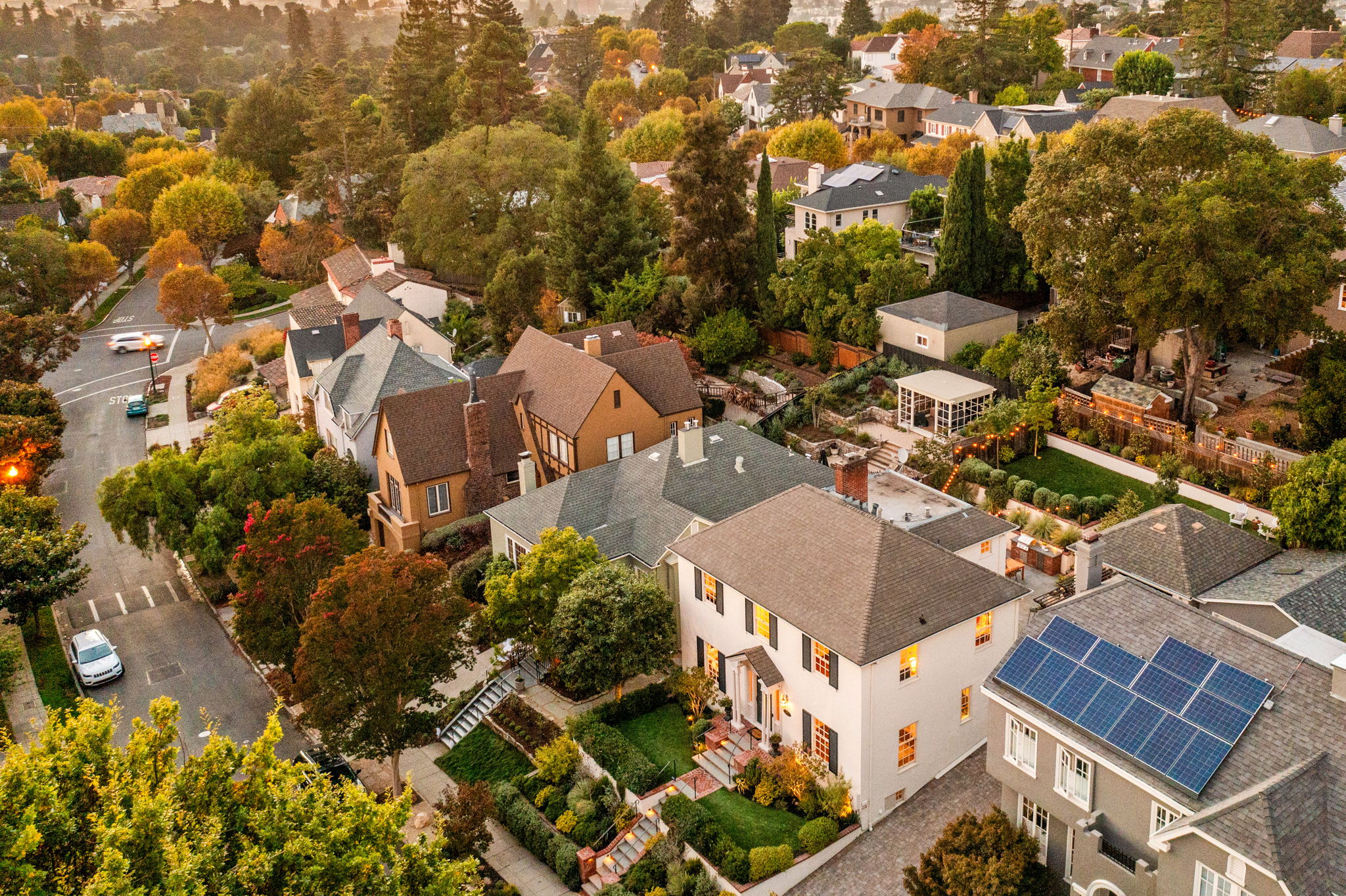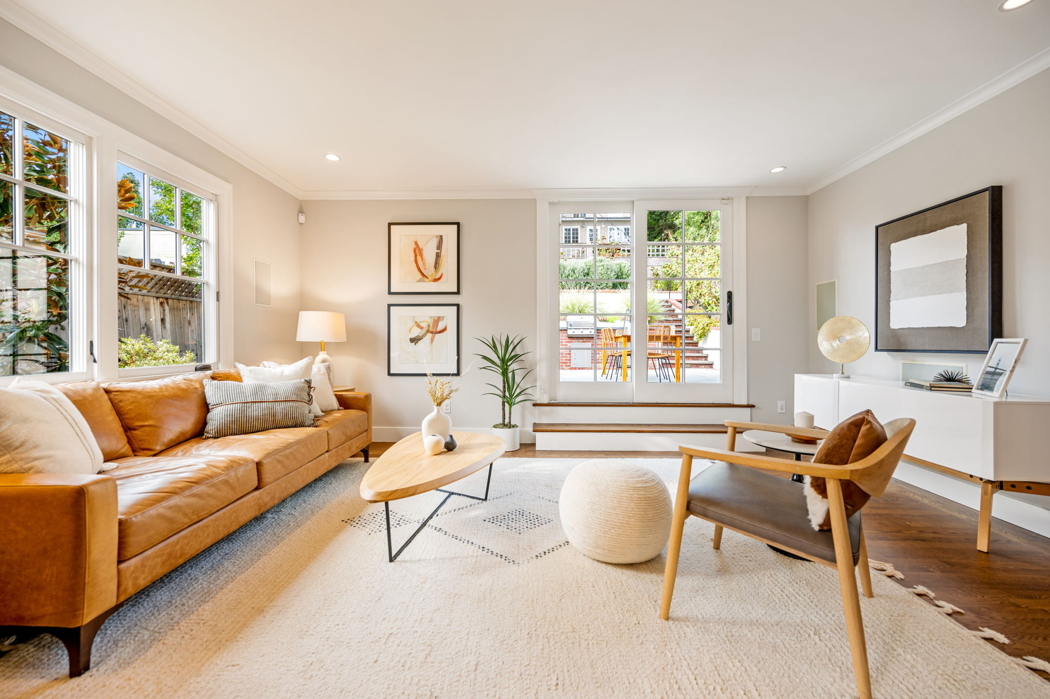 Crocker Highlands Traditional with magnificent gardens, refined aesthetics and artisan finishes. Offering abundant natural light, this lovely home with an ideal floor plan exudes quality finishes paired with vintage elements and custom updates. The large dining room opens to a Jack Backus designed chefโs kitchen with a 6-burner Wolf Range, soapstone countertops, wine cooler, artisan subway tile backsplash, breakfast bar, stainless appliances, and adjacent powder room. The spacious living room with fireplace leads to a split-level lounge area opening onto an entertainerโs patio and gardens, designed by landscape architect Sofia Luis. The patio features a built-in barbecue with a prep station, refrigerator, and custom gas fire pit, complimented by level grass gardens and framed by native northern California flora, perfect for play.