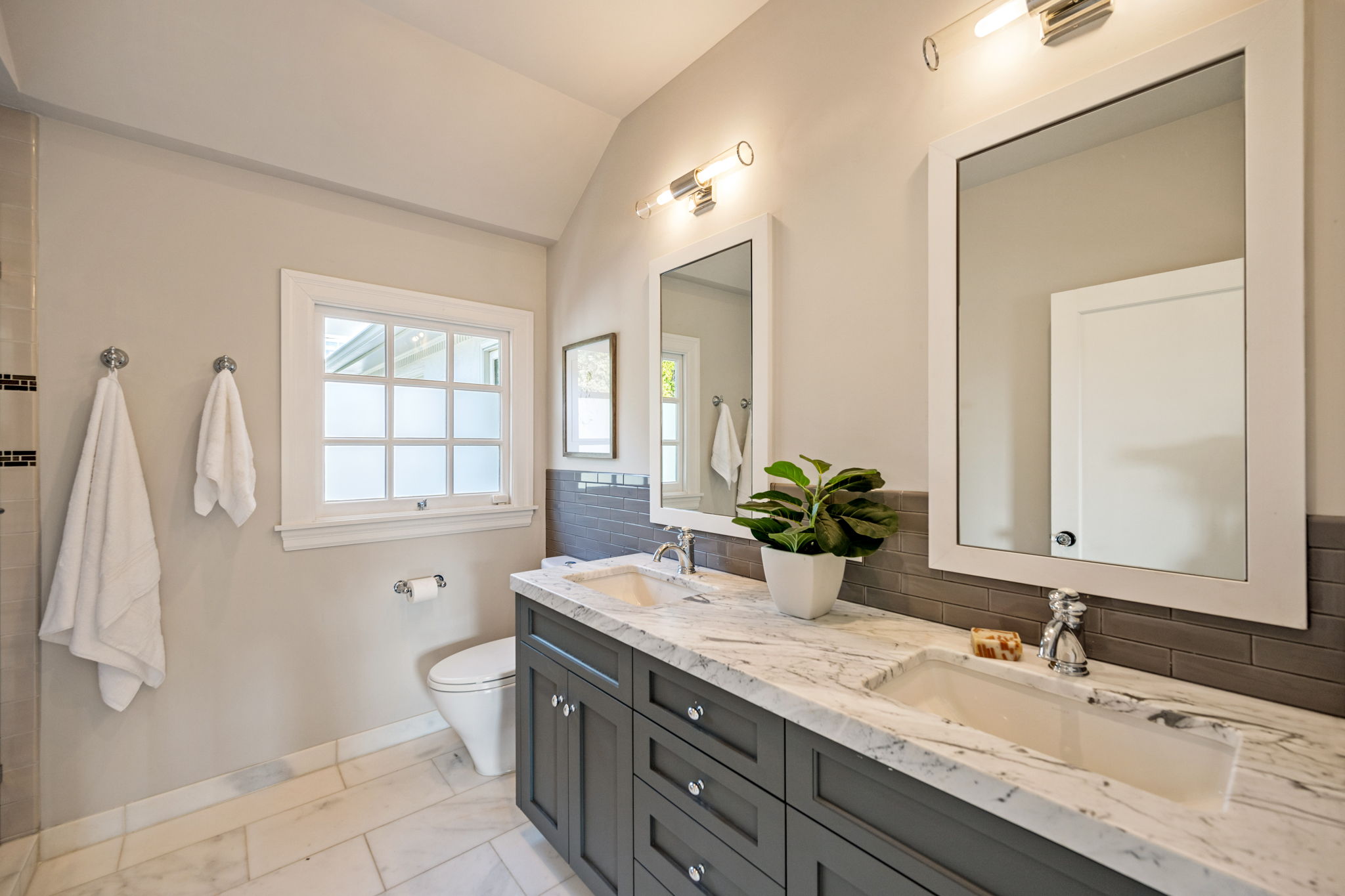 The upstairs level of the home offers an expansive primary suite with spa-inspired bath featuring marble counters and frameless glass shower, two more bedrooms connected by a modern Jack & Jill bathroom, and an additional full hall bath adjacent to the fourth bedroom.