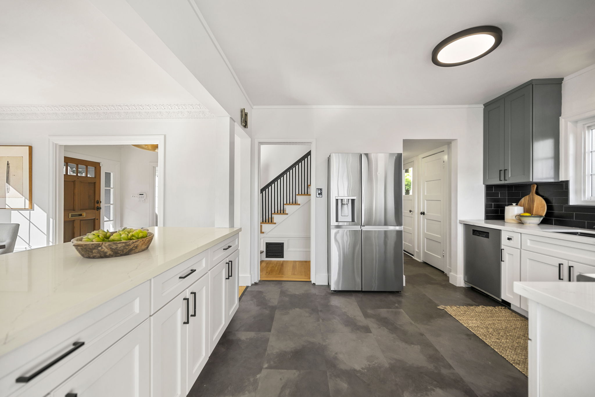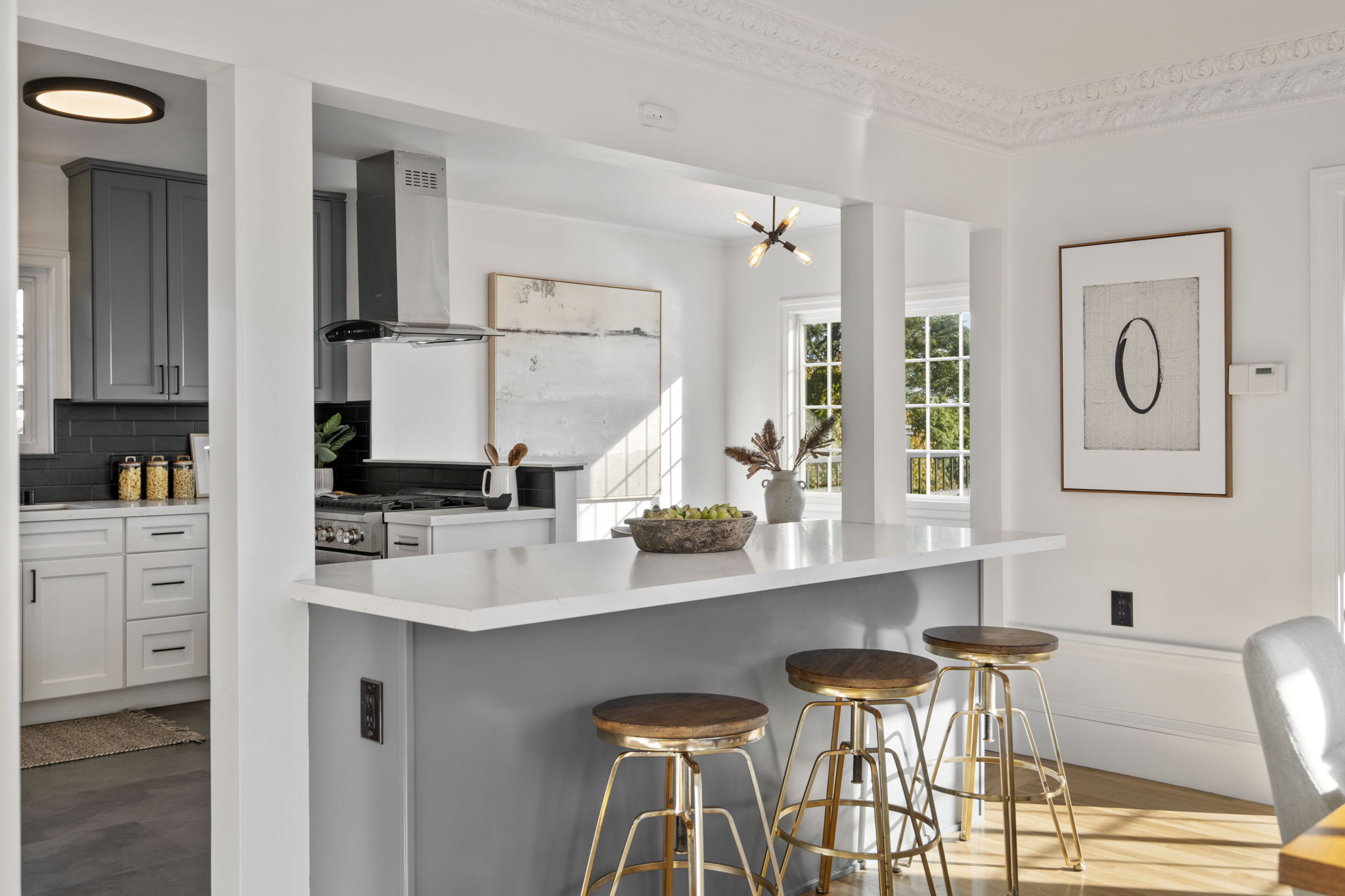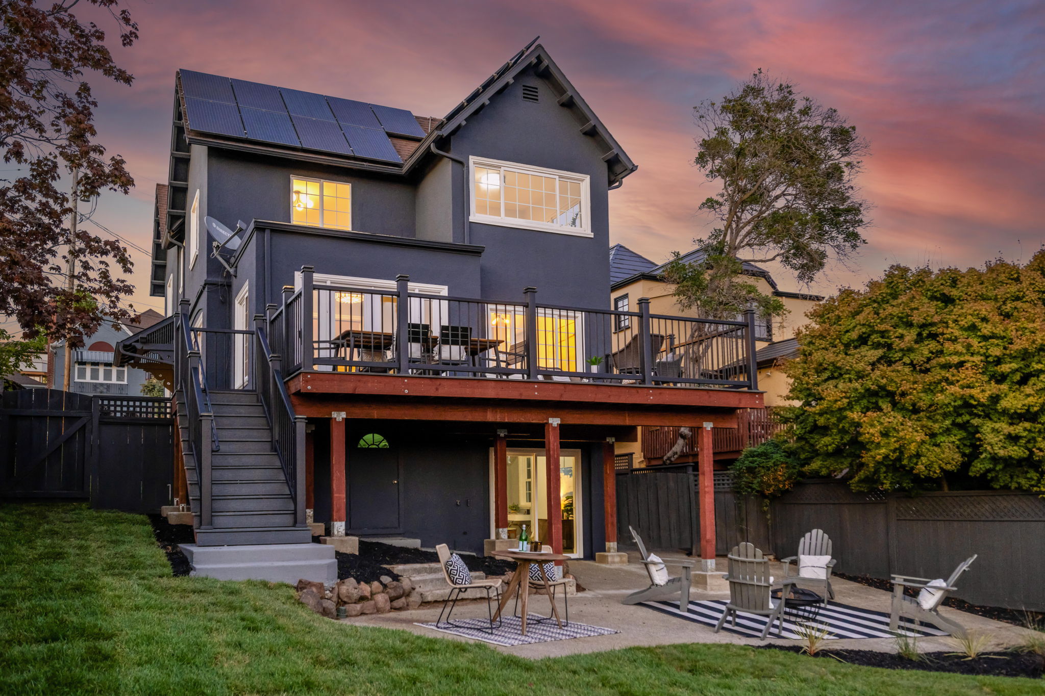 Three bedrooms and two baths are found upstairs including a stunning primary suite with a chic updated bathroom with designer tile and fixtures, as well as a separate, additional walk-in flex space, perfect as an office, retreat area, or closet. The hall bathroom boasts modern finishes and elements worthy of a designer showcase exhibit. The lower level of the home offers additional space that could easily be used as a den, rumpus play area of home gym. With doors directly out to the rear gardens, its potential uses are many! The property-owned solar panels are ready to be connected for clean, green energy power.
