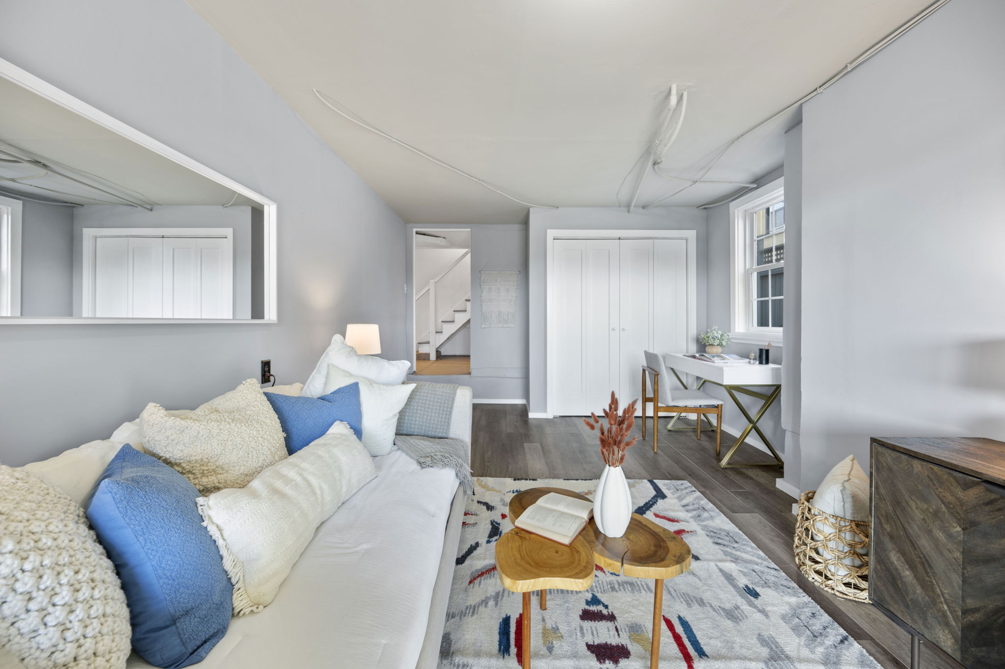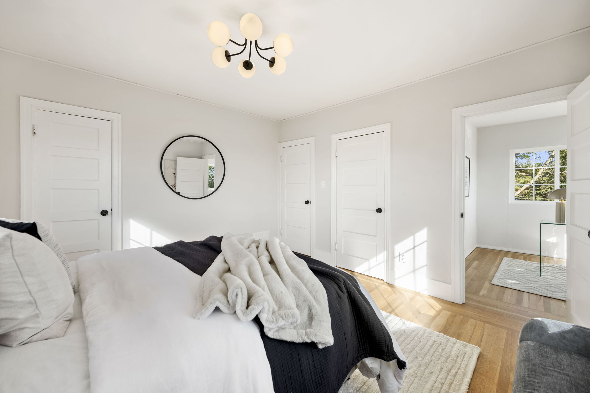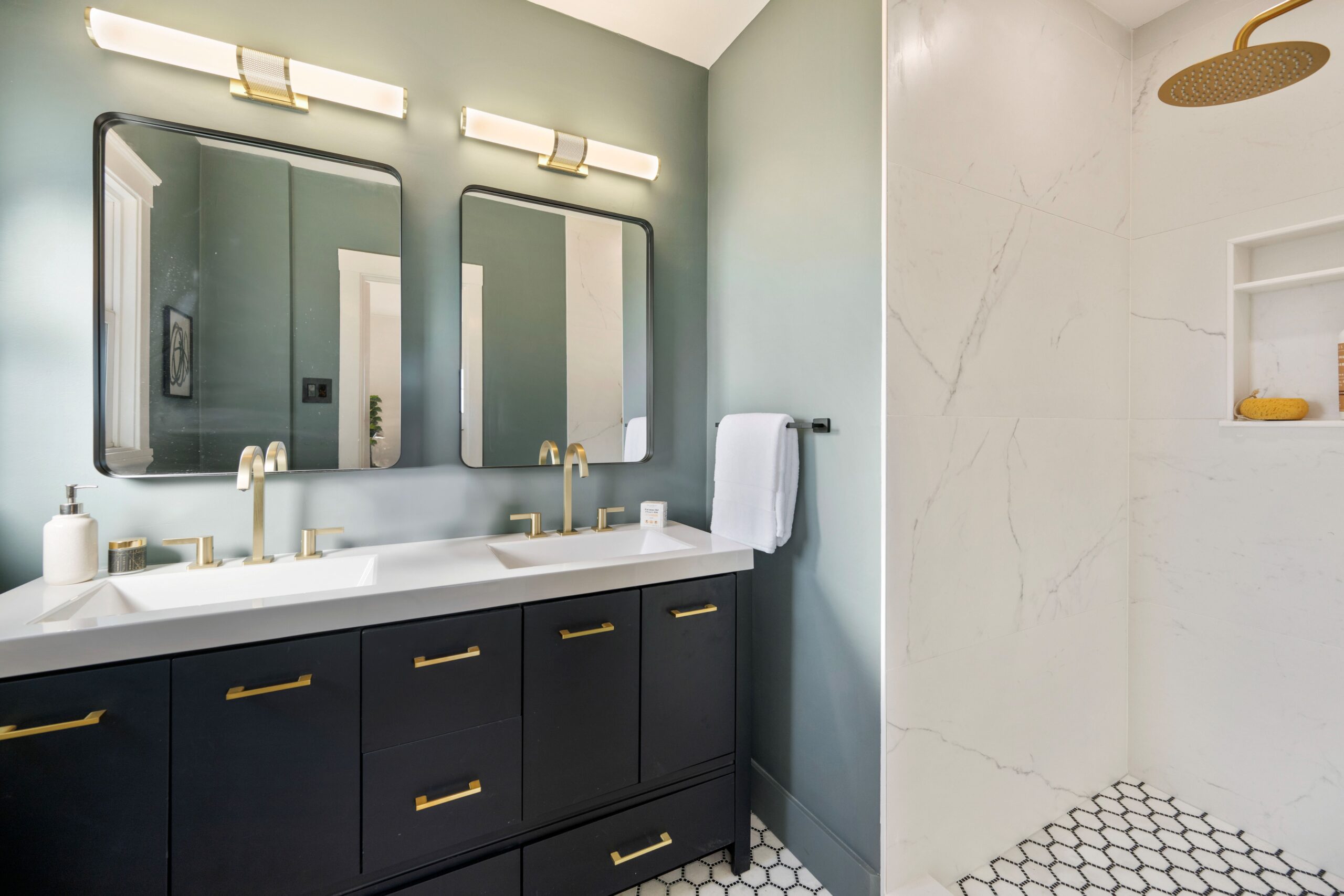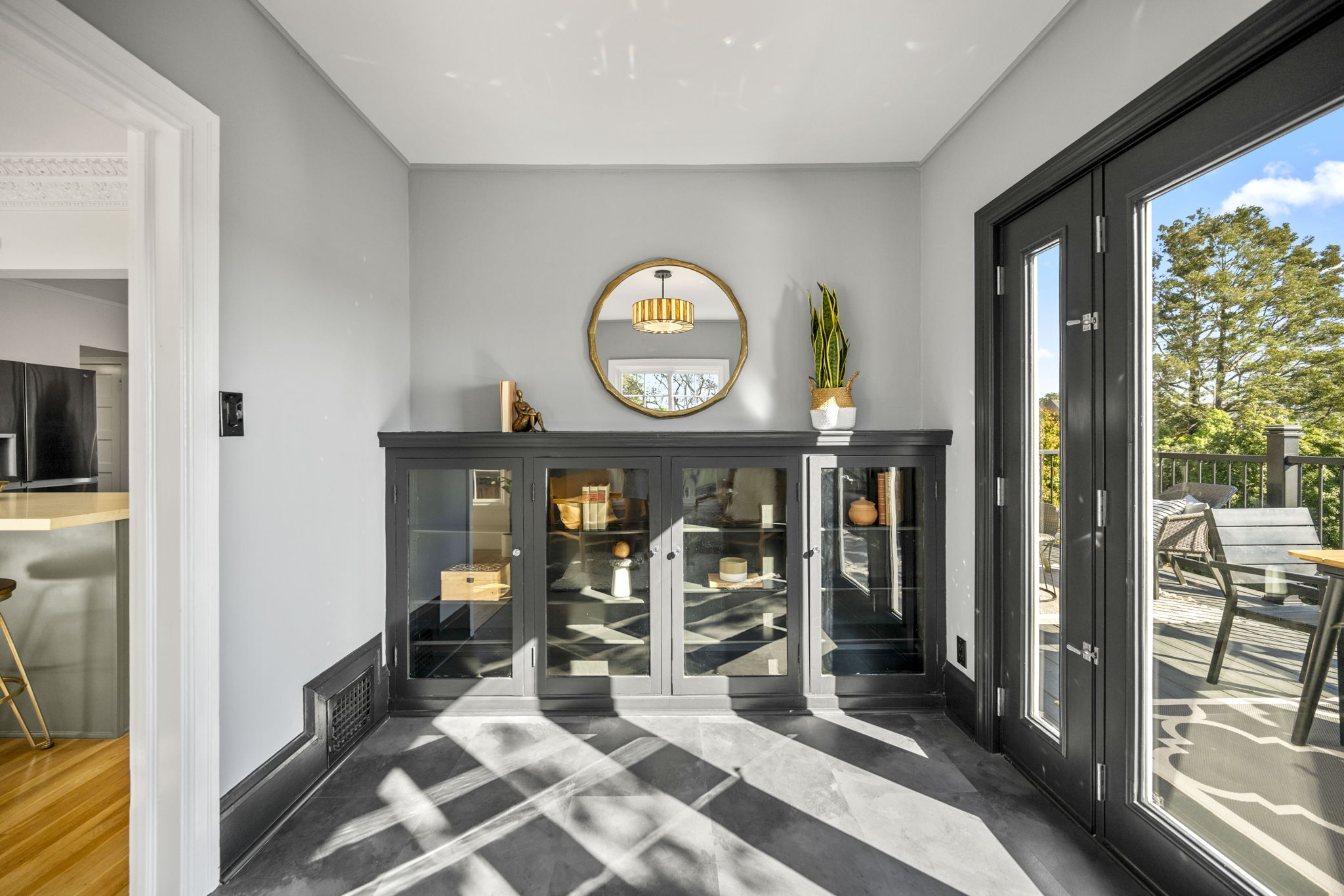 Three bedrooms and two baths are found upstairs including a stunning primary suite with a chic updated bathroom with designer tile and fixtures, as well as a separate, additional walk-in flex space, perfect as an office, retreat area, or closet. The hall bathroom boasts modern finishes and elements worthy of a designer showcase exhibit. The lower level of the home offers additional space that could easily be used as a den, rumpus play area of home gym. With doors directly out to the rear gardens, its potential uses are many! The property-owned solar panels are ready to be connected for clean, green energy power.