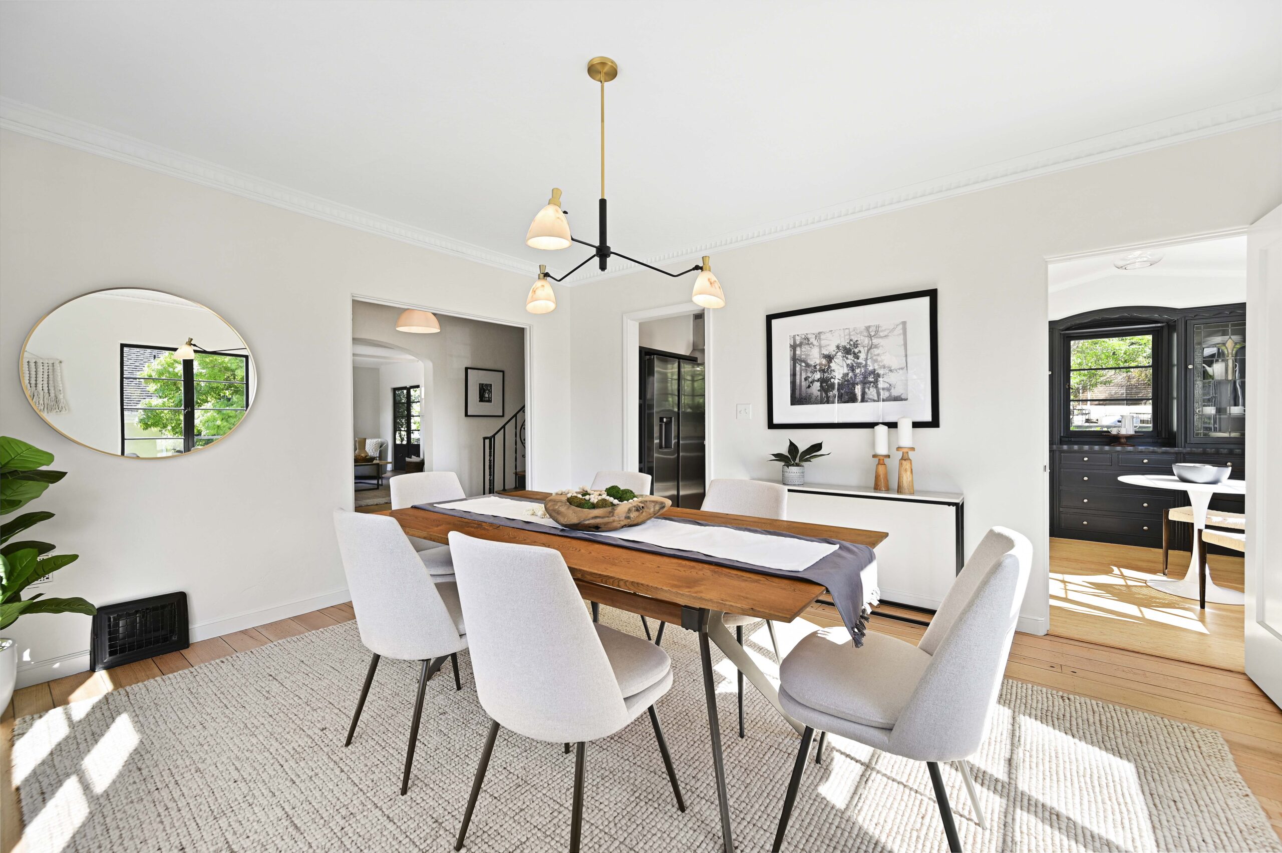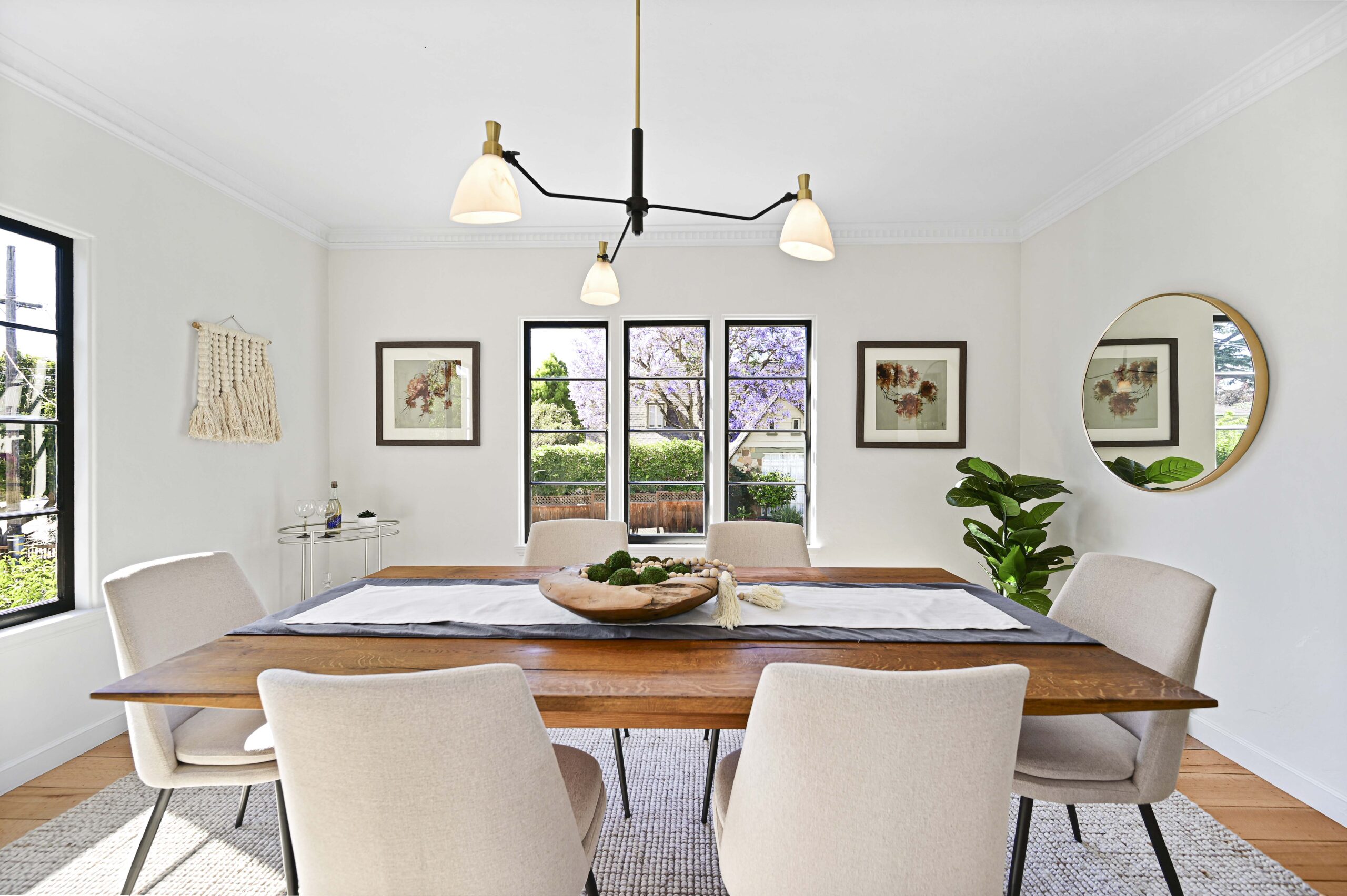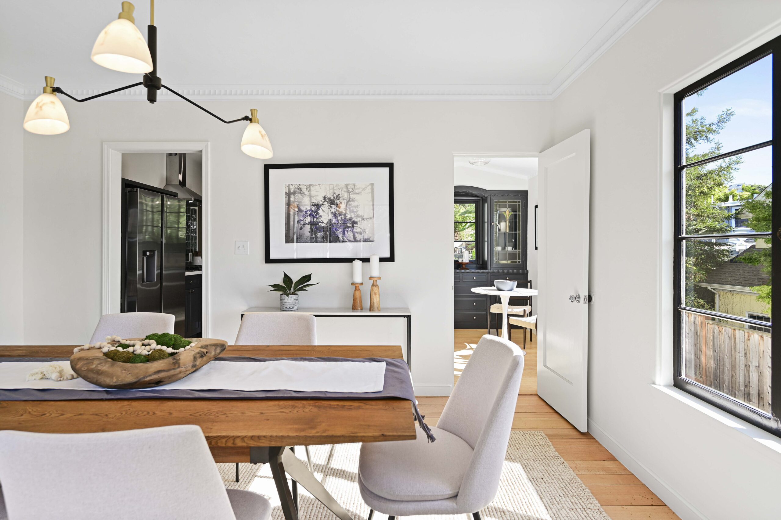 Cozy wood-paneled lounge/office and a full bathroom complete the main level. Three bedrooms and 2 full baths up, including the primary suite, and a covered balcony. Sunny private garden and patios for entertaining and a large grassy space for play. Lower level offering direct access to the garage, laundry room and den area that leads directly out to the private rear gardens. Just blocks from the award winning Crocker Highlands Elementary, the shops and restaurants of Grand Lake, Saturday Farmers Market, the the Bay Bridge to San Francisco, and just a block from the bus to BART.