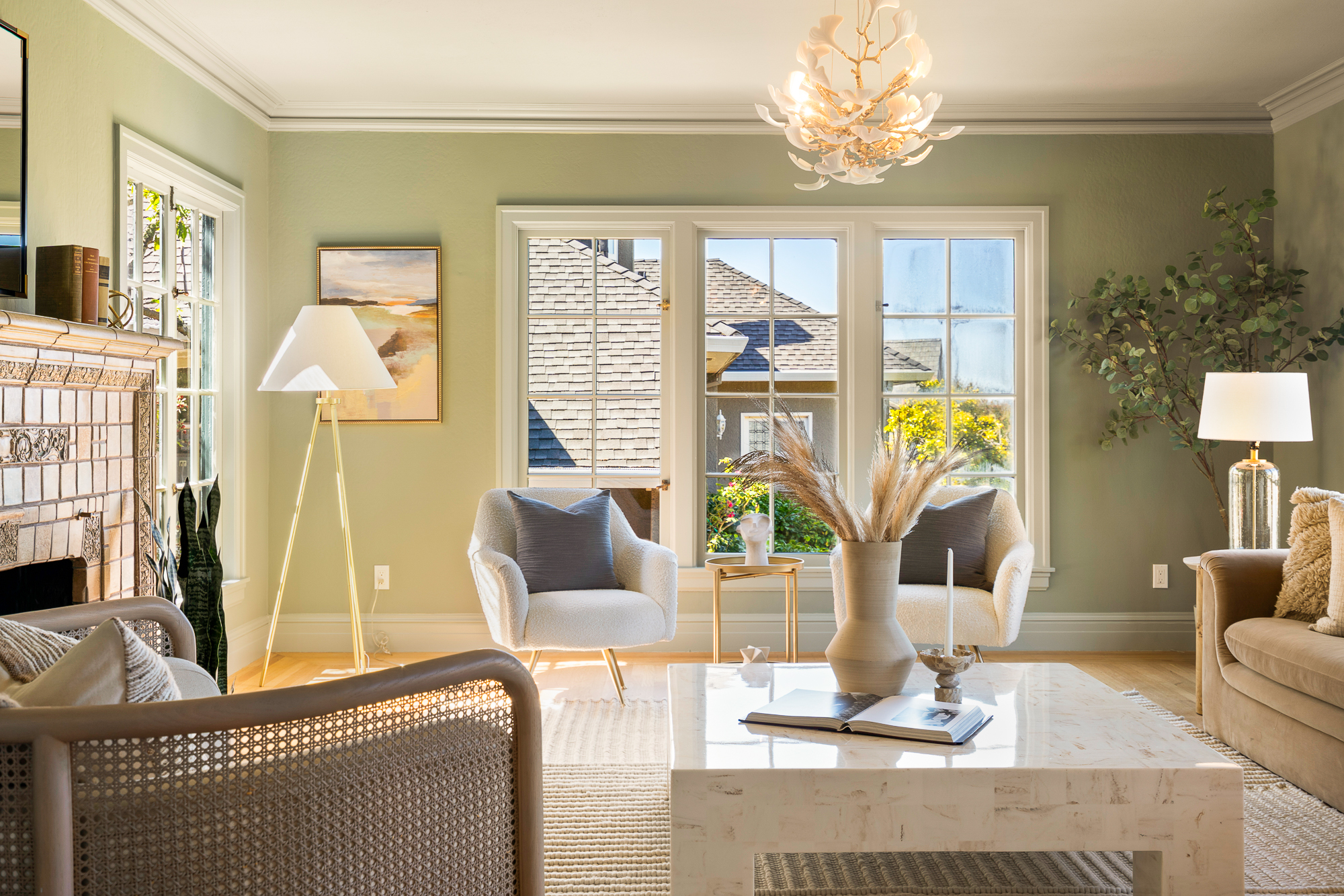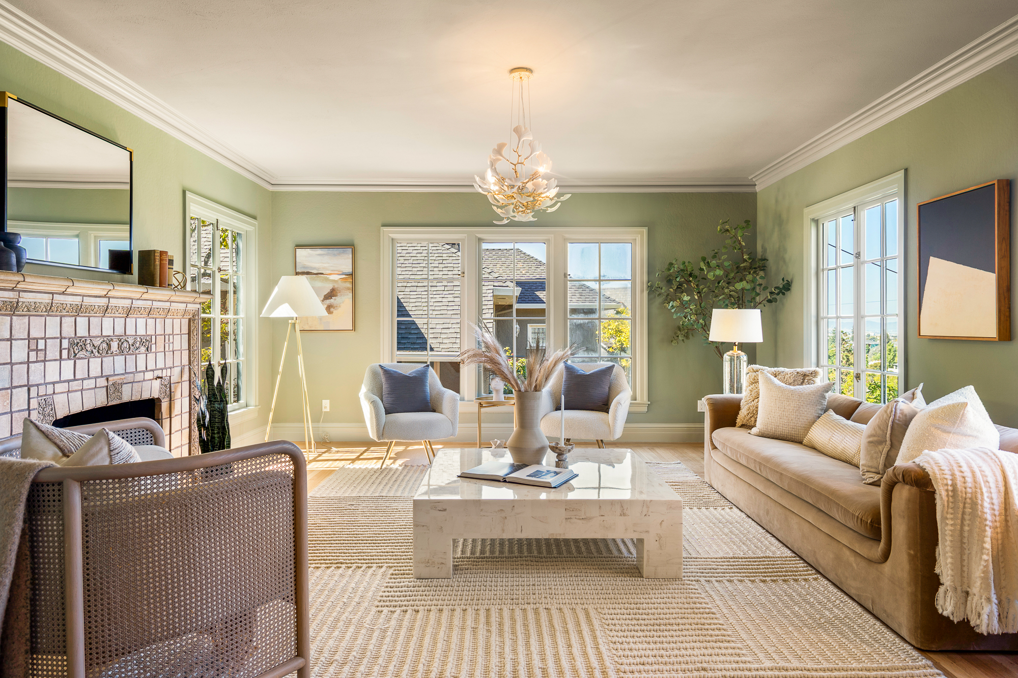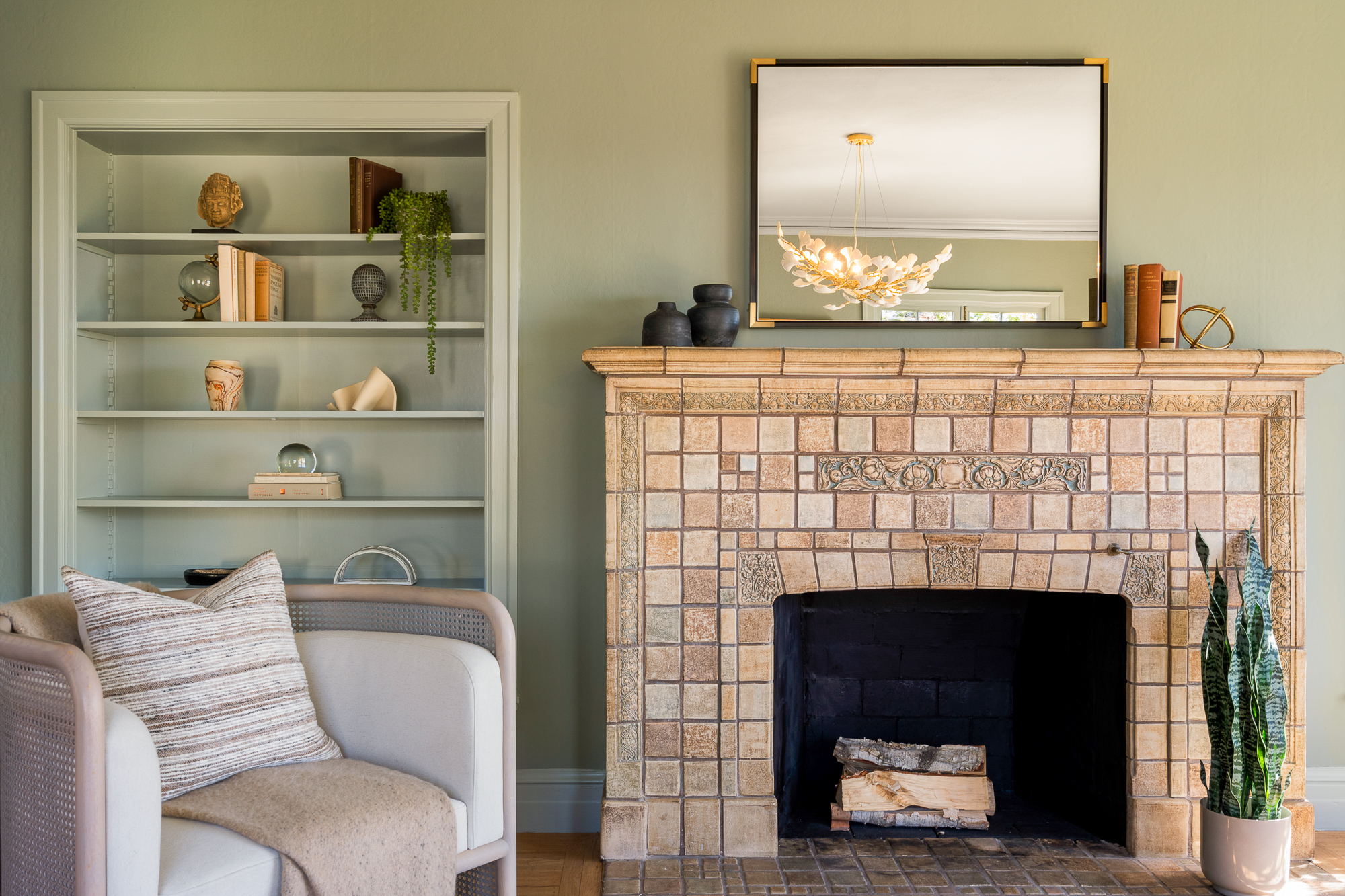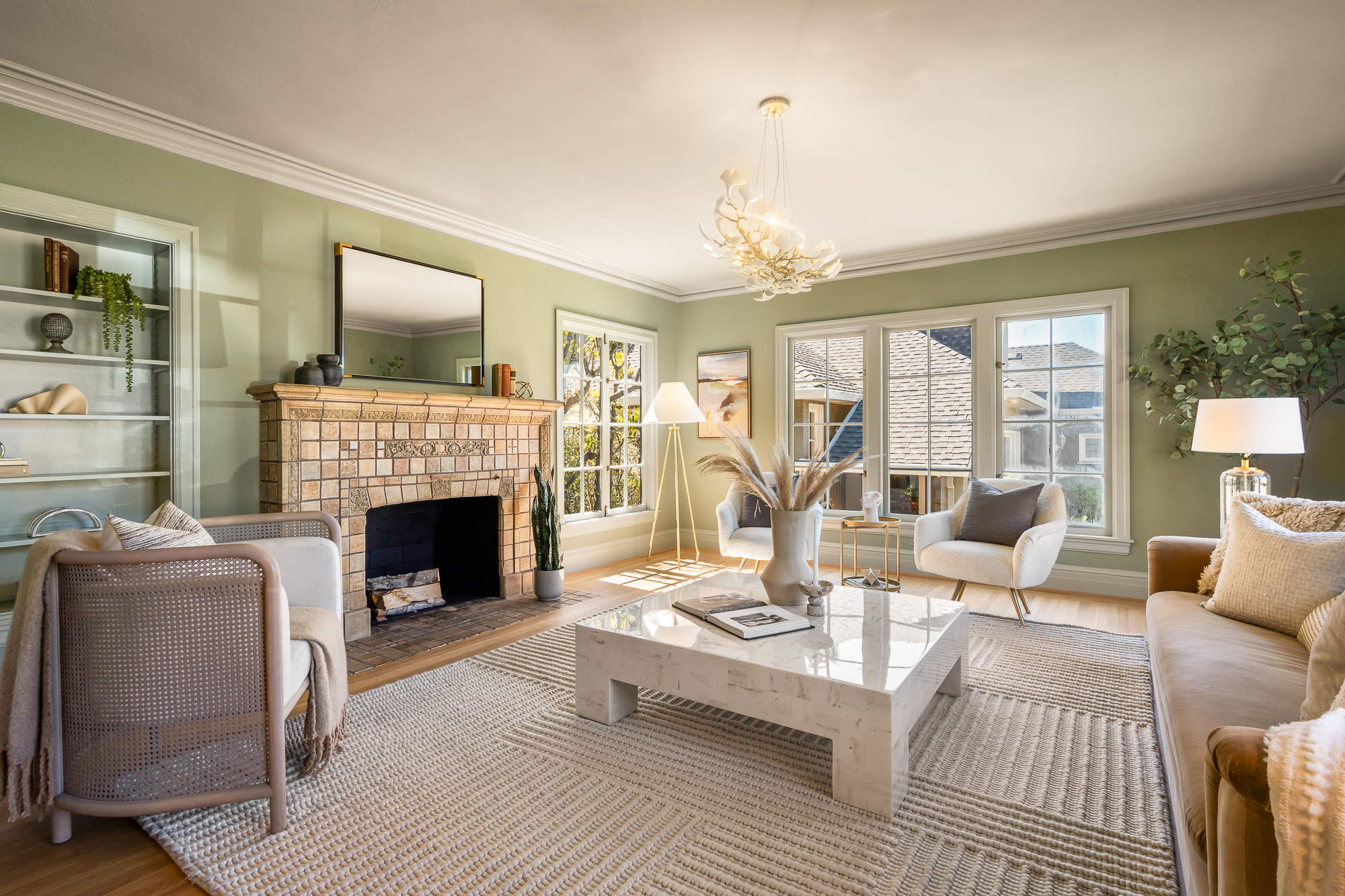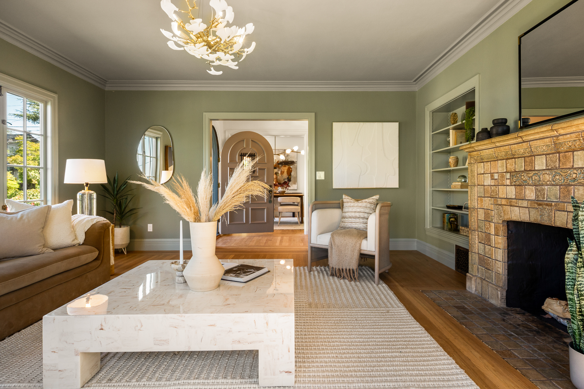 The light-filled living room is anchored by a striking fireplace with a vintage surround and artisan tile. Designer lighting and nine French windows frame an enchanting two-bridge Bay view, infusing the space with warmth and elegance.