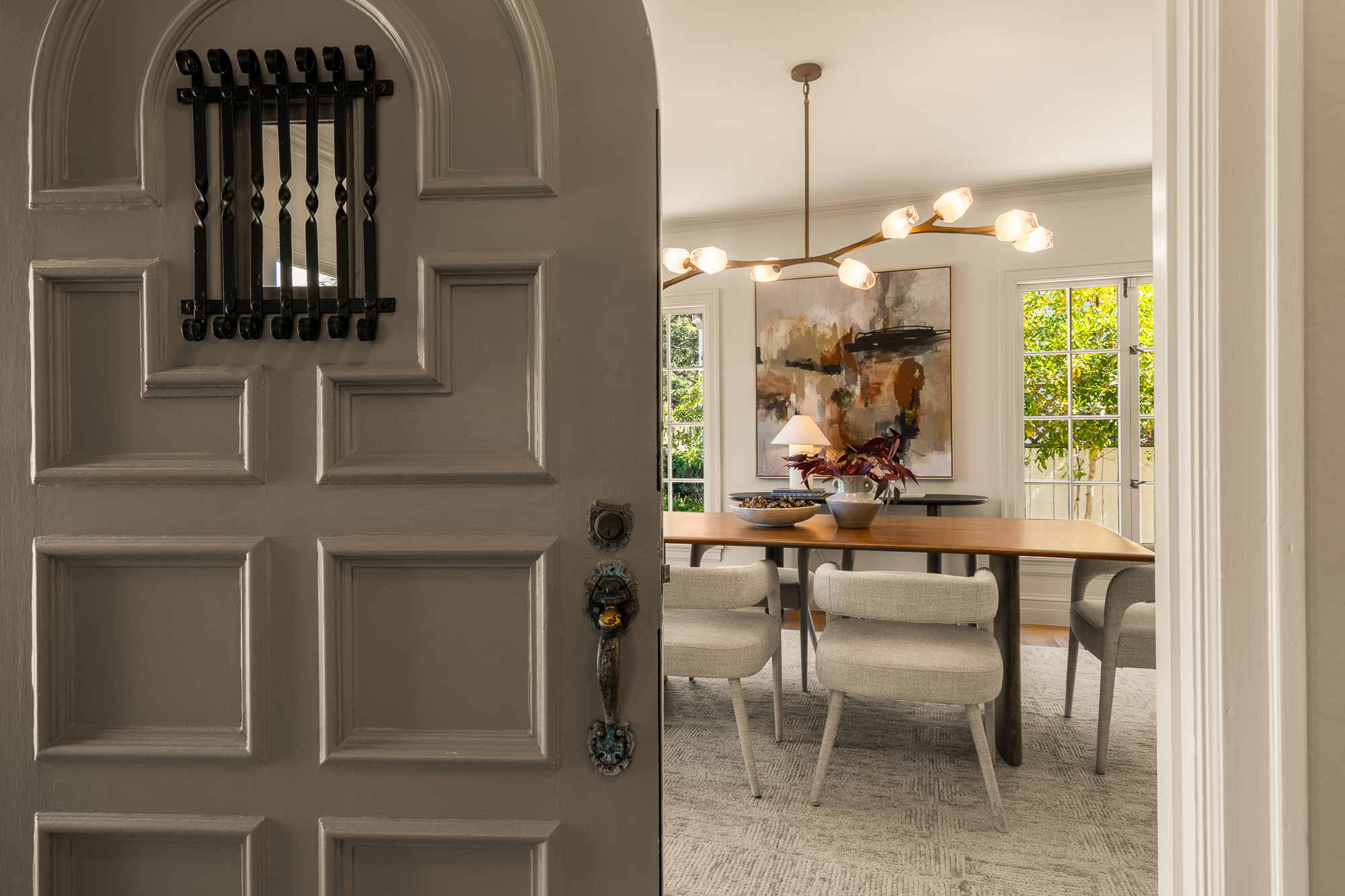 A formal dining room, graced with seven French windows, is bathed in natural lightโperfect for intimate dinners or lively gatherings. The adjacent eat-in kitchen features quartz countertops, custom backsplash tile, stainless steel appliances, and generous cabinetry with built-ins, ideal for the home chef.