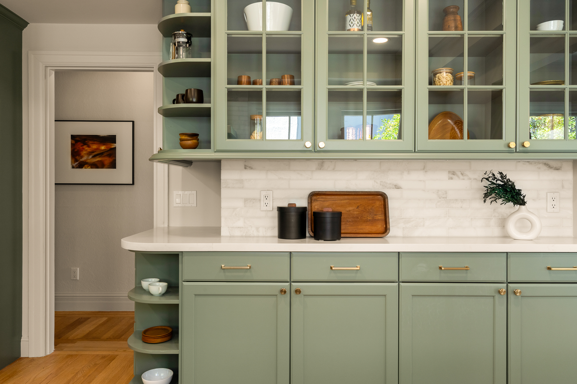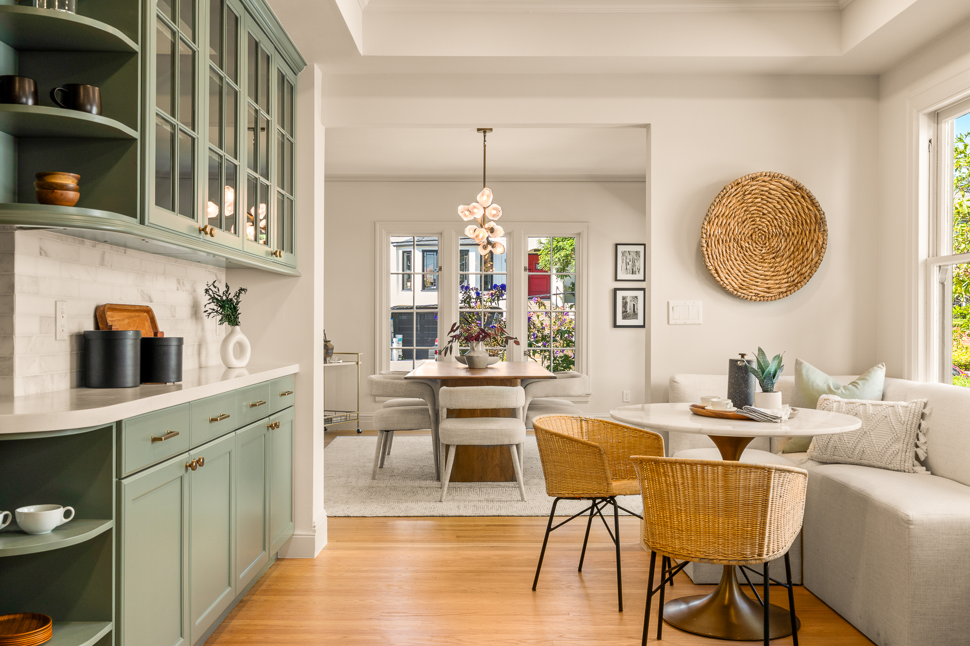 โ Quartz kitchen with stainless appliances, eat-in nook & custom built-ins