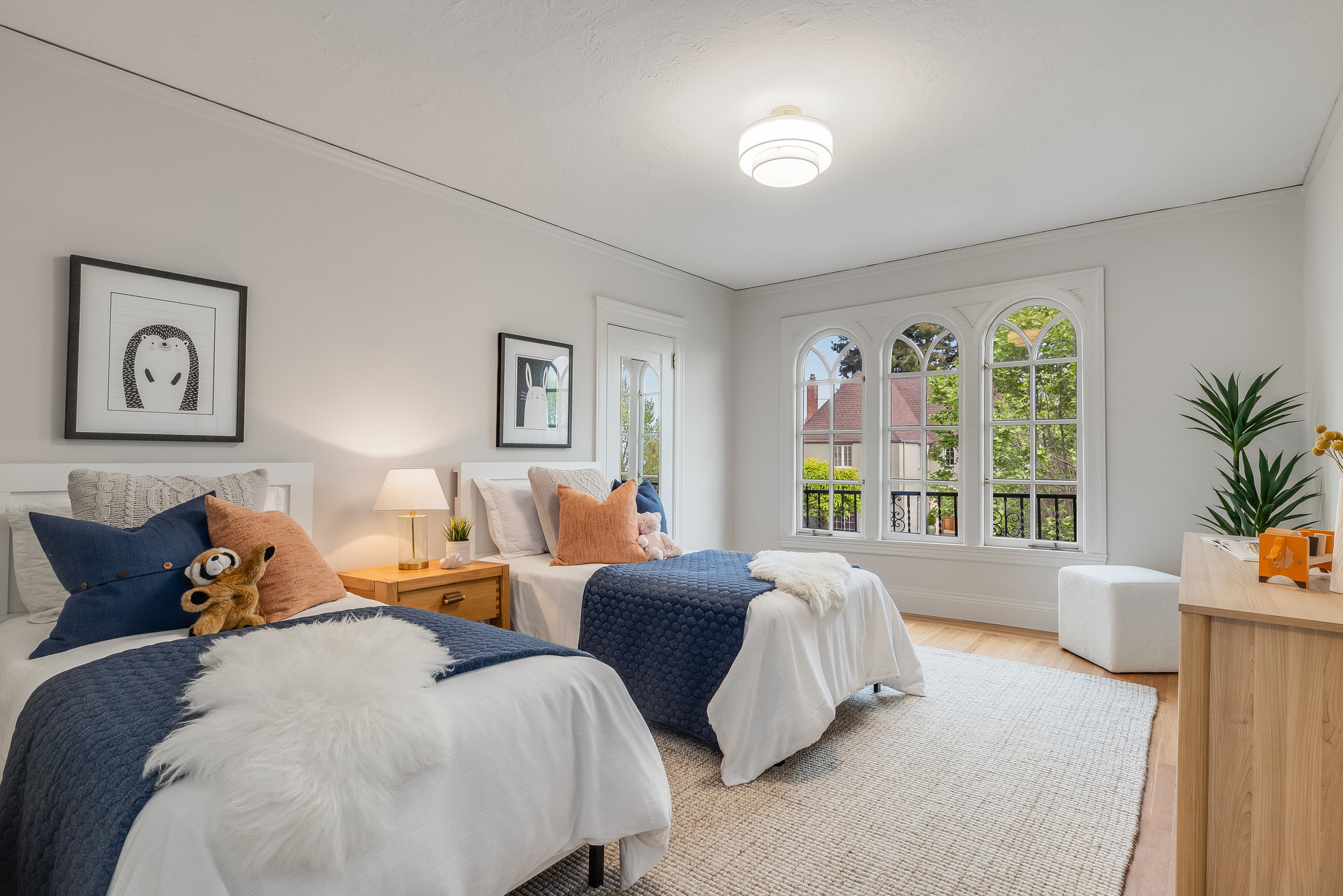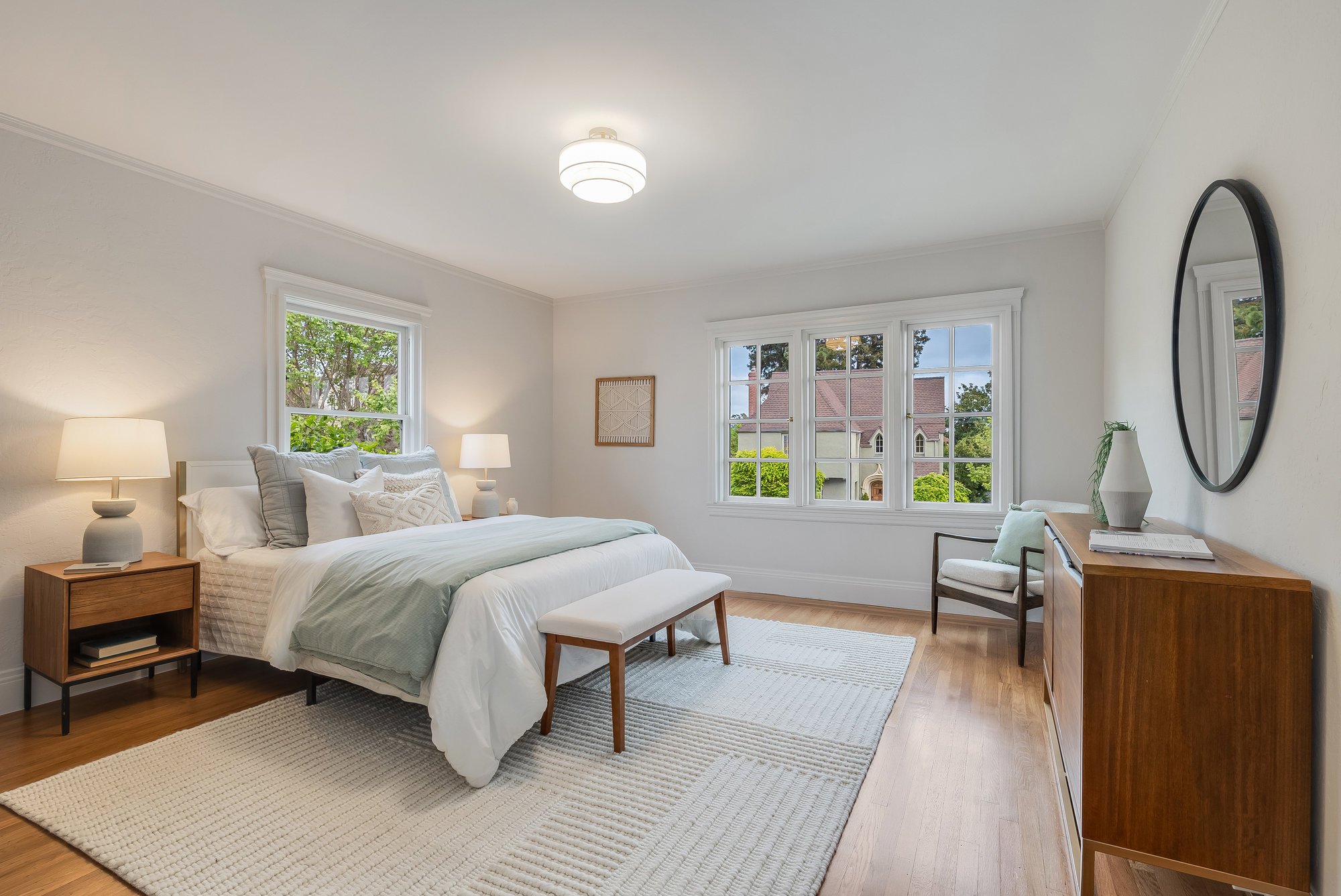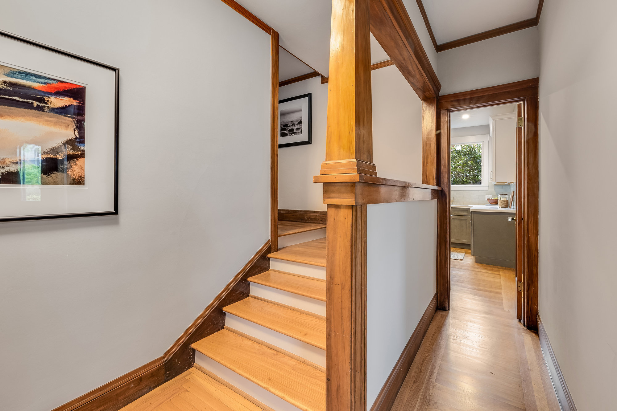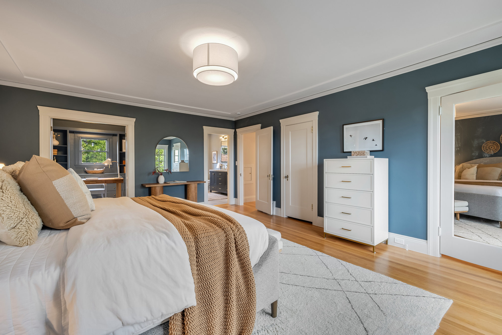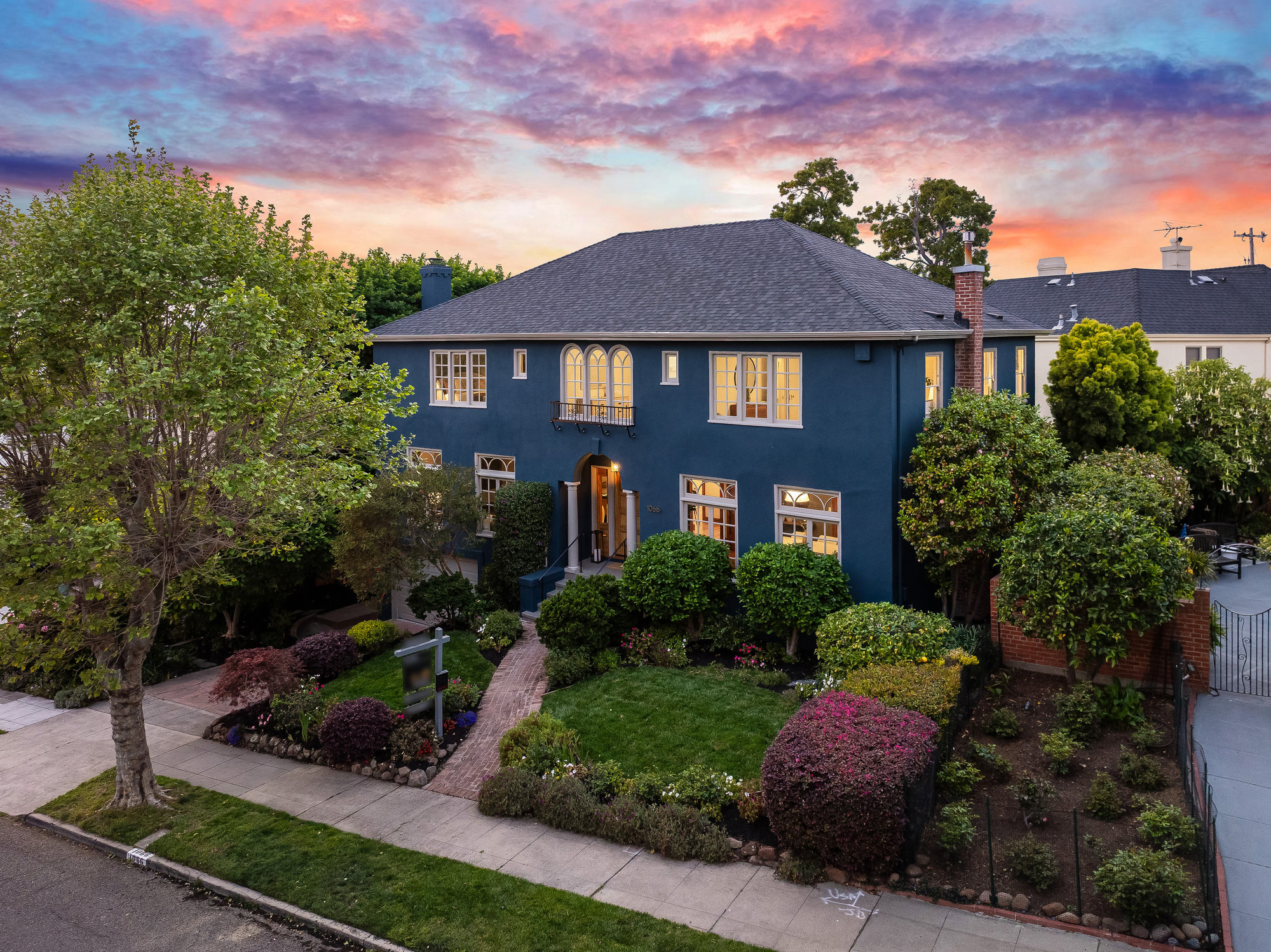 With stately curb appeal and architectural pedigree, this 1926 Georgian Revival captures attention from first glance. Eight-pane windows with artisan transoms grace the façade, softly illuminating the interiors with natural light. Inside, rich Gumwood paneling, moldings, and vintage details set a tone of timeless sophistication. A grand-scale living room is anchored by a classic fireplace and connects seamlessly to an adjacent den—ideal as a family room or home office. The formal dining room, framed by vintage built-ins and a designer chandelier, invites both everyday dining and festive gatherings. The large eat-in kitchen blends function and design, featuring quartz countertops, artisan subway tile, smart stainless appliances, and a 4-burner range with griddle. A rear deck off the kitchen is perfect for al fresco meals, while the adjacent yard offers ample space for outdoor play. A main-level bedroom and full bath provide flexible living, while upstairs, the primary suite includes a sitting room and spa-like bath with soaking tub, frameless glass shower, and dual vanity. Three additional bedrooms, a full bath, and dedicated laundry room complete the upper floor. On the lower level, a finished den with full bath serves as an ideal rumpus room, gym, or au pair space, with direct internal access to the garage. Located just minutes from award-winning Crocker Highlands Elementary, vibrant Lakeshore Avenue, the farmers market, Lake Merritt, and quick commuter routes to San Francisco.