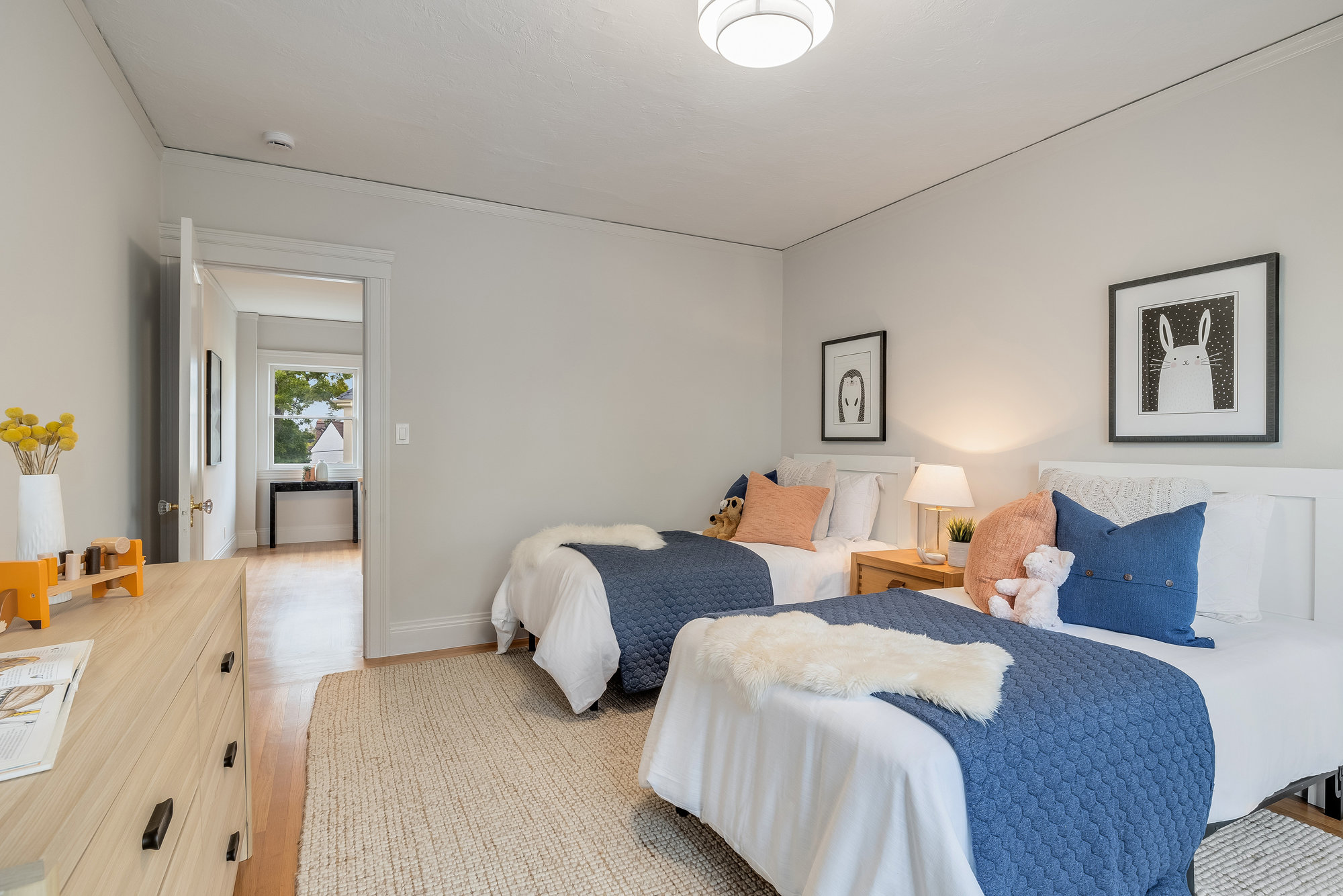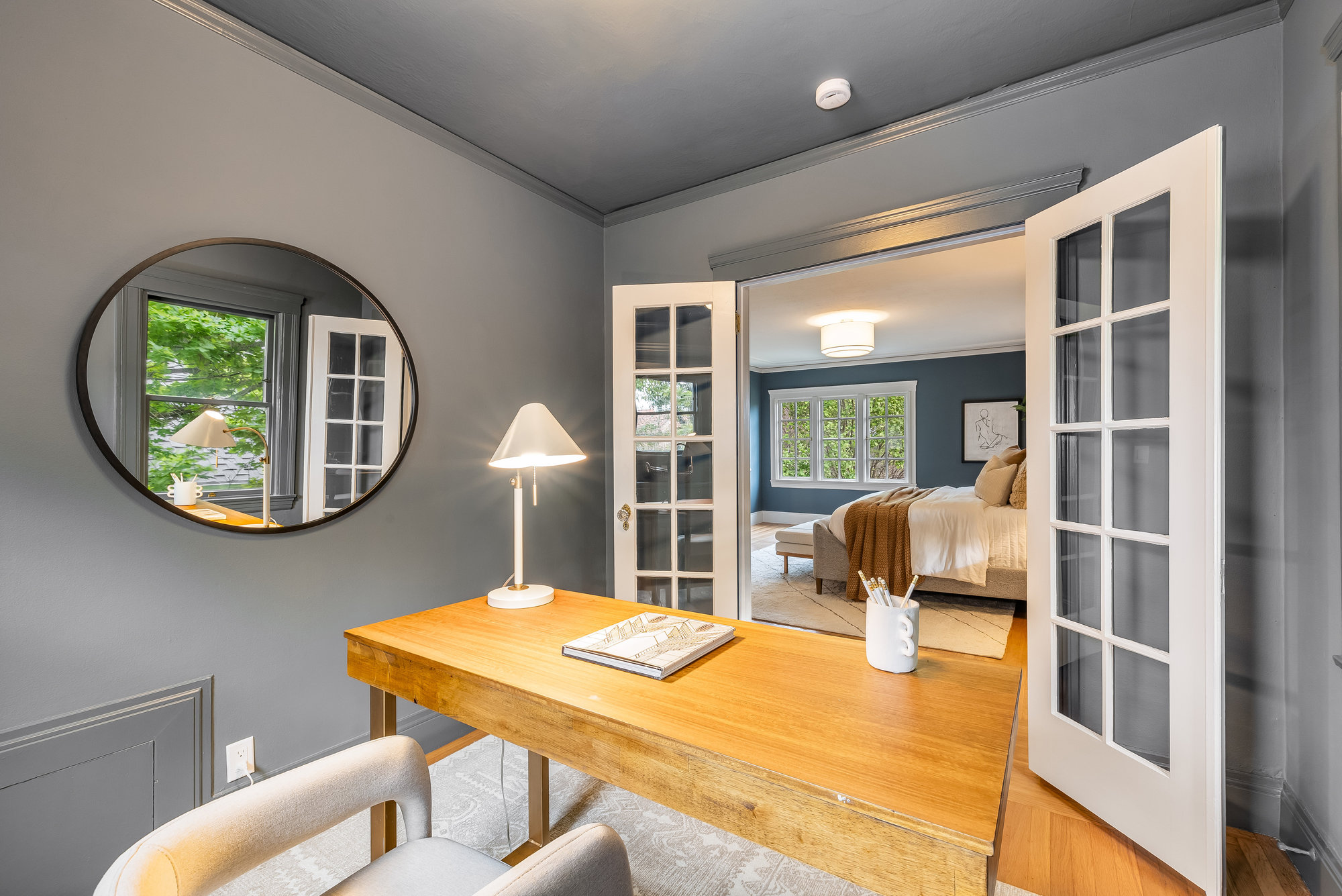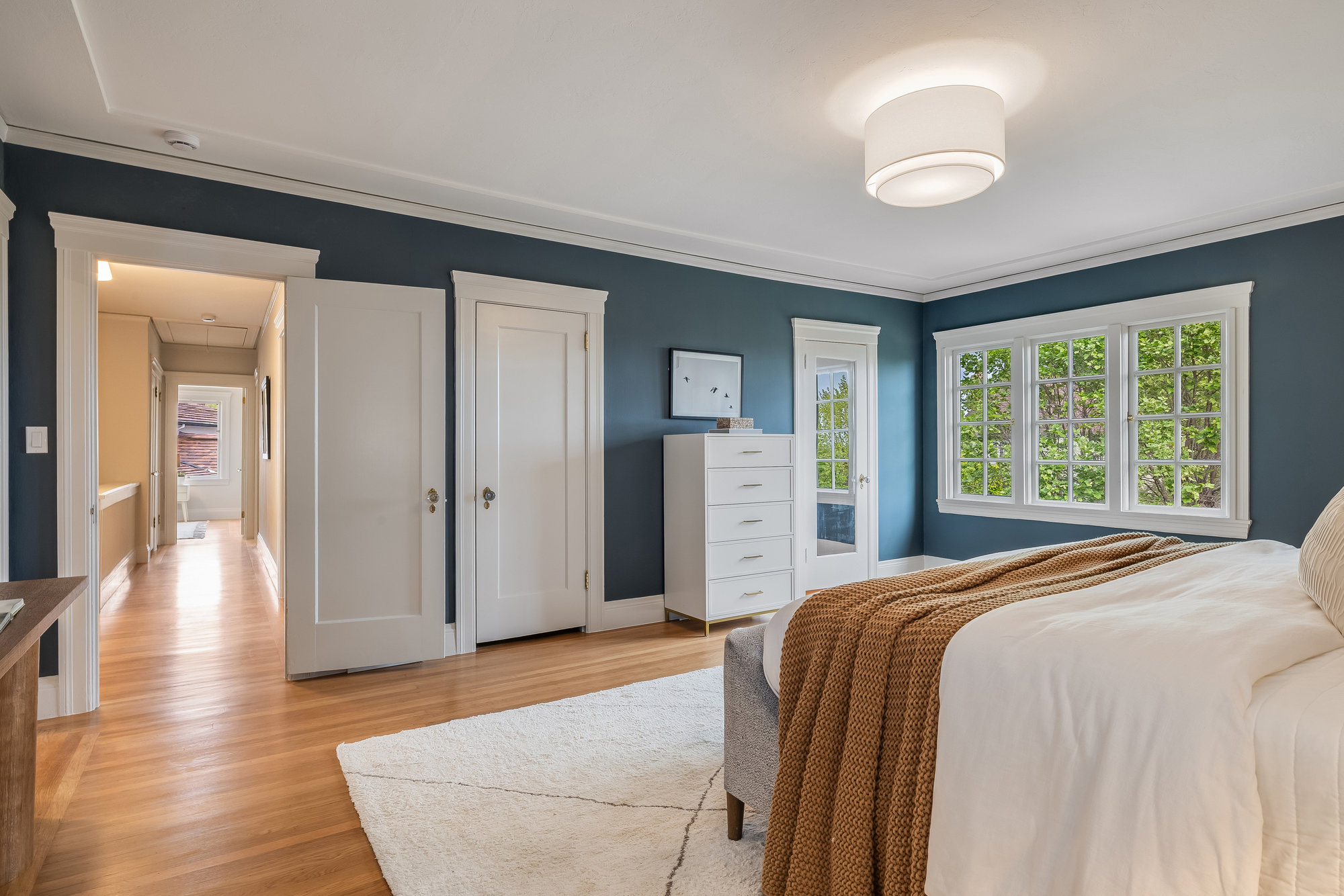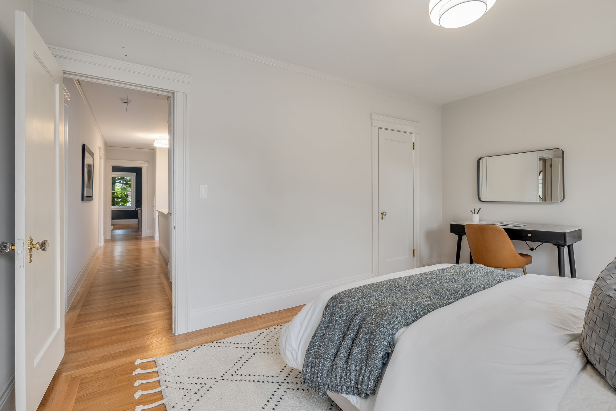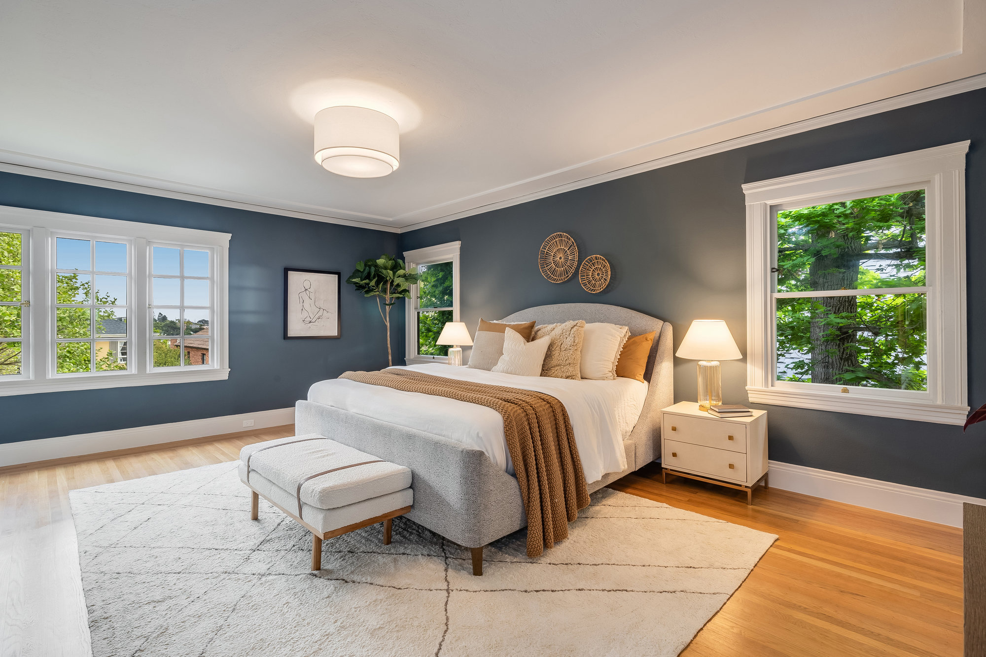 With stately curb appeal and architectural pedigree, this 1926 Georgian Revival captures attention from first glance. Eight-pane windows with artisan transoms grace the façade, softly illuminating the interiors with natural light. Inside, rich Gumwood paneling, moldings, and vintage details set a tone of timeless sophistication. A grand-scale living room is anchored by a classic fireplace and connects seamlessly to an adjacent den—ideal as a family room or home office. The formal dining room, framed by vintage built-ins and a designer chandelier, invites both everyday dining and festive gatherings. The large eat-in kitchen blends function and design, featuring quartz countertops, artisan subway tile, smart stainless appliances, and a 4-burner range with griddle. A rear deck off the kitchen is perfect for al fresco meals, while the adjacent yard offers ample space for outdoor play. A main-level bedroom and full bath provide flexible living, while upstairs, the primary suite includes a sitting room and spa-like bath with soaking tub, frameless glass shower, and dual vanity. Three additional bedrooms, a full bath, and dedicated laundry room complete the upper floor. On the lower level, a finished den with full bath serves as an ideal rumpus room, gym, or au pair space, with direct internal access to the garage. Located just minutes from award-winning Crocker Highlands Elementary, vibrant Lakeshore Avenue, the farmers market, Lake Merritt, and quick commuter routes to San Francisco.