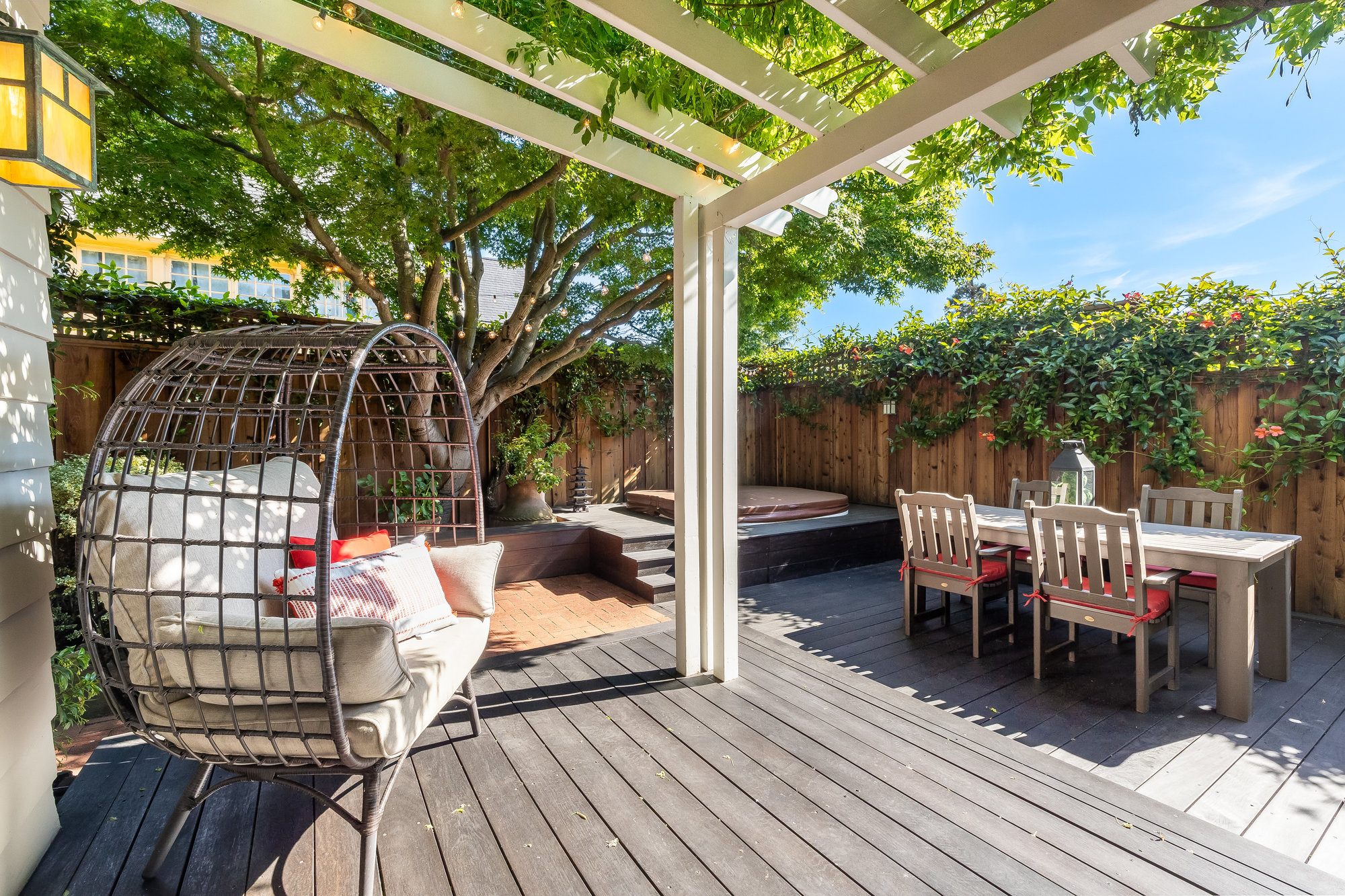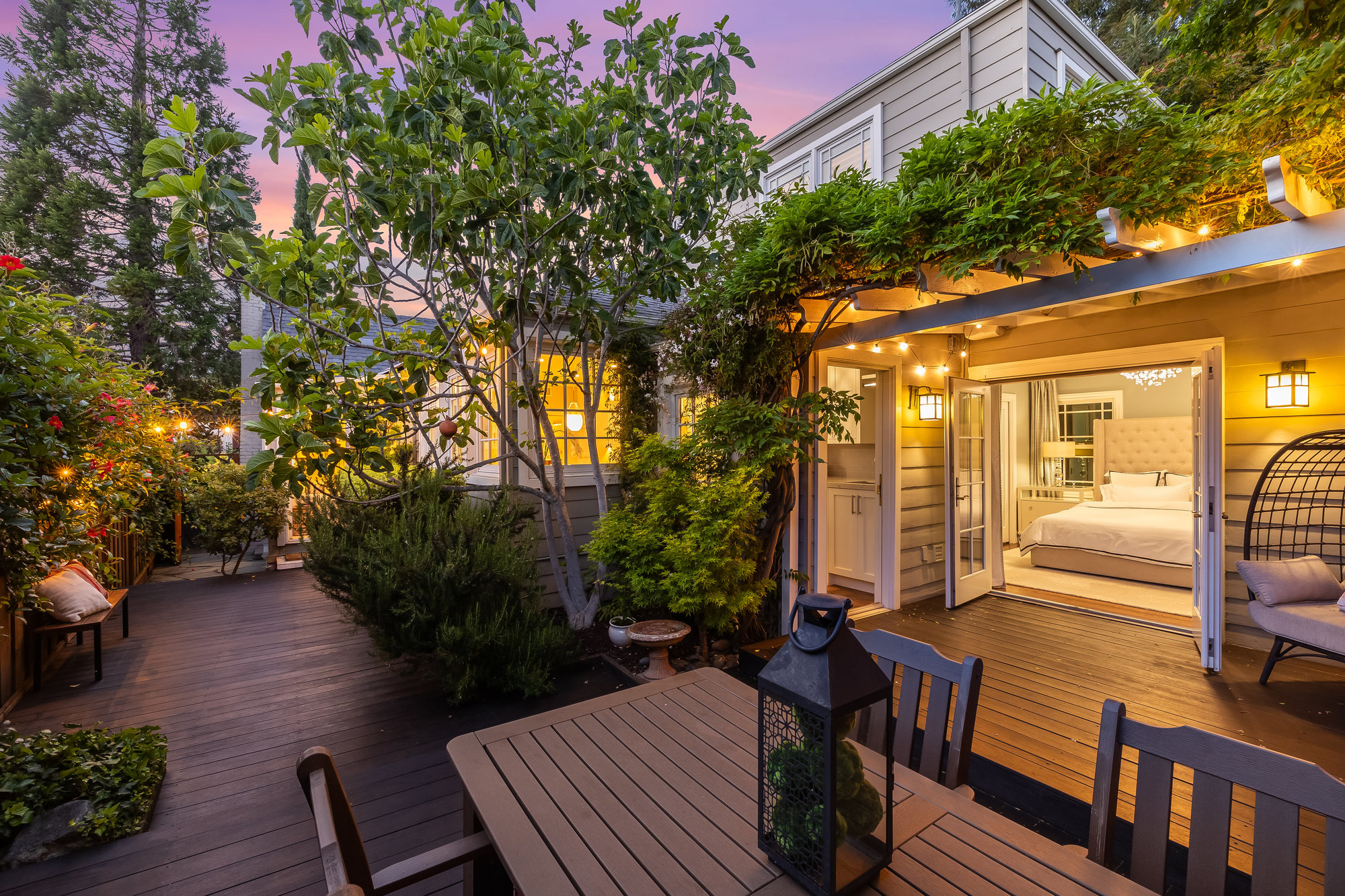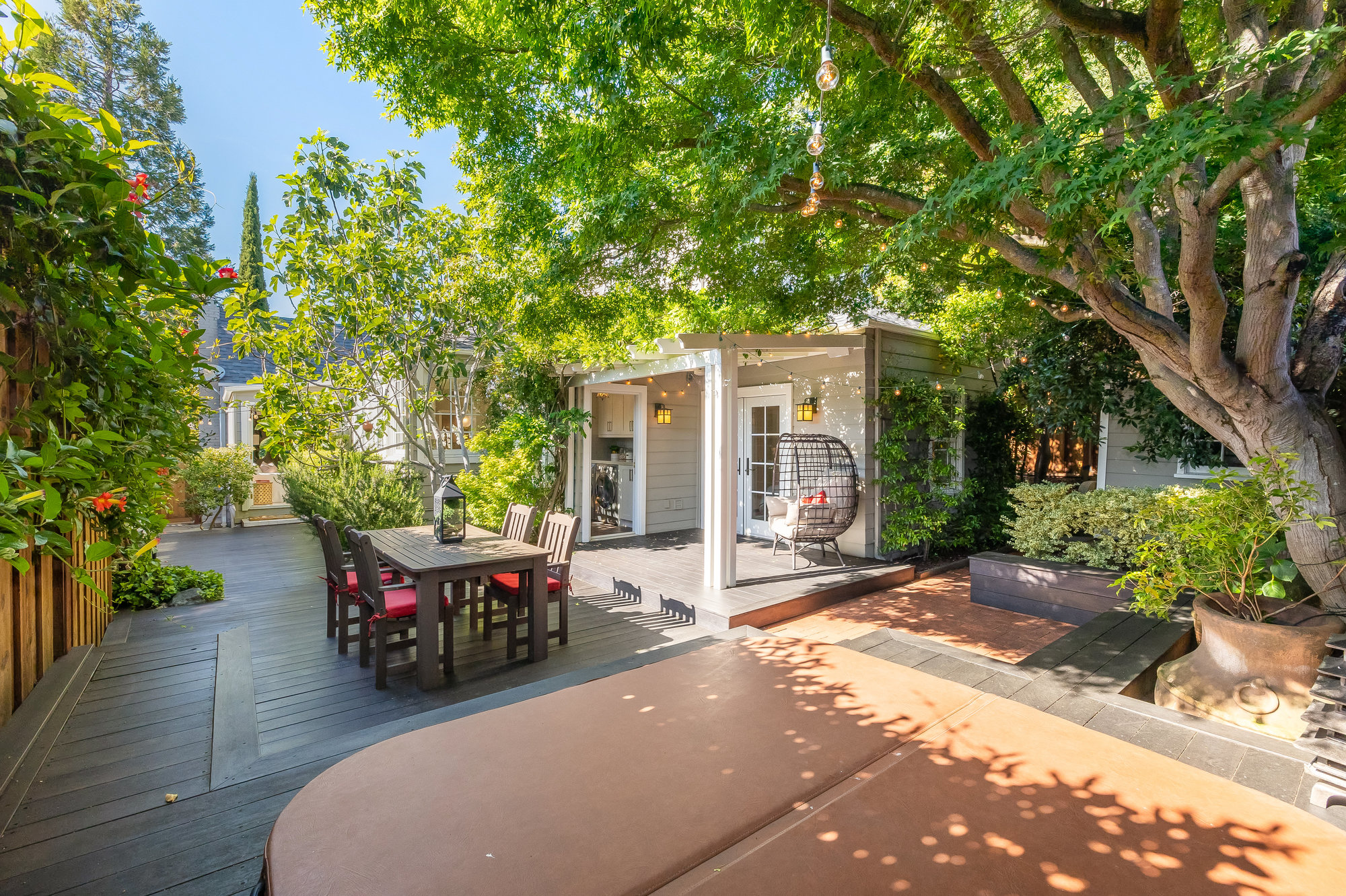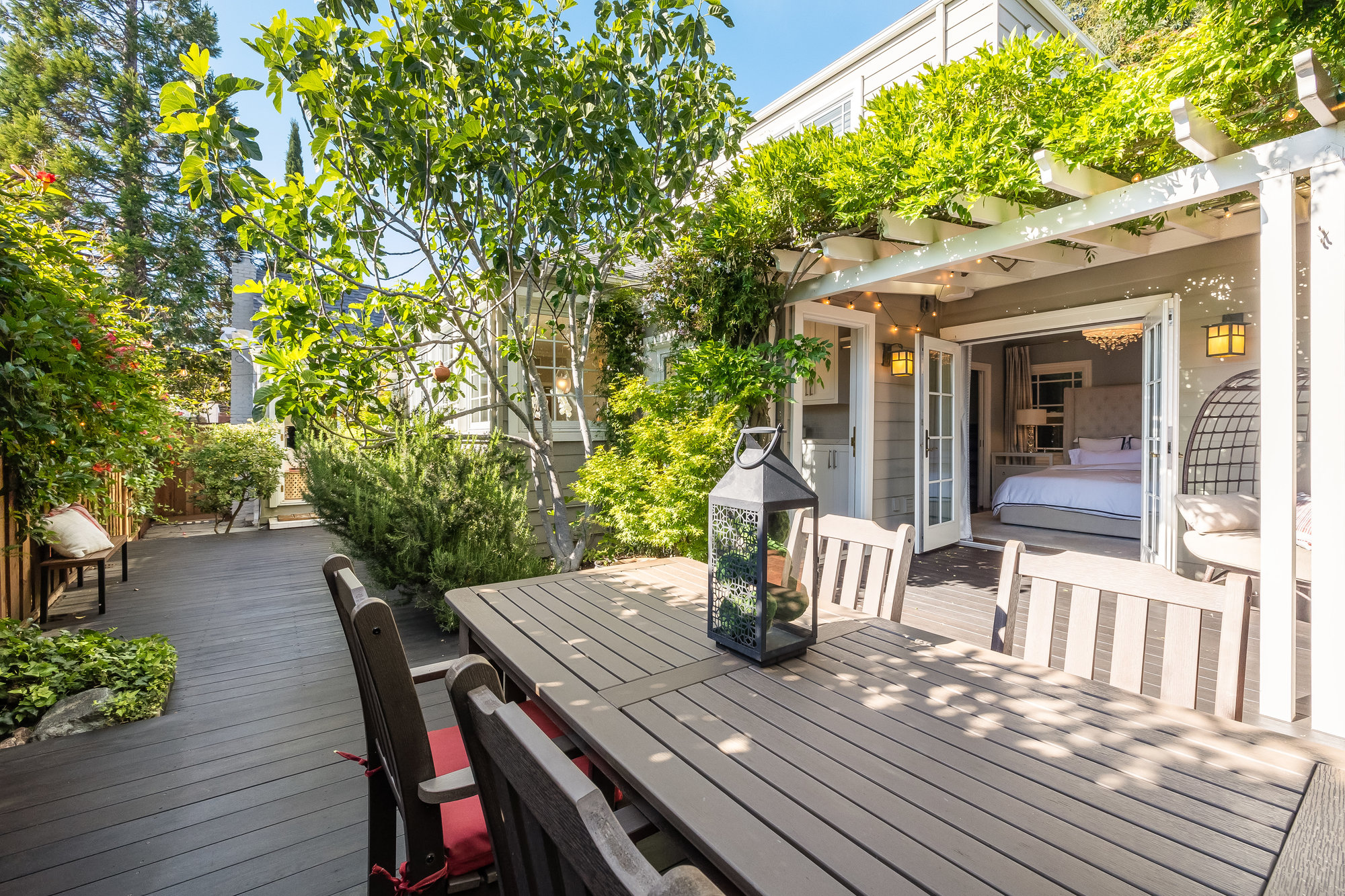 Turn-key home from top to bottom with luxury finishes, newly remodeled, eat-in kitchen with Cambria quartz counters, custom tile backsplash, Blue Star 6-burner gas oven and range, Zephyr range hood, Bosch dishwasher, Fisher and Paykel Fridge, stainless appliances, designer lighting, even a dedicated outlet for espresso machine. Primary suite with doors leading onto a private deck, fully renovated bathroom with frameless glass shower radiant heat floors, and luxe finishes. Sun soaked formal living and dining rooms offering tranquil privacy leading to a connected sun room offering doors onto the private gardens with hot tub wrapped by custom deck.