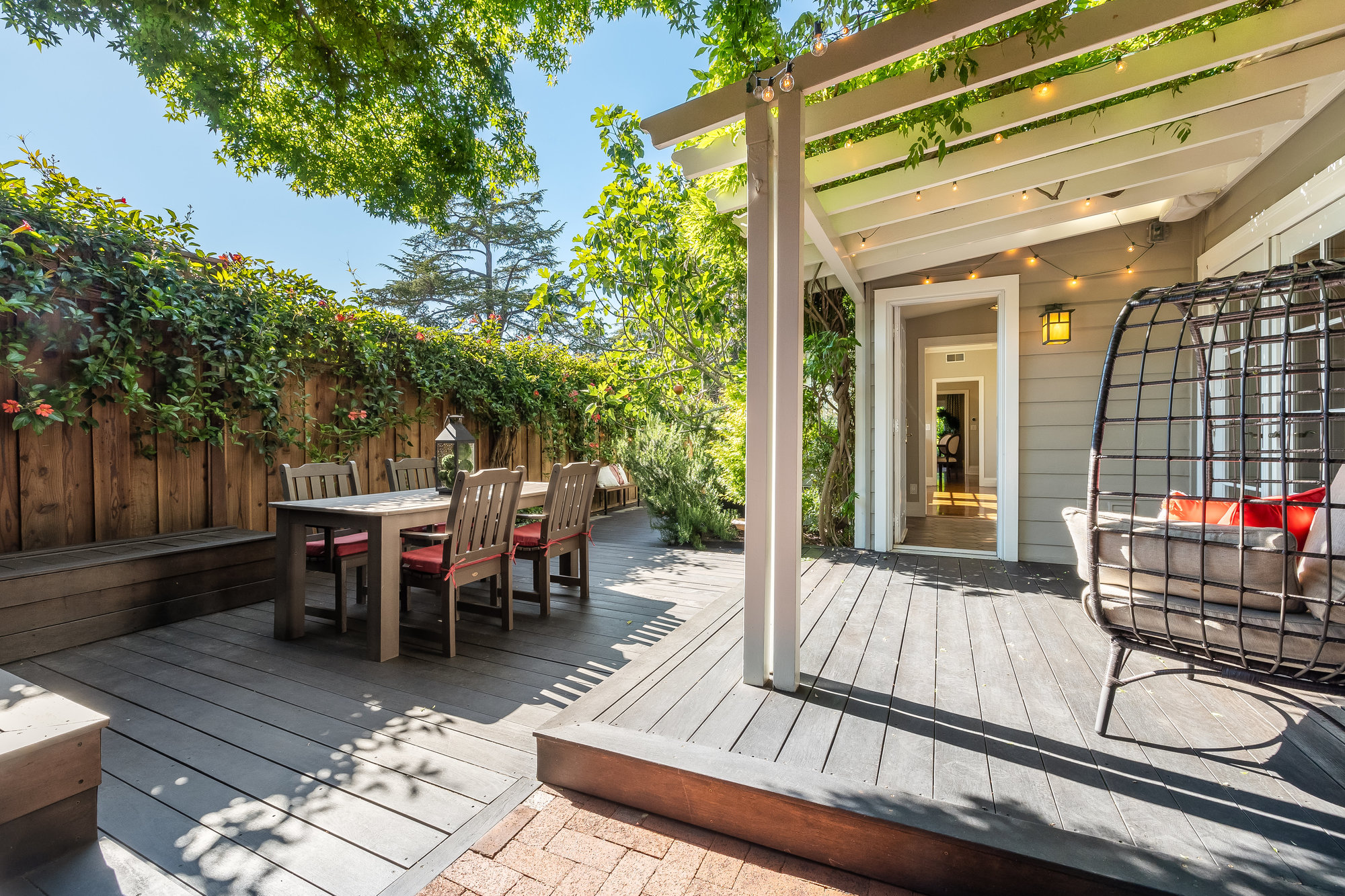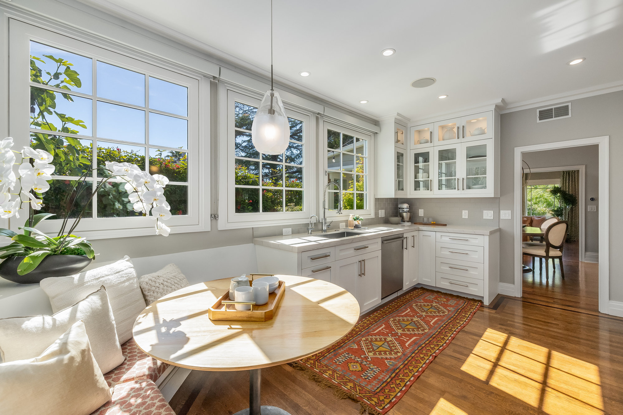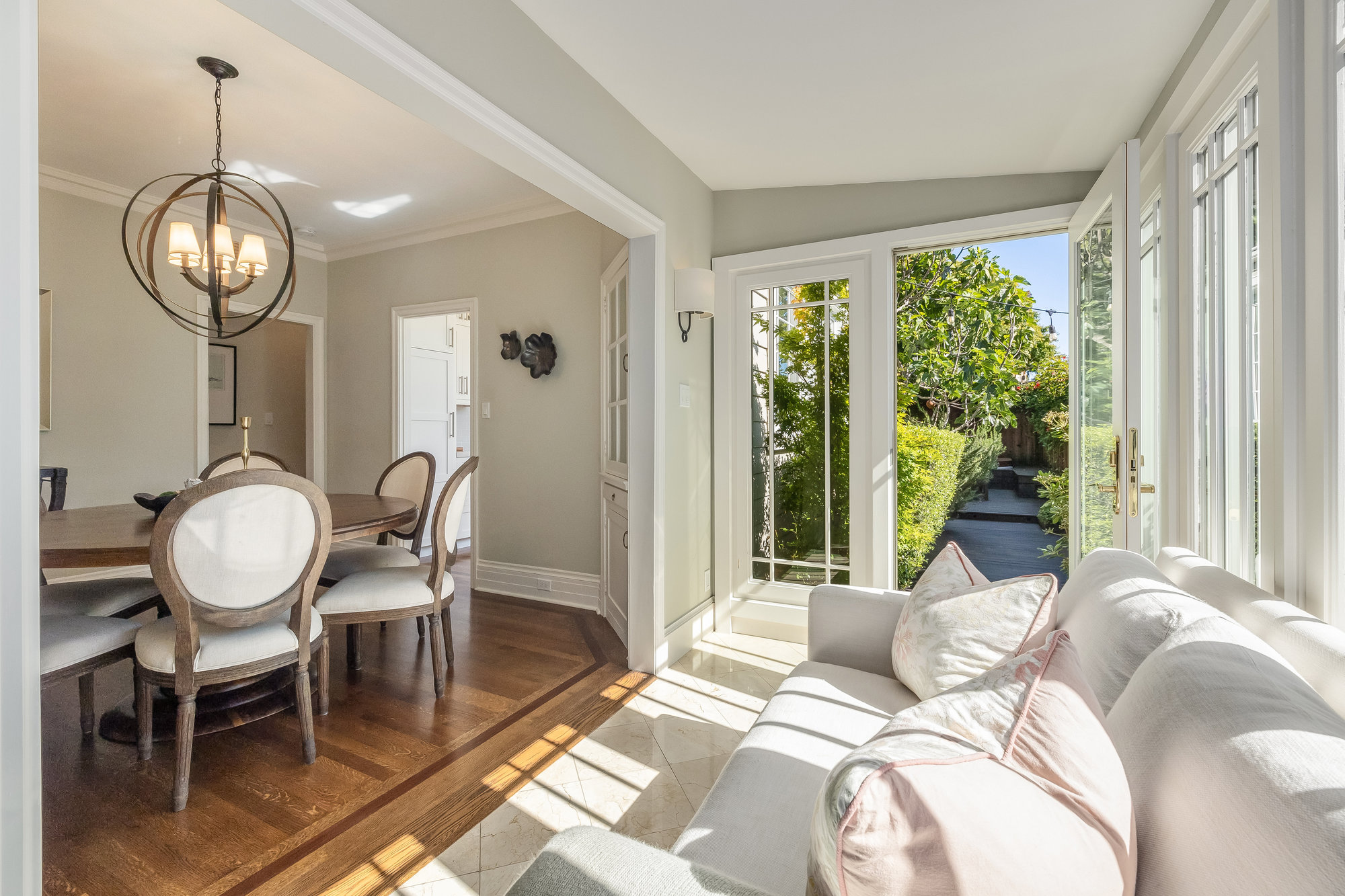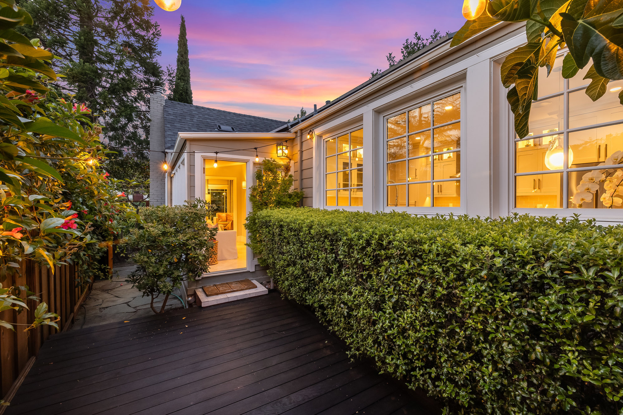 Turn-key home from top to bottom with luxury finishes, newly remodeled, eat-in kitchen with Cambria quartz counters, custom tile backsplash, Blue Star 6-burner gas oven and range, Zephyr range hood, Bosch dishwasher, Fisher and Paykel Fridge, stainless appliances, designer lighting, even a dedicated outlet for espresso machine. Primary suite with doors leading onto a private deck, fully renovated bathroom with frameless glass shower radiant heat floors, and luxe finishes. Sun soaked formal living and dining rooms offering tranquil privacy leading to a connected sun room offering doors onto the private gardens with hot tub wrapped by custom deck.