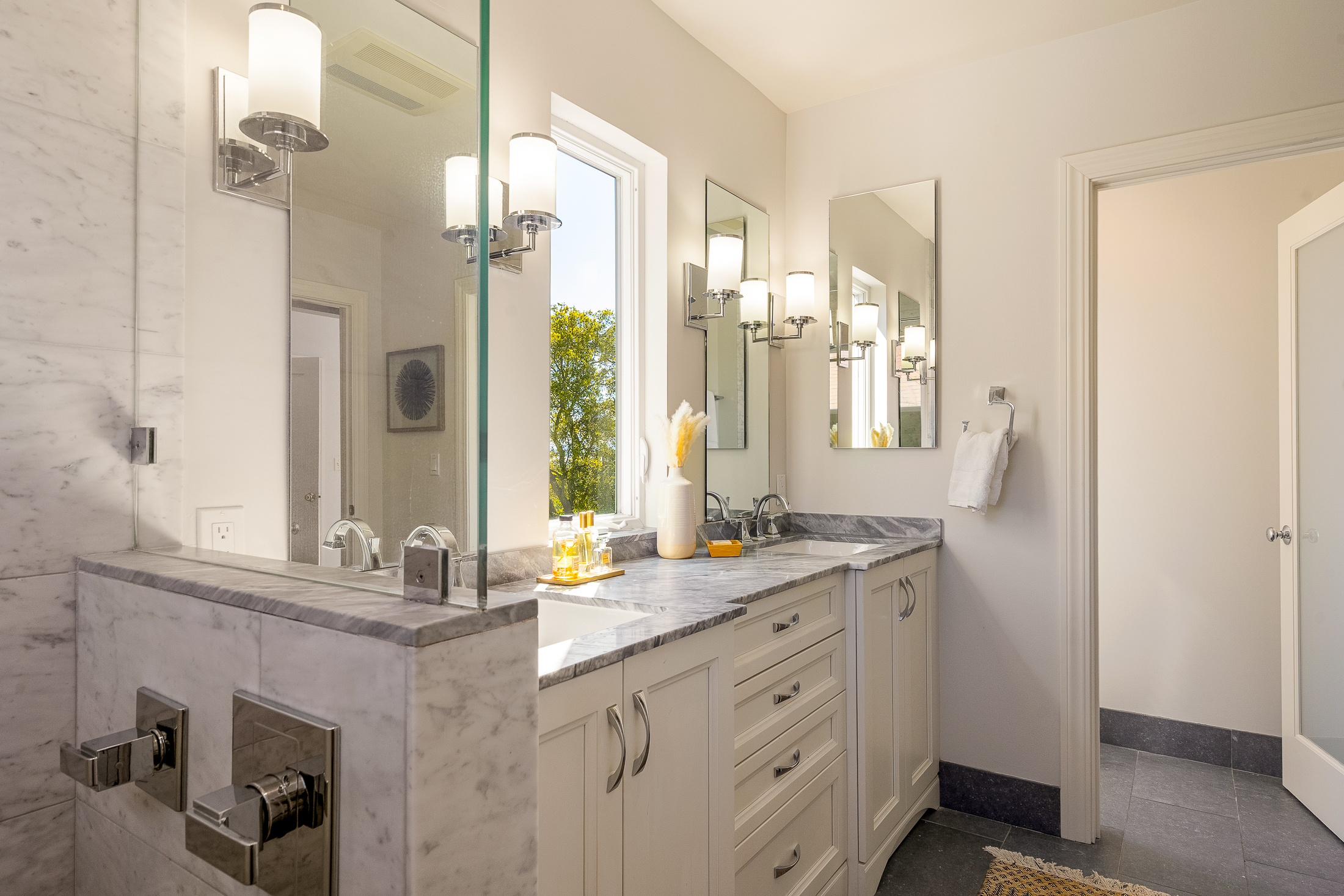 The primary suite has been fully renovated and offers vaulted ceilings, treetop views, and a large walk-in closet. The en suite bath features dual vanities with marble tops, an oversized marble tile walk-in shower, and a private water closet.