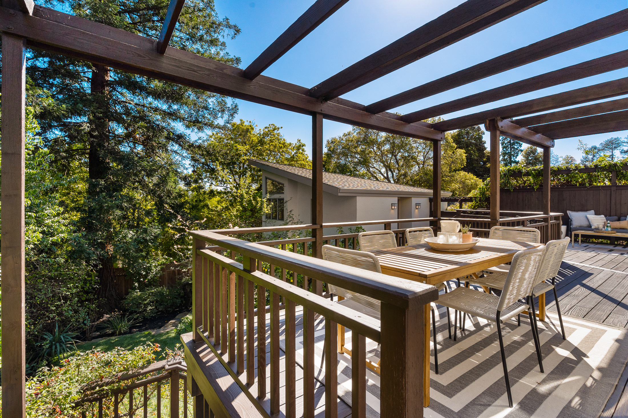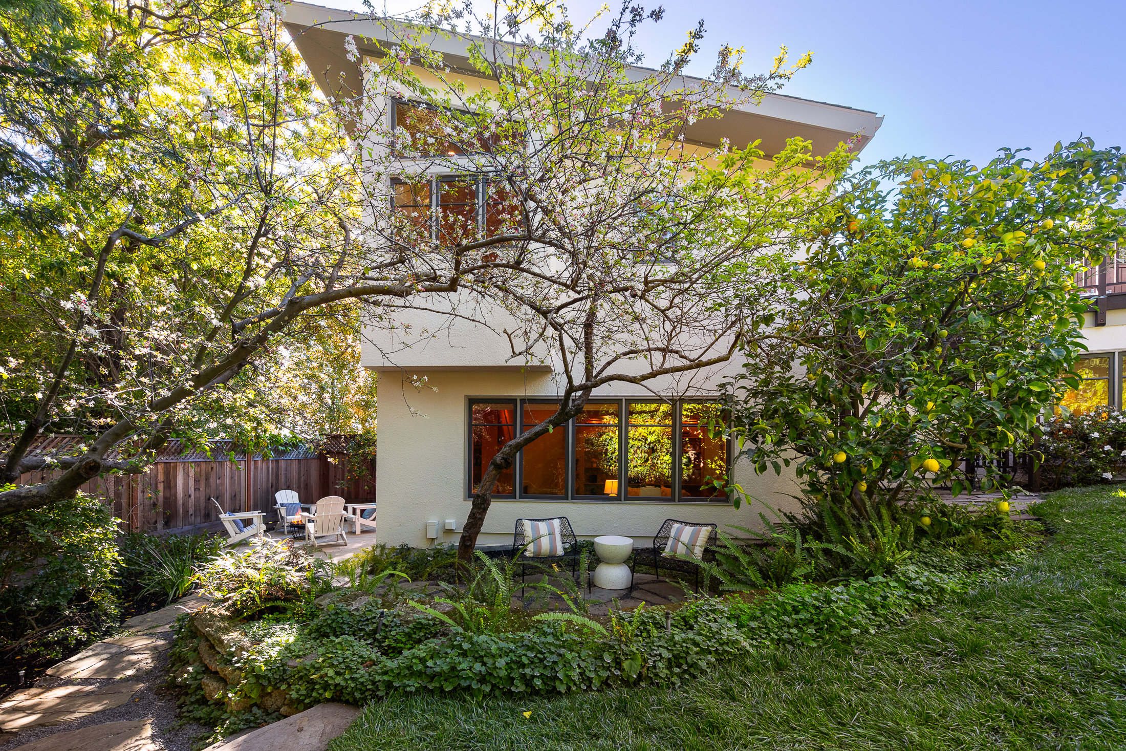 The rear grounds offer fresh grass, a majestic redwood, a cherry blossom tree, and producing lemon and plum trees, all within a setting of exceptional privacy.