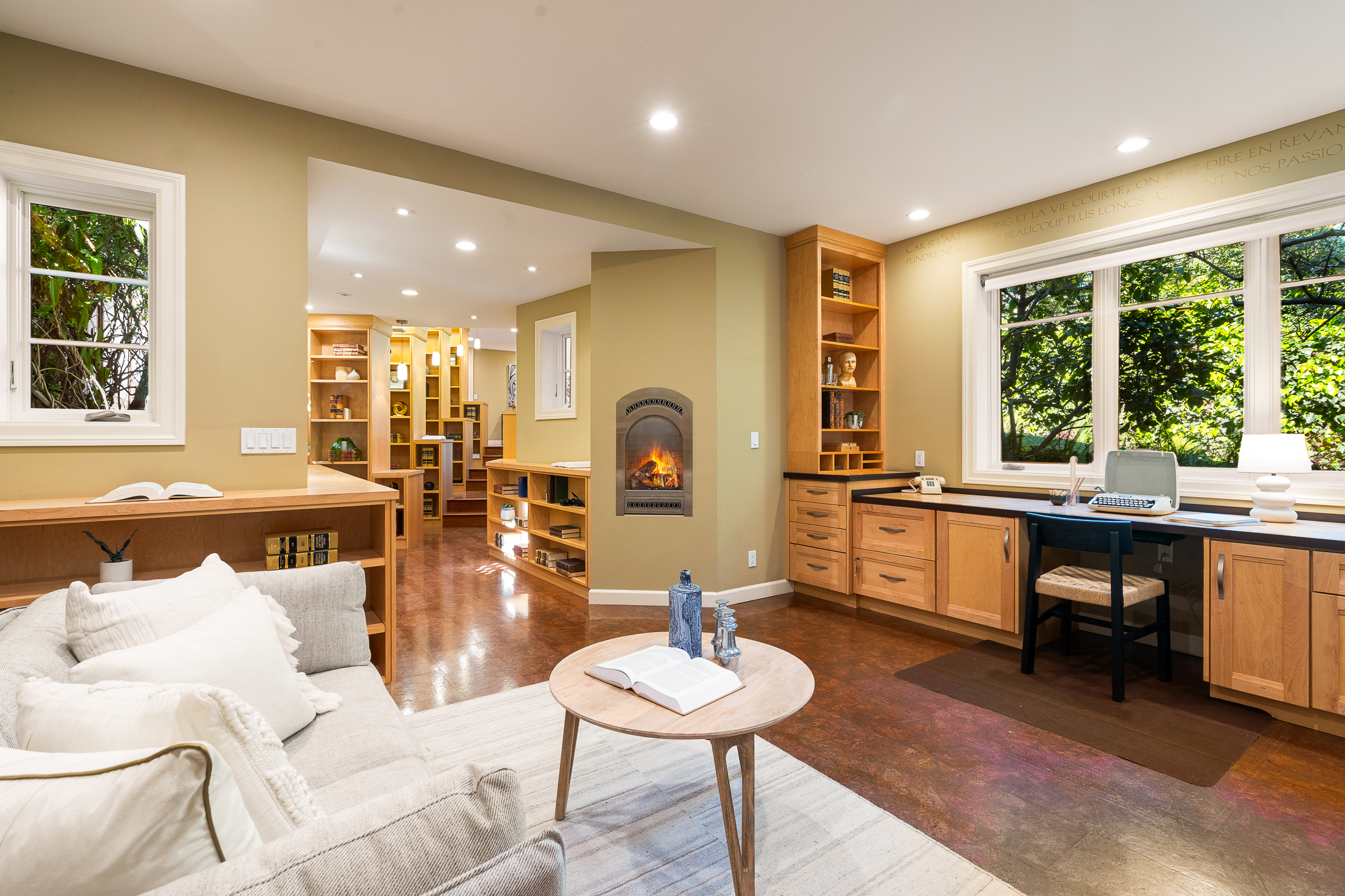 The home office is a standout: bird's-eye maple desk countertops, cork floors, an extensive library system, and glass walls looking out to the private gardens. A dedicated laundry room and wine cave are also on this level. At the far end of the office, a staircase climbs to a windowed hallway leading to a private bedroom with its own door to the main level deck, served by an adjacent bathroom with marble finishes.