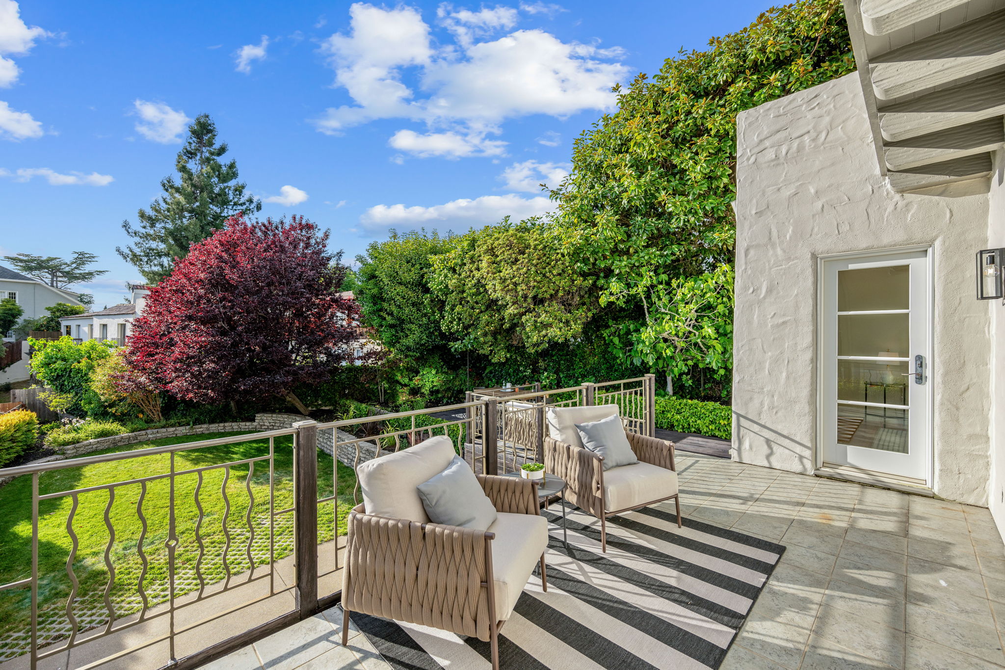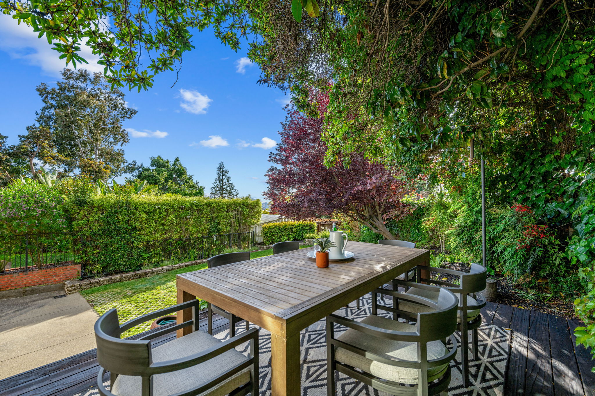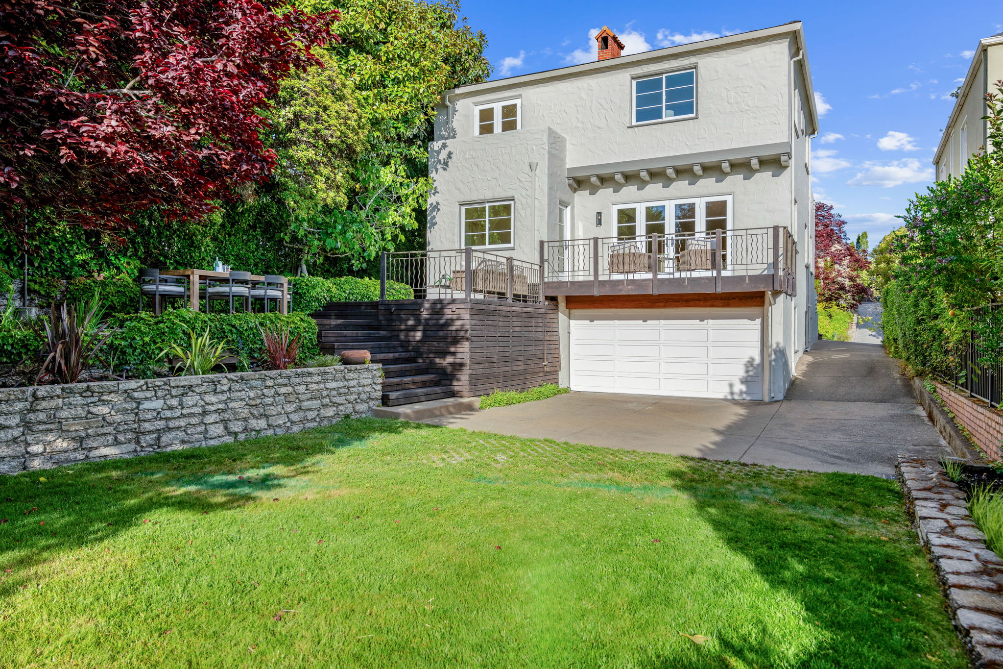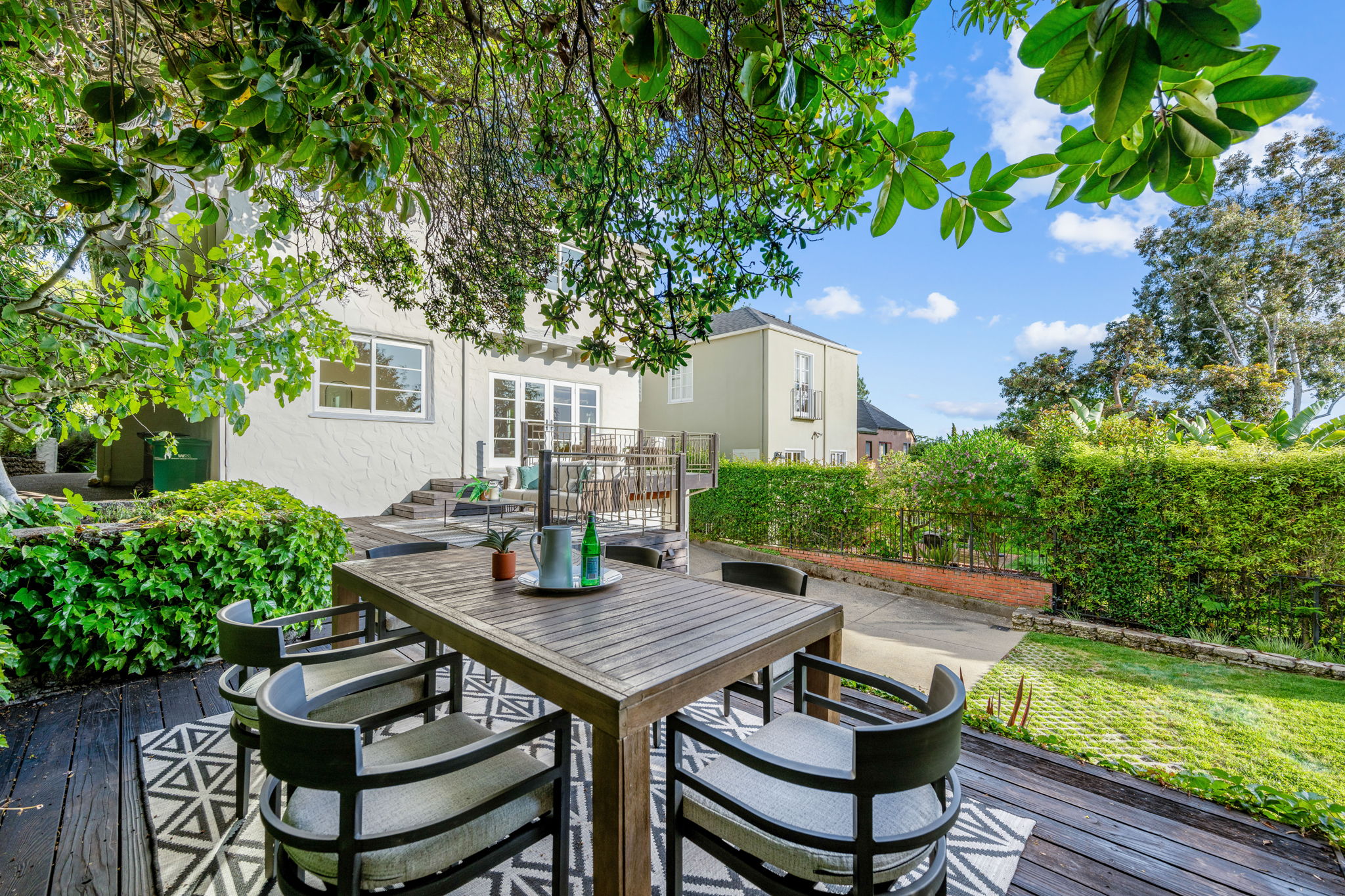 Welcome to 1144 Mandana Blvd. Captivating Crocker Highlands Traditional with level-out park-like private gardens. Upon entering one is greeted by a stunning curved staircase and cathedral ceiling foyer. Light-filled dining room ideal for formal gatherings with three floor-to-ceiling arched windows frame the exterior gardens and maple trees. Cheerful eat-in kitchen blanketed with terracotta pavers, two-tone cabinets, gas range, and dining area. Magnificent living room with french doors onto large private terrace that overlooks rear gardens featuring expansive level yard, terraced dining area and lush verdant flora offering tranquil privacy. An additional sun-soaked den off the rear of the home is ideal as office, lounge or guest space with its own door onto the rear balcony. A full bathroom and laundry area complete the main level.