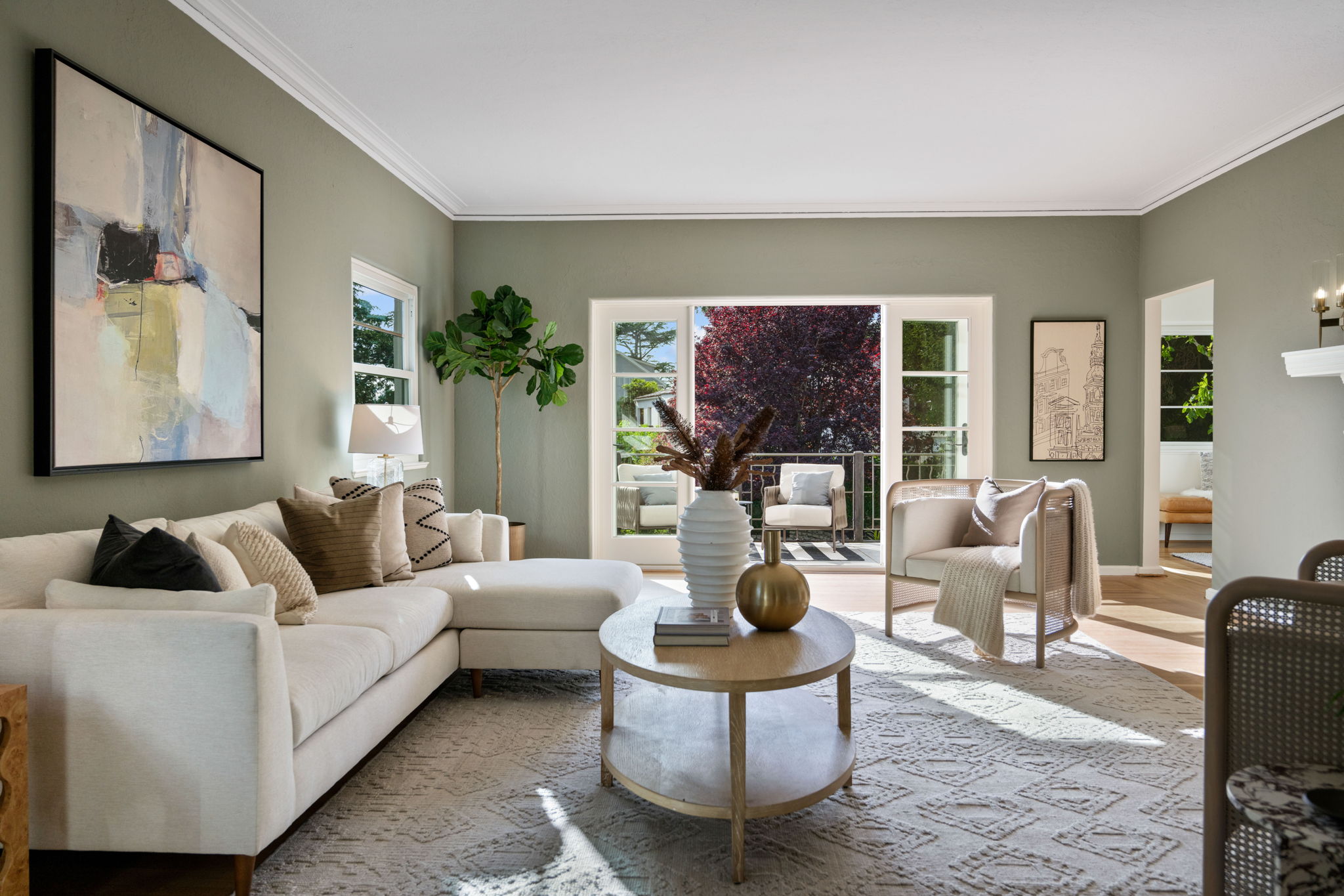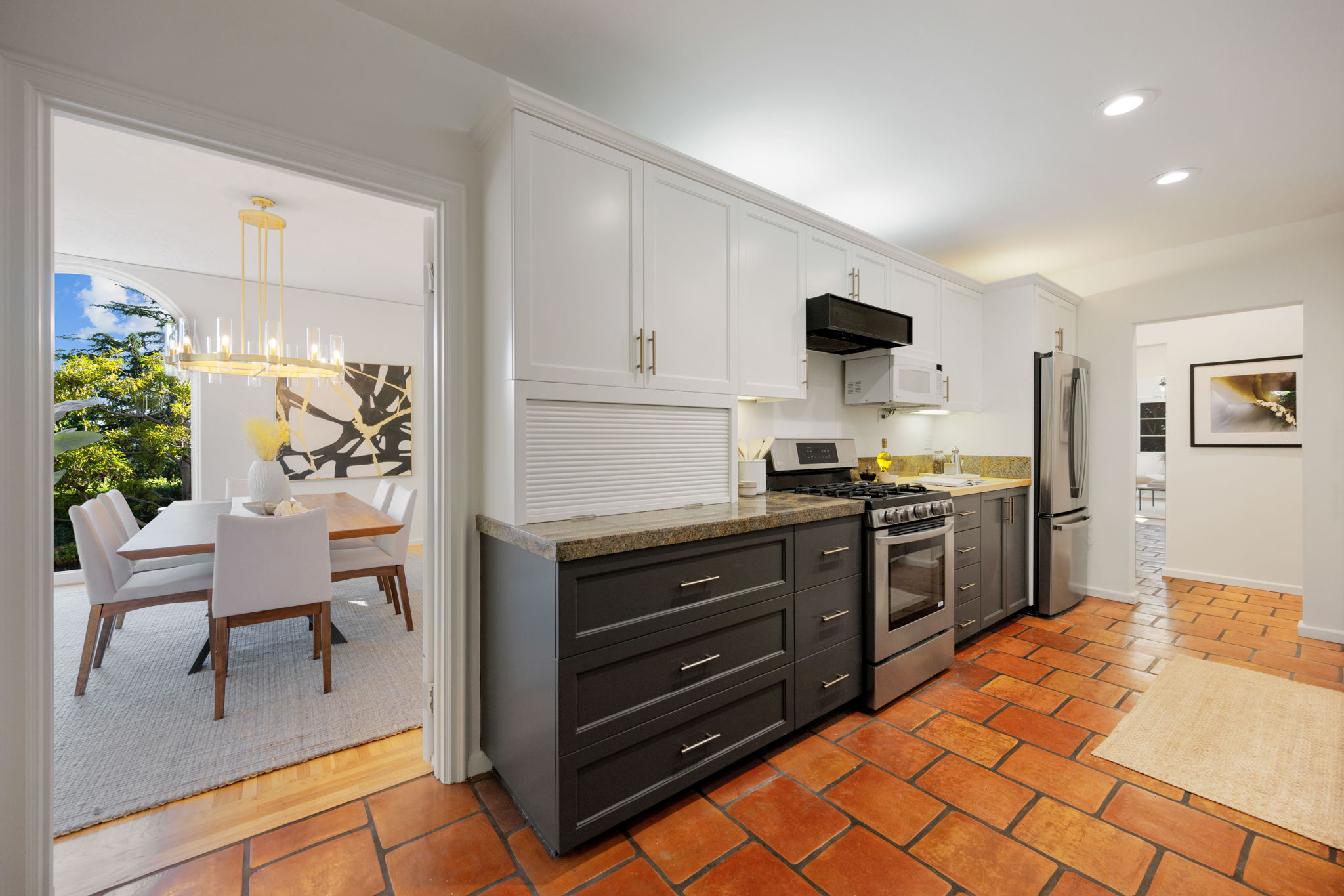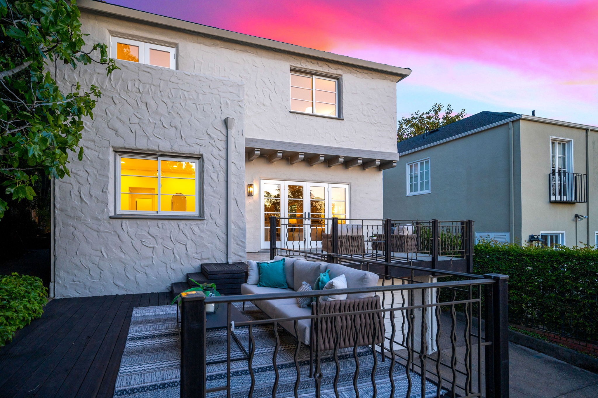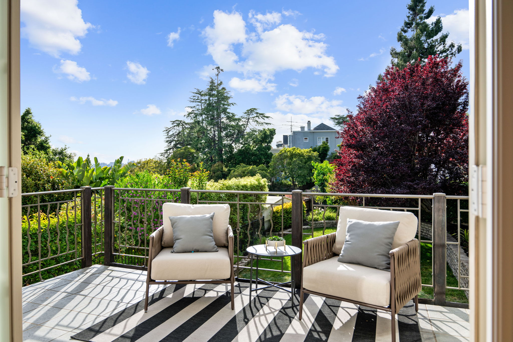 Welcome to 1144 Mandana Blvd. Captivating Crocker Highlands Traditional with level-out park-like private gardens. Upon entering one is greeted by a stunning curved staircase and cathedral ceiling foyer. Light-filled dining room ideal for formal gatherings with three floor-to-ceiling arched windows frame the exterior gardens and maple trees. Cheerful eat-in kitchen blanketed with terracotta pavers, two-tone cabinets, gas range, and dining area. Magnificent living room with french doors onto large private terrace that overlooks rear gardens featuring expansive level yard, terraced dining area and lush verdant flora offering tranquil privacy. An additional sun-soaked den off the rear of the home is ideal as office, lounge or guest space with its own door onto the rear balcony. A full bathroom and laundry area complete the main level.