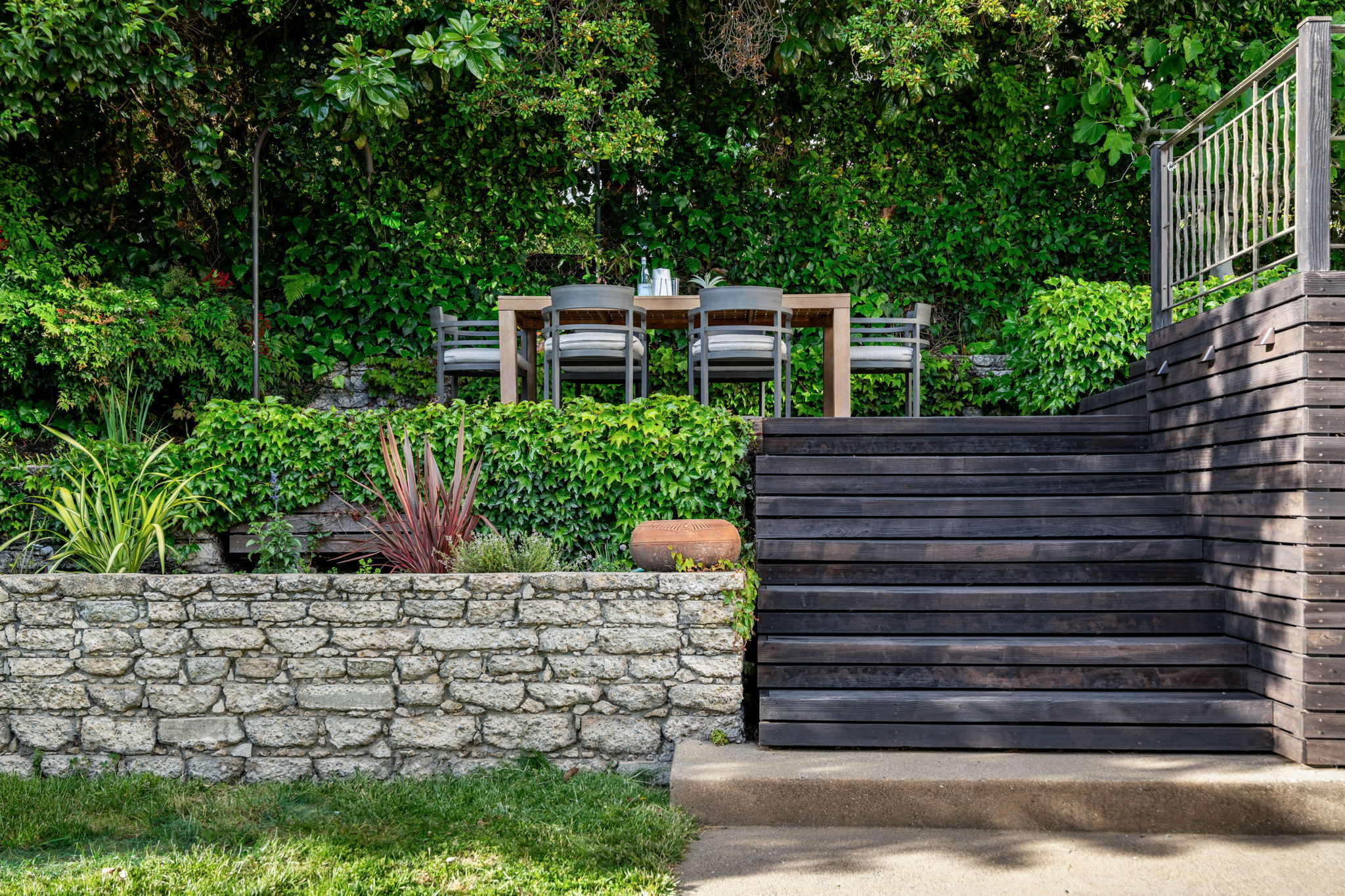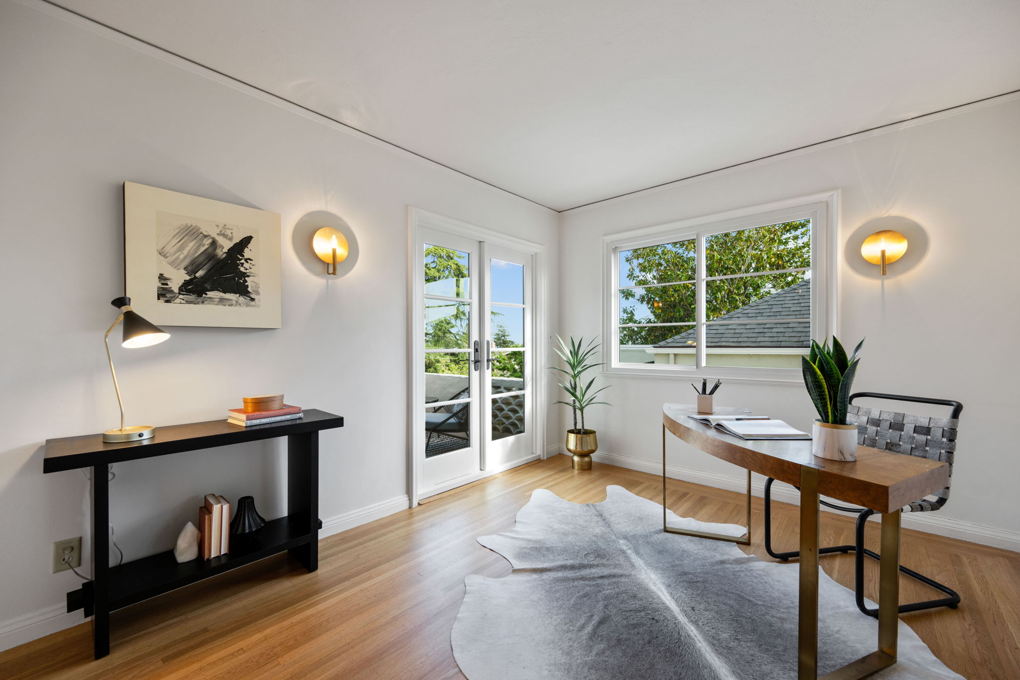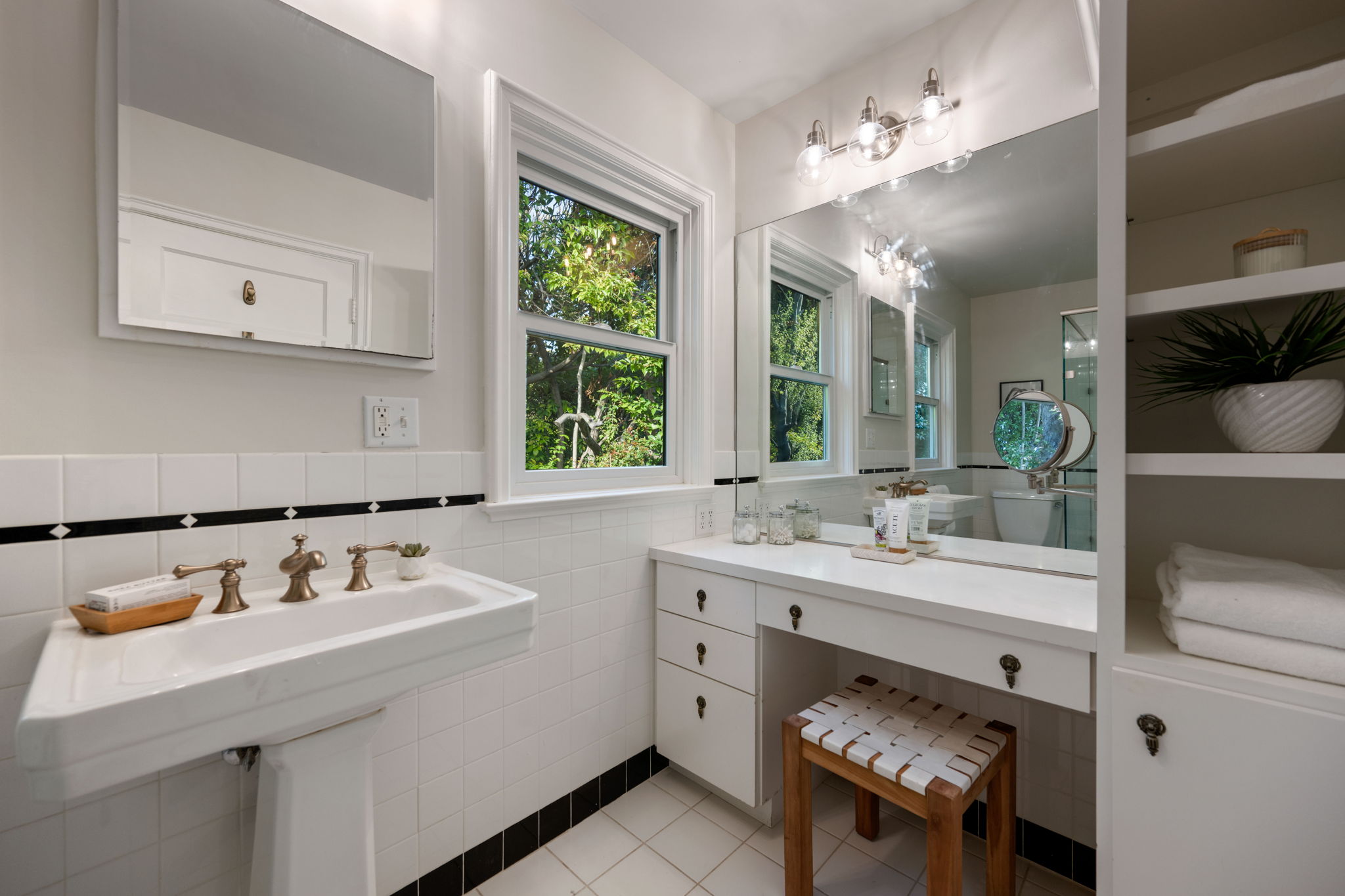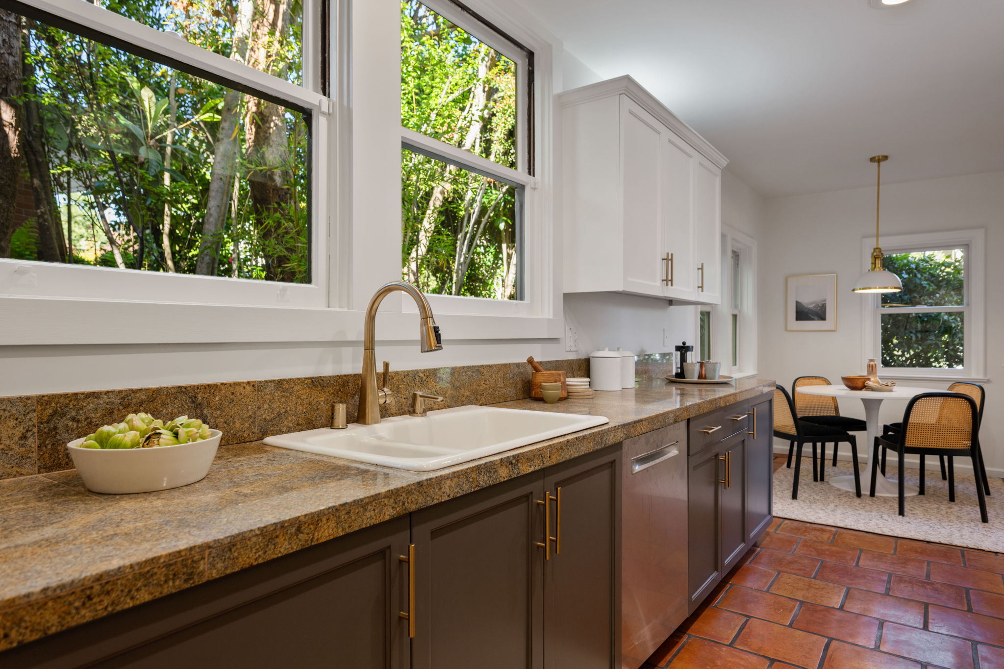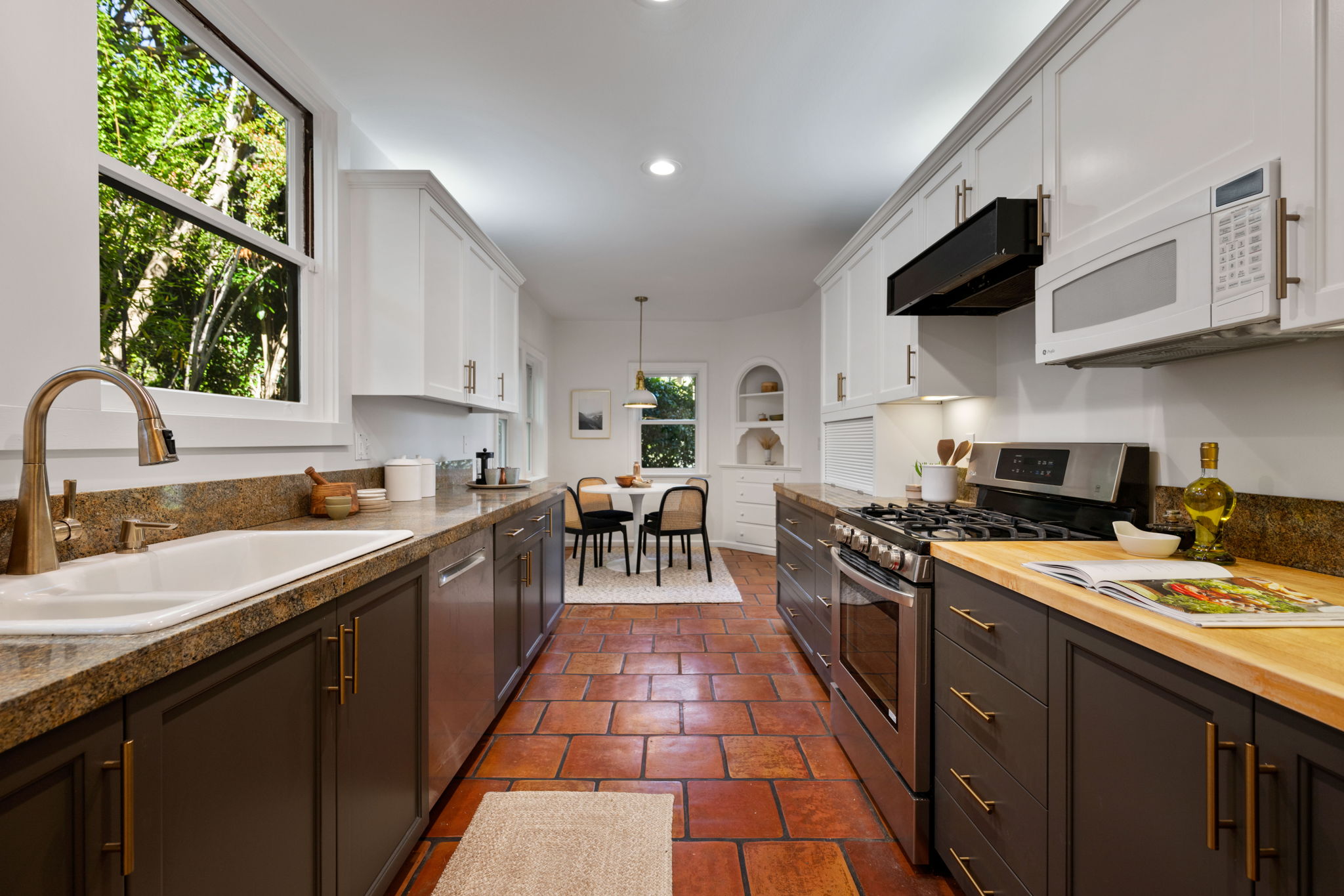 Welcome to 1144 Mandana Blvd. Captivating Crocker Highlands Traditional with level-out park-like private gardens. Upon entering one is greeted by a stunning curved staircase and cathedral ceiling foyer. Light-filled dining room ideal for formal gatherings with three floor-to-ceiling arched windows frame the exterior gardens and maple trees. Cheerful eat-in kitchen blanketed with terracotta pavers, two-tone cabinets, gas range, and dining area. Magnificent living room with french doors onto large private terrace that overlooks rear gardens featuring expansive level yard, terraced dining area and lush verdant flora offering tranquil privacy. An additional sun-soaked den off the rear of the home is ideal as office, lounge or guest space with its own door onto the rear balcony. A full bathroom and laundry area complete the main level.