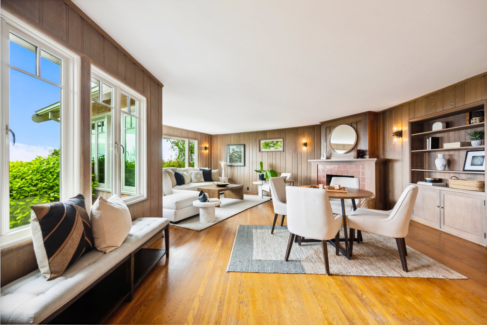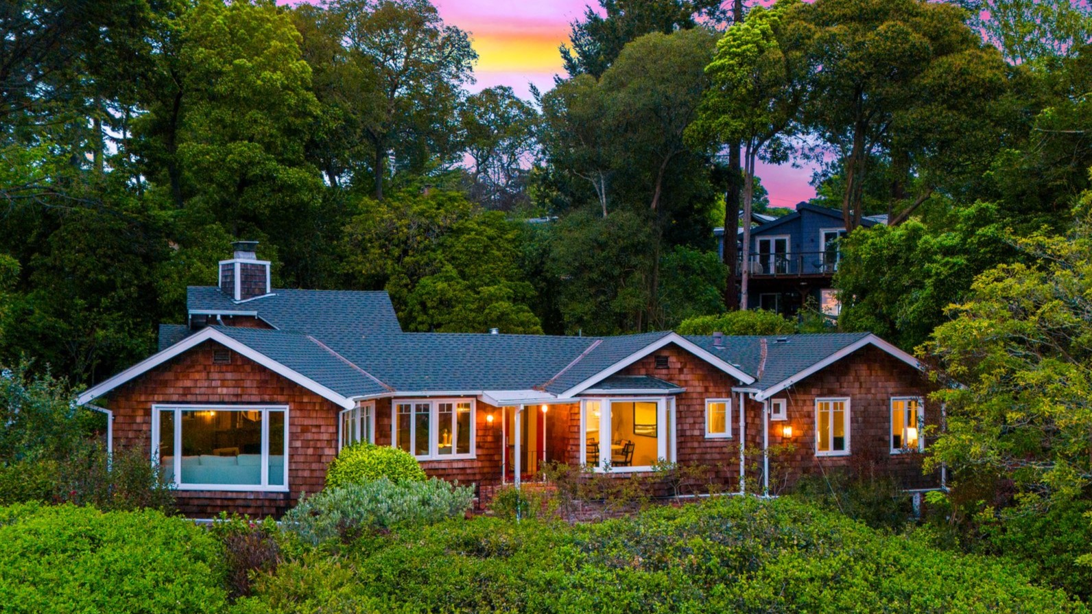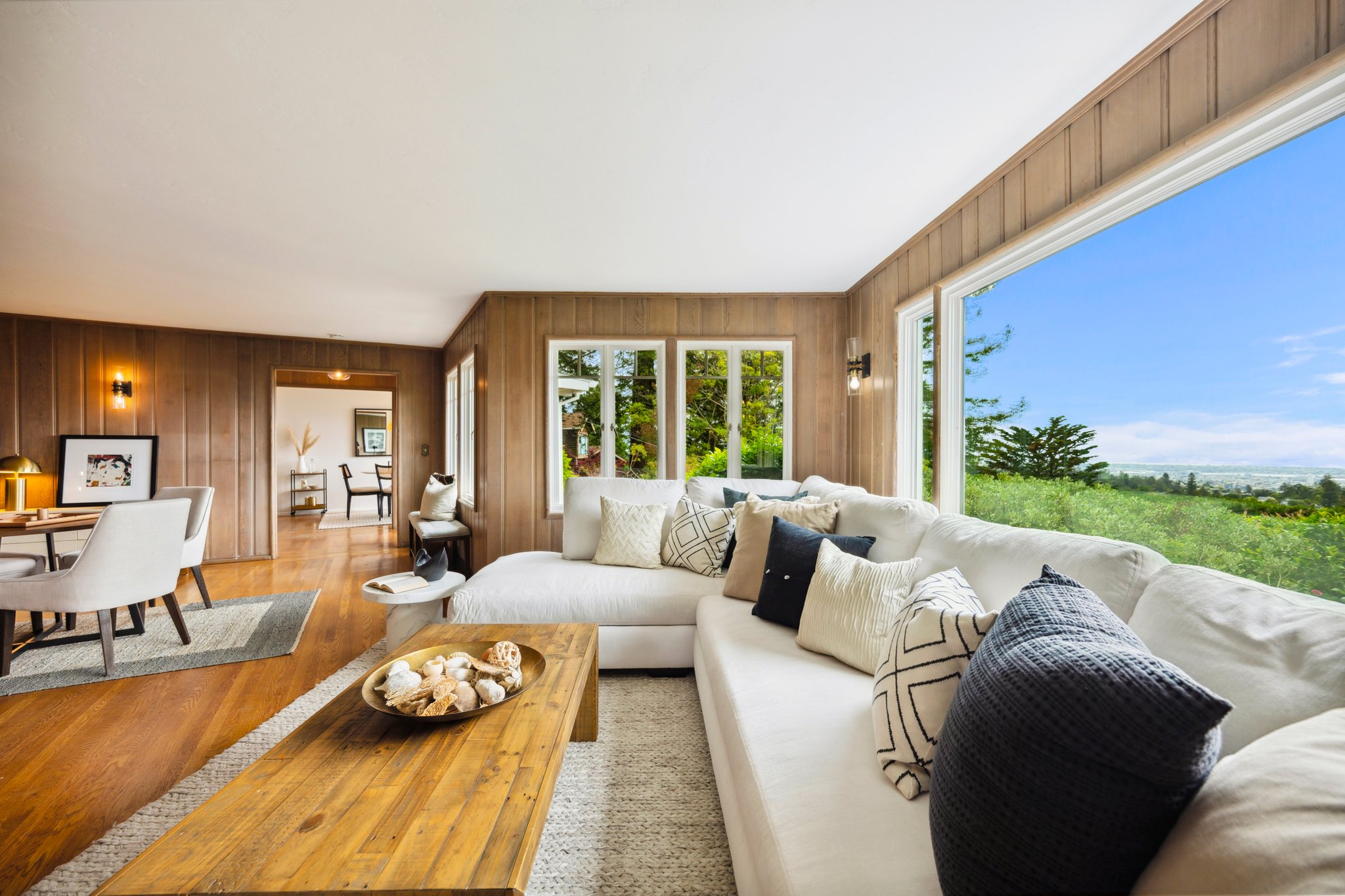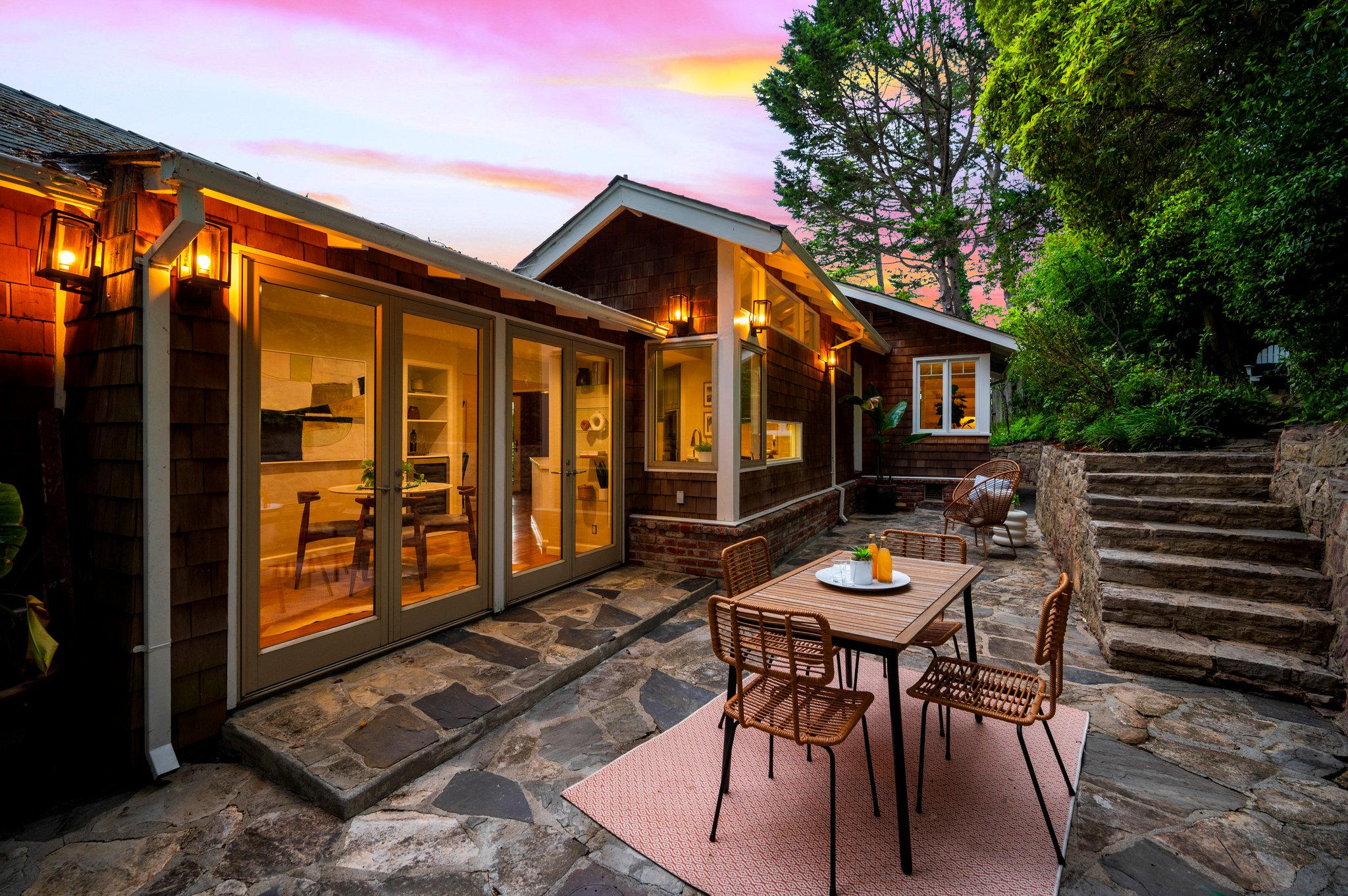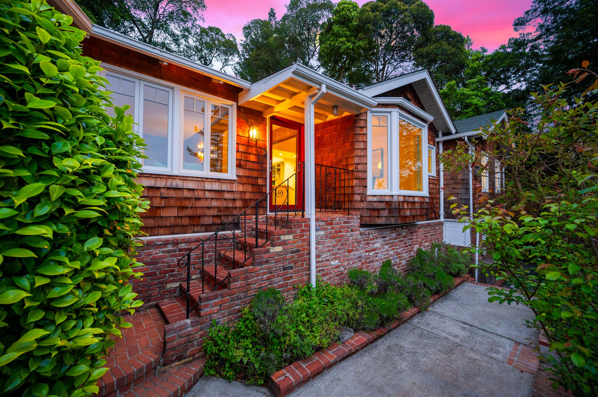 Vintage charm meets modern elegance in this brown shingle cottage offering stunning views of San Francisco and the Bay. One-level living with open floor plan and inviting living room featuring quintessential wood-paneled walls, San Francisco views and cozy fireplace. Renovated chef’s kitchen with quartz counters, designer backsplash and Wolf range that overlooks charming private patios. Adjacent dining room with picture window offers dramatic sunsets over the Bay, promising to inspire evenings of lively conversation.