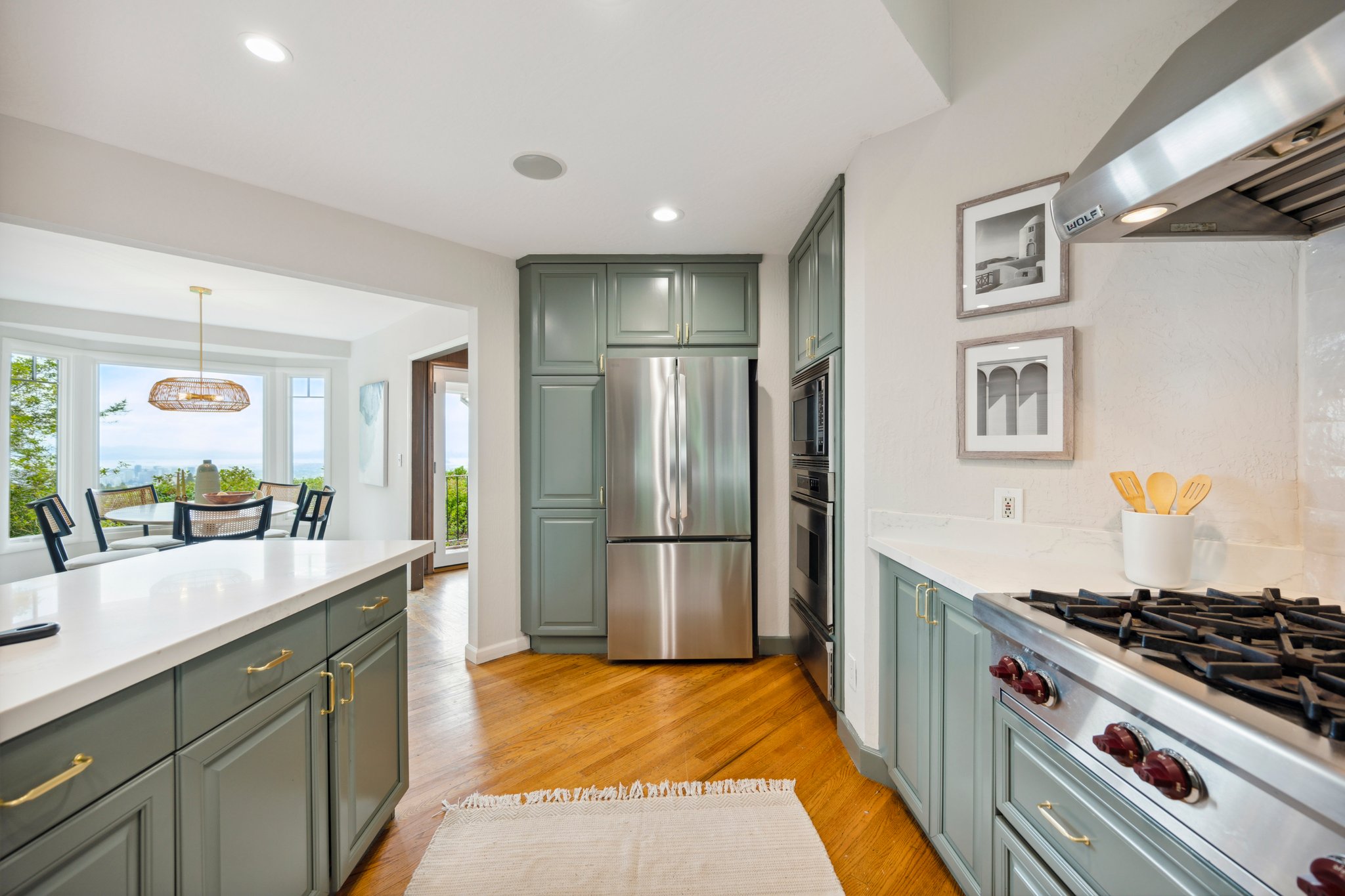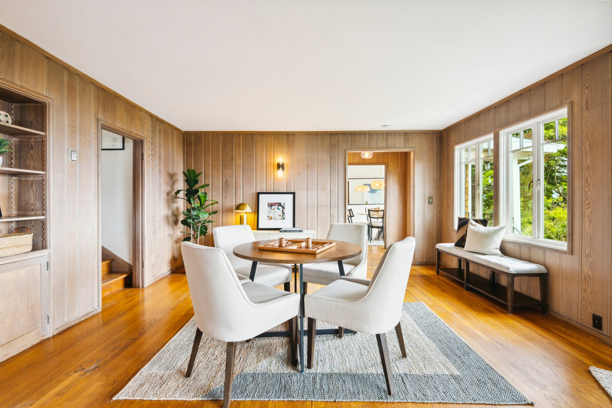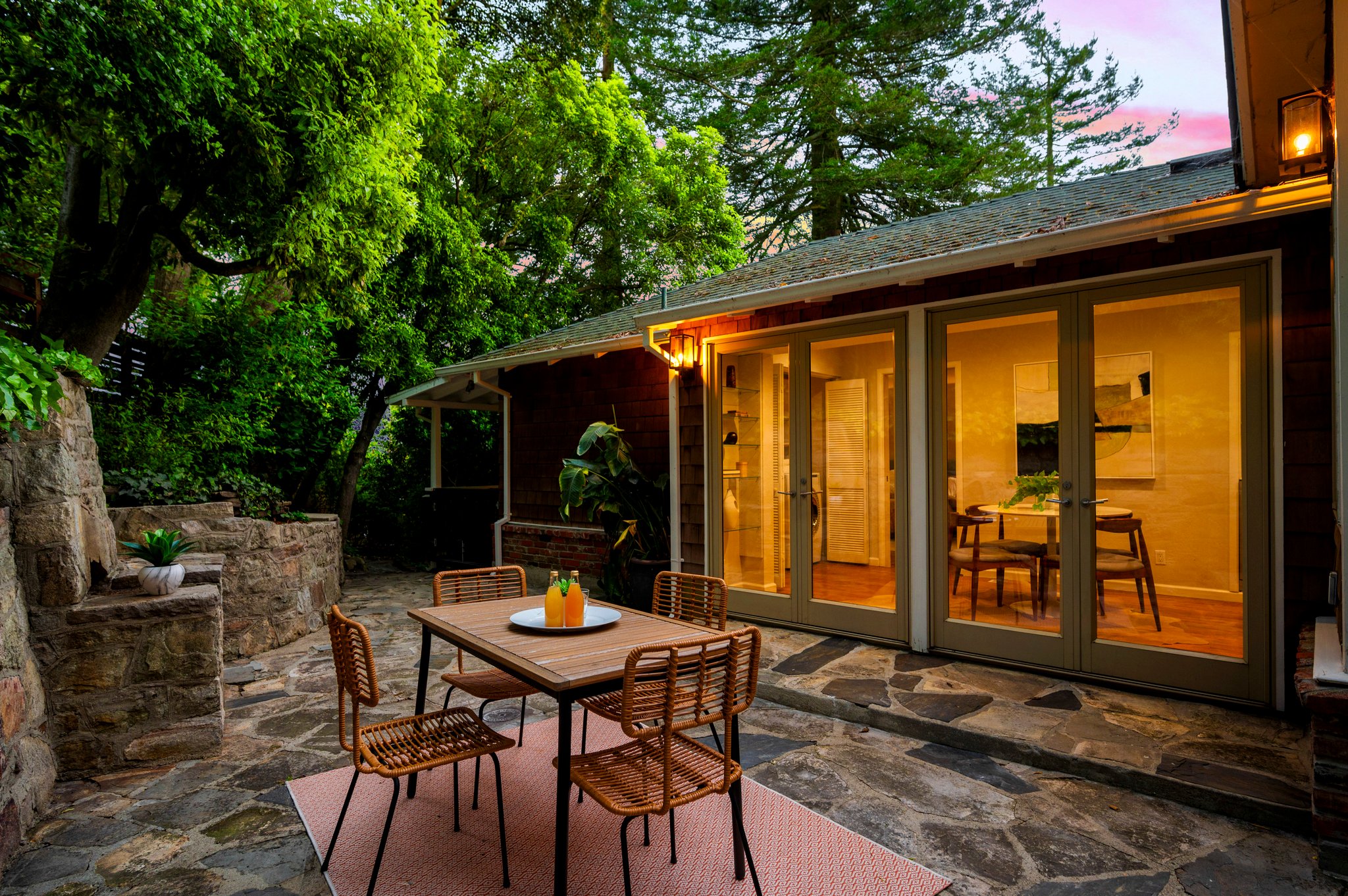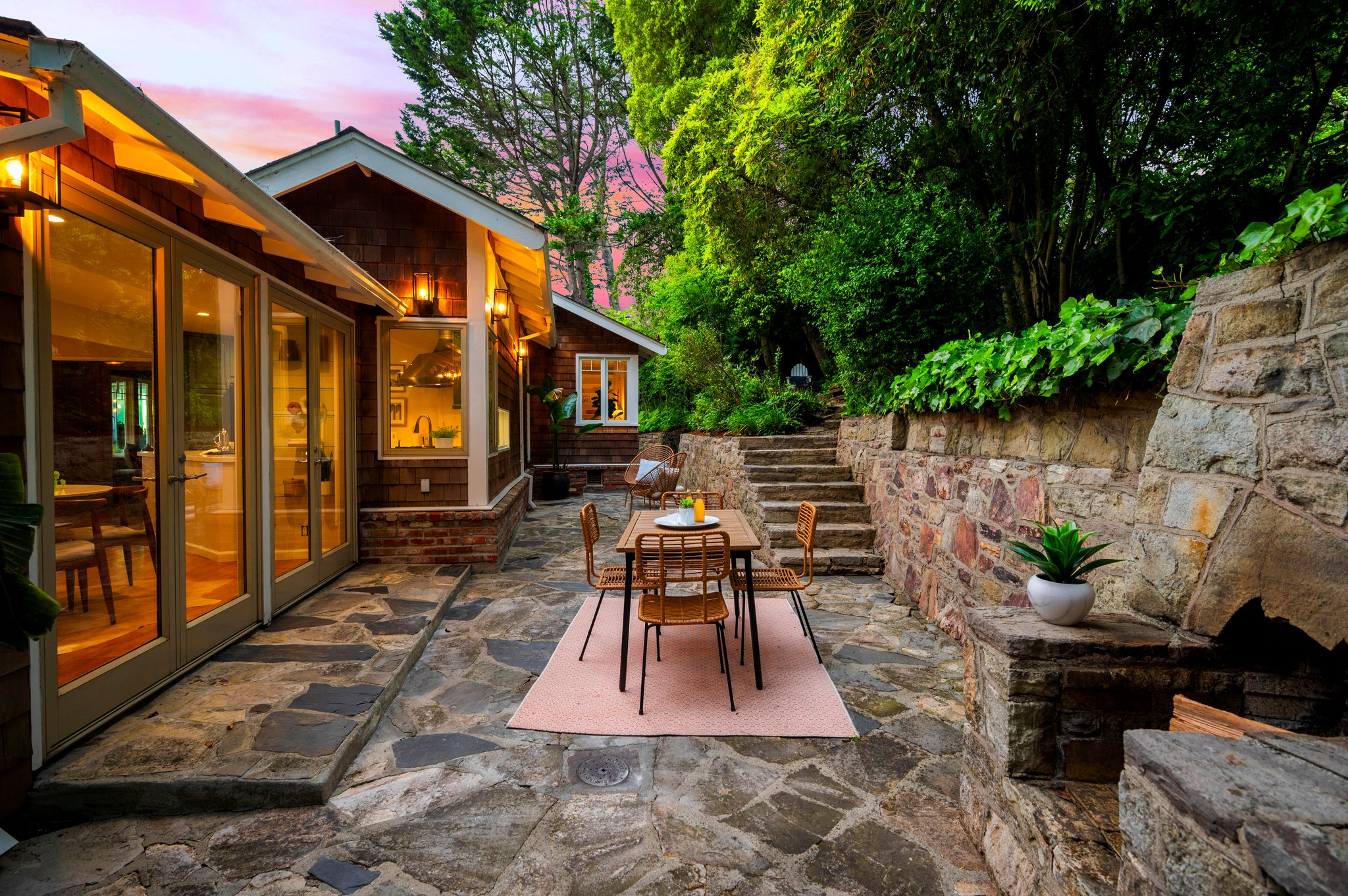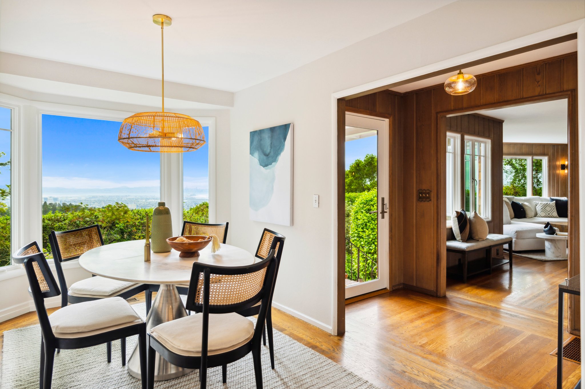 Vintage charm meets modern elegance in this brown shingle cottage offering stunning views of San Francisco and the Bay. One-level living with open floor plan and inviting living room featuring quintessential wood-paneled walls, San Francisco views and cozy fireplace. Renovated chef’s kitchen with quartz counters, designer backsplash and Wolf range that overlooks charming private patios. Adjacent dining room with picture window offers dramatic sunsets over the Bay, promising to inspire evenings of lively conversation.