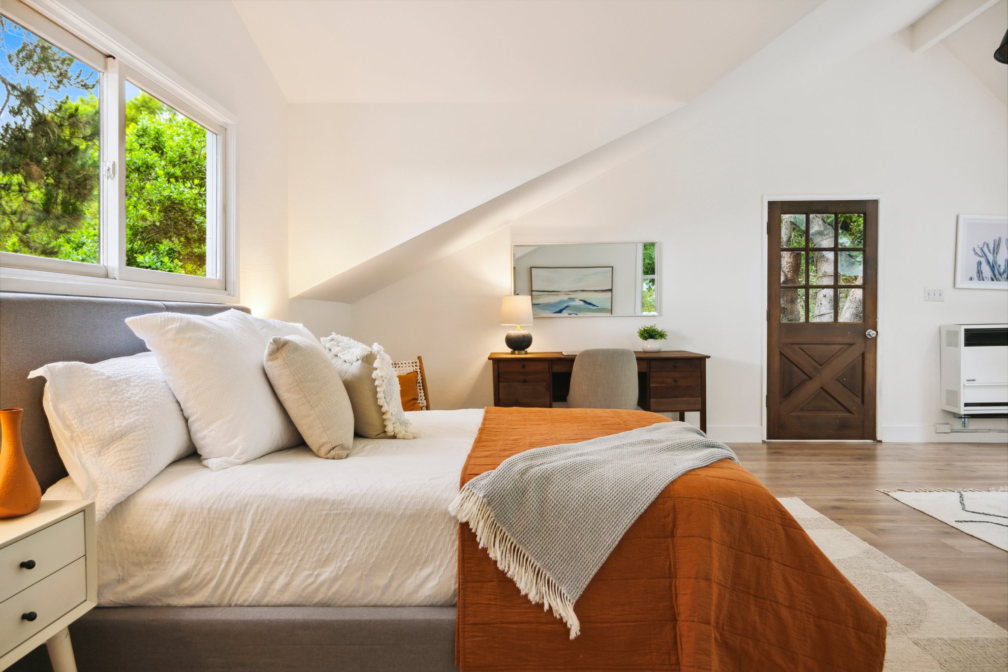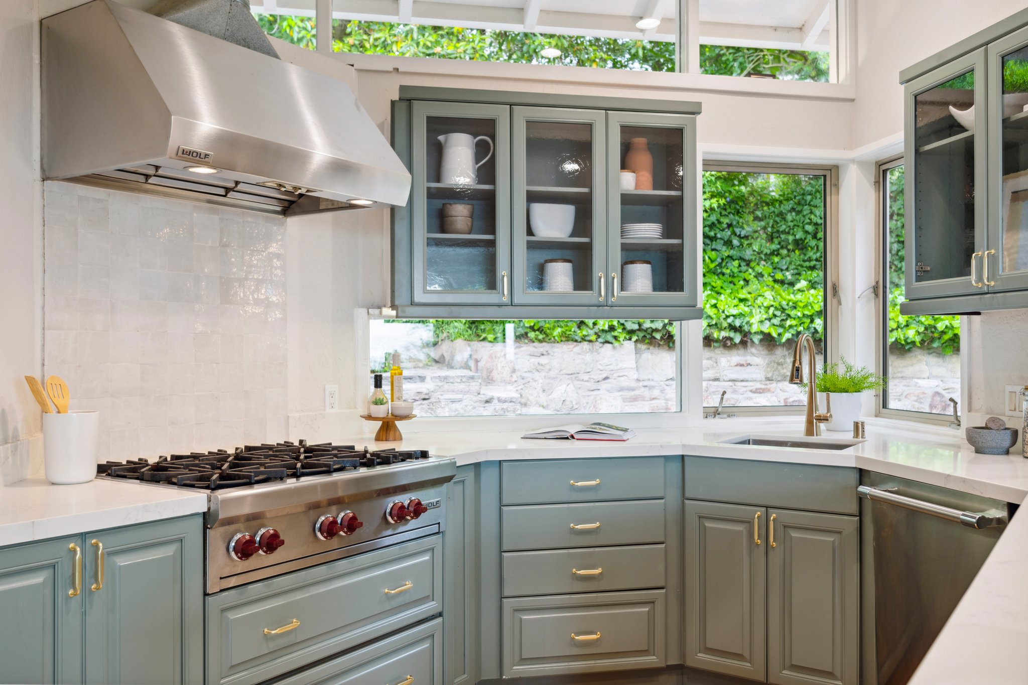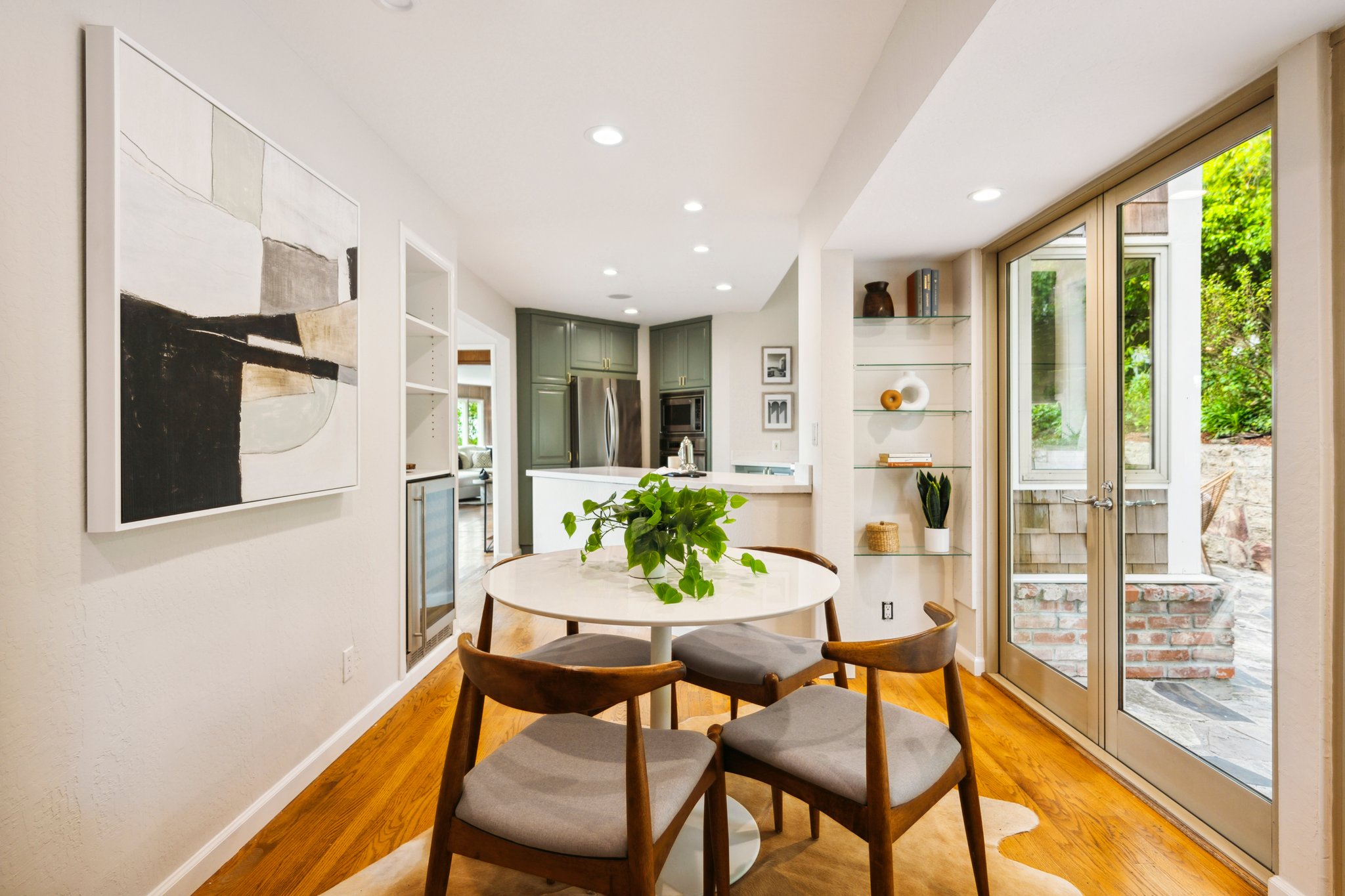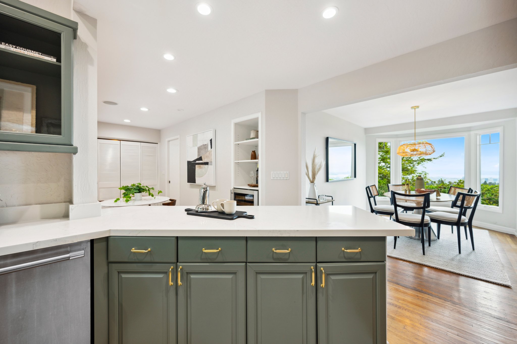 Vintage charm meets modern elegance in this brown shingle cottage offering stunning views of San Francisco and the Bay. One-level living with open floor plan and inviting living room featuring quintessential wood-paneled walls, San Francisco views and cozy fireplace. Renovated chef’s kitchen with quartz counters, designer backsplash and Wolf range that overlooks charming private patios. Adjacent dining room with picture window offers dramatic sunsets over the Bay, promising to inspire evenings of lively conversation.