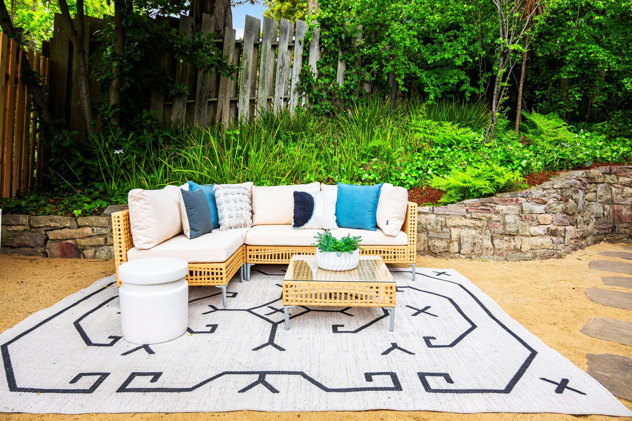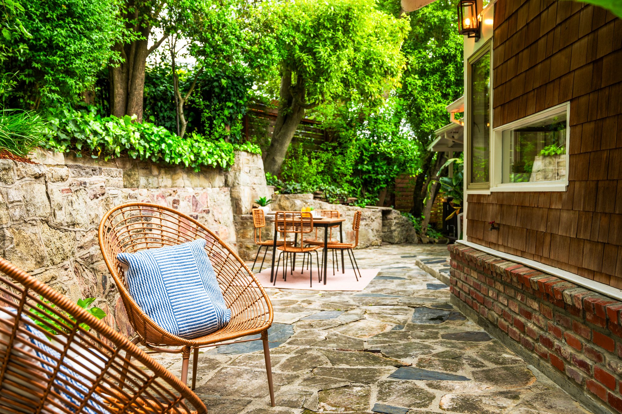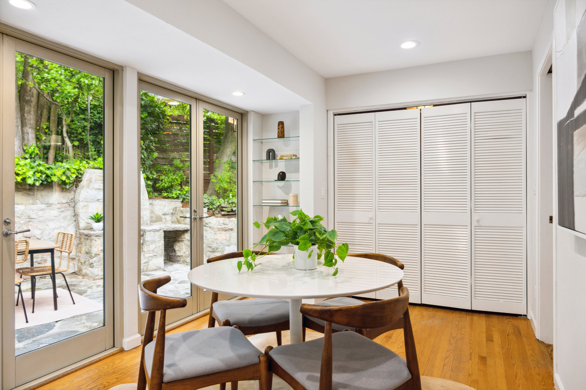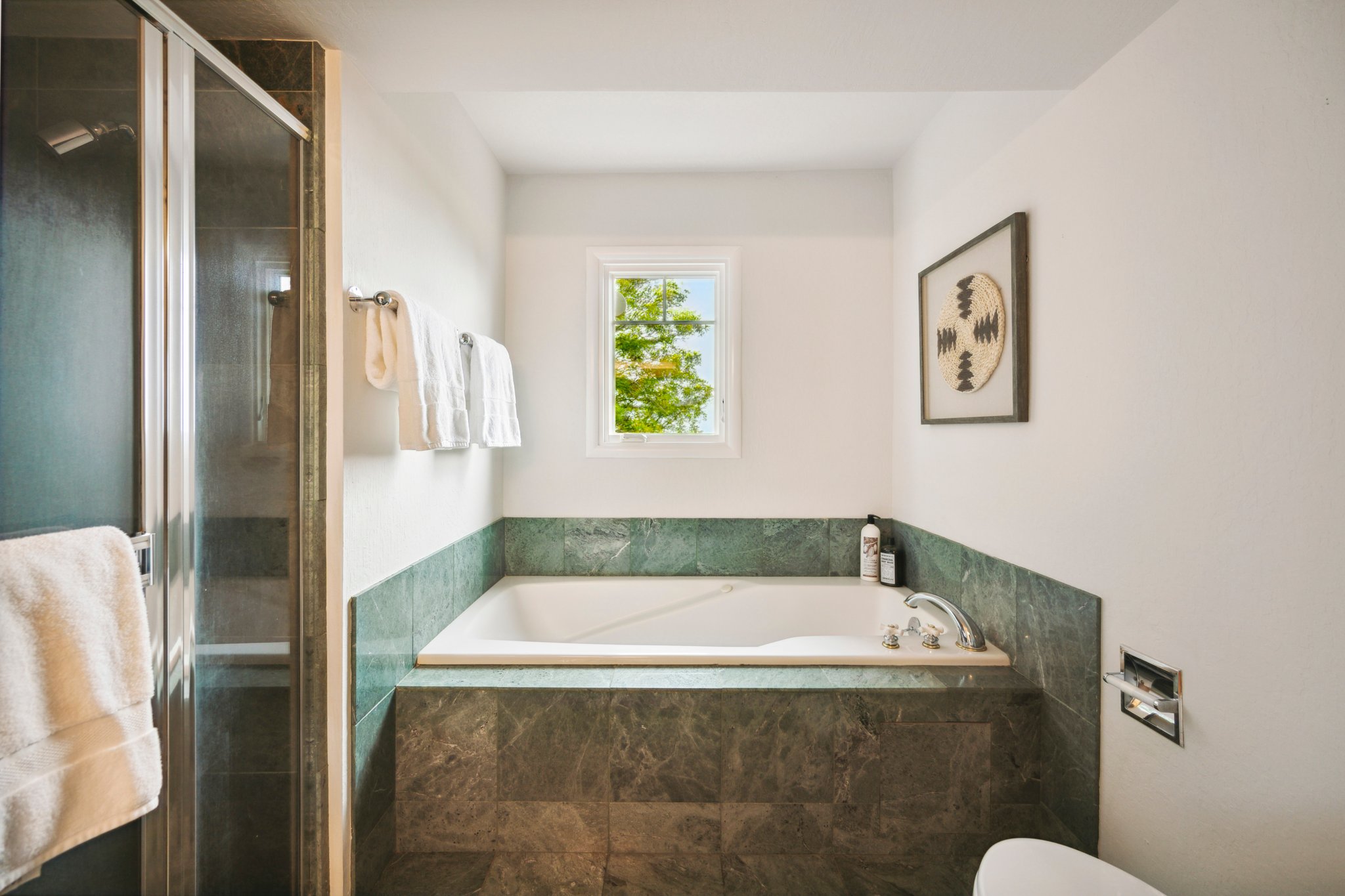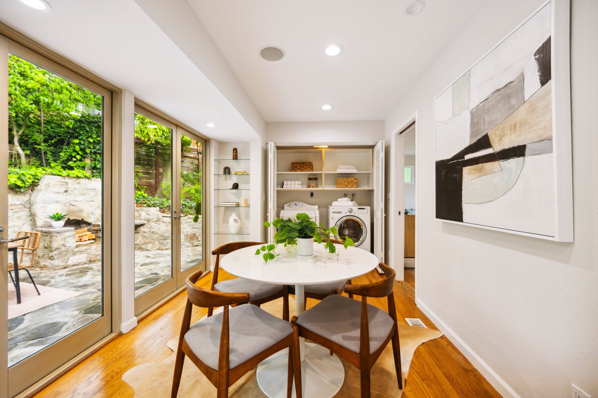 Primary suite with luxurious spa bath soaking tub, natural stone tile and double vanity. Additional hall bath with rustic tile and frameless glass shower. The home's balanced natural light honors the beautiful wooded setting, perfect for unwinding or welcoming guests, and additional studio space with sleek details and designer lighting is positioned over the large detached two-car garage. A lower-level workshop with separate entrance is ideal for storage and invites potential expansion. Sitting on a double lot and surrounded by 360 degrees of enchanting oak groves, stone patios, and meandering paths, this rare, delightful retreat promises to soothe and inspire.