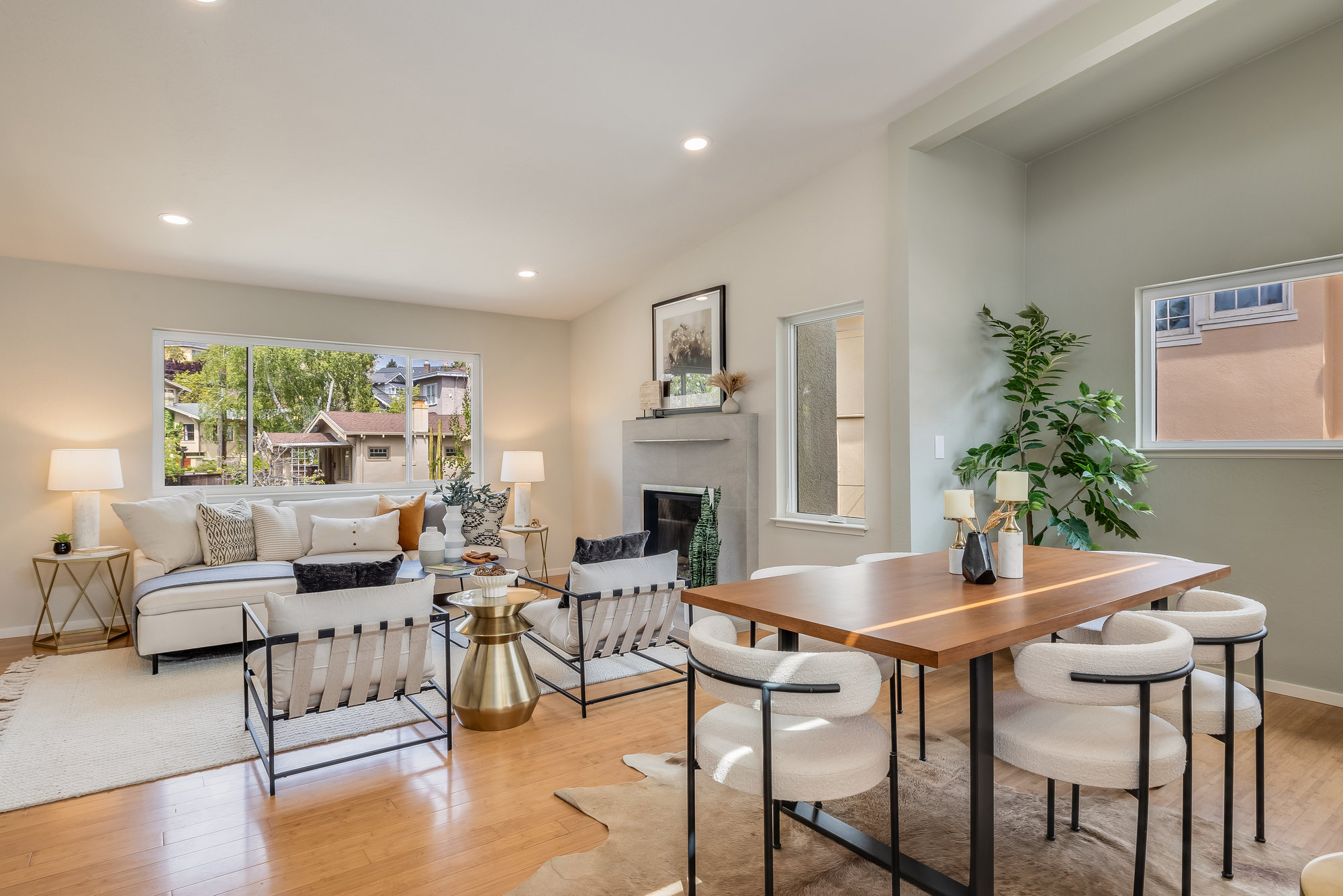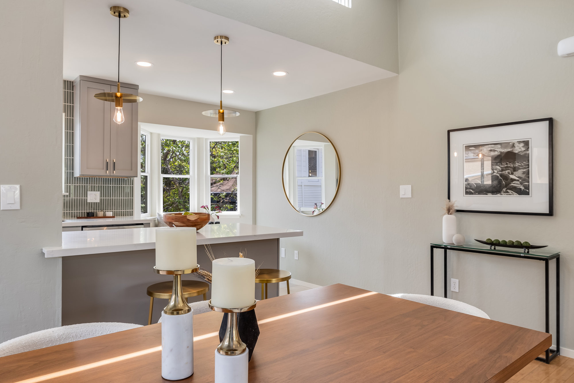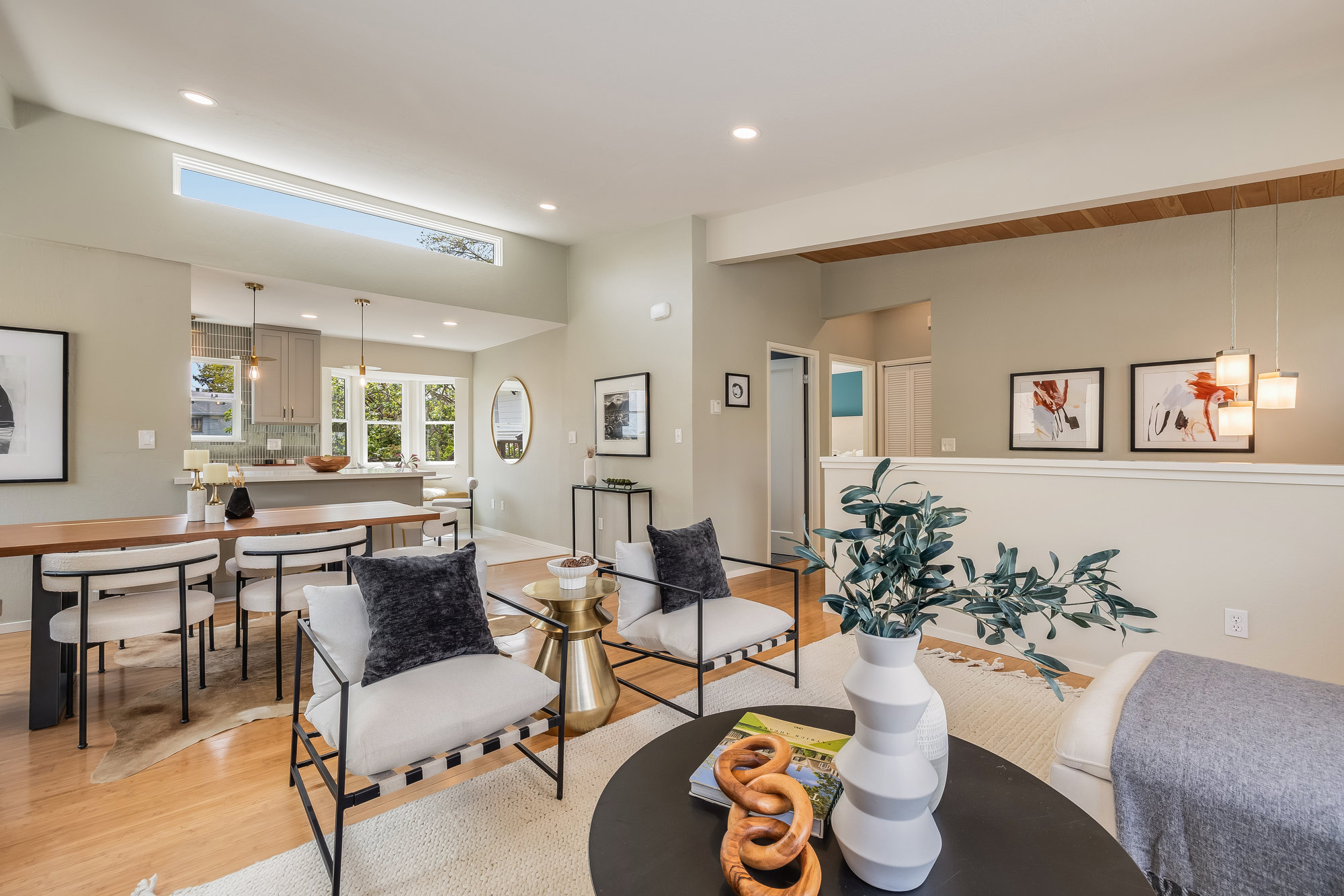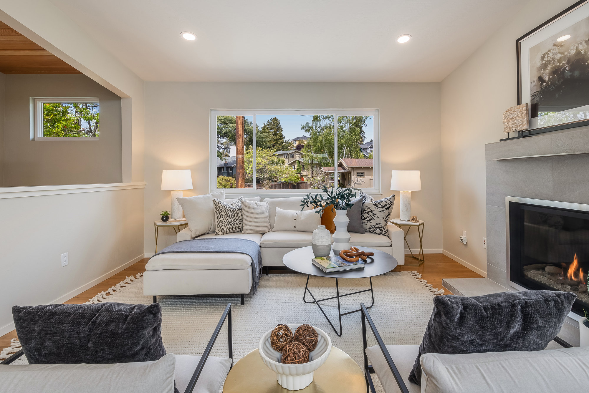 Tucked into the heart of Glenview, just two blocks from neighborhood favorites, this rare contemporary bungalow blends clean architectural lines with midcentury inspiration. Recently renovated with thoughtful detail, the home offers an easy indoor-outdoor lifestyle in one of Oakland’s most beloved neighborhoods. Vaulted ceilings and a gas fireplace anchor the bright, airy living room, which flows into a spacious dining area and a newly updated kitchen. Outfitted with stainless steel appliances, porcelain tile, and sophisticated brass lighting, the kitchen balances style and function for everyday living. Two well-proportioned bedrooms offer generous closets, while both bathrooms feature modern fixtures and designer finishes that align with the home’s overall aesthetic. Out back, a new patio creates the perfect space to gather and grill, framed by mature fruit trees, roses, and a grassy area for play. Located just blocks from Glenview’s top-rated elementary school and moments from local favorites like Marzano, Paulista, Park Burger, and Ultimate Grounds. Stylish, turn-key, and ready to welcome you home.
