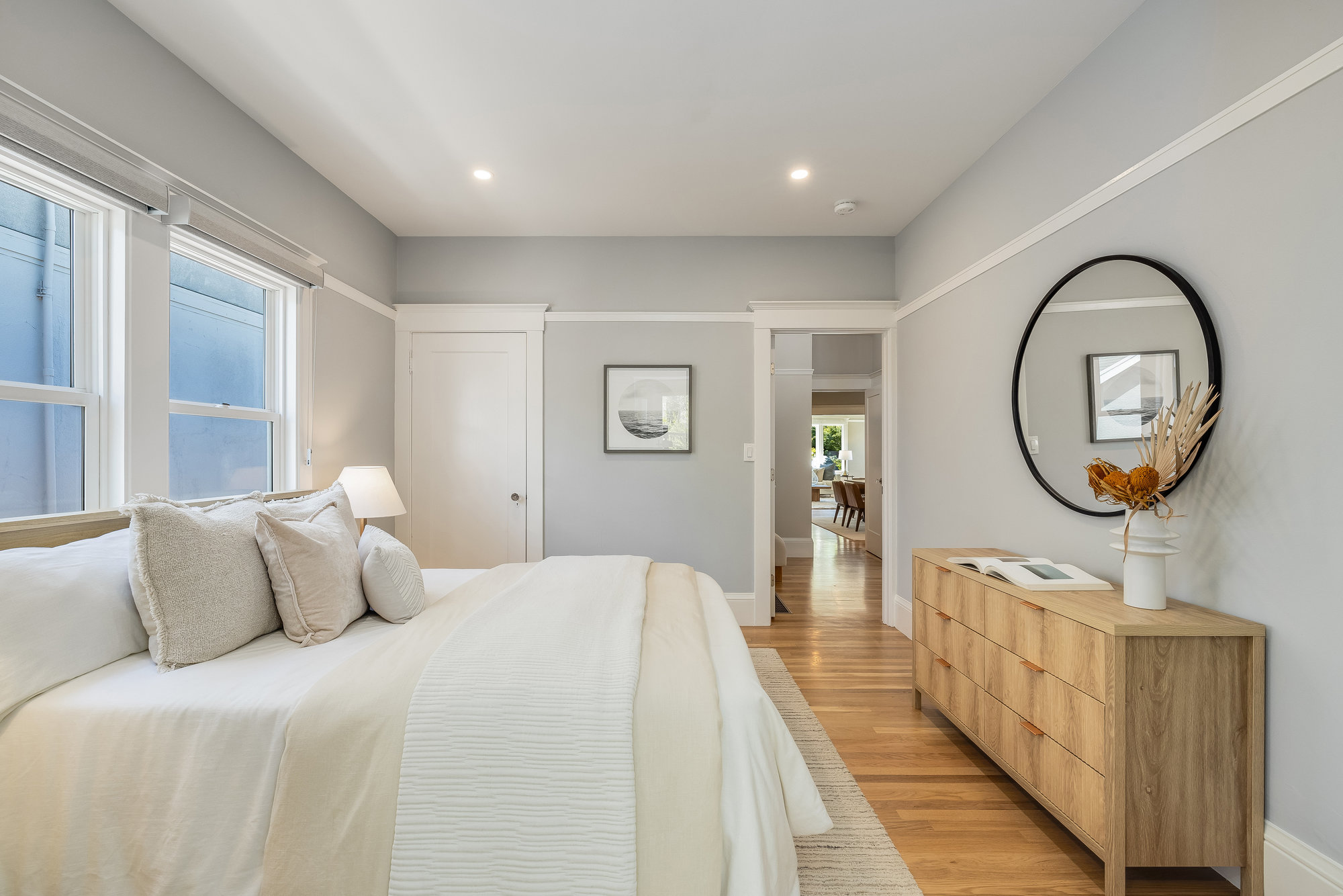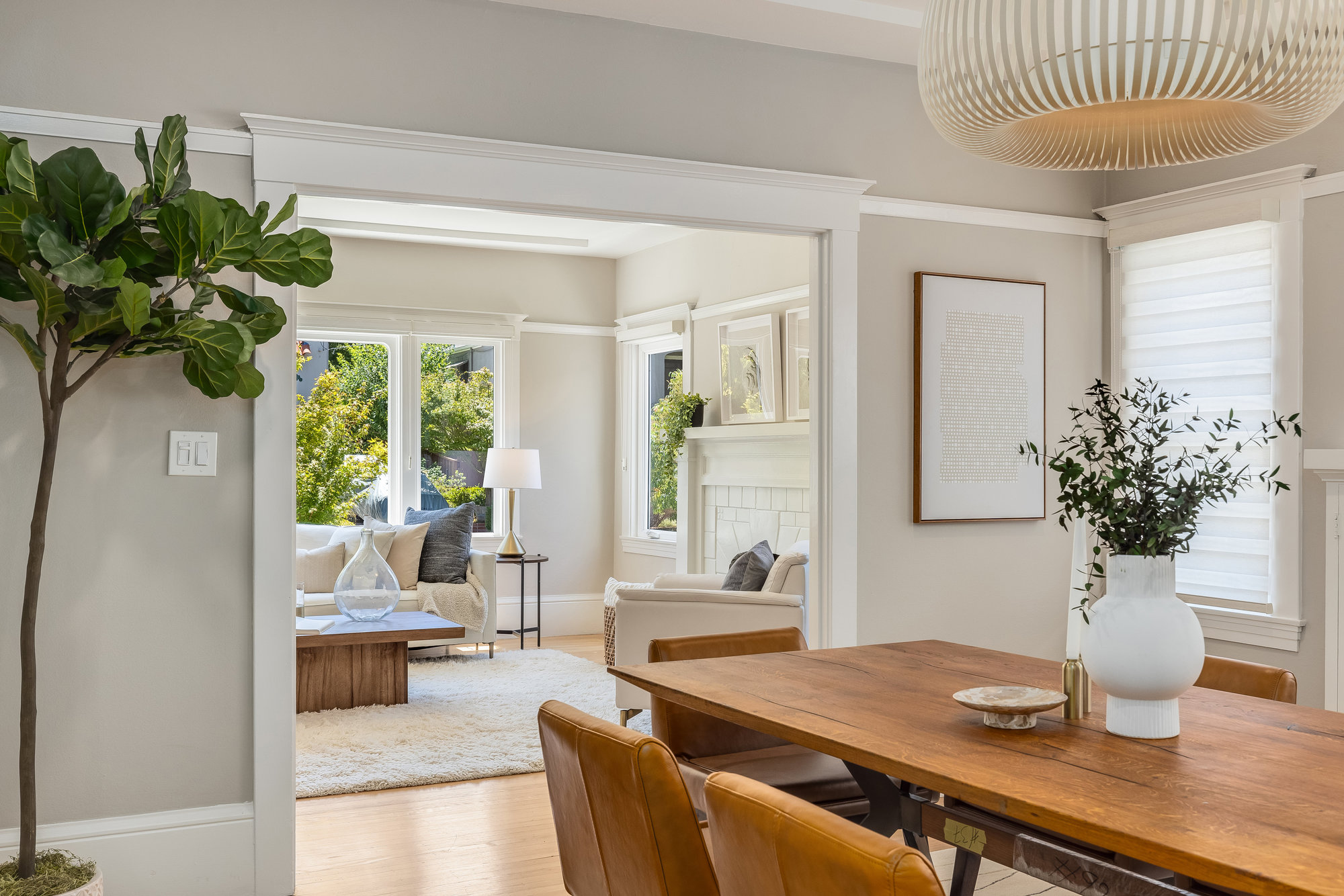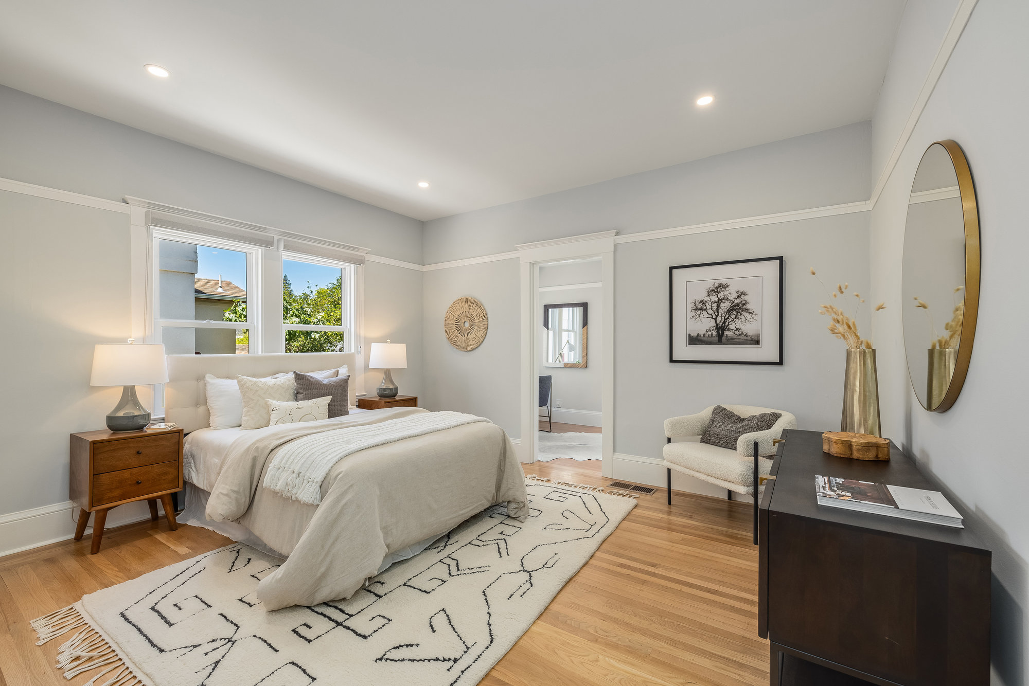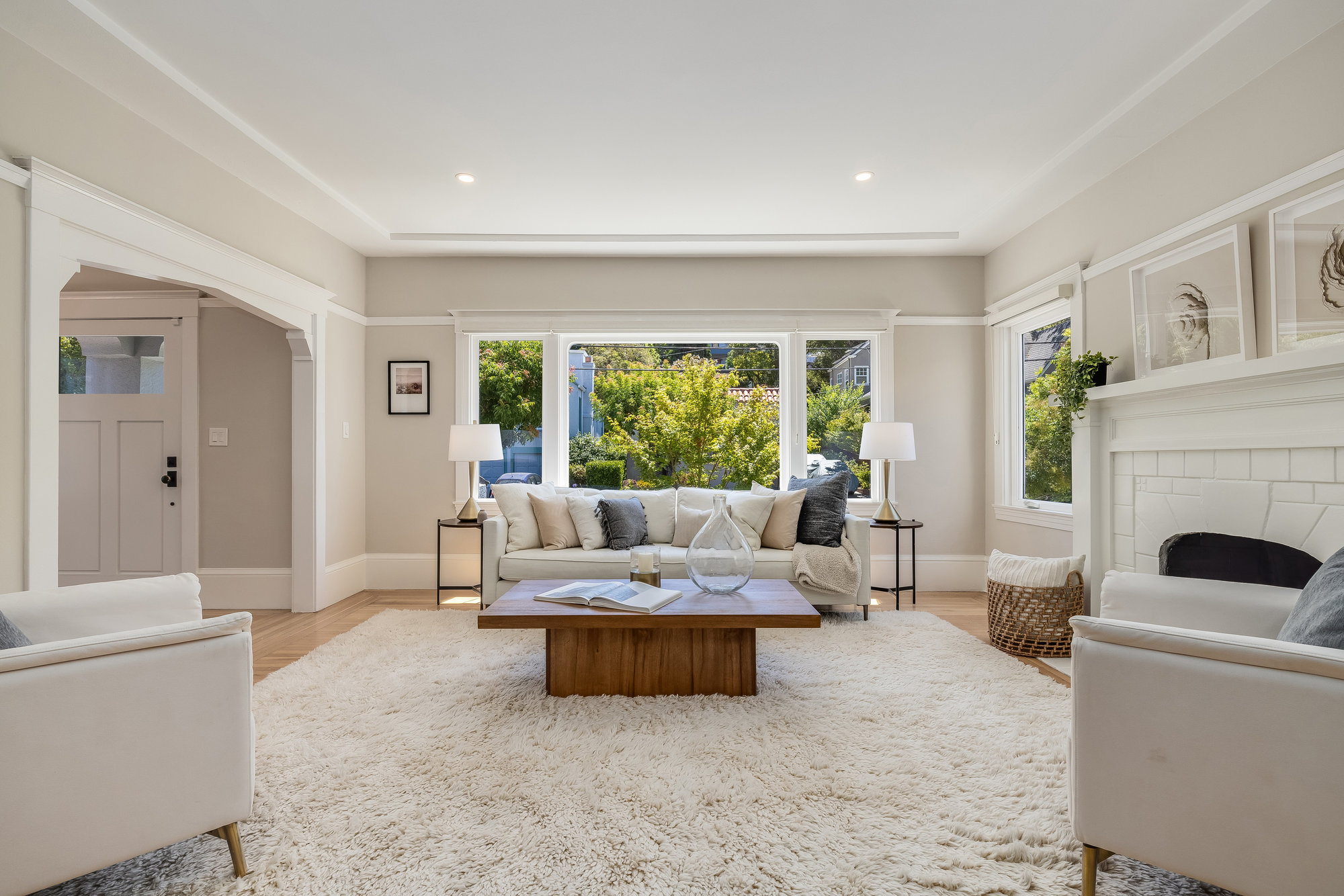 Pristine Crocker Highlands Craftsman featuring elegant private rear gardens with fabulous detached cabana. Spacious formal living room illuminated with natural light, elegant ceiling accents, fireplace and artisan wood moldings. Dining room with stunning Mia Pendant Chandelier and freshly rebuilt built-ins. Custom inset lighting and designer window shades complete both of these spaces. Chef’s kitchen with stainless appliances, Wolf Range, luxe stone counters, artisan tile backsplash surround, abundant cabinetry, hardwood floors and storage areas with dedicated space for home command center. Updated hall bathroom with marble top vanity, shower over tub and subway tile. Primary suite with spacious bath offering frameless glass shower, double sink vanity, private WC, and windows overlooking the gardens. Glorious rear grounds with Luxembourg Garden accents, gas plumbed RH fire pit, and a fabulous cabana with double glass doors, interior wood paneling, and floating fireplace, an ideal flex room for garden soirees, home office, gym, or den. Interior stairs from the kitchen lead down to spacious laundry and storage areas housing the home’s HVAC systems for easy access. Recent updates include an EV charger, new HVAC, drainage, tankless hot water heater, electrical, plumbing, seismic, landscaping, and more. Positioned on a quiet neighborhood street just blocks from fabulous shops and restaurants, the award-winning Crocker Highlands Elementary, plus quick access to the Bay Bridge to SF.