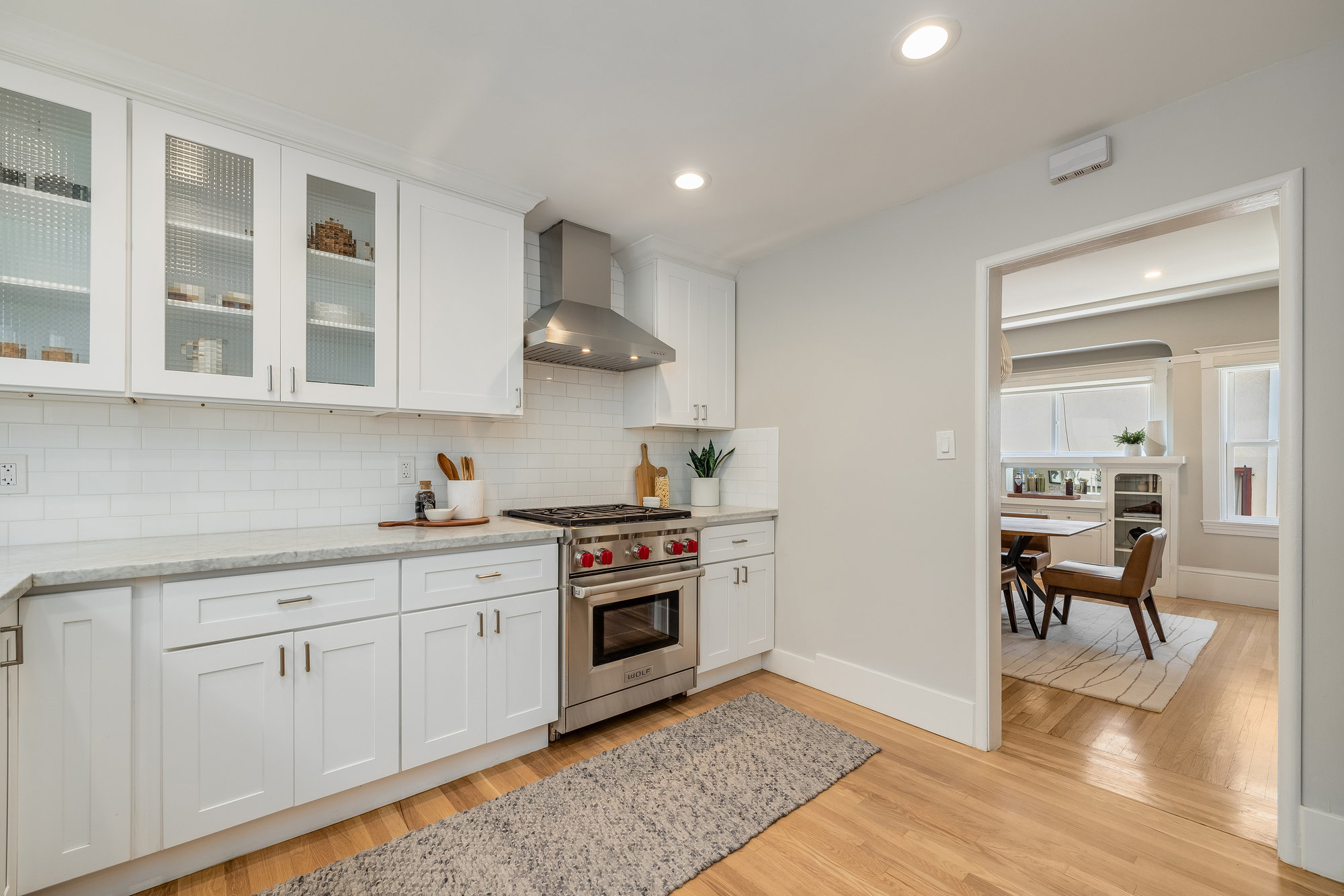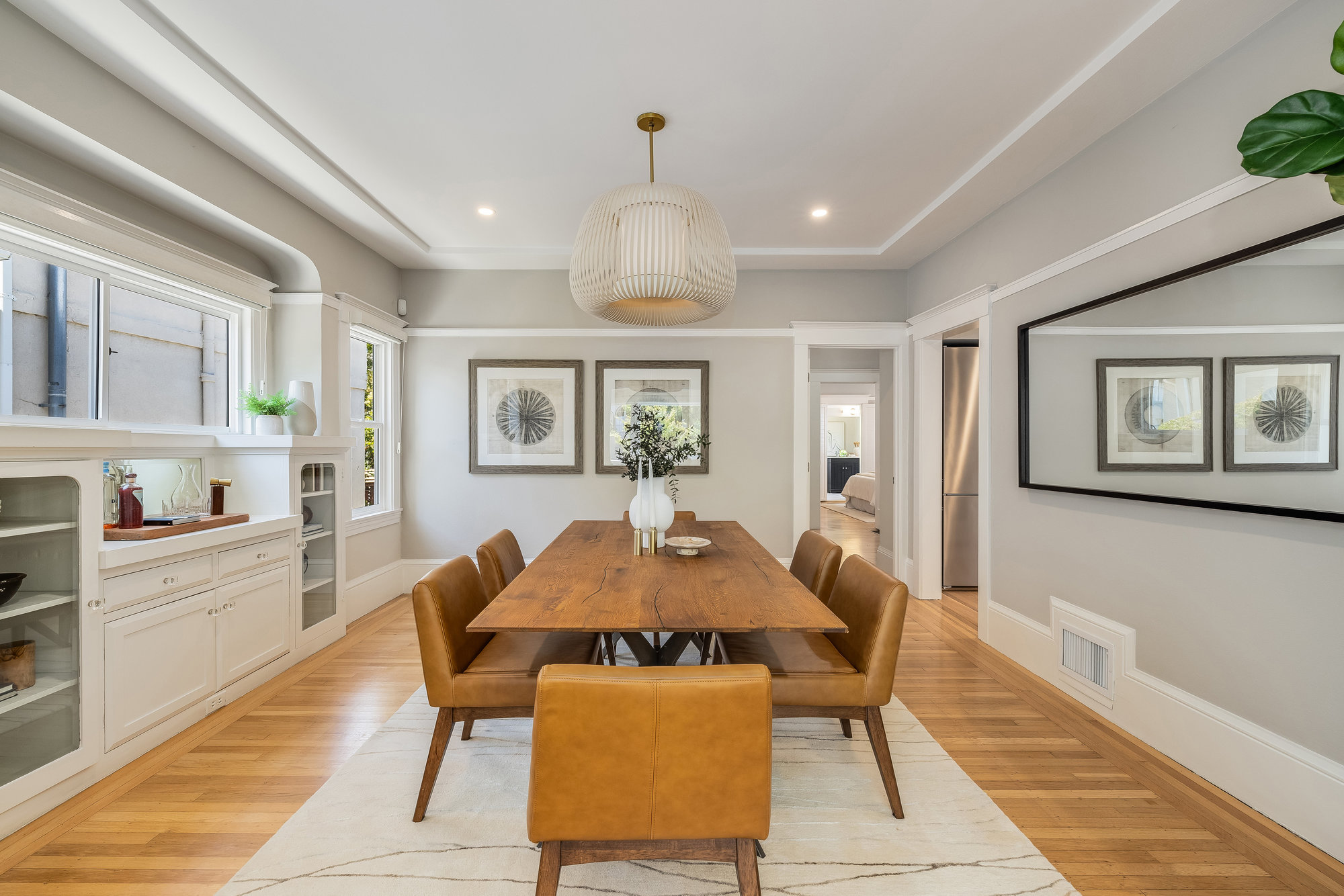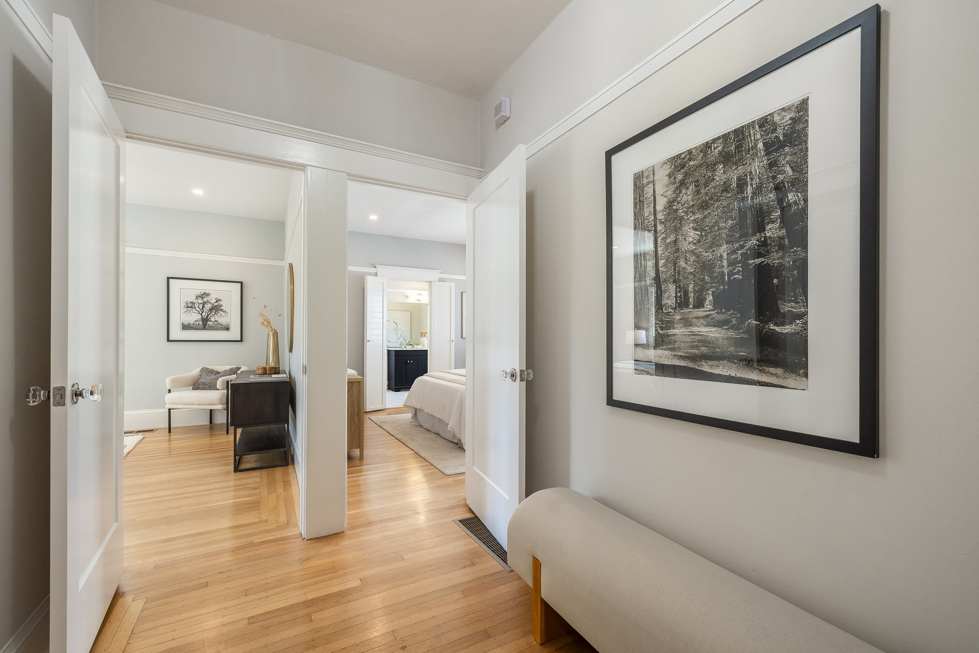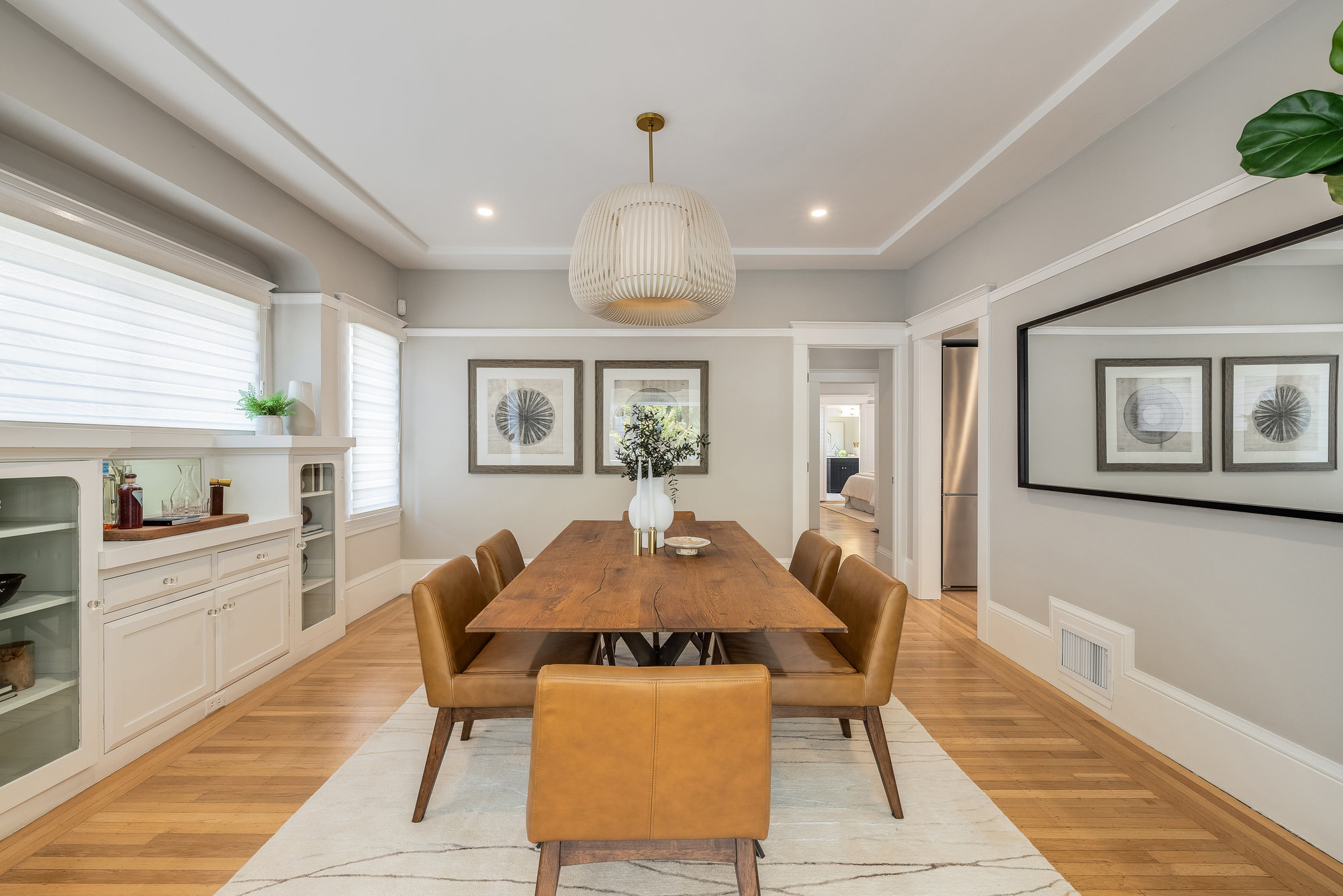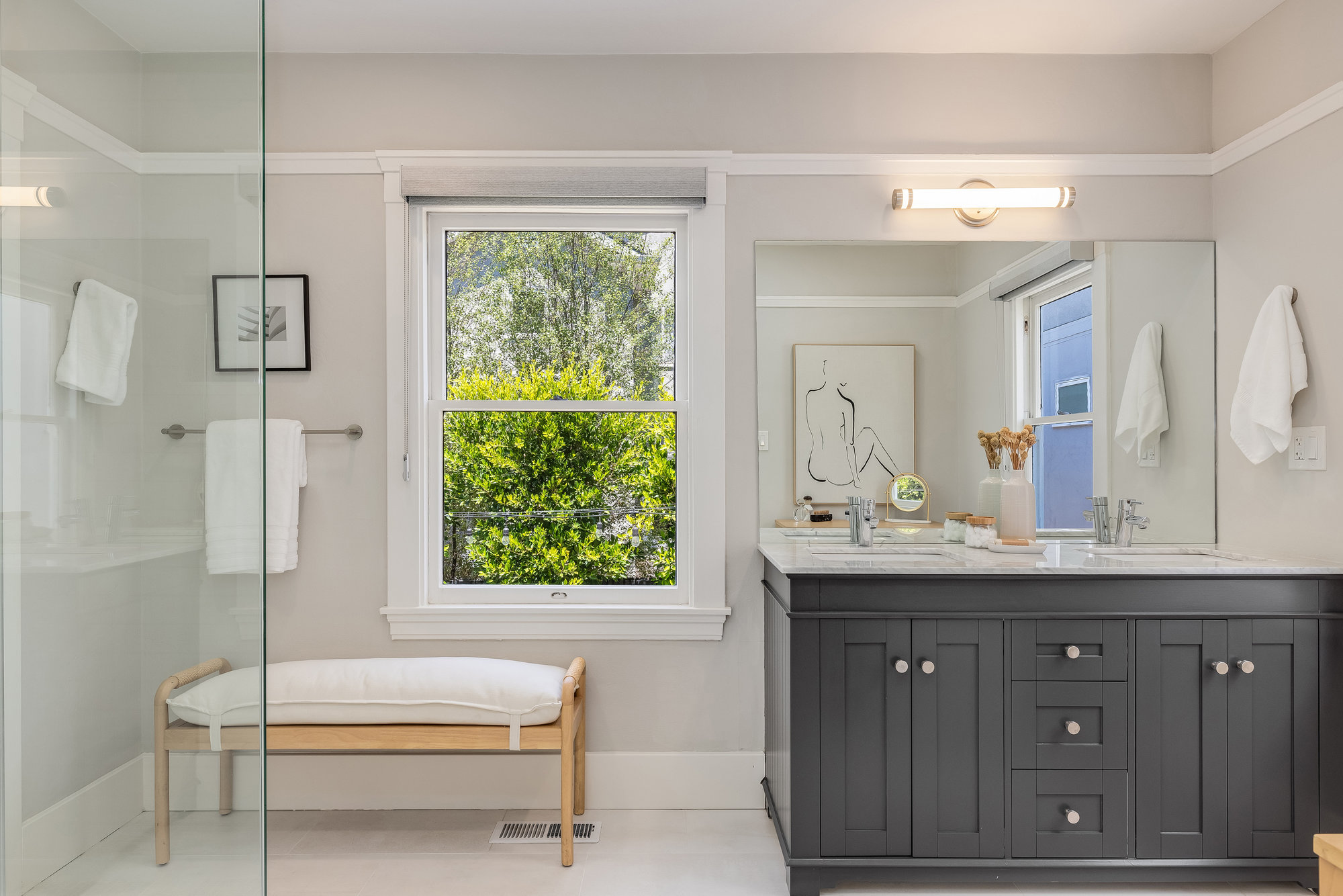 Pristine Crocker Highlands Craftsman featuring elegant private rear gardens with fabulous detached cabana. Spacious formal living room illuminated with natural light, elegant ceiling accents, fireplace and artisan wood moldings. Dining room with stunning Mia Pendant Chandelier and freshly rebuilt built-ins. Custom inset lighting and designer window shades complete both of these spaces. Chef’s kitchen with stainless appliances, Wolf Range, luxe stone counters, artisan tile backsplash surround, abundant cabinetry, hardwood floors and storage areas with dedicated space for home command center. Updated hall bathroom with marble top vanity, shower over tub and subway tile. Primary suite with spacious bath offering frameless glass shower, double sink vanity, private WC, and windows overlooking the gardens. Glorious rear grounds with Luxembourg Garden accents, gas plumbed RH fire pit, and a fabulous cabana with double glass doors, interior wood paneling, and floating fireplace, an ideal flex room for garden soirees, home office, gym, or den. Interior stairs from the kitchen lead down to spacious laundry and storage areas housing the home’s HVAC systems for easy access. Recent updates include an EV charger, new HVAC, drainage, tankless hot water heater, electrical, plumbing, seismic, landscaping, and more. Positioned on a quiet neighborhood street just blocks from fabulous shops and restaurants, the award-winning Crocker Highlands Elementary, plus quick access to the Bay Bridge to SF.