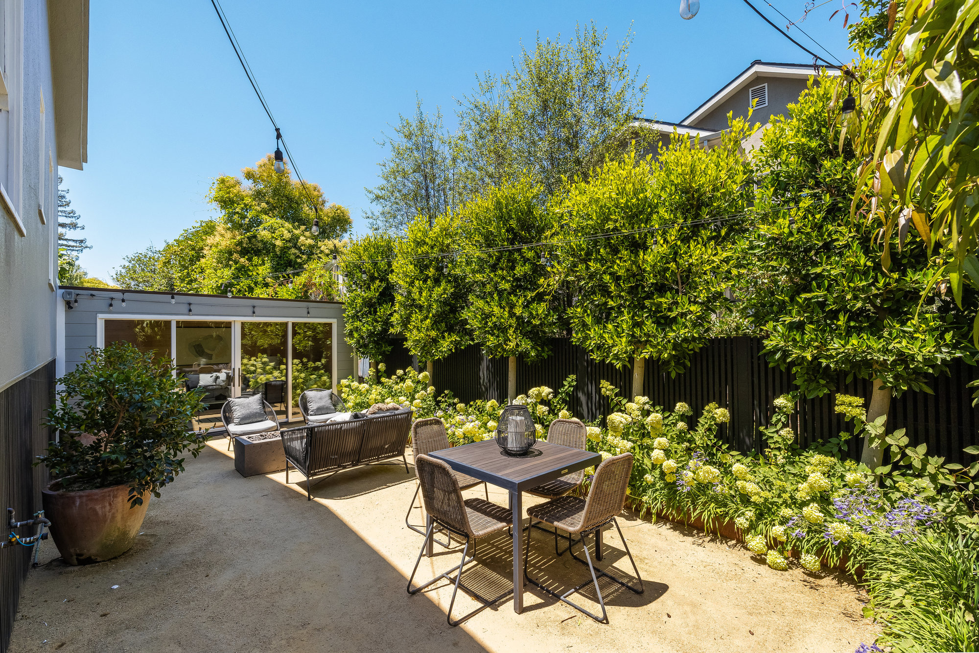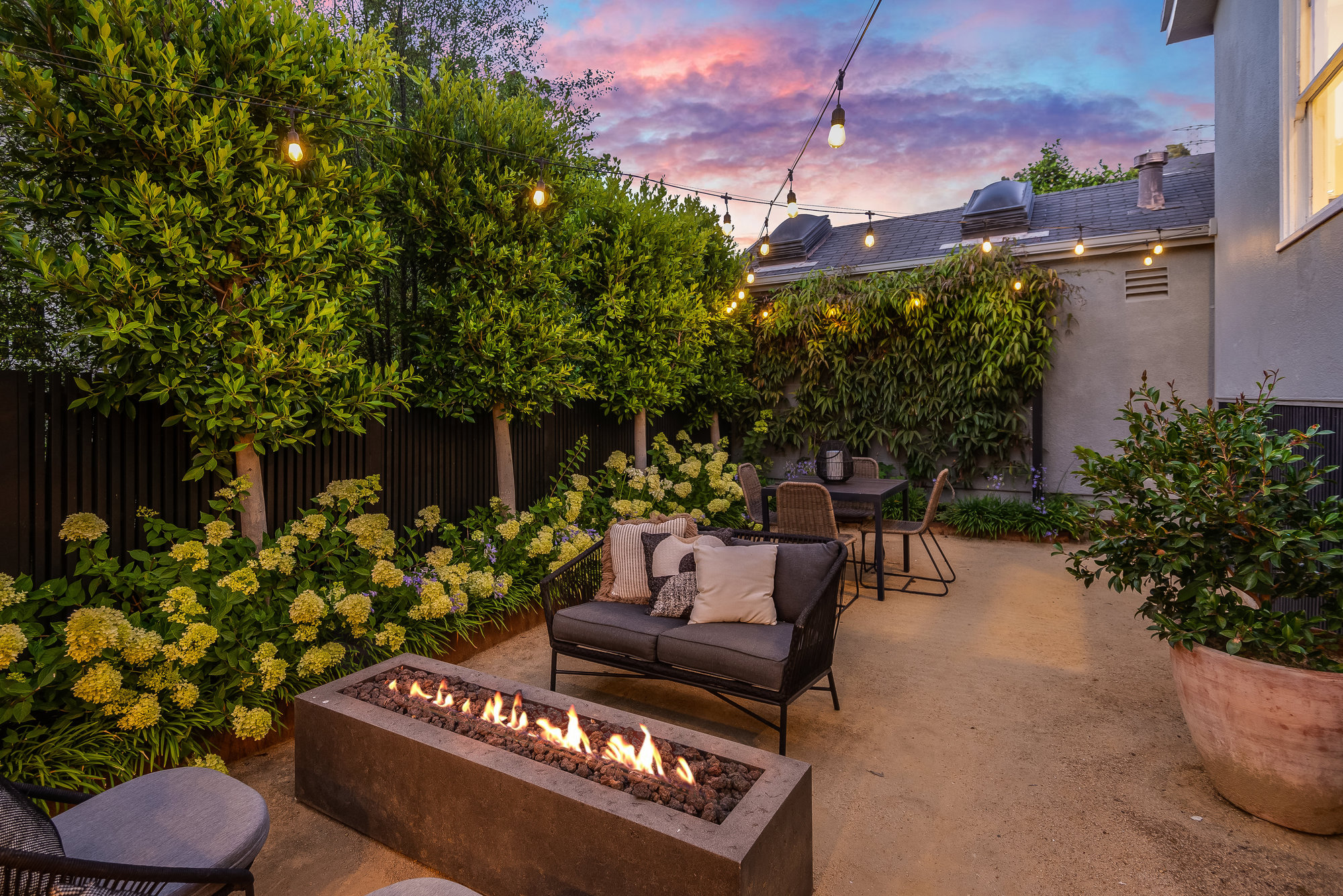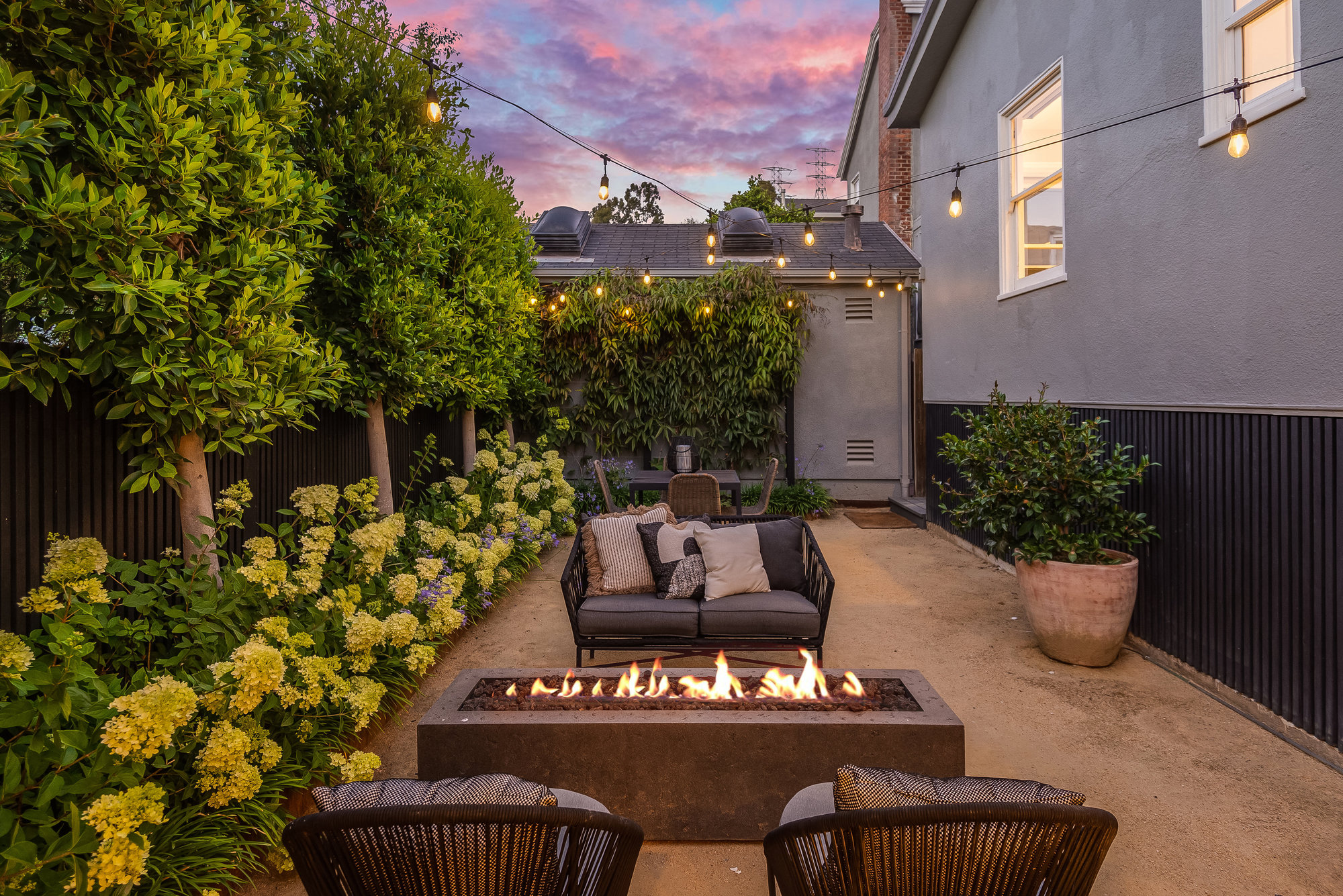 — Elegant rear gardens with plumbed fire pit