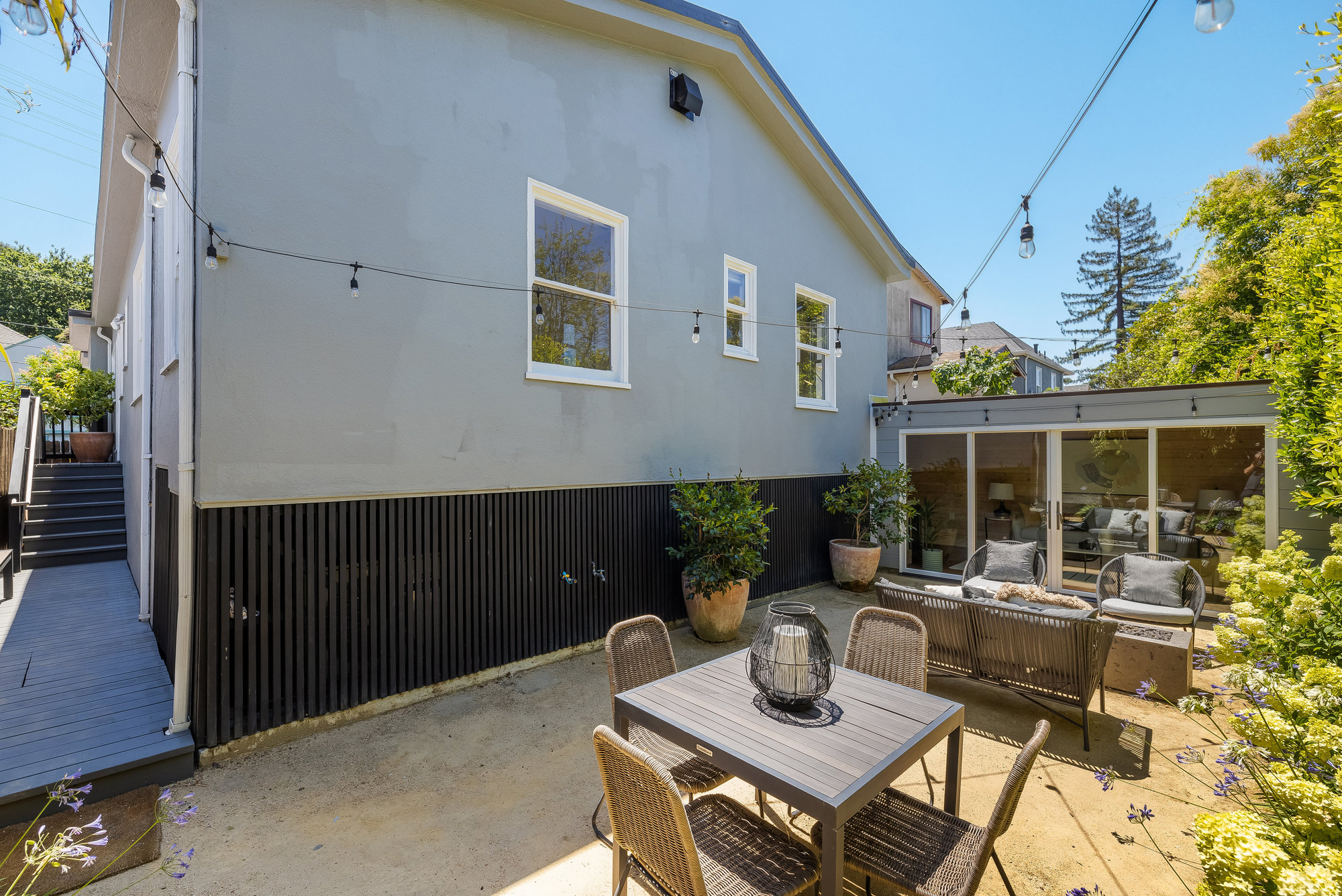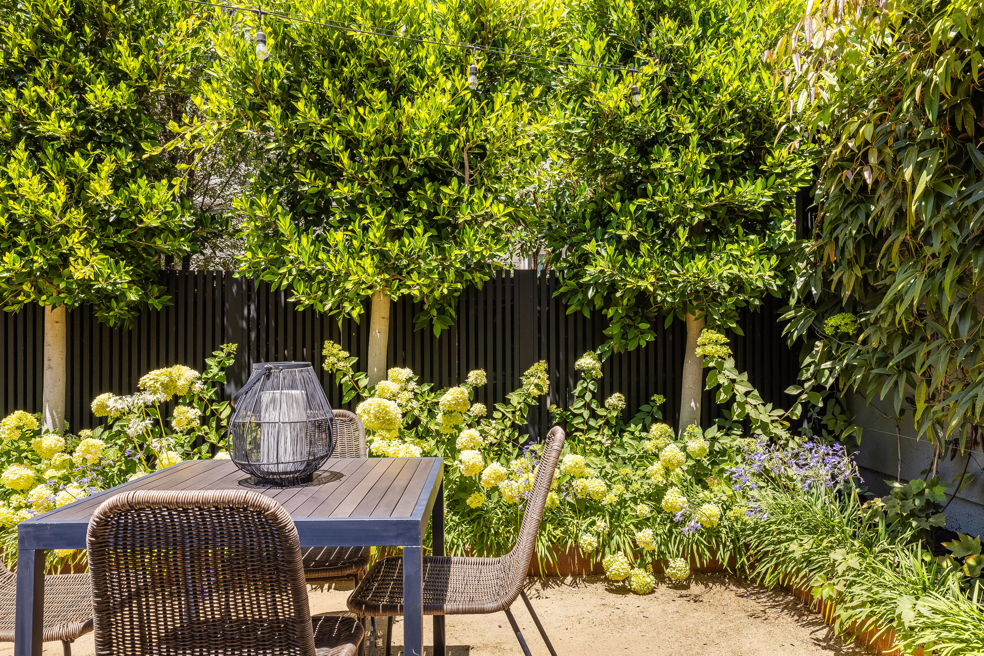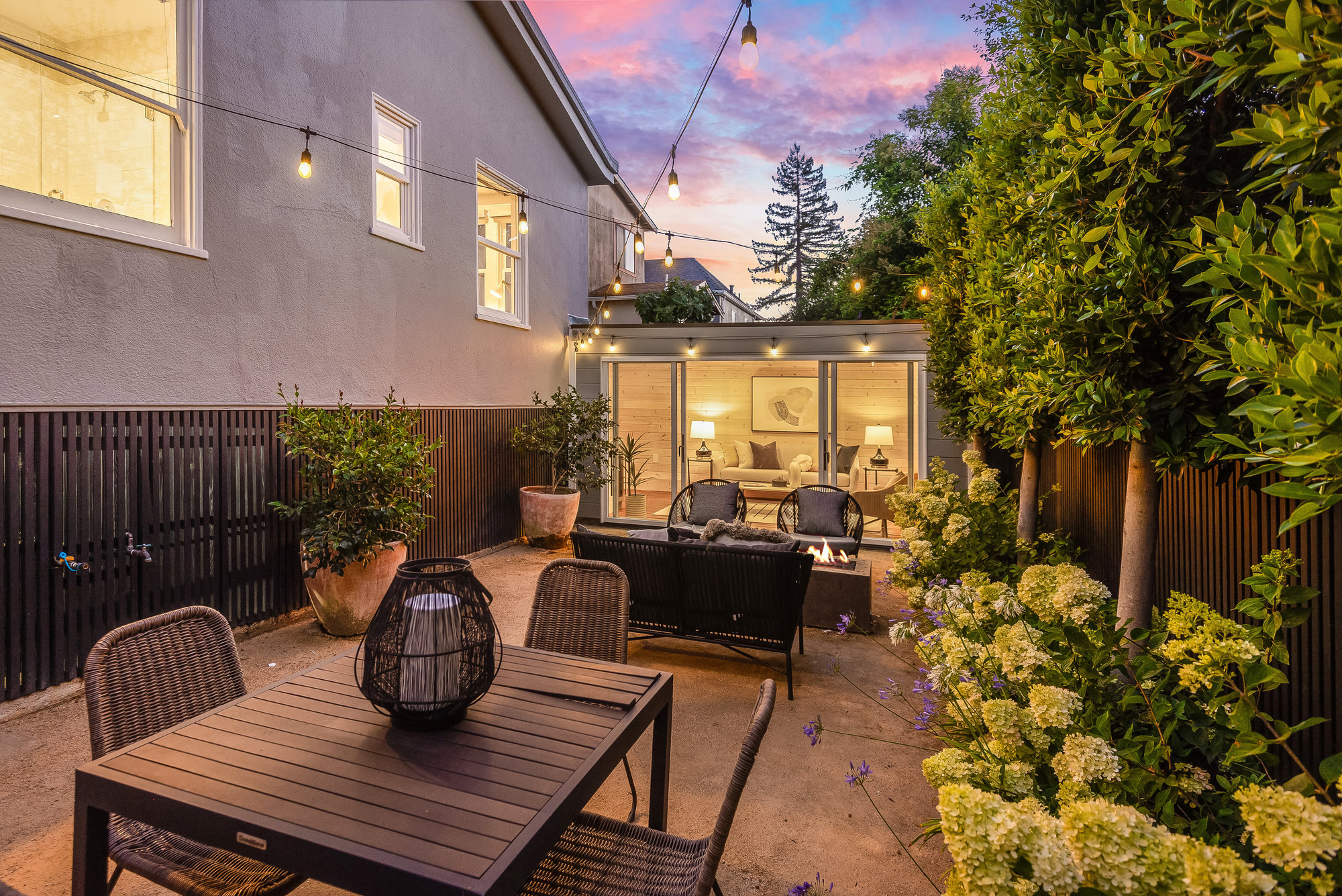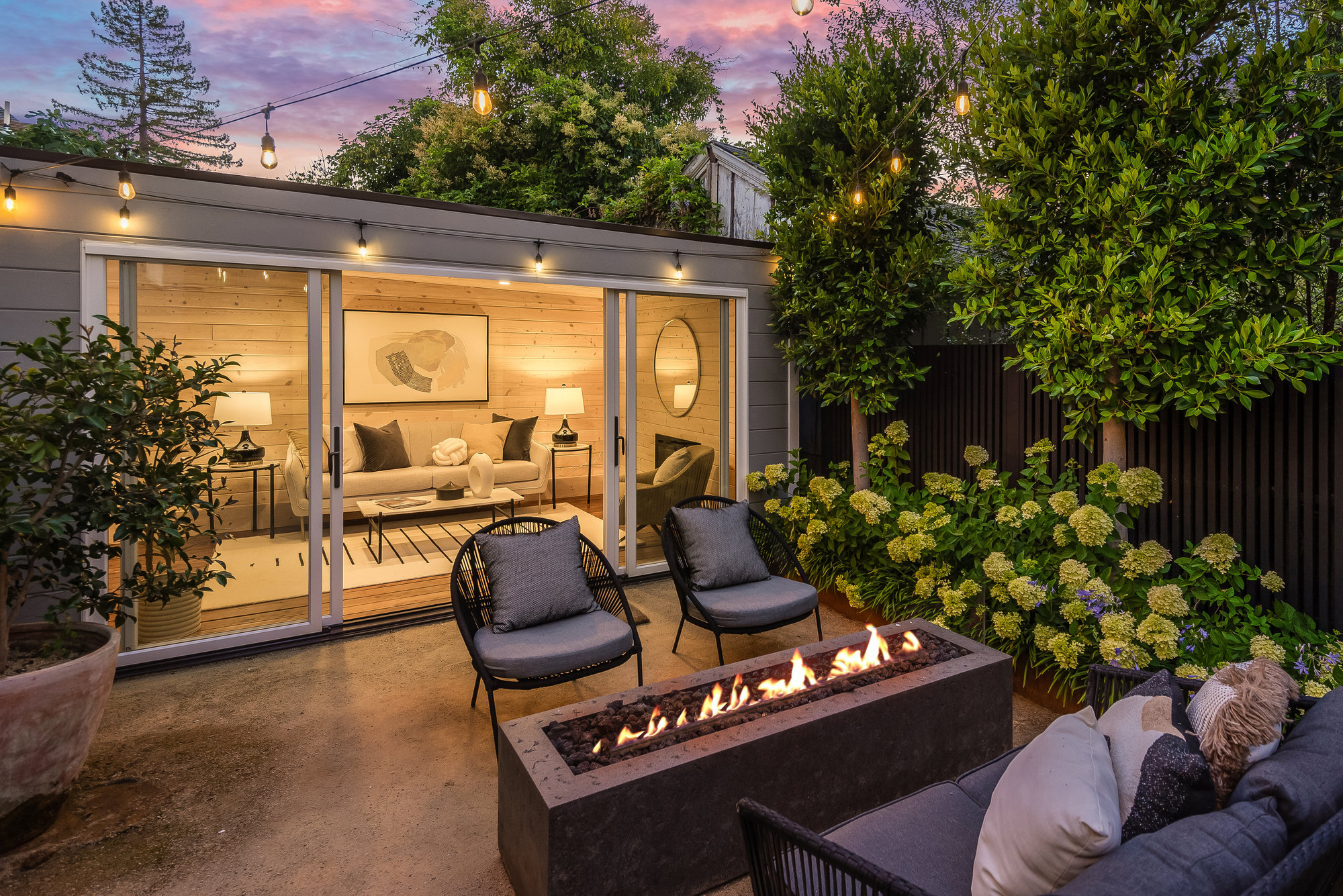 — Elegant rear gardens with plumbed fire pit