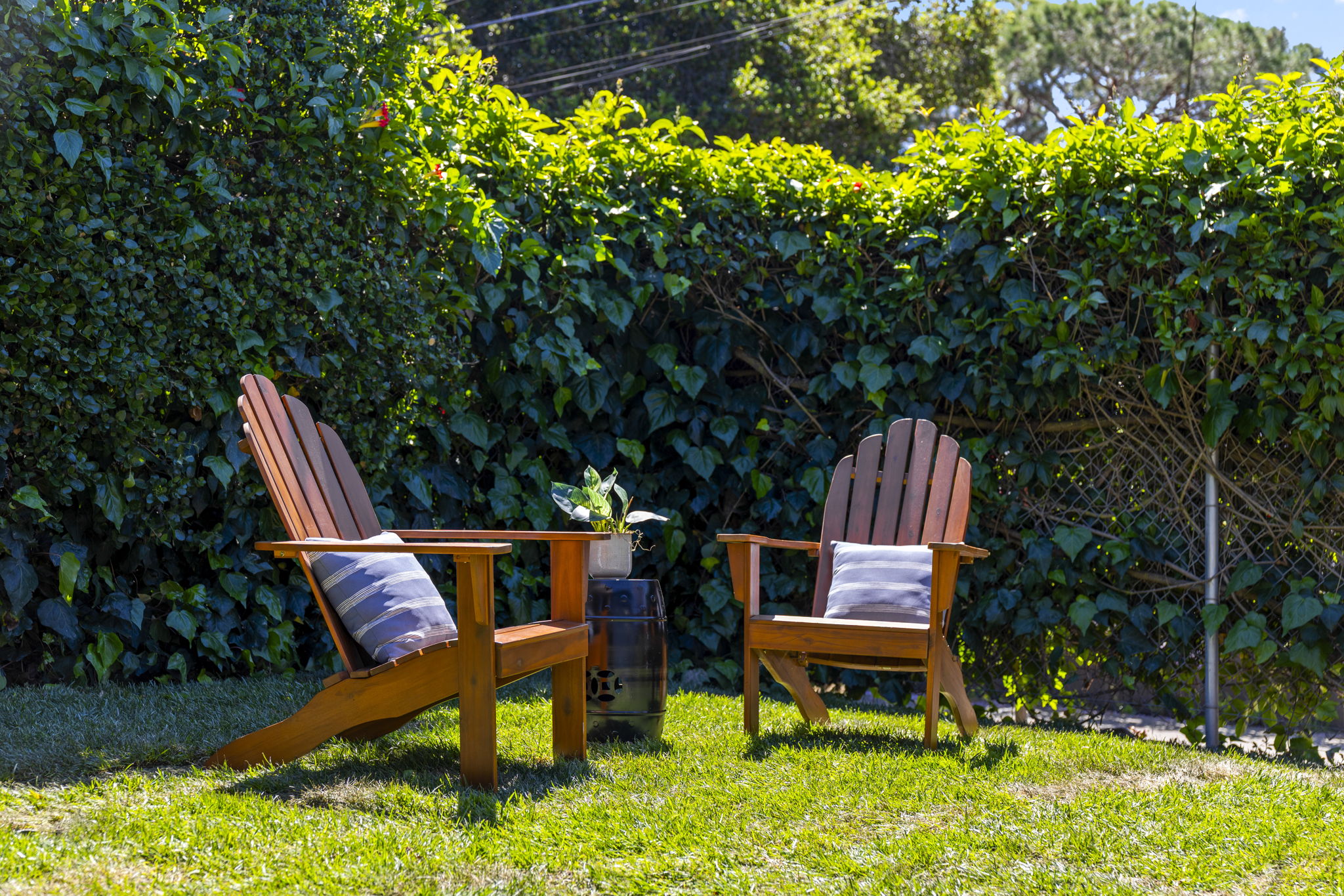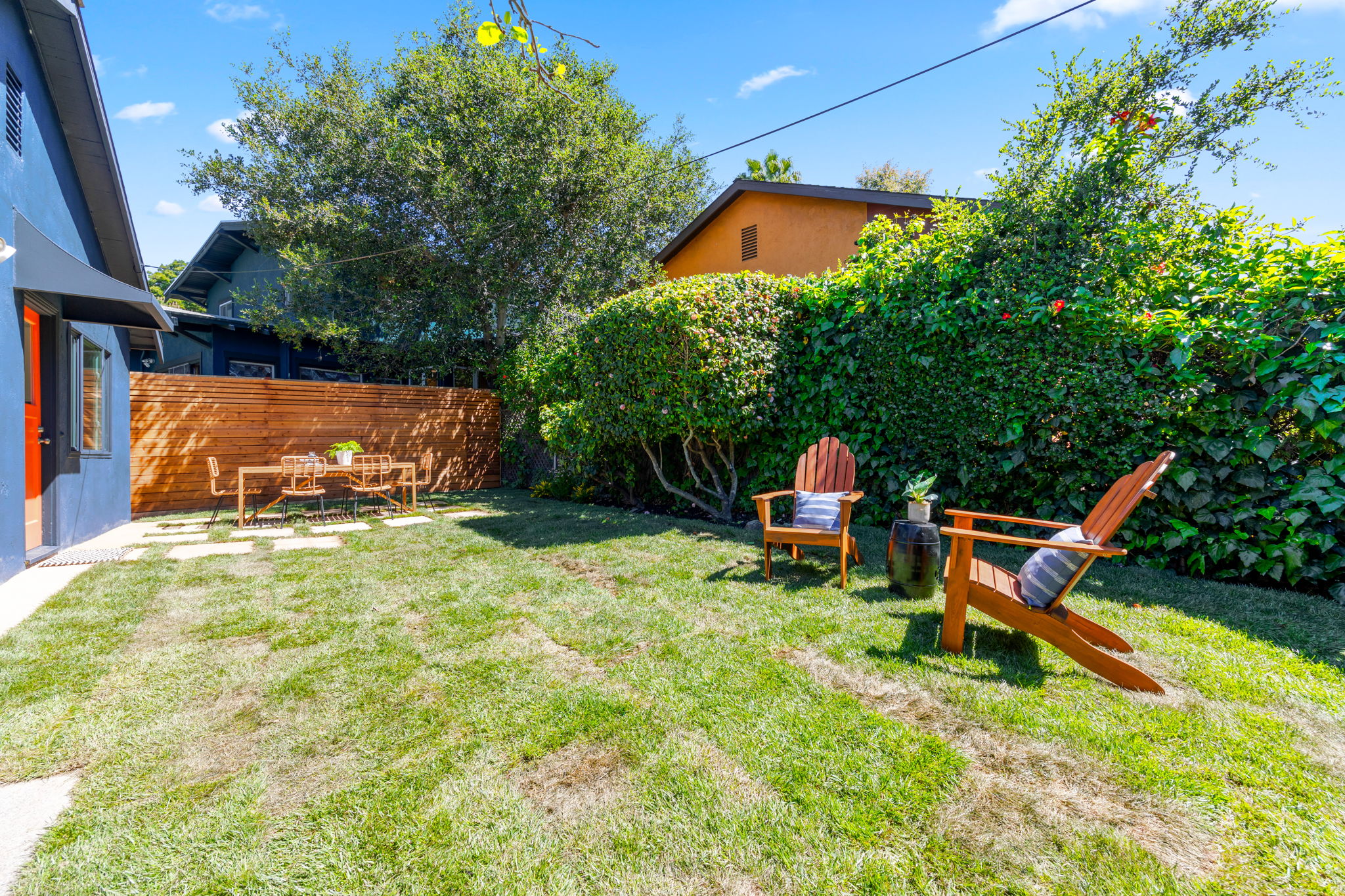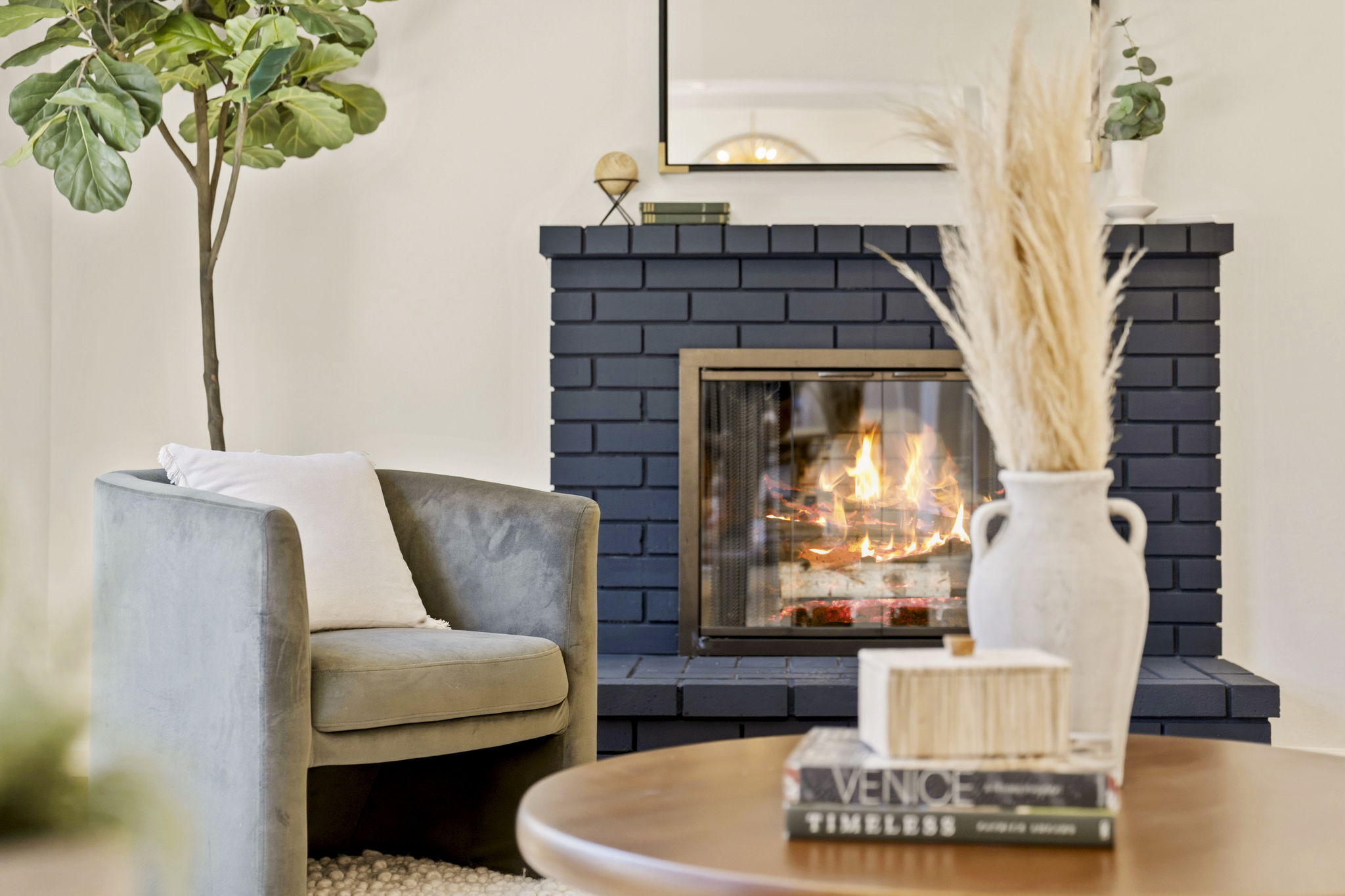 The home’s single-level floor plan is both generous and gracious, with light-filled living and dining rooms that flow effortlessly and reward easy, elegant living. A wood-burning fireplace anchors the living room, while custom lighting throughout lends a refined, curated atmosphere. The recently renovated kitchen is a study in thoughtful design — quartz countertops, a center island, earth-tone cabinetry, stainless appliances, and a striking blue glaze horizontal tile backsplash that brings both warmth and modernity to the space. Direct access from the kitchen leads to a private rear patio and lush yard, ideal for alfresco entertaining or quiet evening retreats.
