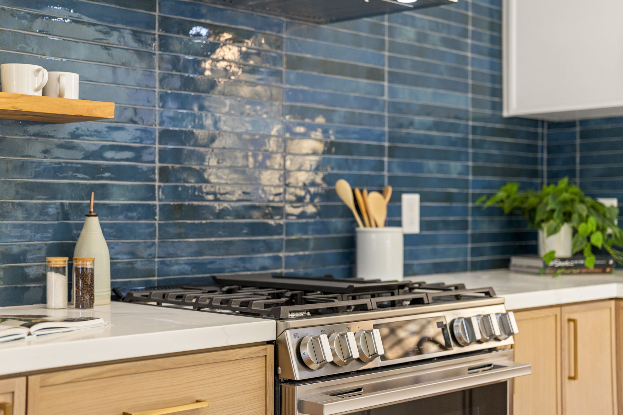 ● Renovated Kitchen with Quartz Counters, Center Island & Blue Glaze Tile Backsplash
