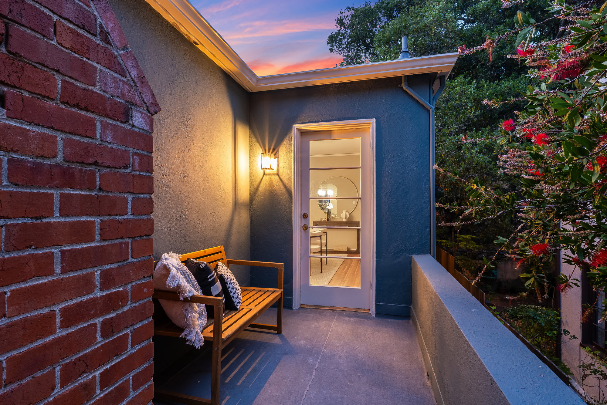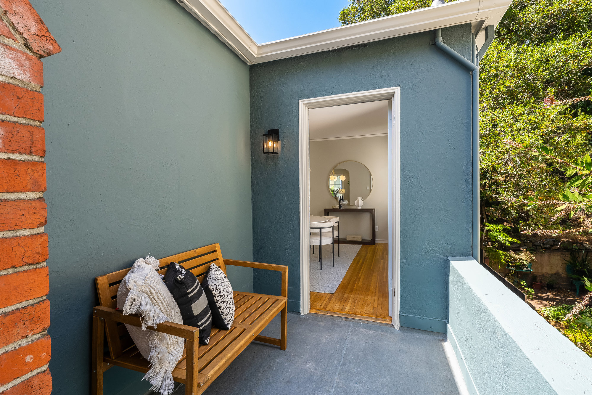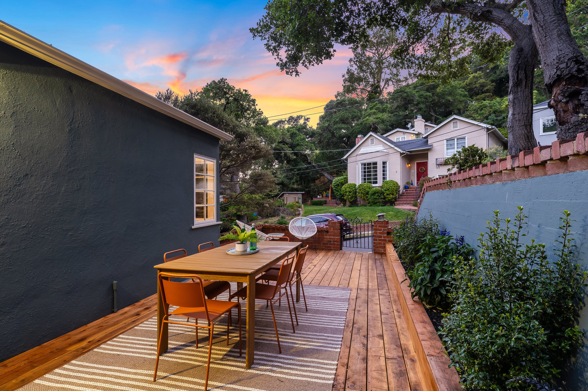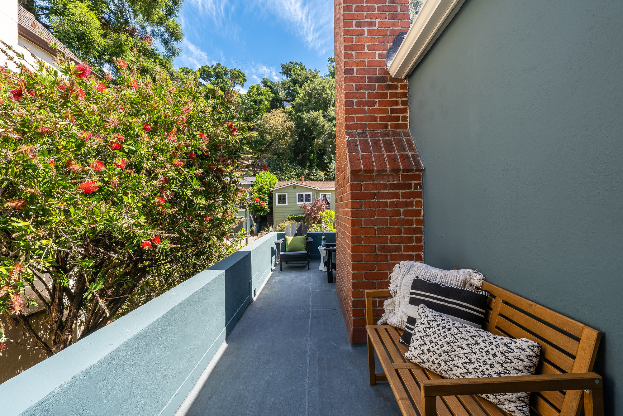 Tucked on a quiet cul-de-sac off Trestle Glen Road, this Crocker Highlands home offers privacy, mature landscaping, and a seamless indoor-outdoor lifestyle. Multiple patios, balconies, and garden pathways create a peaceful backdrop for both entertaining and everyday living. The main level features a light-filled living room with recessed lighting, a wood-burning fireplace, and garden views. The dining room is framed by designer lighting and opens directly to a private balcony. The updated kitchen includes stone countertops and backsplash, stainless steel appliances, a gas range, and a center island with breakfast bar. An eat-in dining area connects to the rear patio and gardens for effortless flow. Three bedrooms offer versatility. A main-level en suite features an updated bath with designer tile, matte gold fixtures, and modern vanity. The second bedroom is near the hall bath, which blends vintage tile with updated wallpaper for a fresh take on tradition.