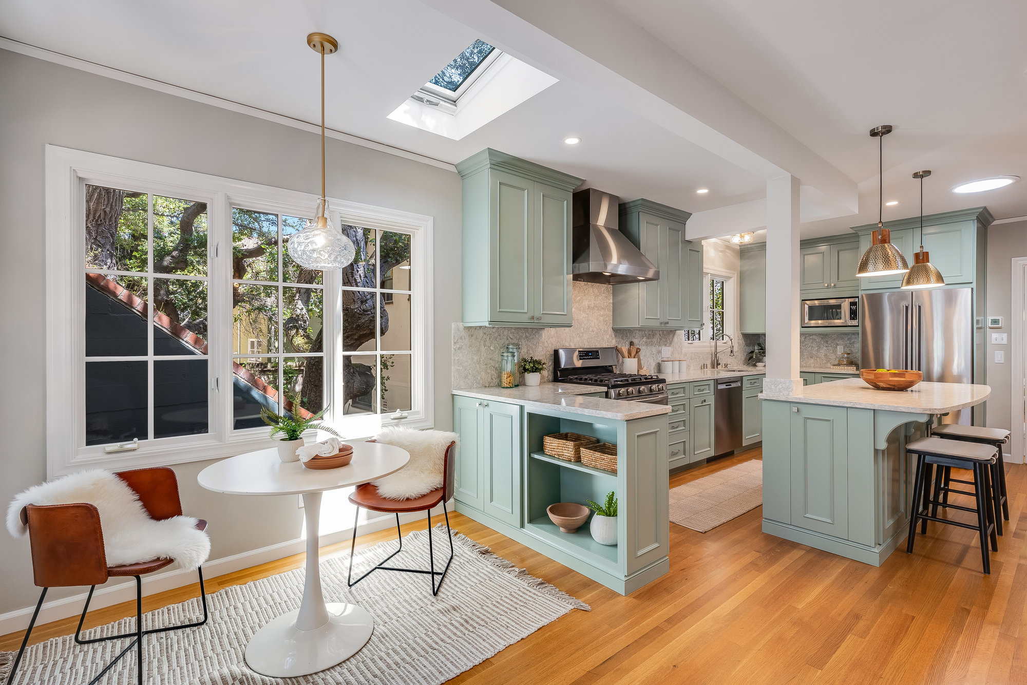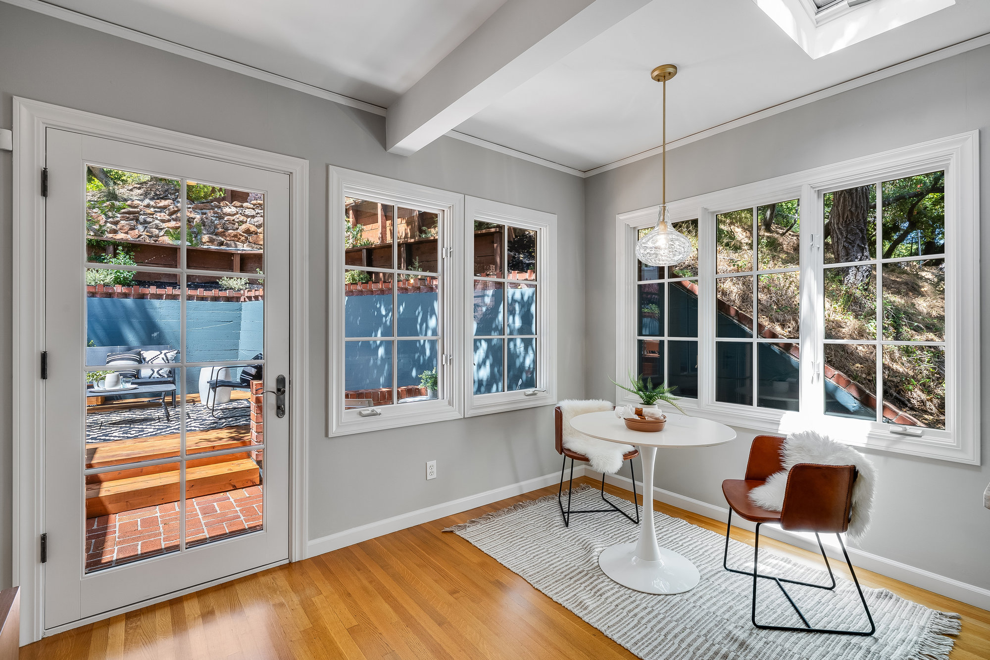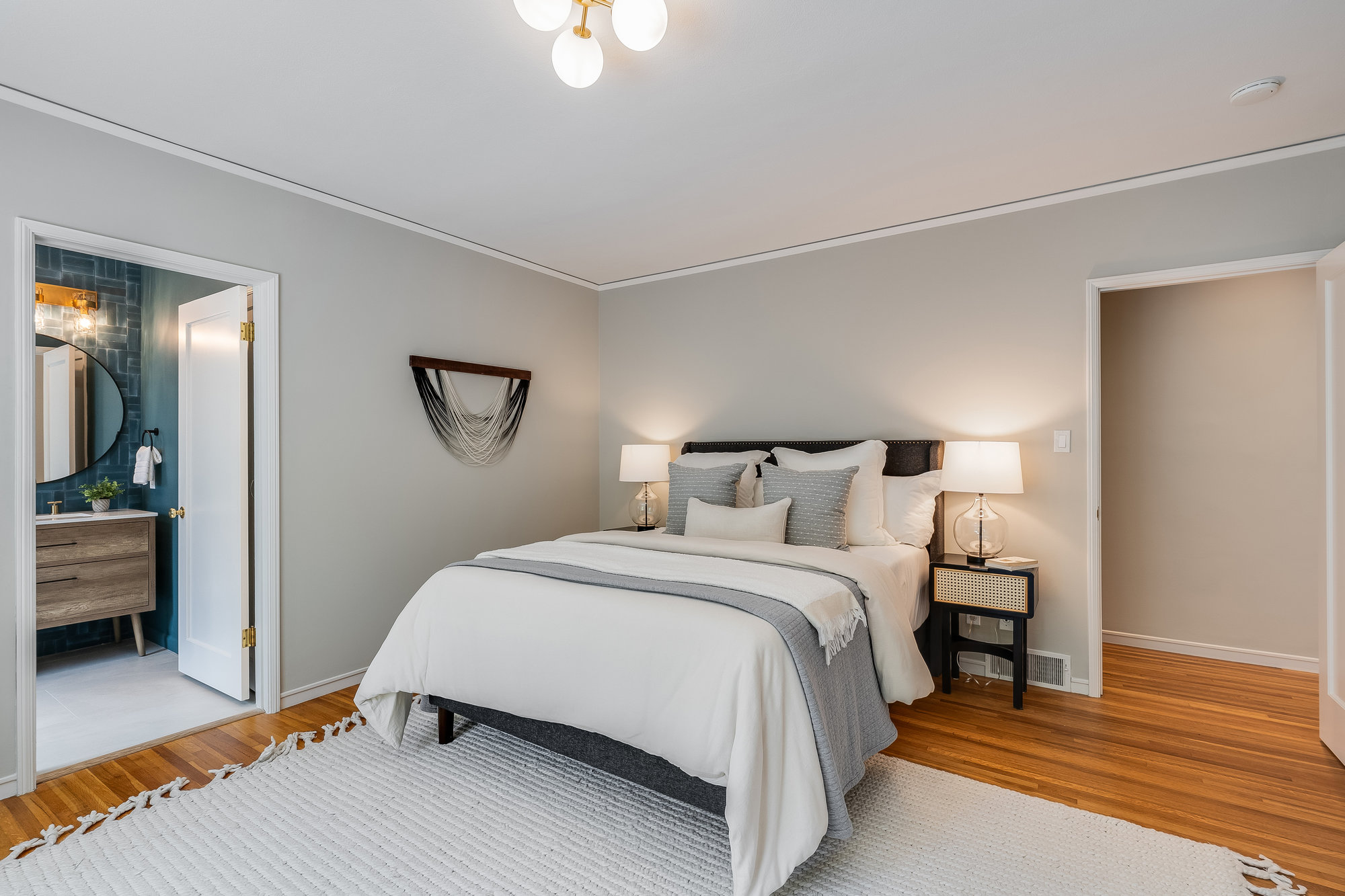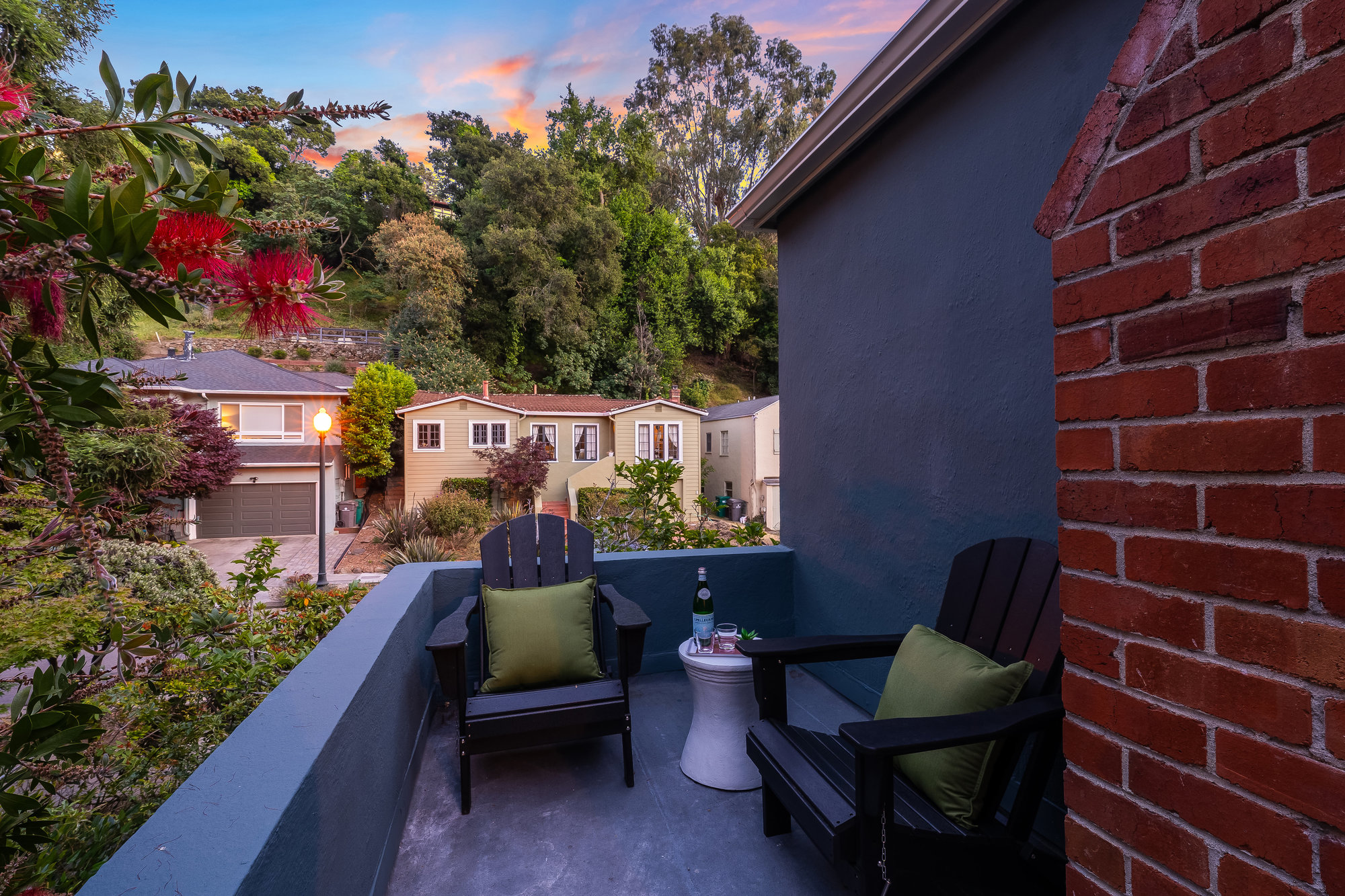 Tucked on a quiet cul-de-sac off Trestle Glen Road, this Crocker Highlands home offers privacy, mature landscaping, and a seamless indoor-outdoor lifestyle. Multiple patios, balconies, and garden pathways create a peaceful backdrop for both entertaining and everyday living. The main level features a light-filled living room with recessed lighting, a wood-burning fireplace, and garden views. The dining room is framed by designer lighting and opens directly to a private balcony. The updated kitchen includes stone countertops and backsplash, stainless steel appliances, a gas range, and a center island with breakfast bar. An eat-in dining area connects to the rear patio and gardens for effortless flow. Three bedrooms offer versatility. A main-level en suite features an updated bath with designer tile, matte gold fixtures, and modern vanity. The second bedroom is near the hall bath, which blends vintage tile with updated wallpaper for a fresh take on tradition.