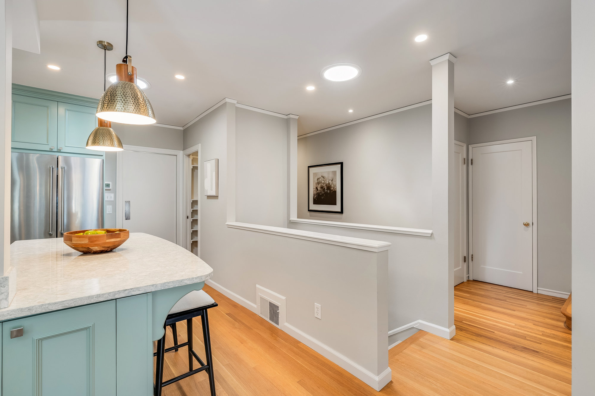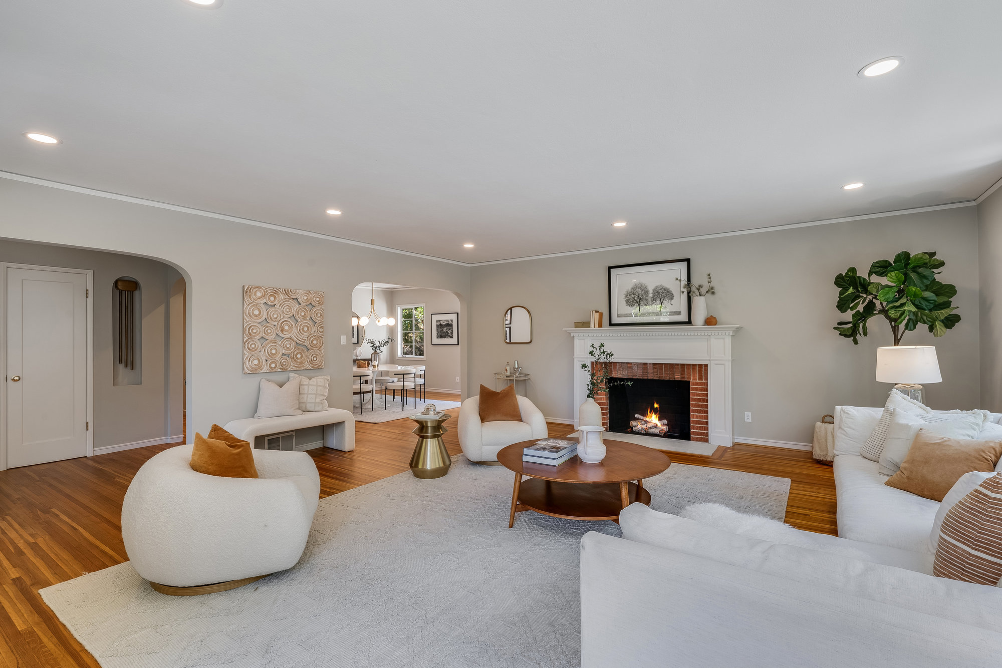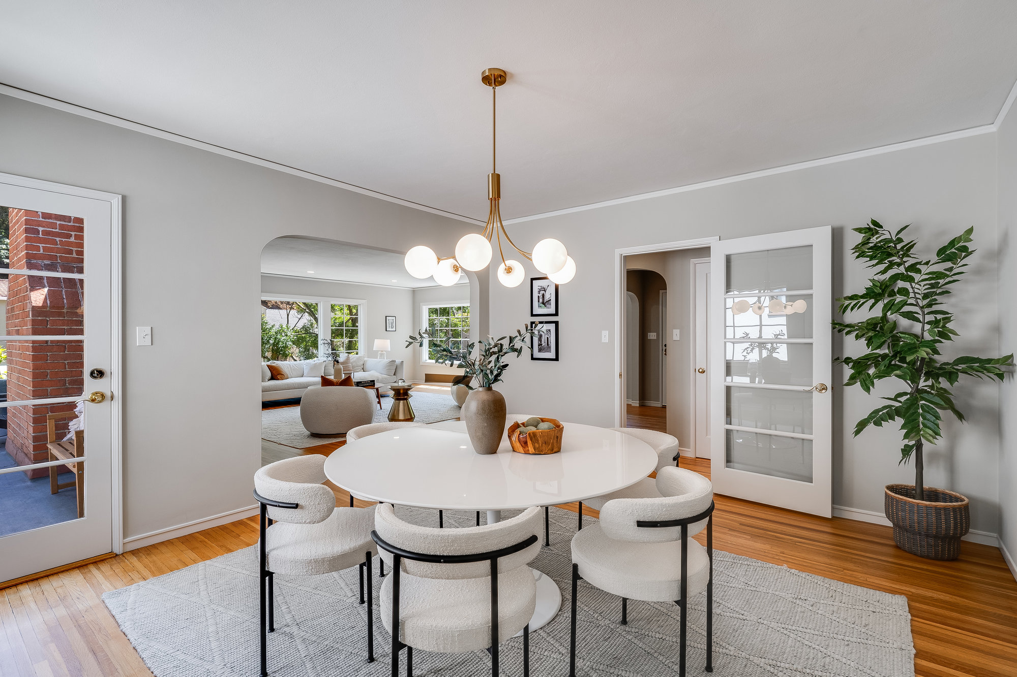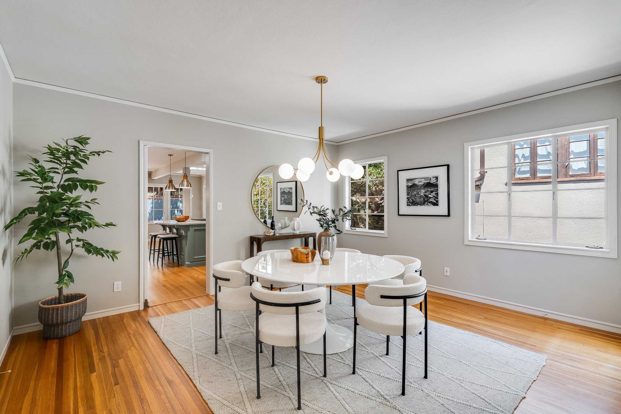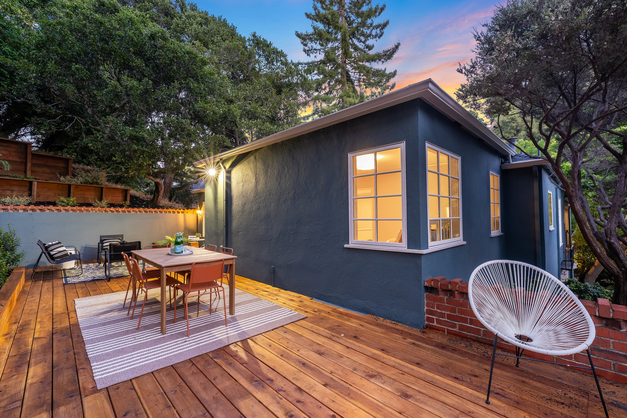 Tucked on a quiet cul-de-sac off Trestle Glen Road, this Crocker Highlands home offers privacy, mature landscaping, and a seamless indoor-outdoor lifestyle. Multiple patios, balconies, and garden pathways create a peaceful backdrop for both entertaining and everyday living. The main level features a light-filled living room with recessed lighting, a wood-burning fireplace, and garden views. The dining room is framed by designer lighting and opens directly to a private balcony. The updated kitchen includes stone countertops and backsplash, stainless steel appliances, a gas range, and a center island with breakfast bar. An eat-in dining area connects to the rear patio and gardens for effortless flow. Three bedrooms offer versatility. A main-level en suite features an updated bath with designer tile, matte gold fixtures, and modern vanity. The second bedroom is near the hall bath, which blends vintage tile with updated wallpaper for a fresh take on tradition.