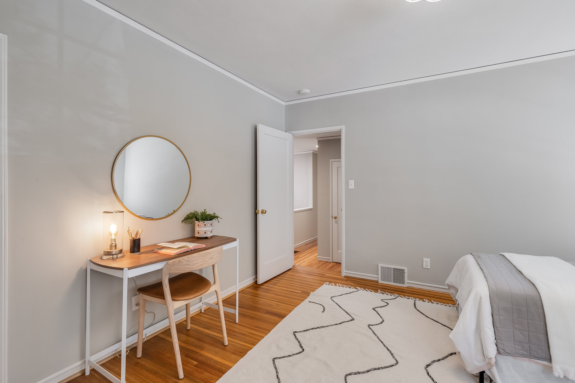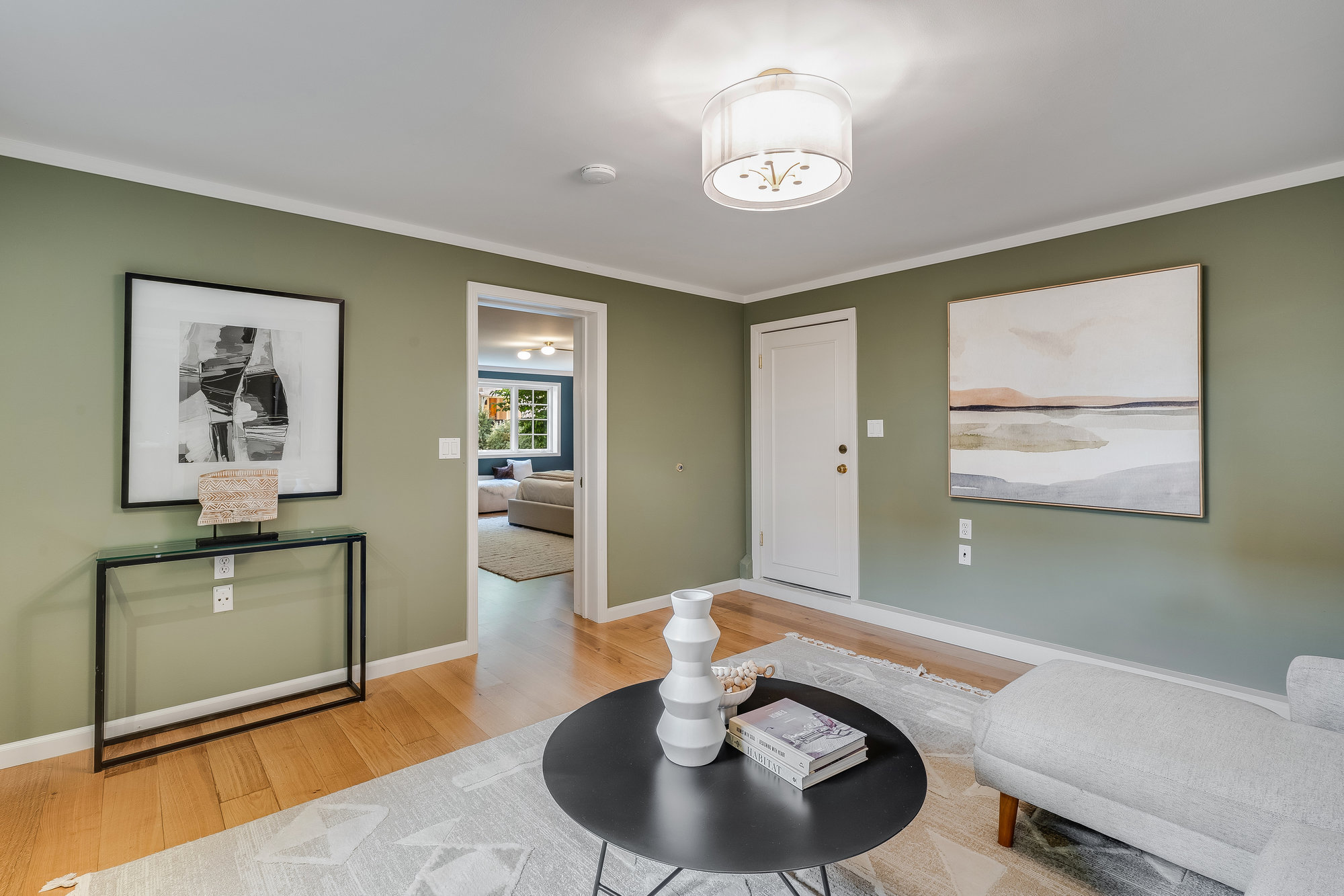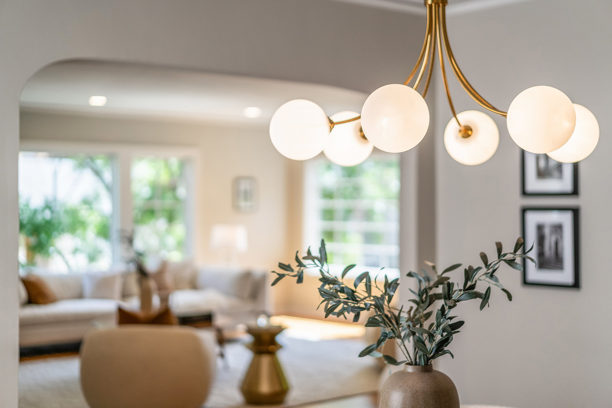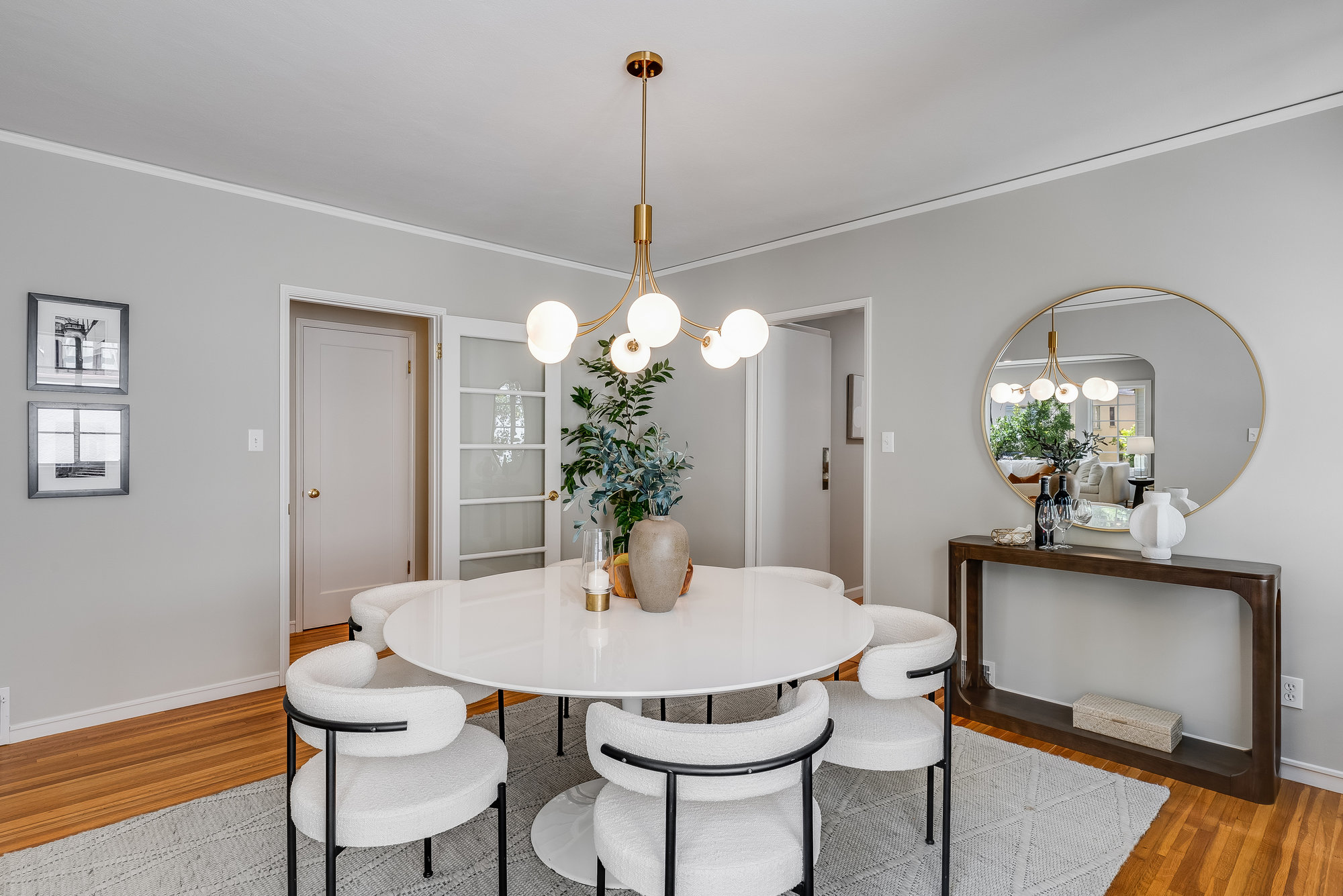 Tucked on a quiet cul-de-sac off Trestle Glen Road, this Crocker Highlands home offers privacy, mature landscaping, and a seamless indoor-outdoor lifestyle. Multiple patios, balconies, and garden pathways create a peaceful backdrop for both entertaining and everyday living. The main level features a light-filled living room with recessed lighting, a wood-burning fireplace, and garden views. The dining room is framed by designer lighting and opens directly to a private balcony. The updated kitchen includes stone countertops and backsplash, stainless steel appliances, a gas range, and a center island with breakfast bar. An eat-in dining area connects to the rear patio and gardens for effortless flow. Three bedrooms offer versatility. A main-level en suite features an updated bath with designer tile, matte gold fixtures, and modern vanity. The second bedroom is near the hall bath, which blends vintage tile with updated wallpaper for a fresh take on tradition.