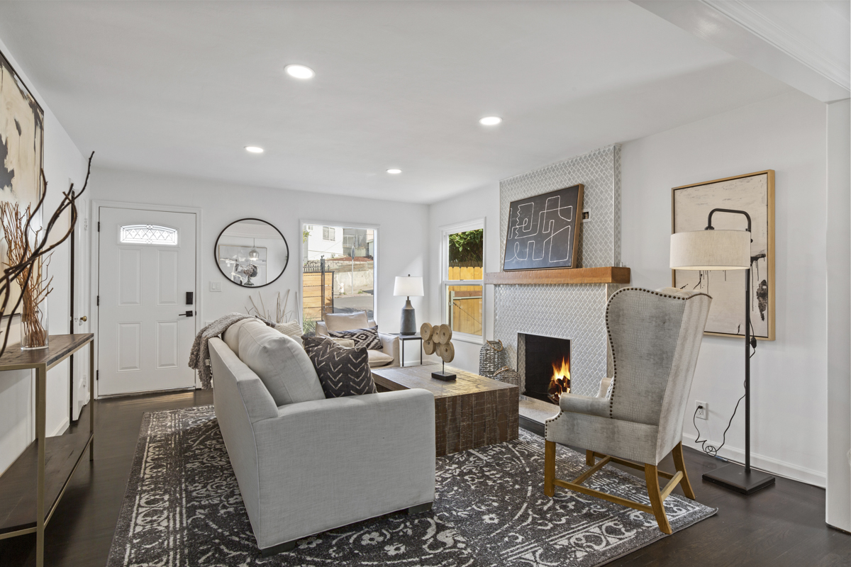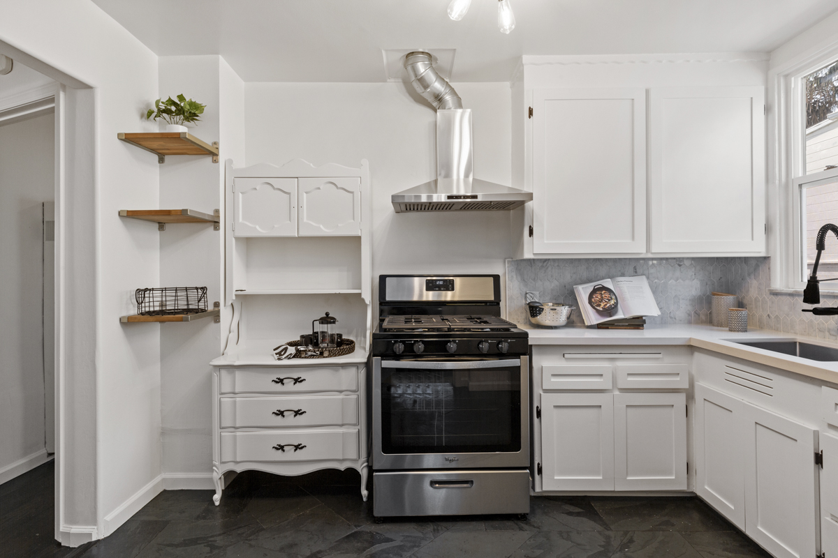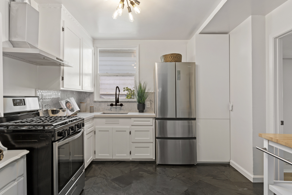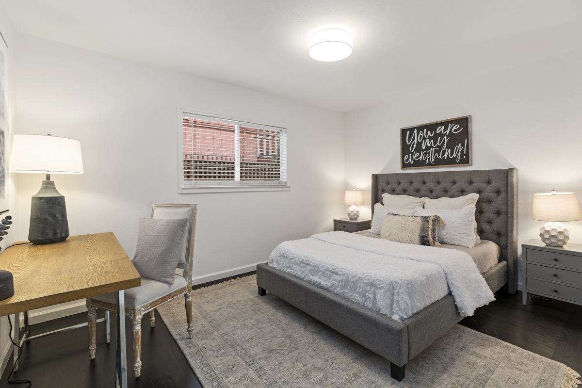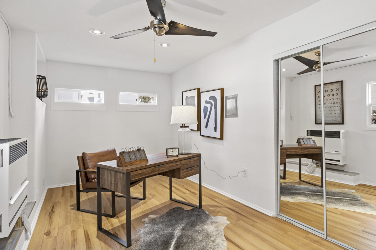 The front unit is a 950 square foot two+ bedroom, one bath unit that features an updated kitchen with new quartz countertops, stone tile backsplash, stainless steel appliances, stone floors, updated lighting throughout, refinished hardwood floors, tankless water heater, and updated bathroom. The garage has been converted into a third bedroom that could also be used as a home gym, office, or art studio.