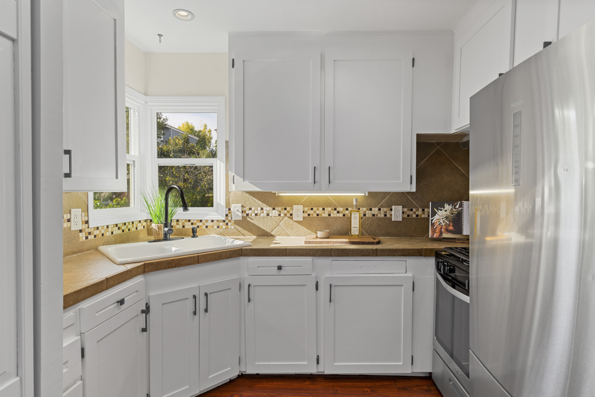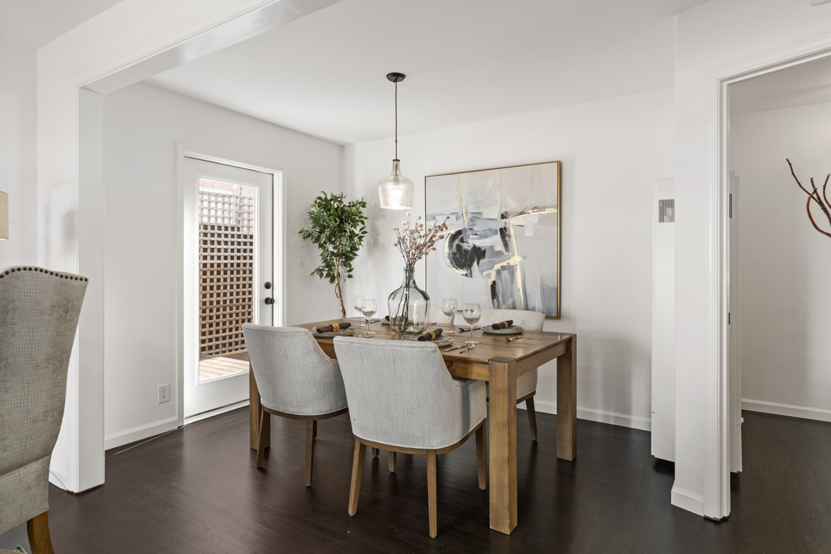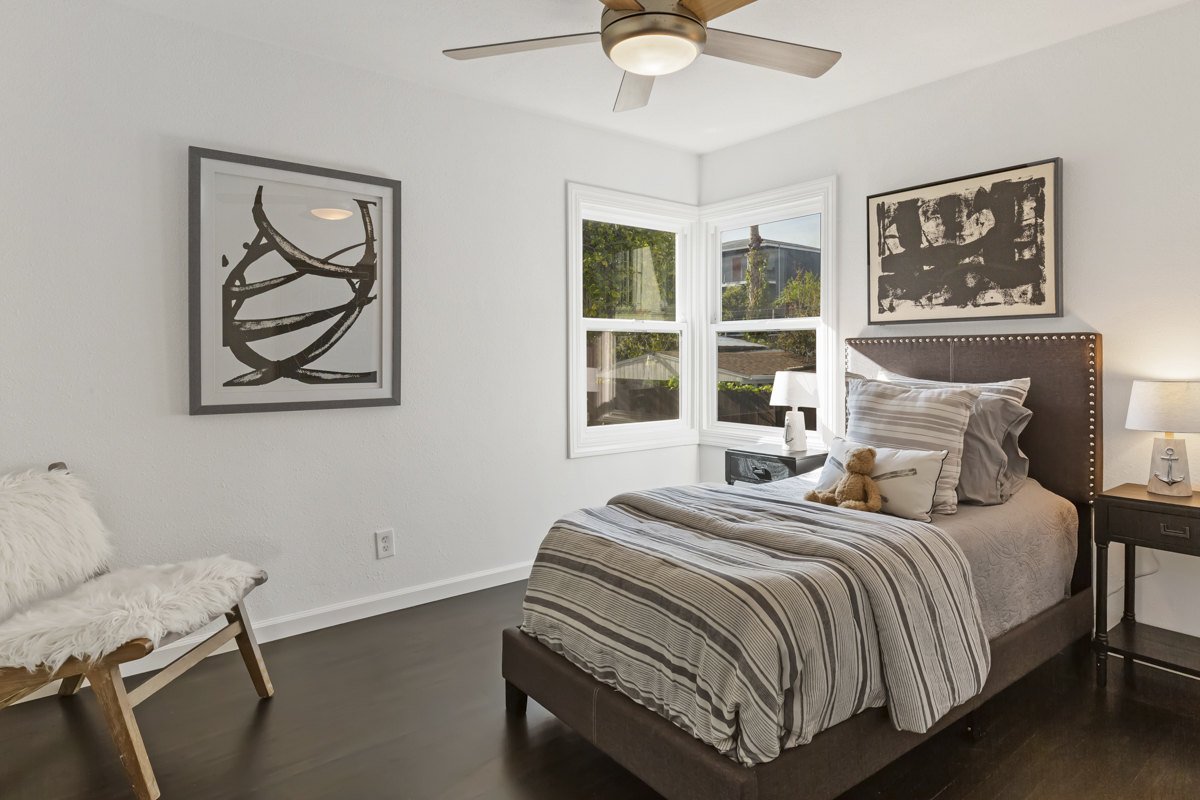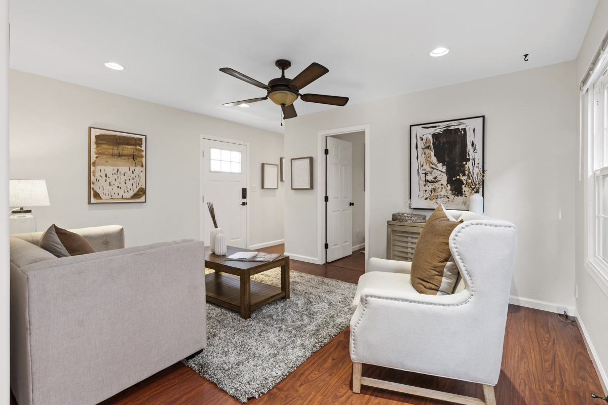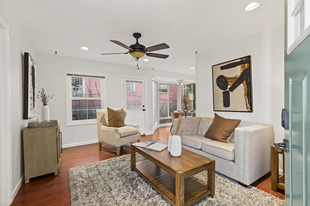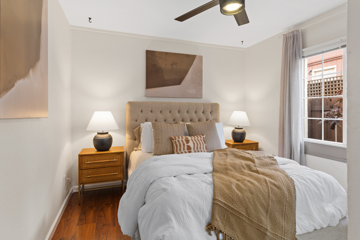 The front unit is a 950 square foot two+ bedroom, one bath unit that features an updated kitchen with new quartz countertops, stone tile backsplash, stainless steel appliances, stone floors, updated lighting throughout, refinished hardwood floors, tankless water heater, and updated bathroom. The garage has been converted into a third bedroom that could also be used as a home gym, office, or art studio.