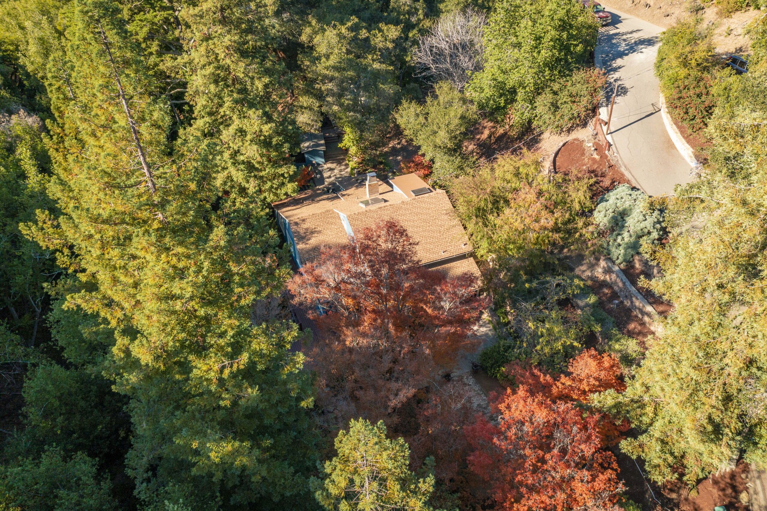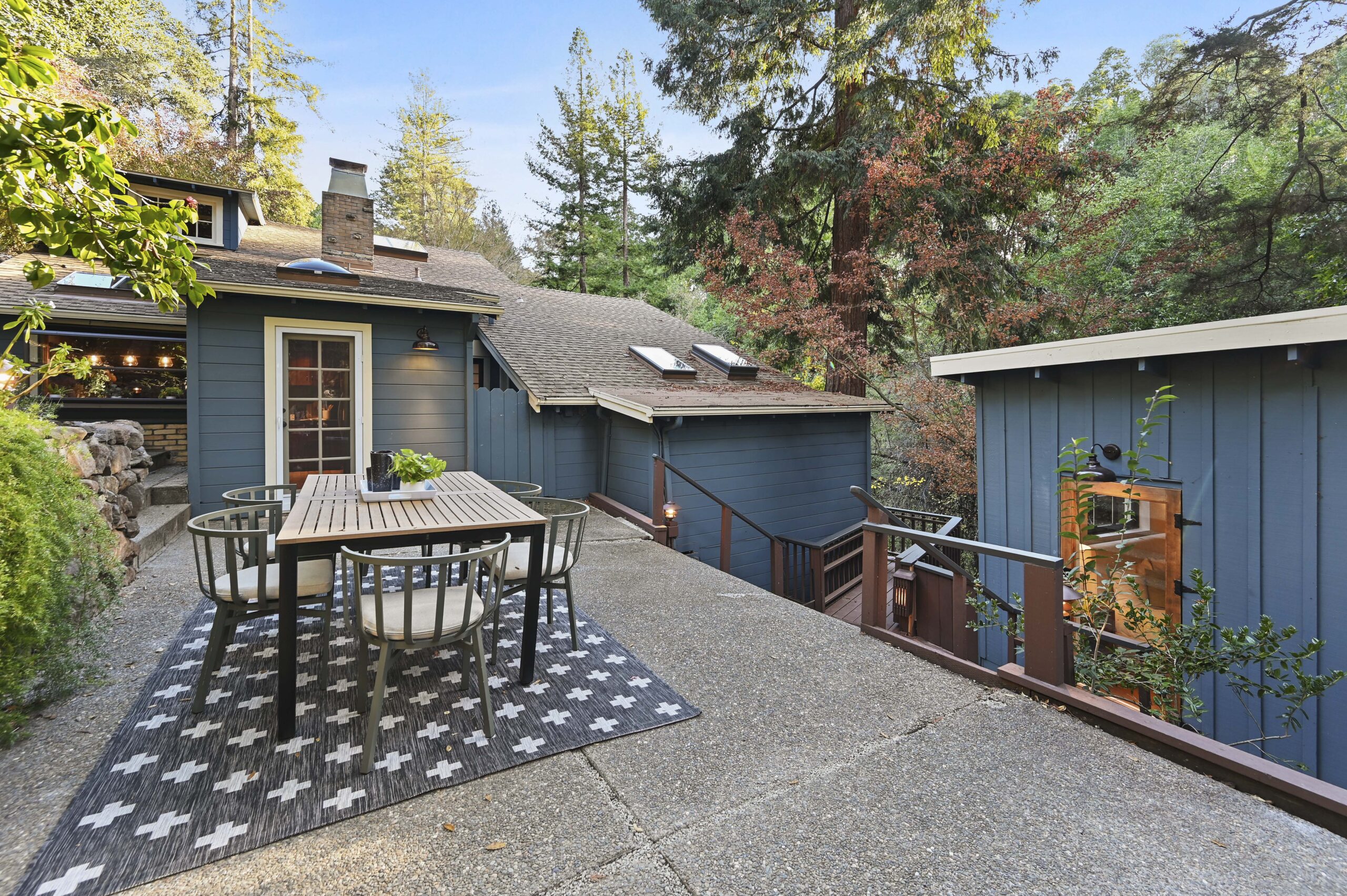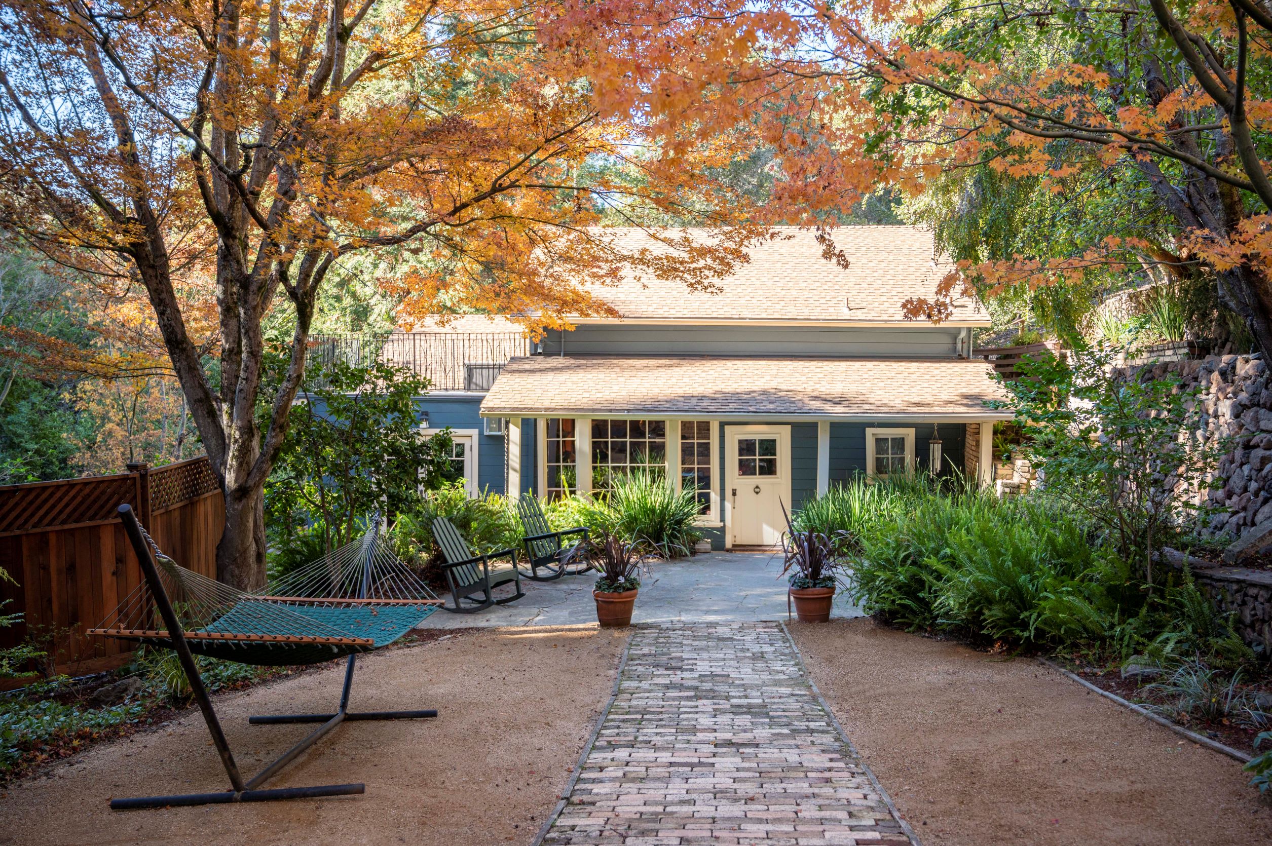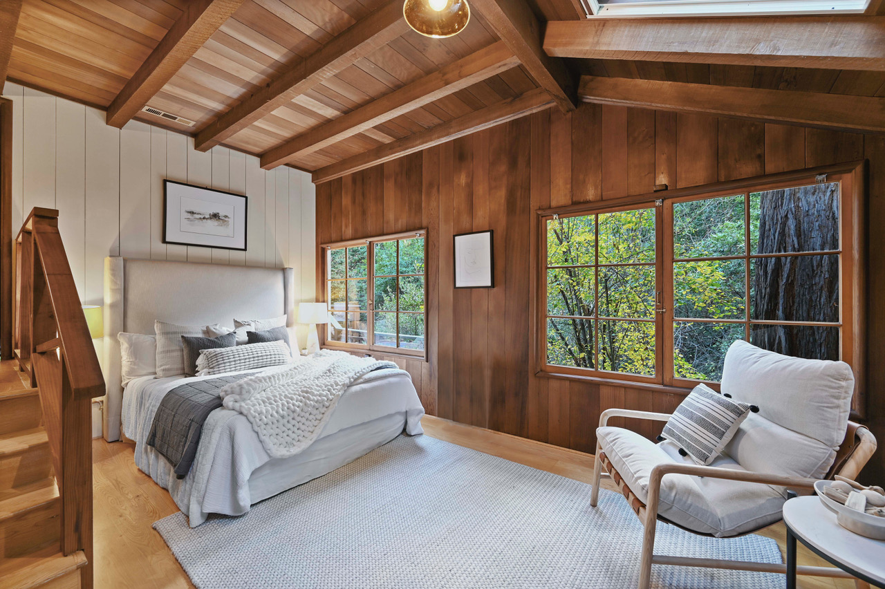 Much of the Heartwood Redwood used in the house was repurposed from the original scout cabins of Camp Dimond (1919-1948) that formally used this same land and adds to the home’s natural nostalgia. The chef’s kitchen is a delight with a tranquil combination of original redwood cabinets, Fireclay backsplash tiles, silestone suede quartz counters, and gourmet stainless appliances, a perfect blend of rustic beauty with modern convenience. The cozy primary suite is positioned in its own corner of the home looking out over the wooded lands and offers two large walk-in closets with custom built-in storage, and a stunning bathroom featuring earth tone tiles, redwood tansu style cabinets, a deep soaking tub, and shower. A peaceful loft space overlooking the great room is found upstairs lending itself perfectly as an office or den, and the adjacent upper-level bedroom opens onto a spacious rooftop deck overlooking the estate’s forested grounds. Adjacent to the house is a separate ADU studio with a full bath, kitchenette, and deck looking down on the meandering creek.