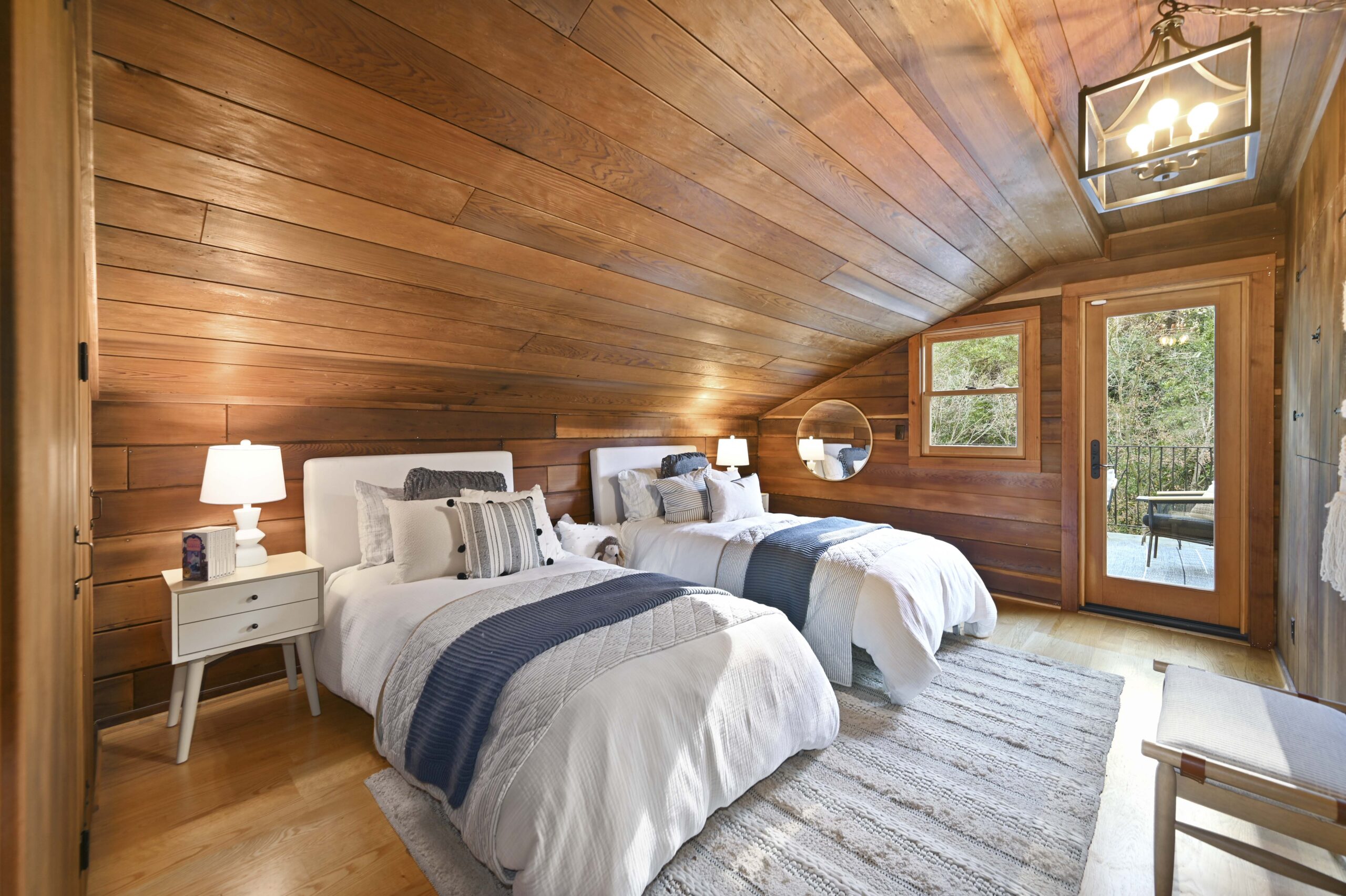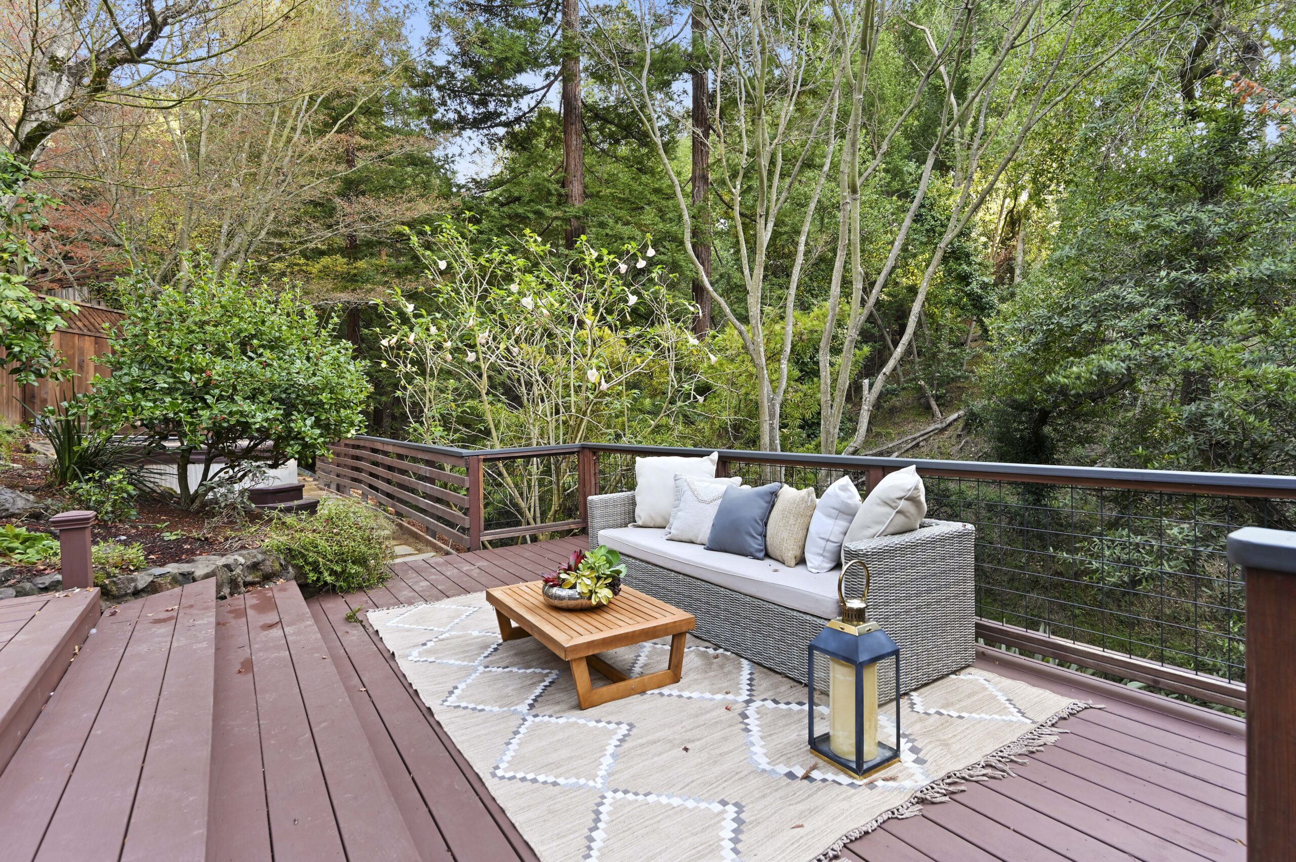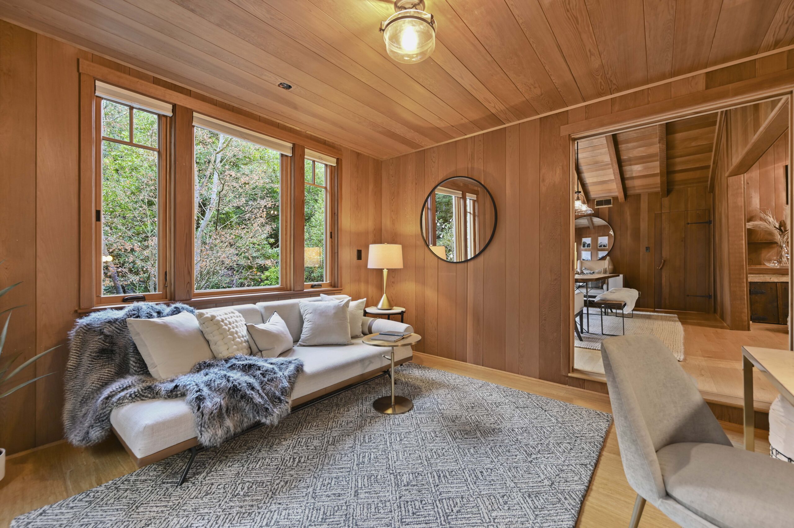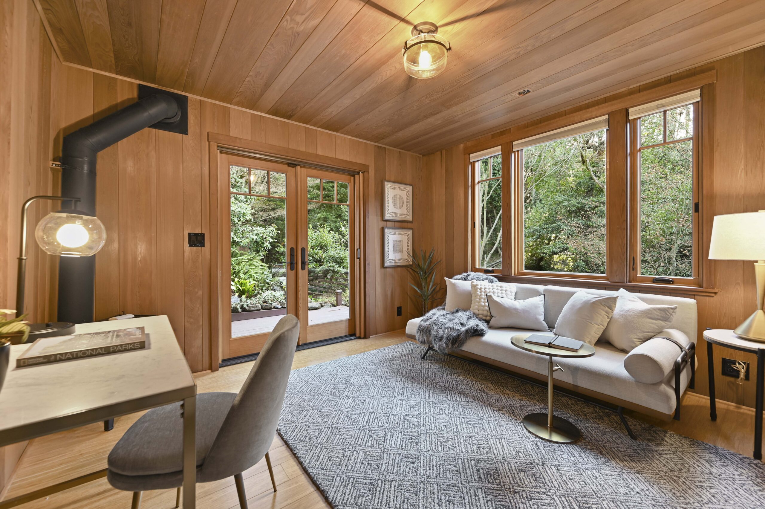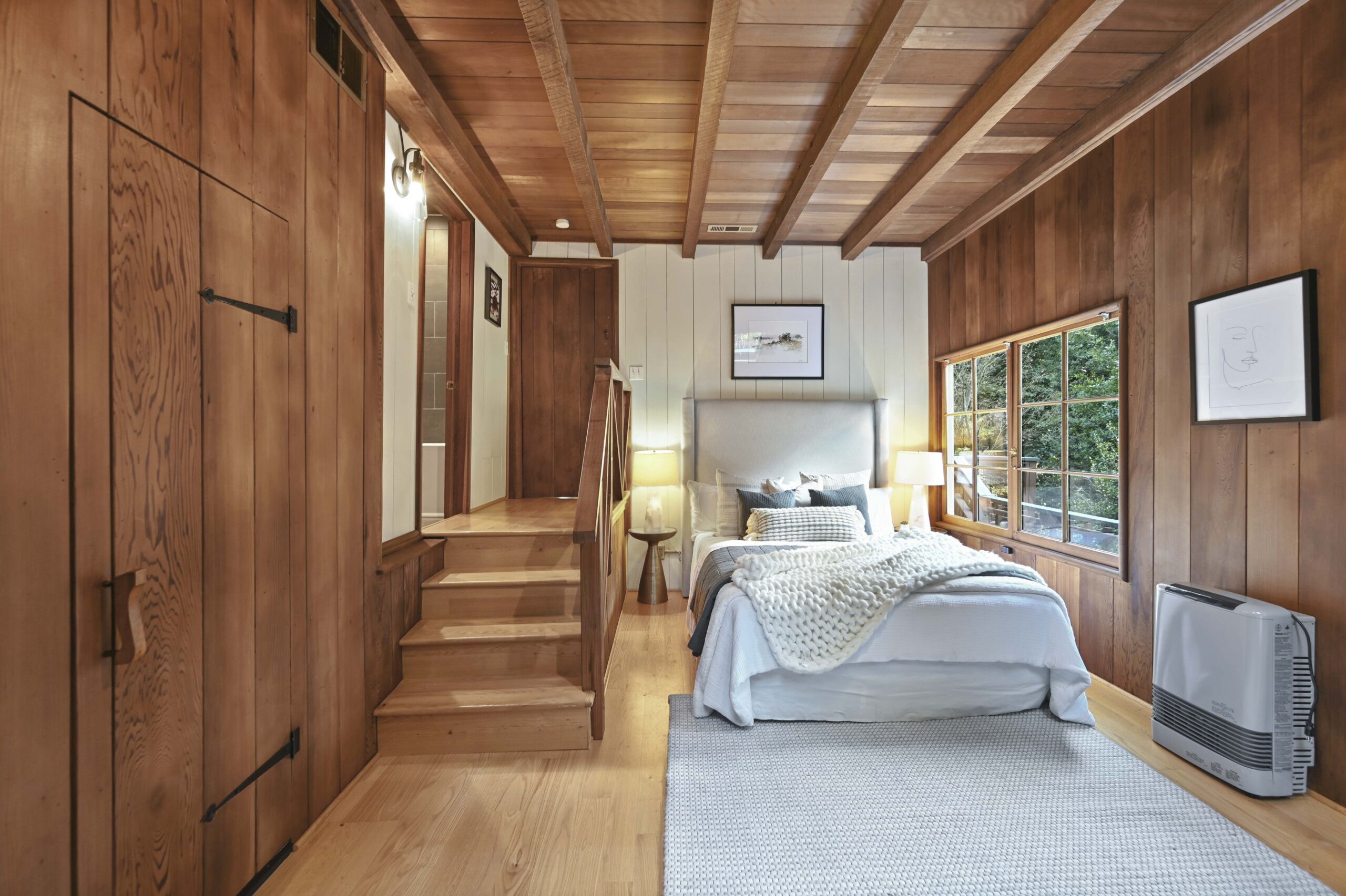 Much of the Heartwood Redwood used in the house was repurposed from the original scout cabins of Camp Dimond (1919-1948) that formally used this same land and adds to the home’s natural nostalgia. The chef’s kitchen is a delight with a tranquil combination of original redwood cabinets, Fireclay backsplash tiles, silestone suede quartz counters, and gourmet stainless appliances, a perfect blend of rustic beauty with modern convenience. The cozy primary suite is positioned in its own corner of the home looking out over the wooded lands and offers two large walk-in closets with custom built-in storage, and a stunning bathroom featuring earth tone tiles, redwood tansu style cabinets, a deep soaking tub, and shower. A peaceful loft space overlooking the great room is found upstairs lending itself perfectly as an office or den, and the adjacent upper-level bedroom opens onto a spacious rooftop deck overlooking the estate’s forested grounds. Adjacent to the house is a separate ADU studio with a full bath, kitchenette, and deck looking down on the meandering creek.