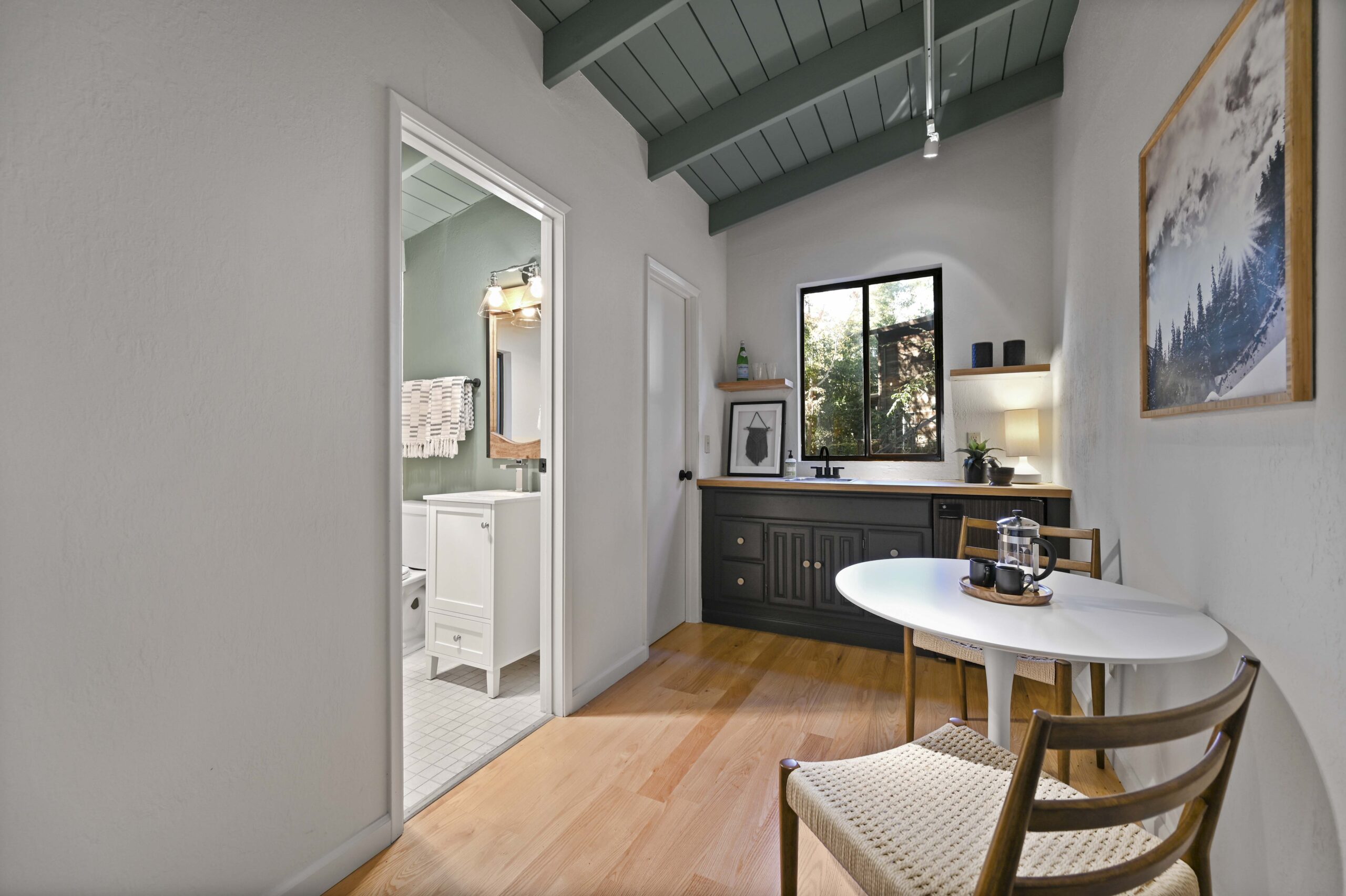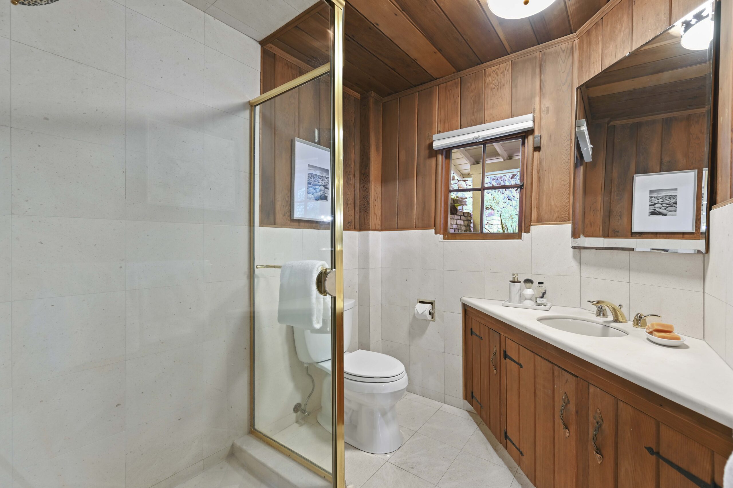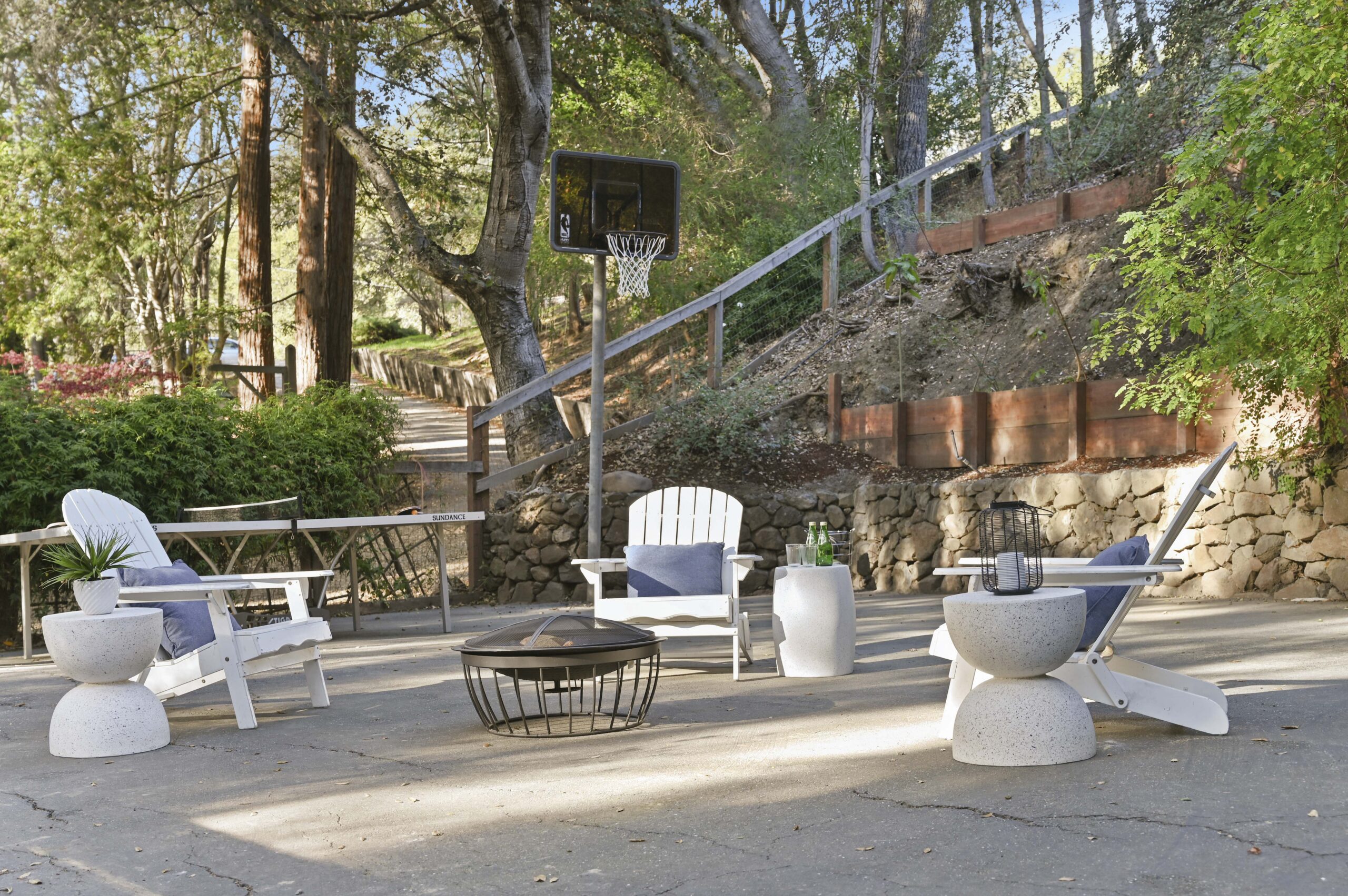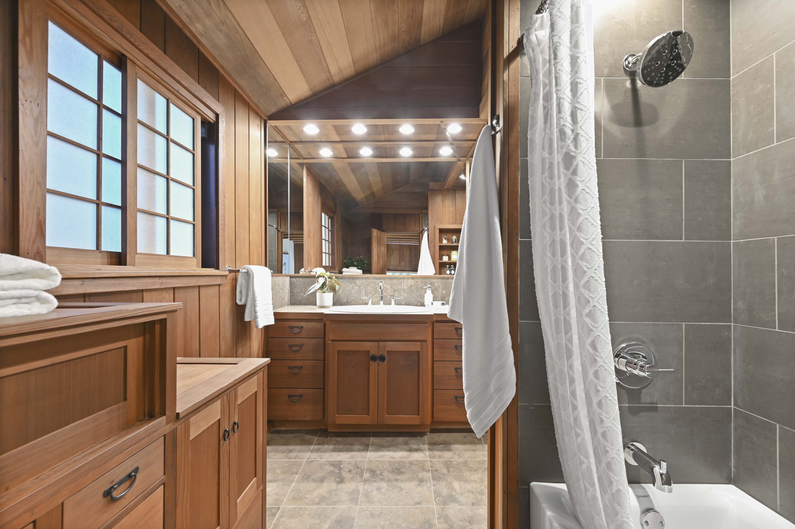 Much of the Heartwood Redwood used in the house was repurposed from the original scout cabins of Camp Dimond (1919-1948) that formally used this same land and adds to the home’s natural nostalgia. The chef’s kitchen is a delight with a tranquil combination of original redwood cabinets, Fireclay backsplash tiles, silestone suede quartz counters, and gourmet stainless appliances, a perfect blend of rustic beauty with modern convenience. The cozy primary suite is positioned in its own corner of the home looking out over the wooded lands and offers two large walk-in closets with custom built-in storage, and a stunning bathroom featuring earth tone tiles, redwood tansu style cabinets, a deep soaking tub, and shower. A peaceful loft space overlooking the great room is found upstairs lending itself perfectly as an office or den, and the adjacent upper-level bedroom opens onto a spacious rooftop deck overlooking the estate’s forested grounds. Adjacent to the house is a separate ADU studio with a full bath, kitchenette, and deck looking down on the meandering creek.