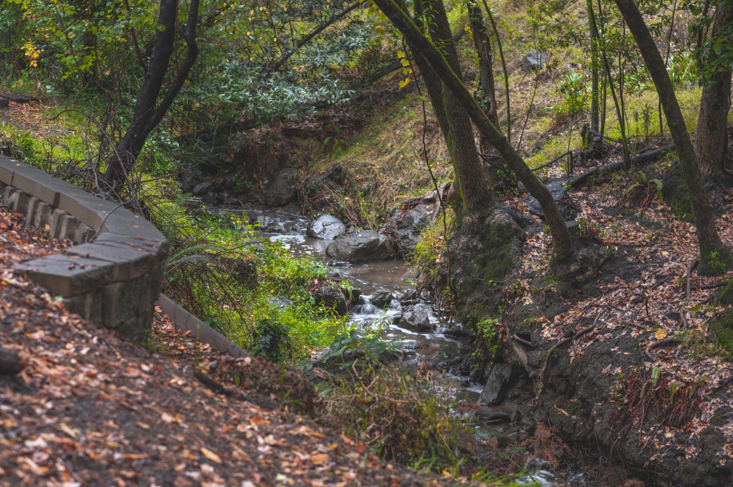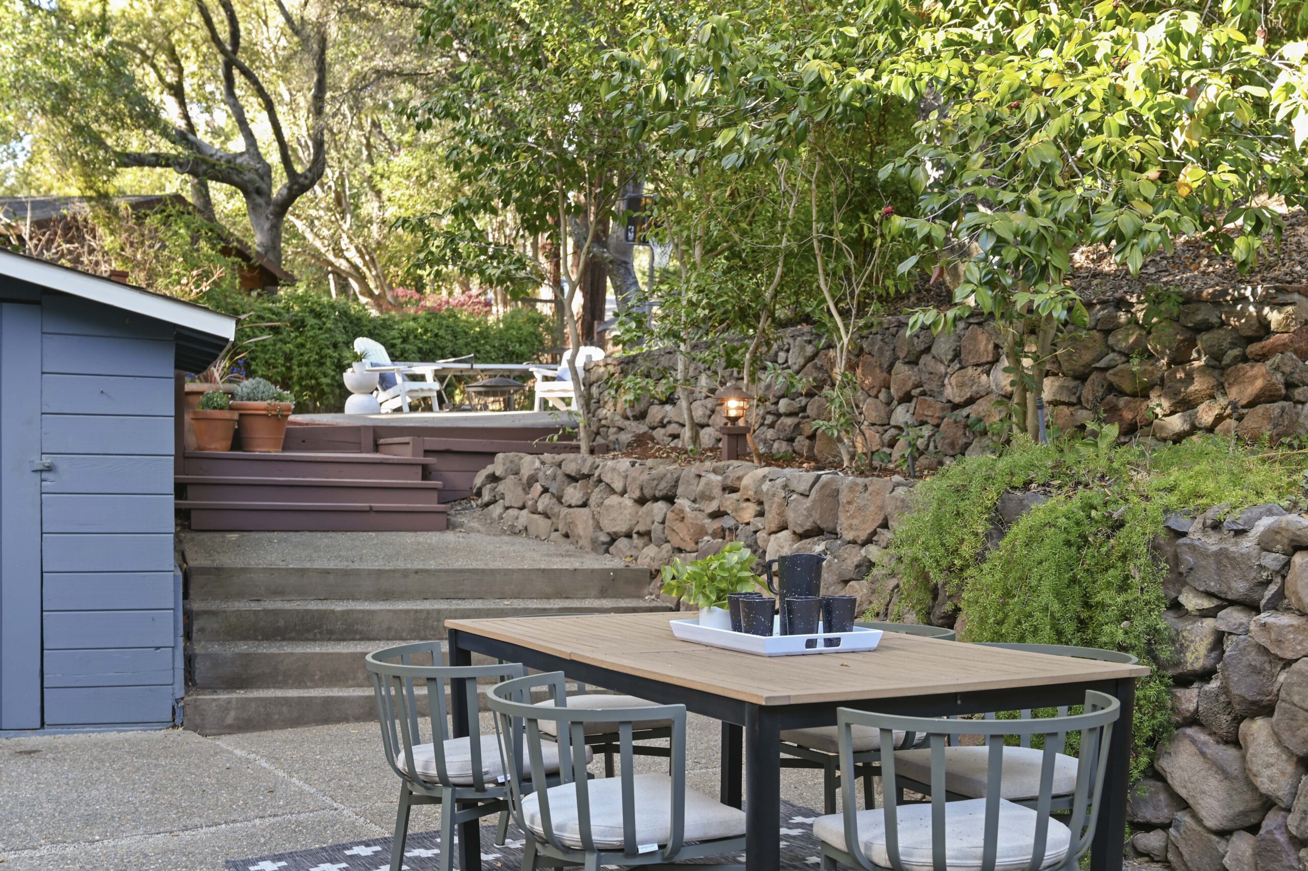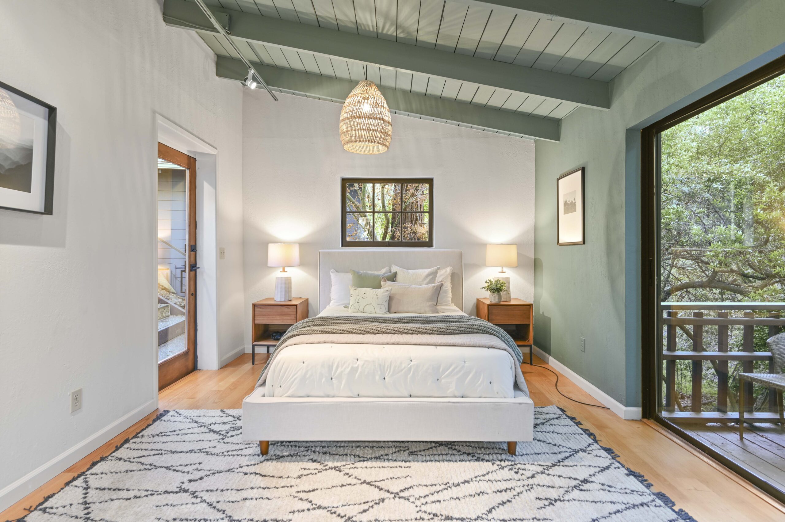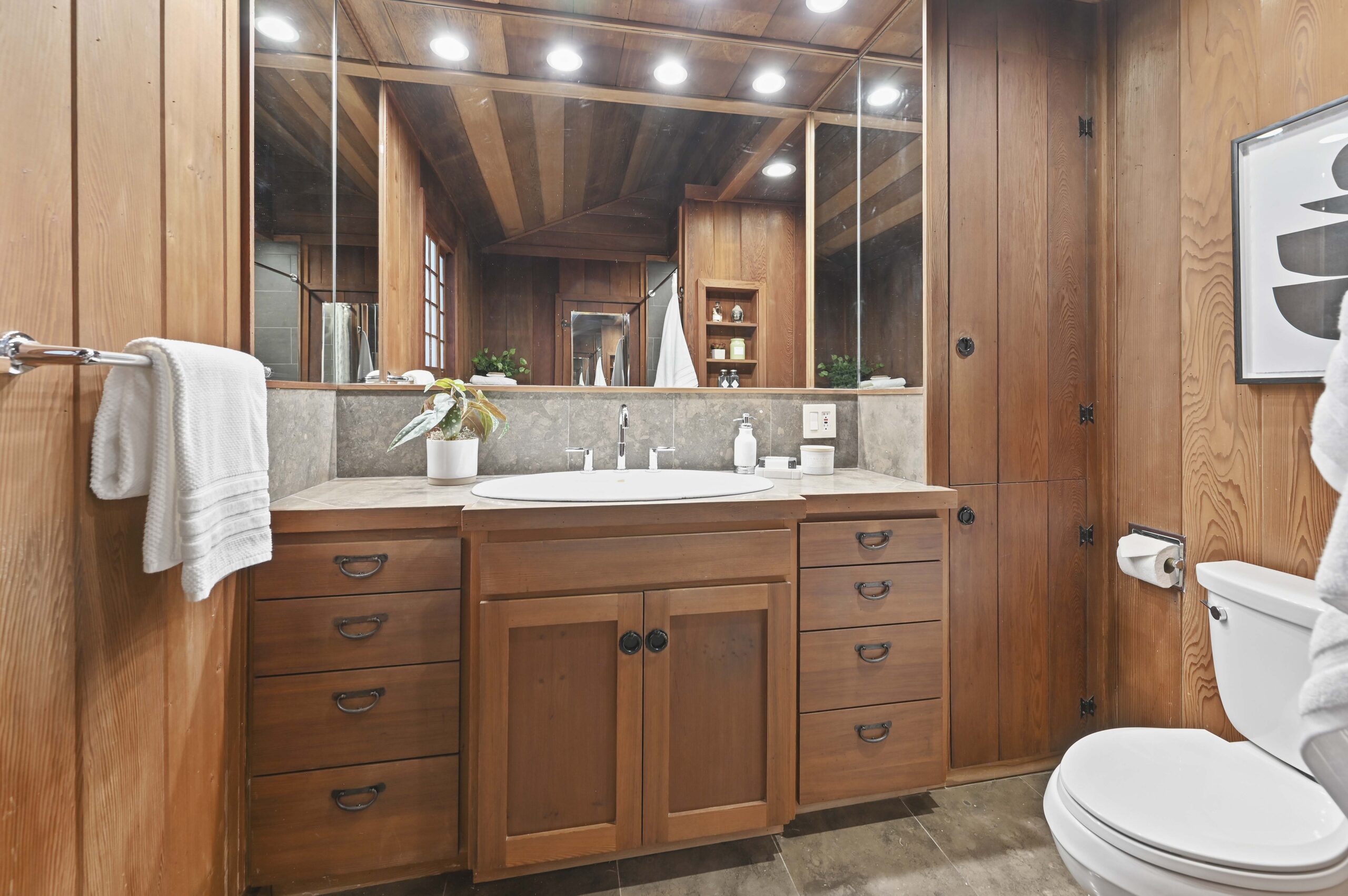 Much of the Heartwood Redwood used in the house was repurposed from the original scout cabins of Camp Dimond (1919-1948) that formally used this same land and adds to the home’s natural nostalgia. The chef’s kitchen is a delight with a tranquil combination of original redwood cabinets, Fireclay backsplash tiles, silestone suede quartz counters, and gourmet stainless appliances, a perfect blend of rustic beauty with modern convenience. The cozy primary suite is positioned in its own corner of the home looking out over the wooded lands and offers two large walk-in closets with custom built-in storage, and a stunning bathroom featuring earth tone tiles, redwood tansu style cabinets, a deep soaking tub, and shower. A peaceful loft space overlooking the great room is found upstairs lending itself perfectly as an office or den, and the adjacent upper-level bedroom opens onto a spacious rooftop deck overlooking the estate’s forested grounds. Adjacent to the house is a separate ADU studio with a full bath, kitchenette, and deck looking down on the meandering creek.