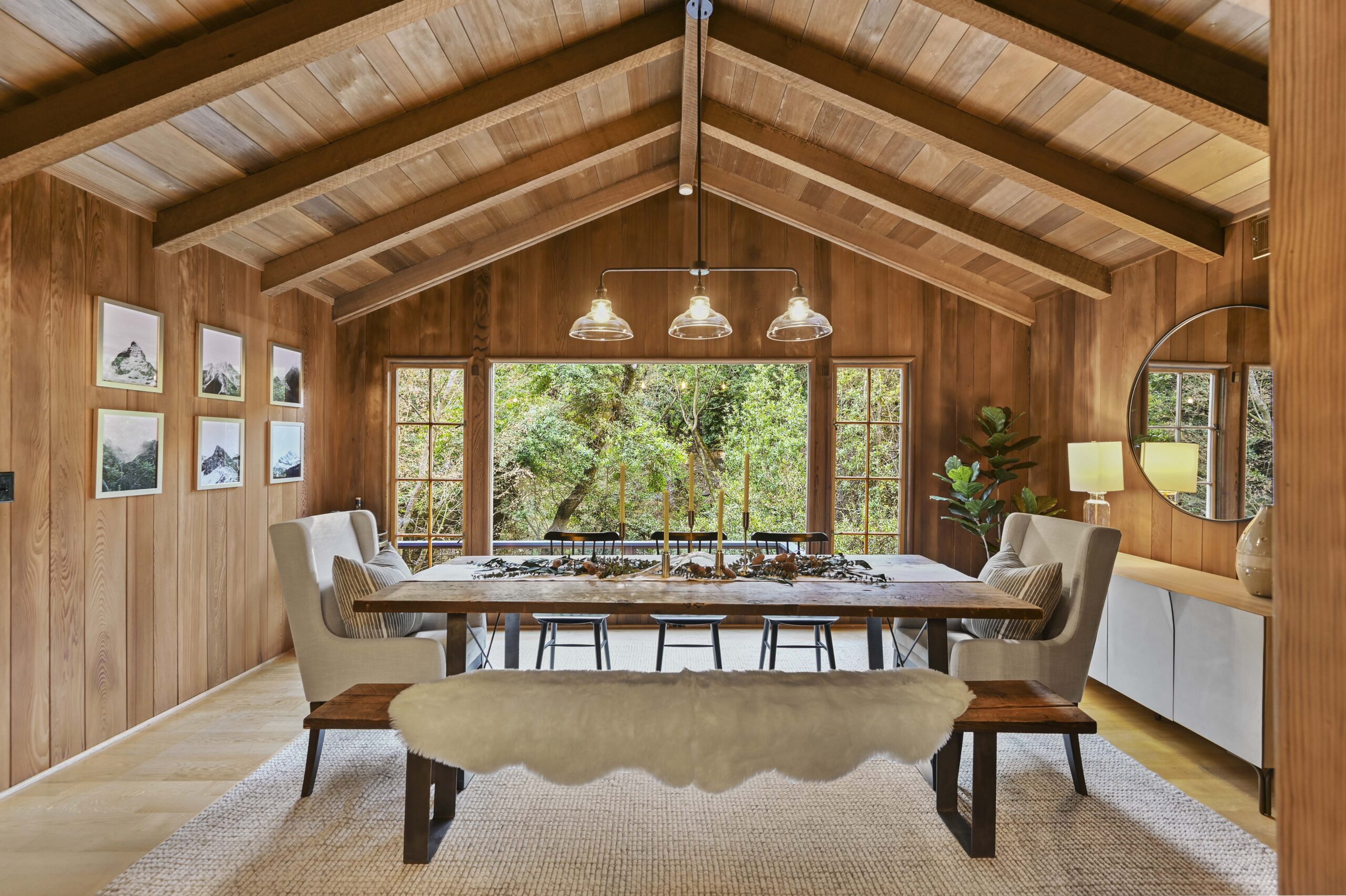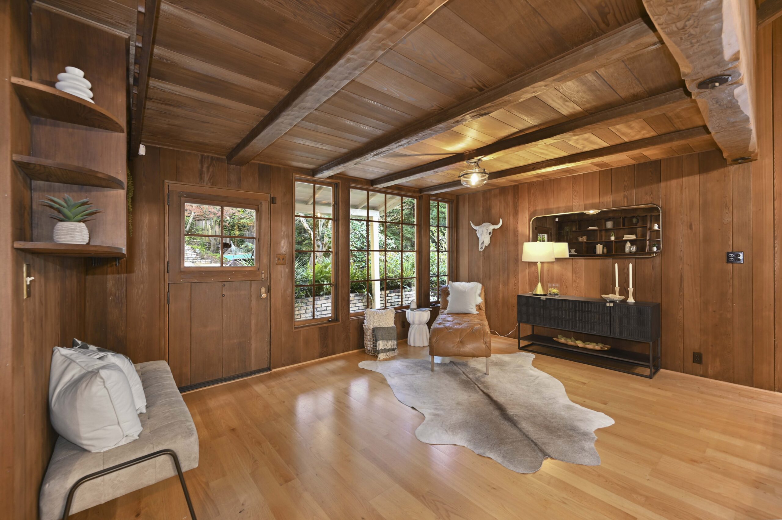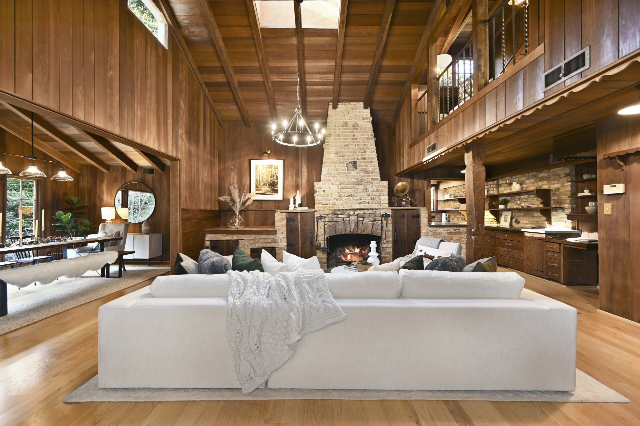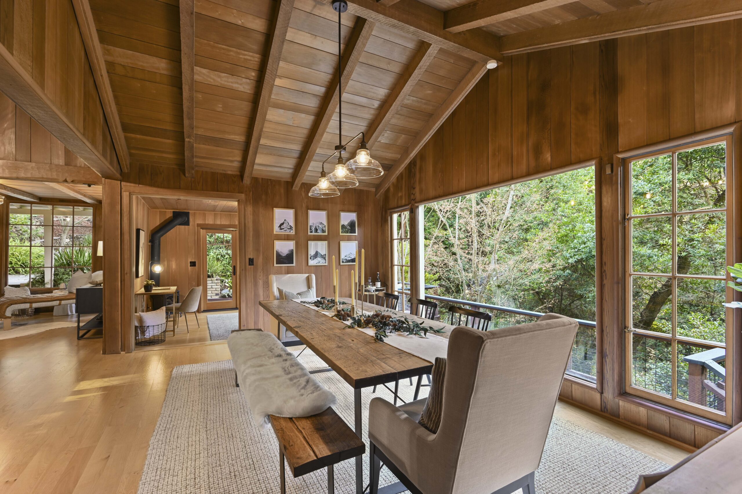 SOLD: Incredible lodge-like abode on a rare 1.2-acre wooded oasis located just under a mile from Montclair Village. Meandering paths, a year-round stream winding through redwoods and Japanese maples, fruit and ornamental trees as well as a multitude of diverse flora and fauna promise to offer daily delights within this setting of peaceful seclusion and exceptional privacy. Upon entering the home one is captivated by the rustic stone and brick fireplace of truly epic proportions anchoring the home’s great room, dining area, and study. Framed by vaulted raw wood ceilings and hand-hewn posts and beams, this bespoke home guarantees to invoke the finest of emotions, memories, and inspiration.