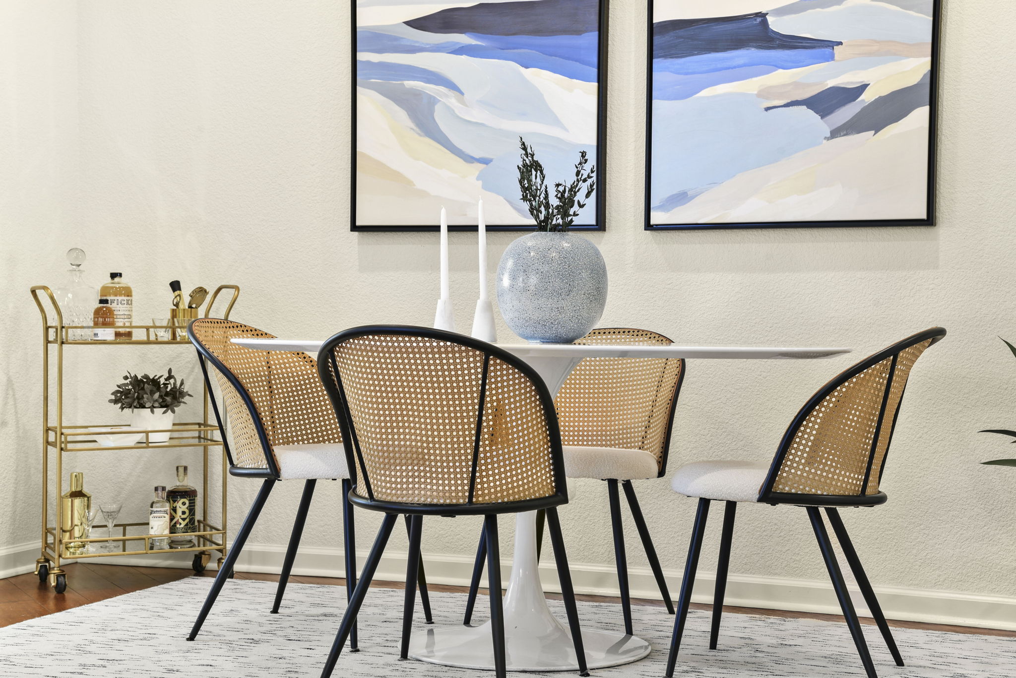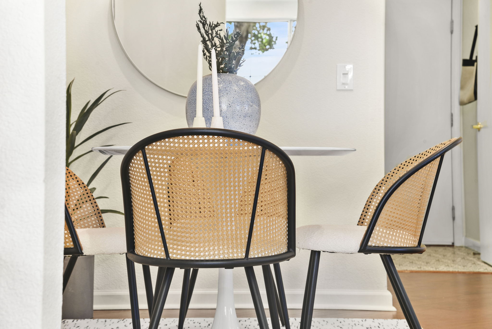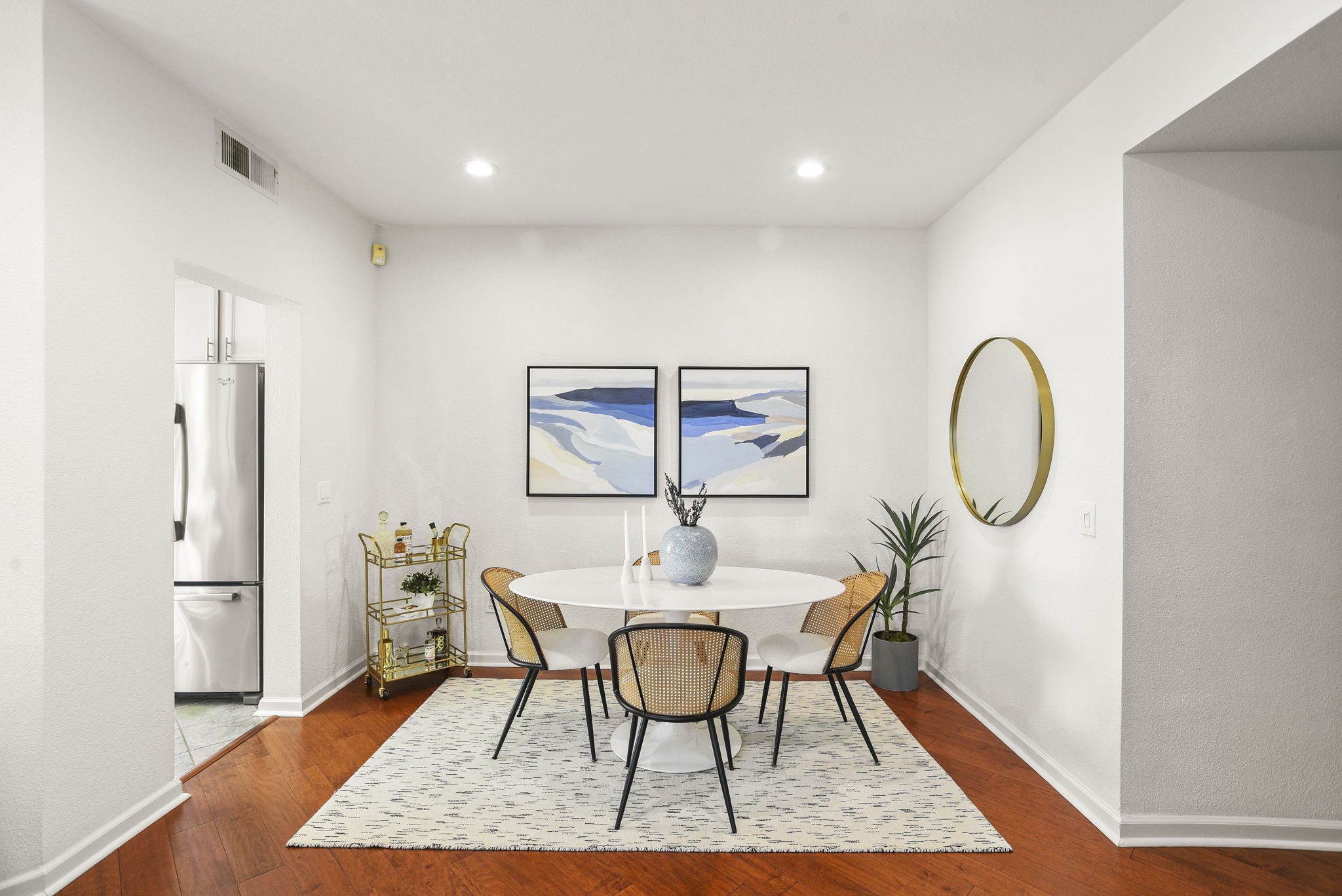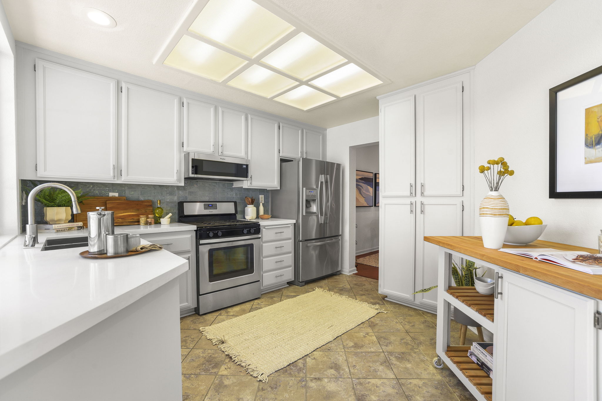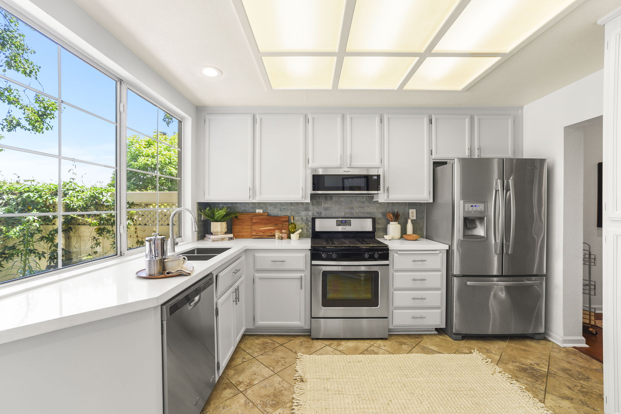 — Refreshed designer kitchen with quartz countertops, porcelain tile backsplash, and stainless steel appliances