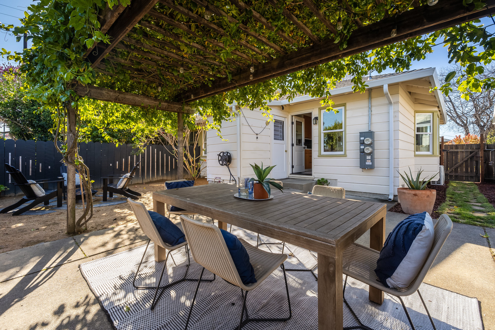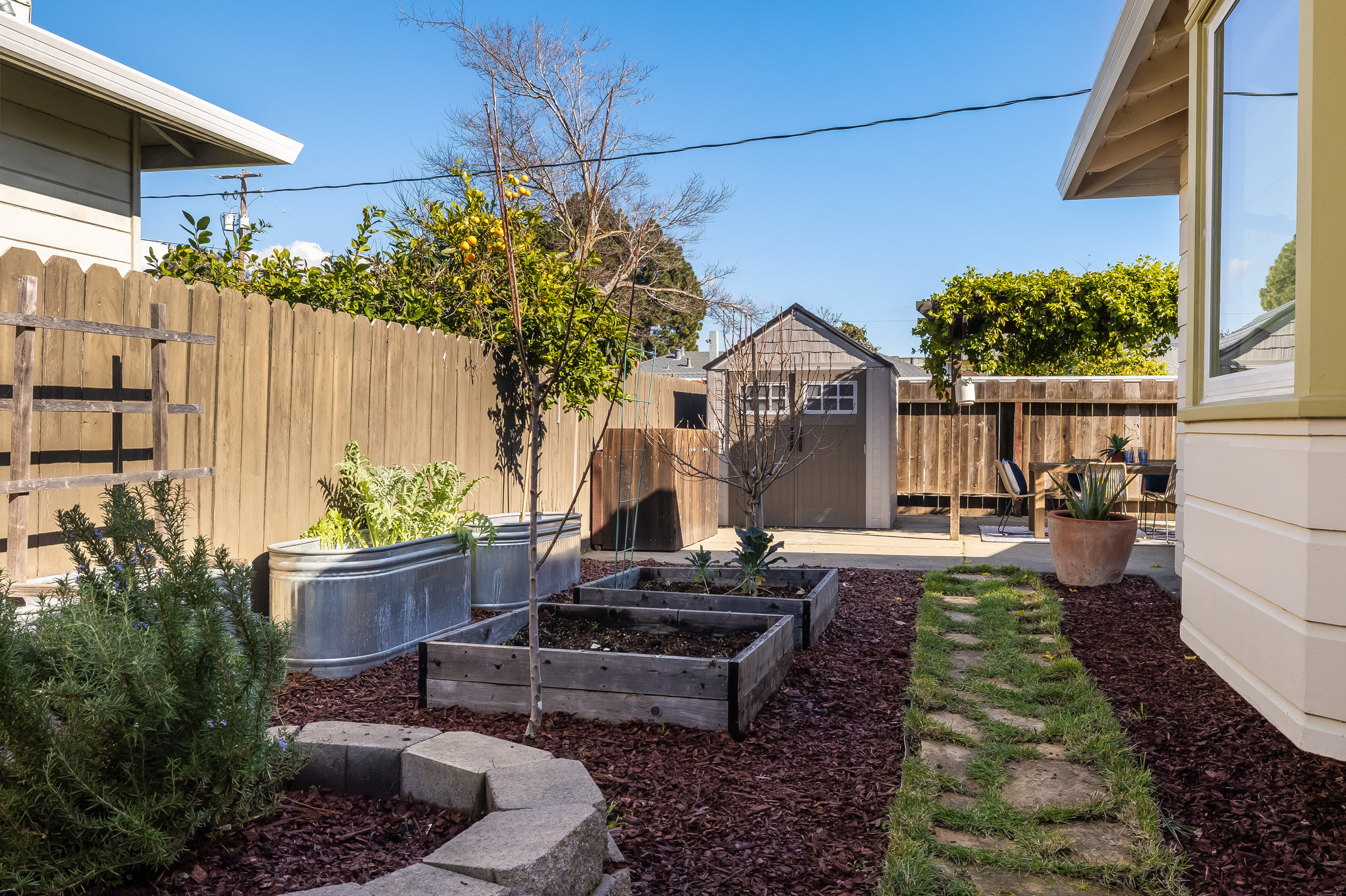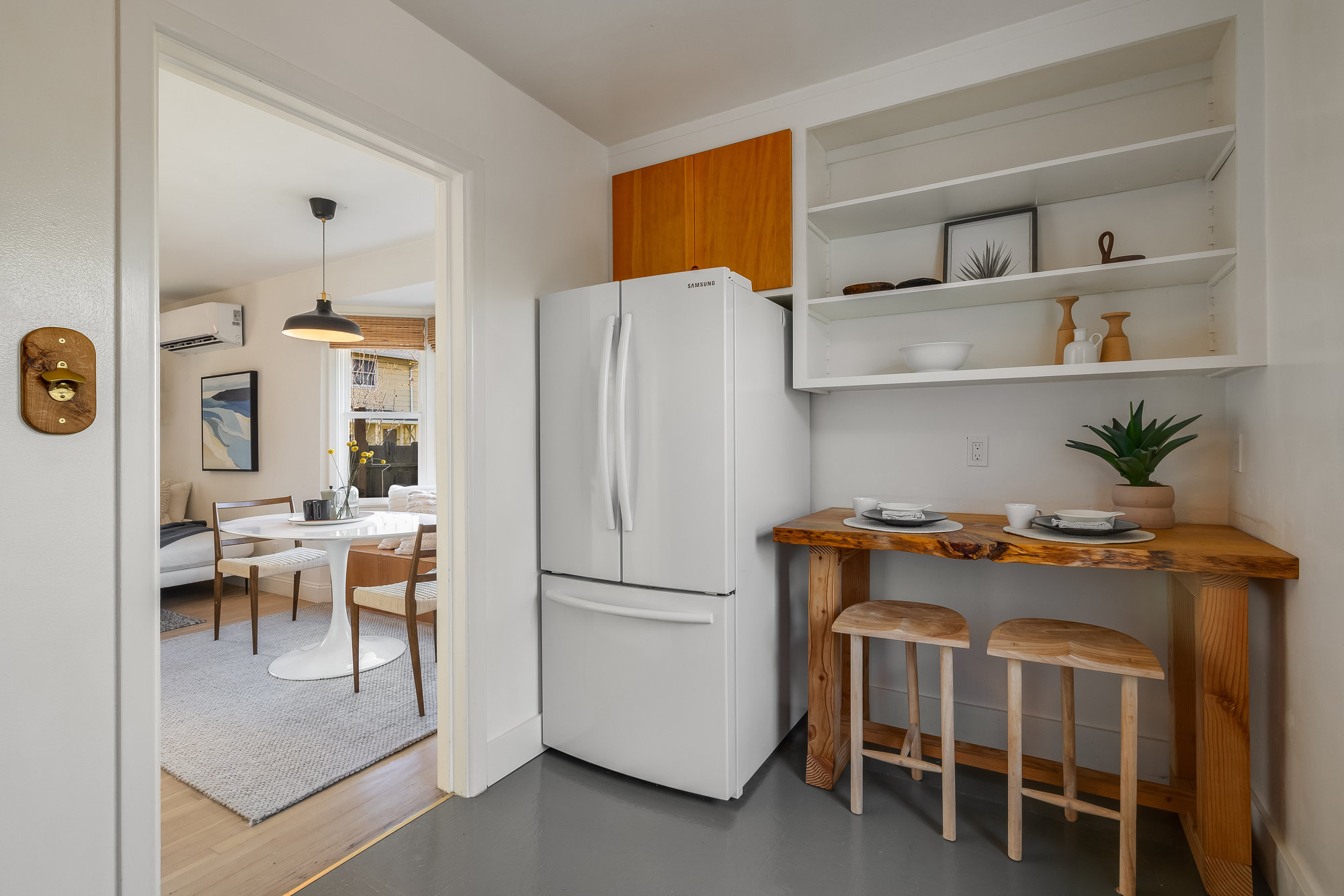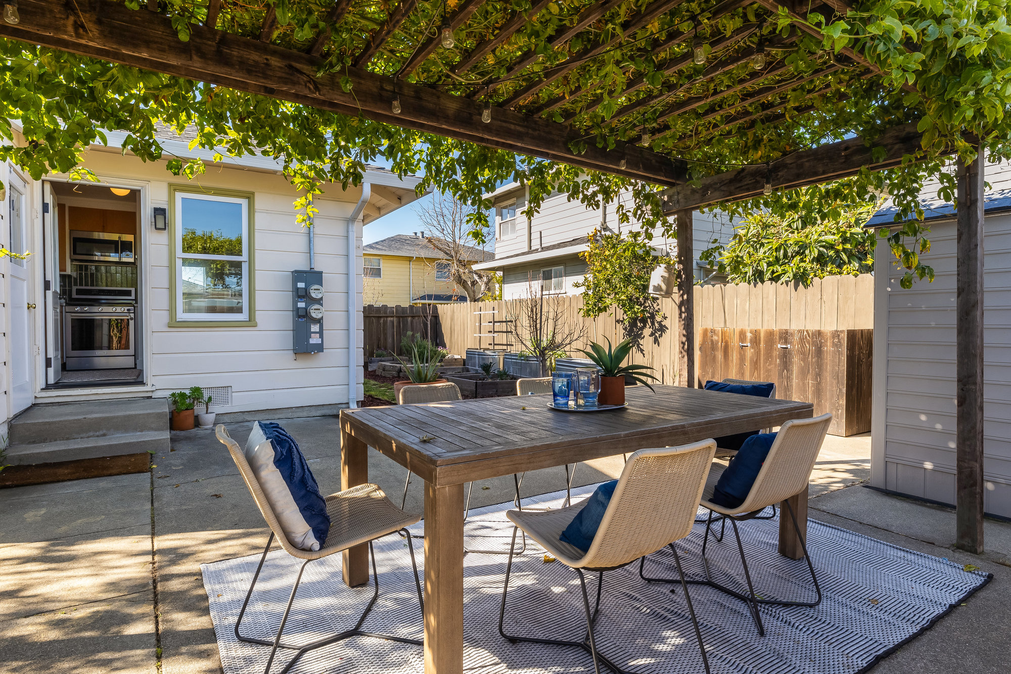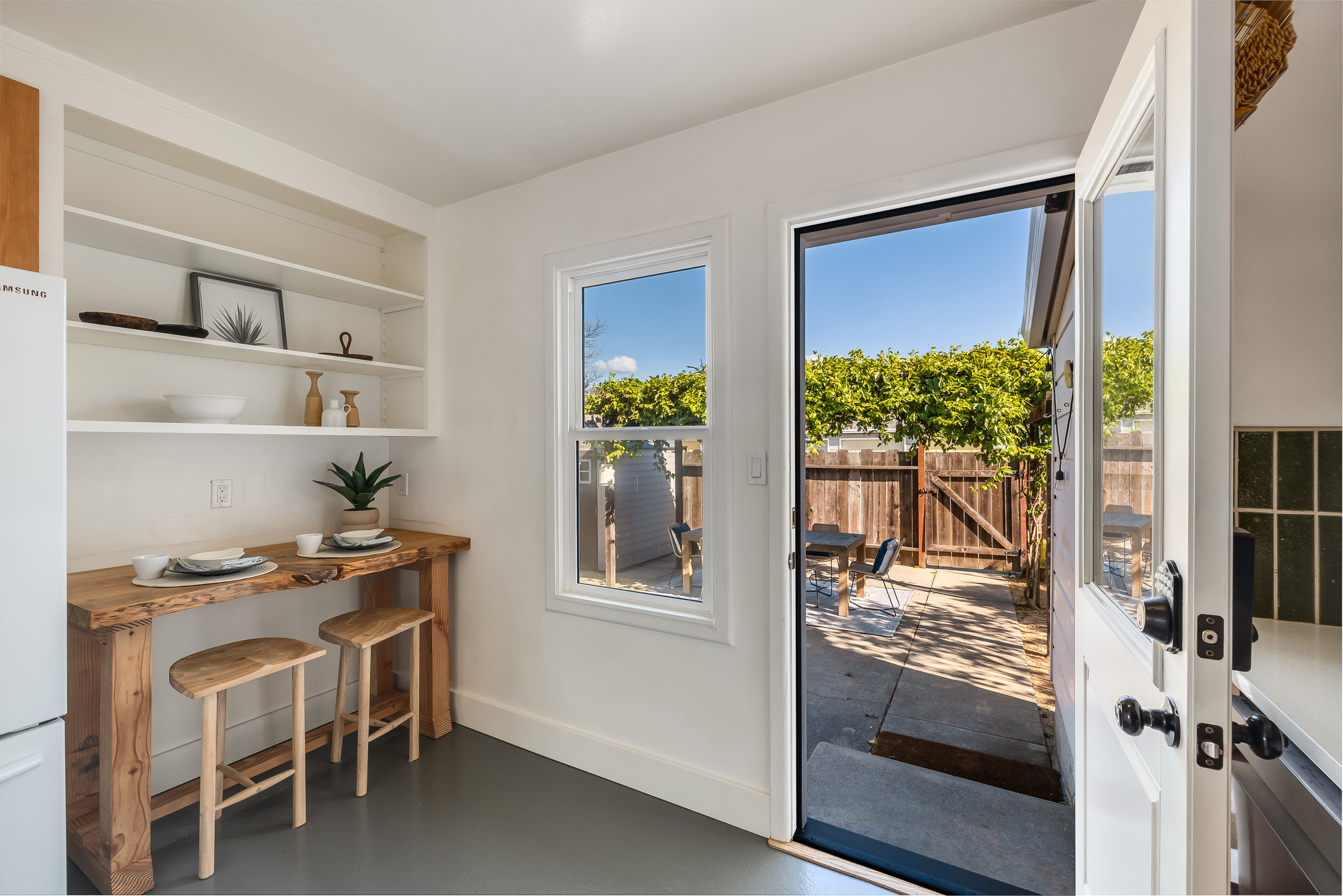 As charming as they come, this beautifully updated 1940s co-op blends vintage character with modern upgrades in one of Alameda’s most walkable neighborhoods. Thoughtfully renovated inside and out, this rare gem boasts one of the largest yards in the community—freshly landscaped and perfect for gardening, entertaining, or quiet evenings under the stars. Inside, the sunlit living and dining area welcomes you with a charming bay window and gleaming, refinished Douglas Fir floors. The fully remodeled kitchen is a standout, featuring custom cabinetry, designer countertops, high-end appliances, and a handcrafted tile backsplash. Two spacious bedrooms and an updated hall bath complete the inviting interior, freshly painted for a crisp, modern feel. This well-appointed co-op includes all-new dual-pane windows, a high-efficiency mini-split system for year-round comfort, an attached utility room with laundry, a roomy storage shed, and two on-site parking spots. Enjoy multiple outdoor seating areas and an unbeatable location just steps from Webster Street’s shops, restaurants, and farmers market. Woodstock Park is right across the street for morning dog walks, and the Seaplane fast ferry gets you to San Francisco in just 18 minutes. Don’t miss this rare opportunity!