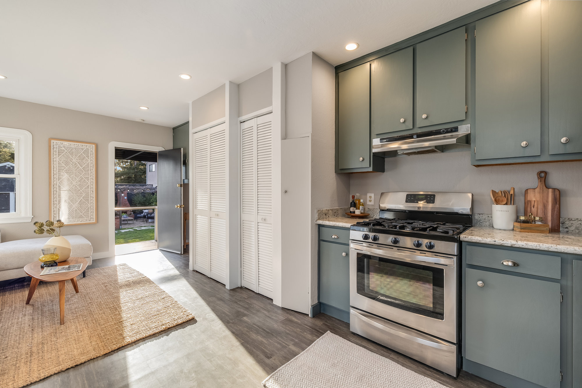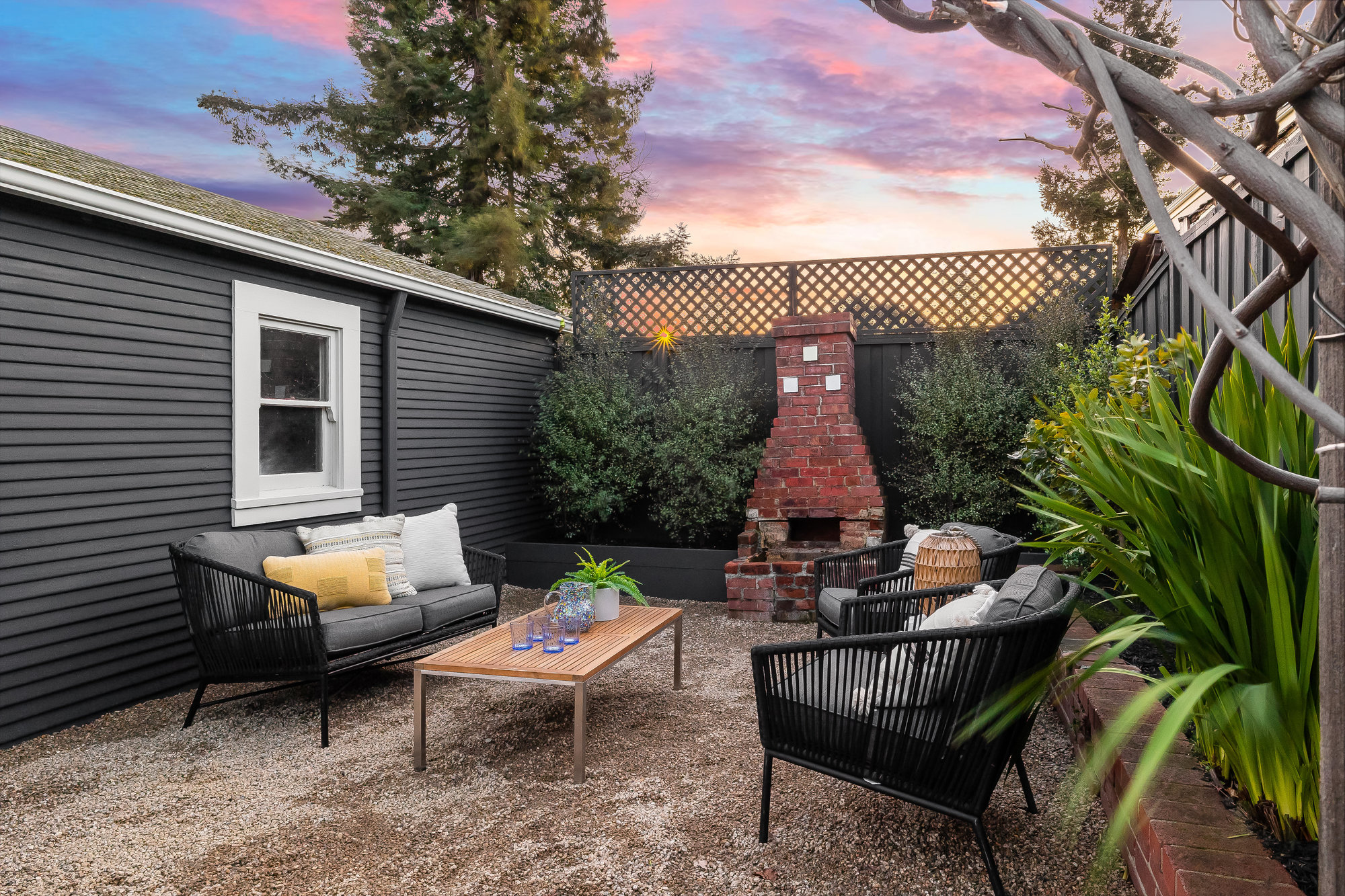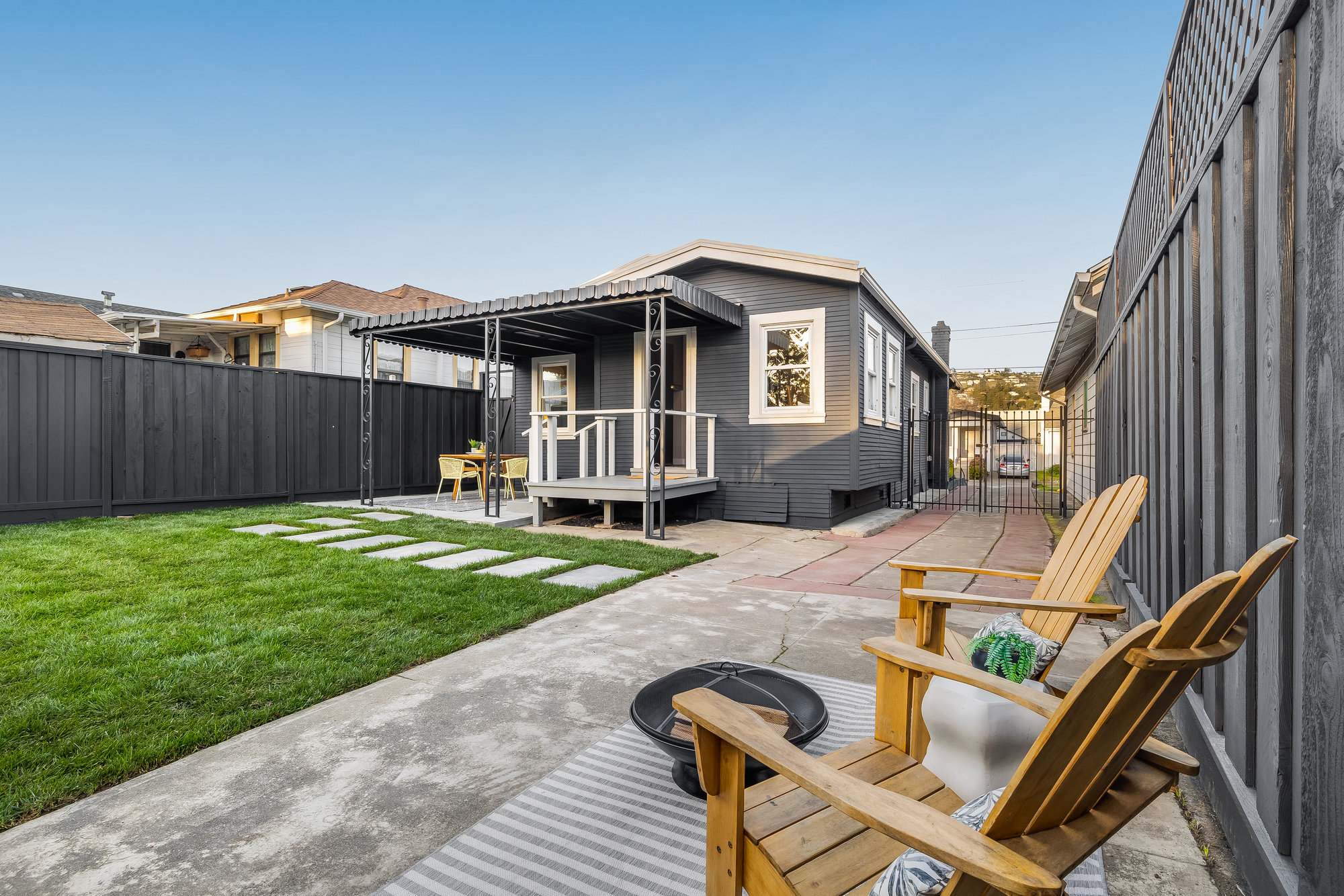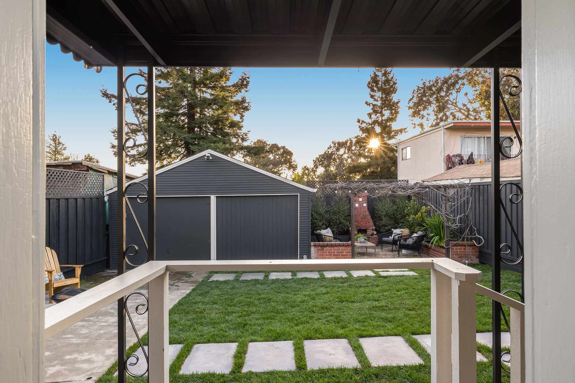 Enclosed front porch ideal for storm watching. Cozy living room with wood-burning fireplace and dining room. Kitchen featuring stone counters, gas range, stainless appliances and abundant cabinet space opening to a family room leading onto the rear gardens. Two ideally sized bedrooms. Hall bath with wainscoting walls, classic pedestal sink, shower over tub and subway tile shower surround. Covered rear patio leading to expansive grassy yard with floating steps and additional lounge area. Large, two-car detached garage with flex-space for hobbies, activities or potential expansion. Additional features include a laundry closet with washer and dryer, and wiring for future EV charger. Just blocks from the fabulous Laurel District cafes, bars, markets and bakeries, and quick access to I-580 to the Bay Bridge and San Francisco.